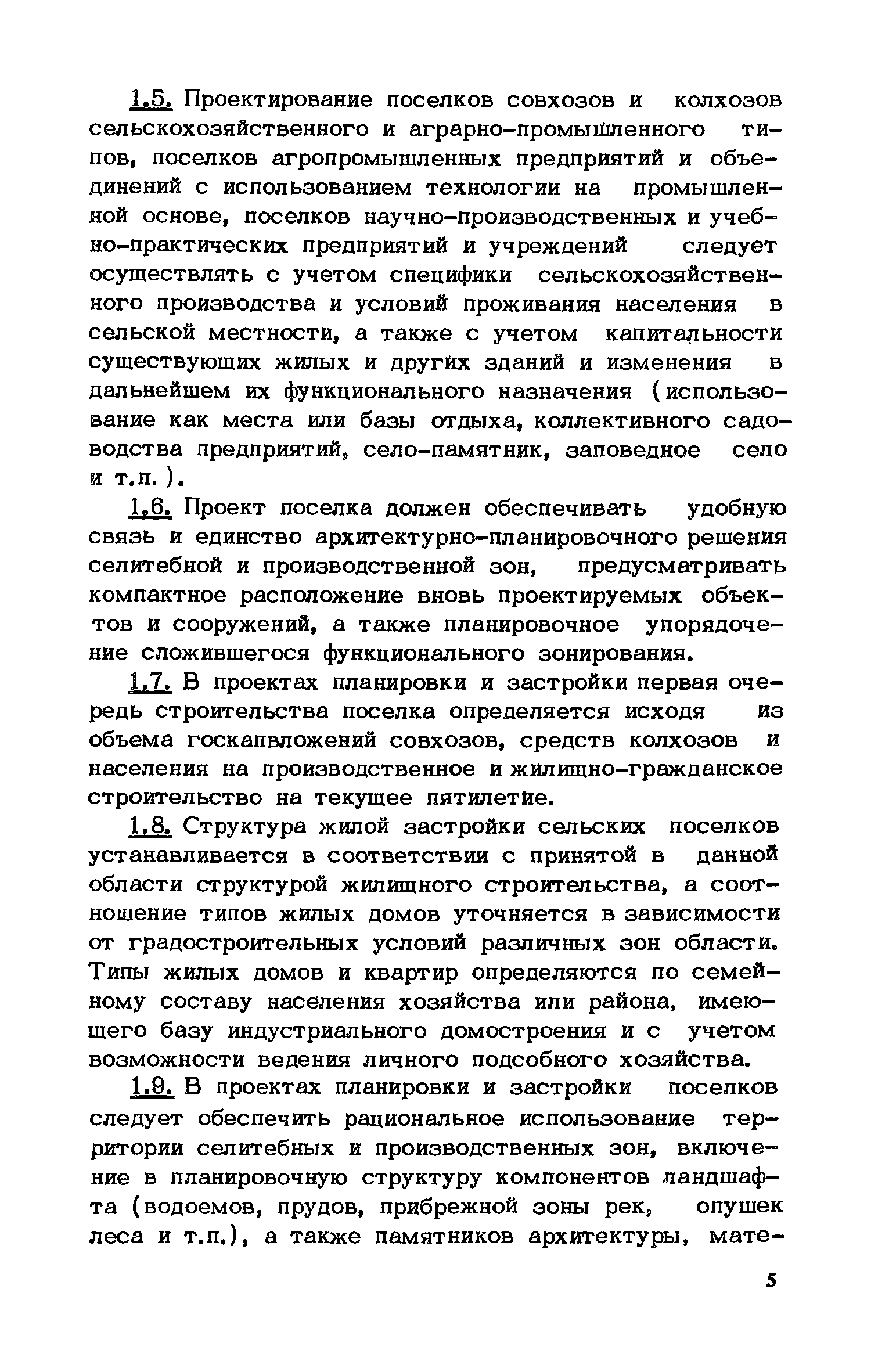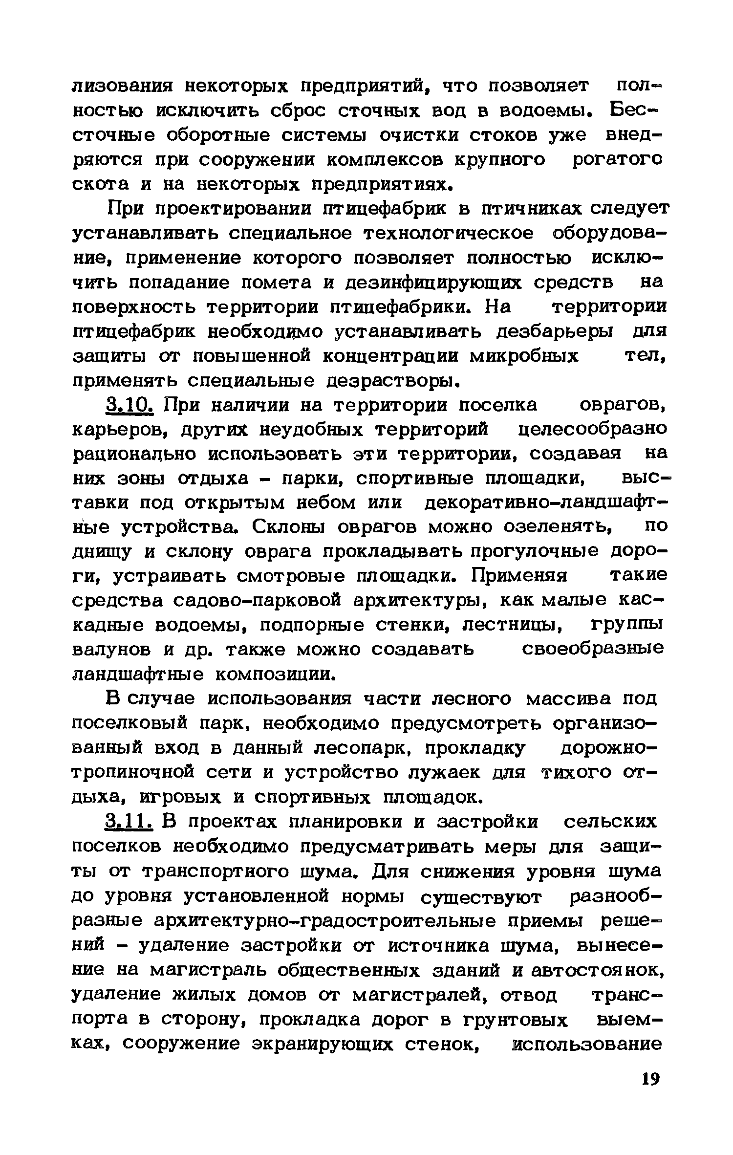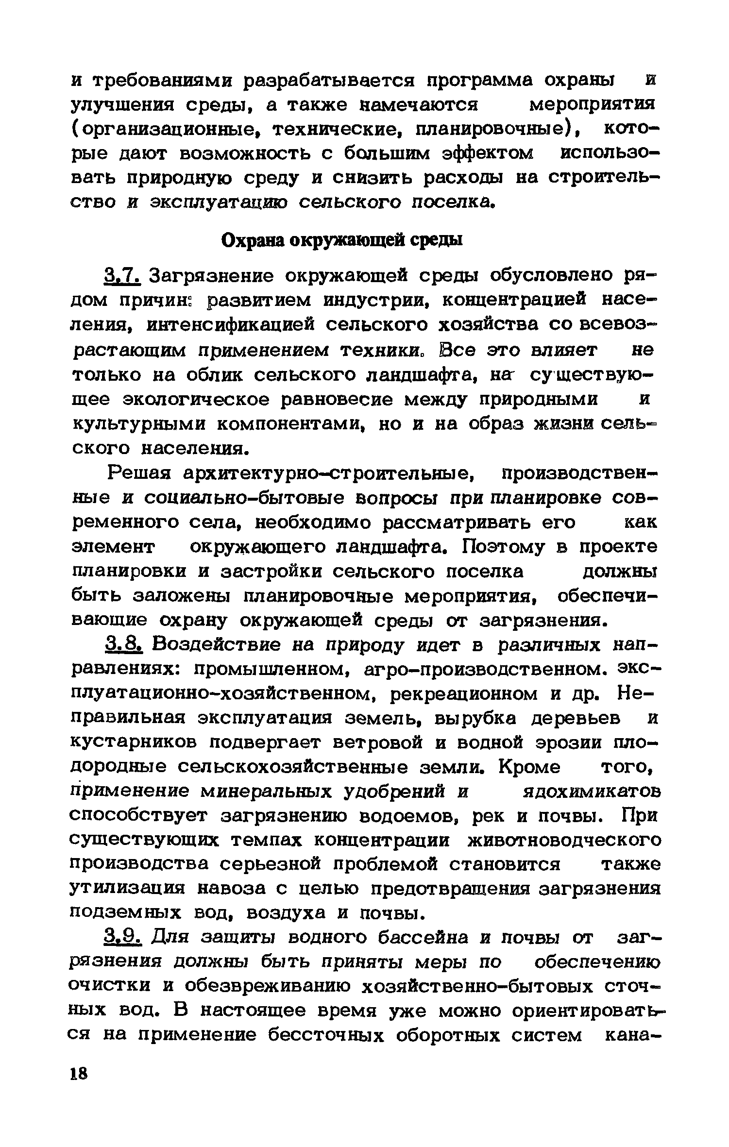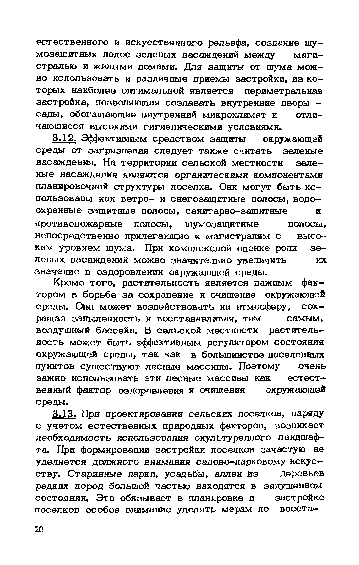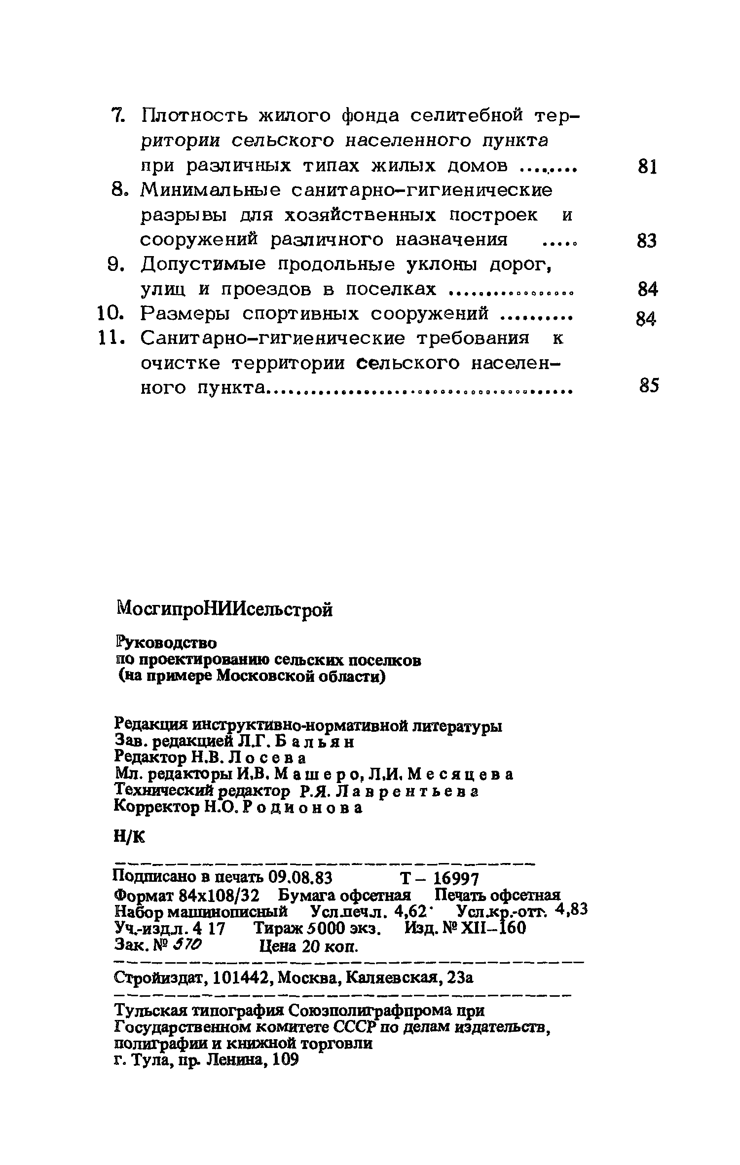 | Оглавление: | 1. Общие положения 2. Развитие сельских поселков Перспективные сельские населенные пункты Сселение мелких сельских населенных пунктов Сельские поселки рекреационного типа Технико-экономическое обоснование проектов планировки и застройки поселков 3. Общая организация территории сельского поселка Использование природно-ландшафтных факторов при организации поселка Охрана окружающей среды Выбор территории для строительства поселка Функциональное зонирование территории поселка Размещение первой очереди строительства поселка Использование исторических памятников в композиции сельских поселков 4. Планировка селитебной территории сельского поселка Архитектурно-планировочная организация поселка Планировка в условиях реконструкции поселка Определение объемов жилищного строительства 5. Застройка селитебной территории сельского поселка Жилая застройка Застройка усадебными домами Застройка блокированными домами Застройка секционными жилыми домами Размещение участков и хозяйственных построек при домах различных типов Организация личного подсобного хозяйства 6. Общественный центр поселка Размещение и застройка центра 7. Внешнее благоустройство и озеленение сельского поселка Размещение зеленых насаждений общего пользования Озеленение санитарно-защитной зоны Малые архитектурные формы 8. Инженерное оборудование сельских поселков Водоснабжение, канализация, теплоснабжение, газоснабжение, электроснабжение 9. Производственная зона сельского поселка Размещение и организация производственных зон Состав производственной зоны Формирование территории животноводческих комплексов Приложение 1. Определение стоимостного показателя по проекту поселка Приложение 2. Определение расчетной численности рекреантов при проектирования поселков рекреационного типа Приложение 3. Расстояния между жилыми зданиями в застройке различной этажности Приложение 4. Размеры земельных участков школ в зависимости от числа учащихся Приложение 5. Расстояния от жилых и общественных зданий до наземных гаражей с различным числом автомобилей Приложение 6. Соотношения площадей элементов селитебной территории поселка при различной жилой застройки Приложение 7. Плотность жилого фонда селитебной территории сельского населенного пункта при различных типах жилых домов Приложение 8. Минимальные санитарно-гигиенические разрывы для хозяйственных построек и сооружений различного назначения Приложение 9. Допустимые продольные уклоны дорог, улиц и проездов в поселках Приложение 10. Размеры спортивных сооружений Приложение 11. Санитарно-гигиенические требования к очистке территории сельского населенного пункта |