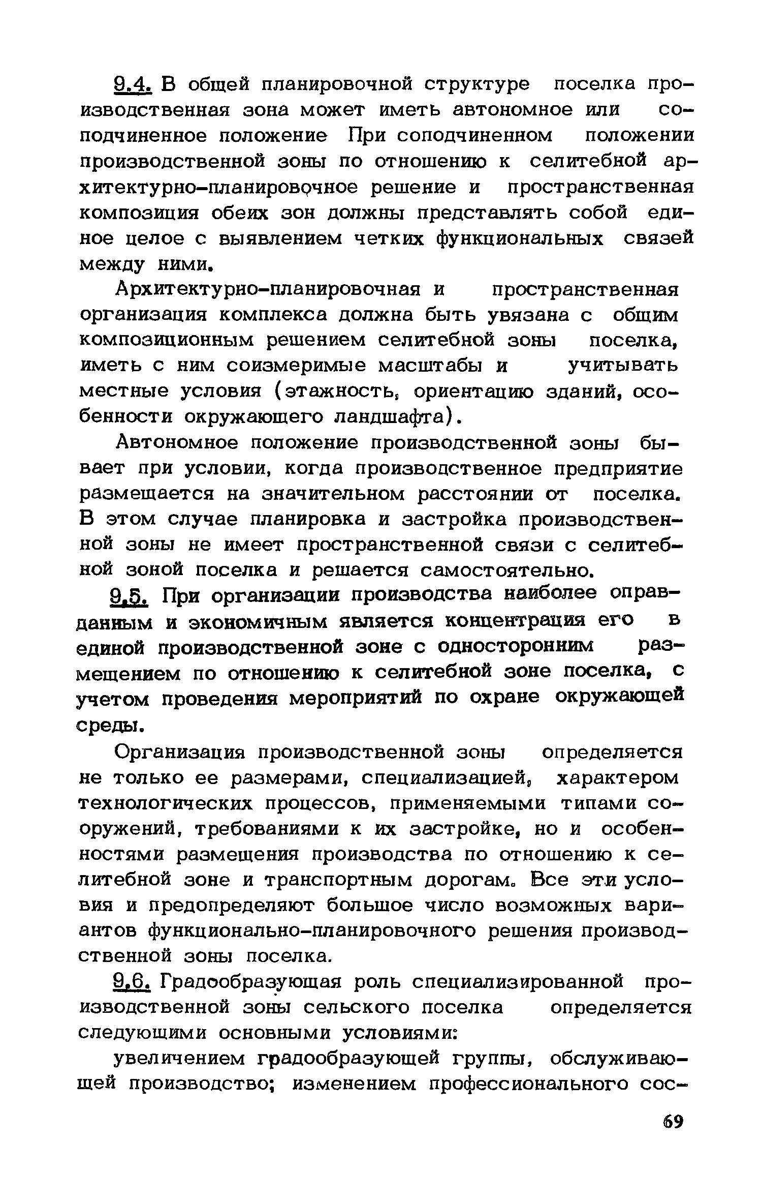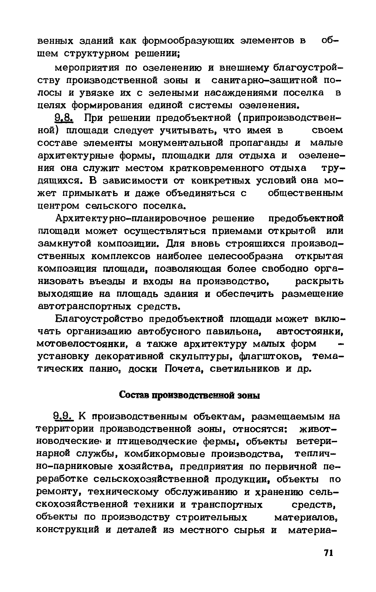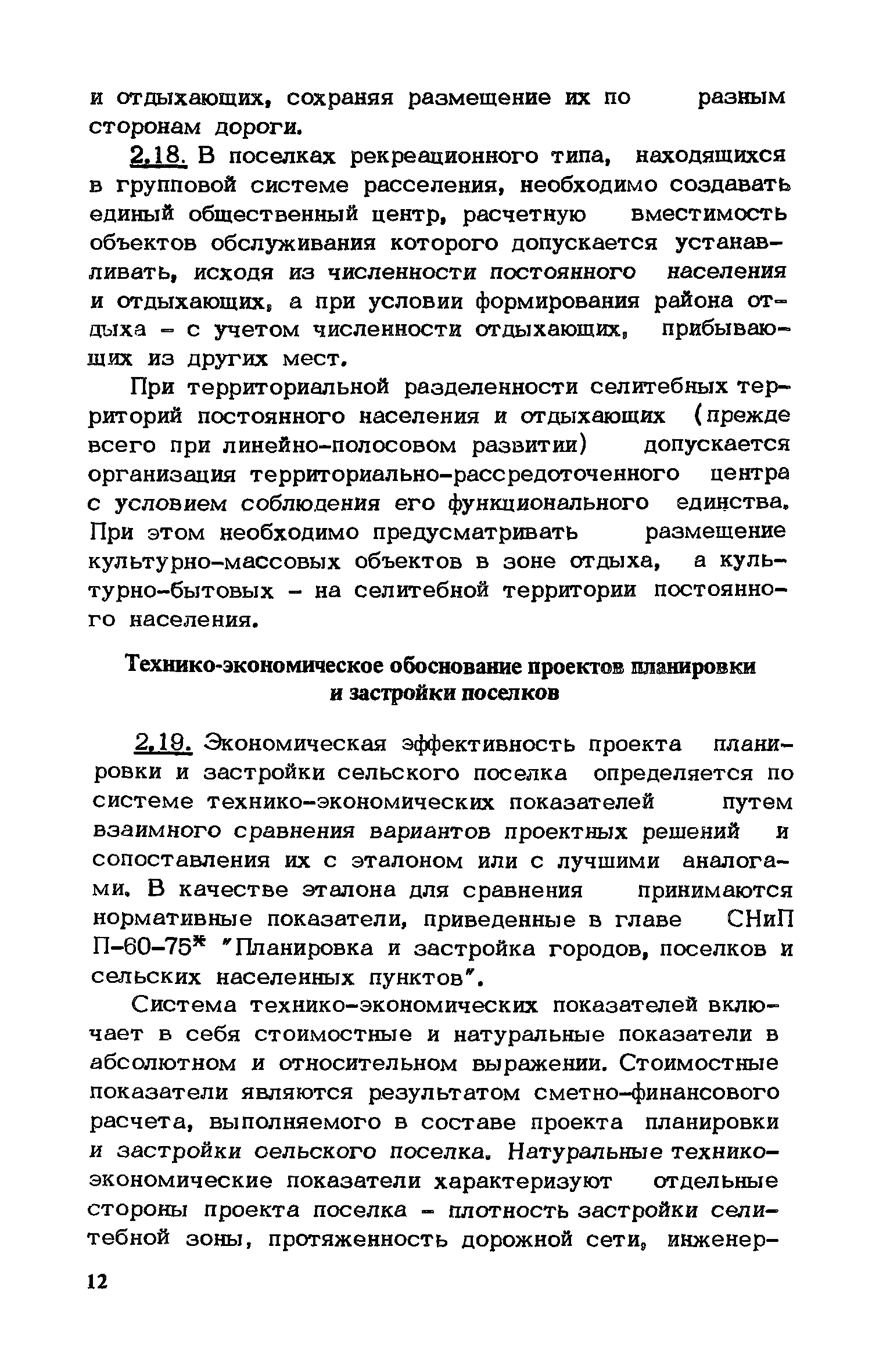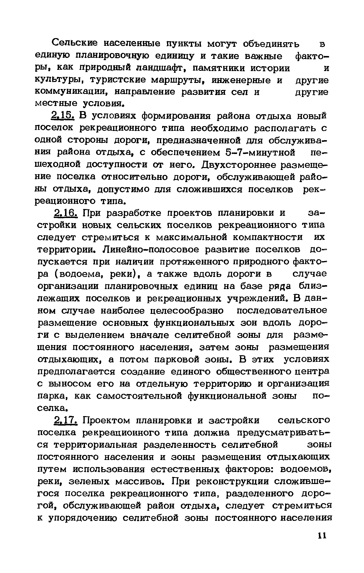 | Оглавление: | 1. Общие положения 2. Развитие сельских поселков Перспективные сельские населенные пункты Сселение мелких сельских населенных пунктов Сельские поселки рекреационного типа Технико-экономическое обоснование проектов планировки и застройки поселков 3. Общая организация территории сельского поселка Использование природно-ландшафтных факторов при организации поселка Охрана окружающей среды Выбор территории для строительства поселка Функциональное зонирование территории поселка Размещение первой очереди строительства поселка Использование исторических памятников в композиции сельских поселков 4. Планировка селитебной территории сельского поселка Архитектурно-планировочная организация поселка Планировка в условиях реконструкции поселка Определение объемов жилищного строительства 5. Застройка селитебной территории сельского поселка Жилая застройка Застройка усадебными домами Застройка блокированными домами Застройка секционными жилыми домами Размещение участков и хозяйственных построек при домах различных типов Организация личного подсобного хозяйства 6. Общественный центр поселка Размещение и застройка центра 7. Внешнее благоустройство и озеленение сельского поселка Размещение зеленых насаждений общего пользования Озеленение санитарно-защитной зоны Малые архитектурные формы 8. Инженерное оборудование сельских поселков Водоснабжение, канализация, теплоснабжение, газоснабжение, электроснабжение 9. Производственная зона сельского поселка Размещение и организация производственных зон Состав производственной зоны Формирование территории животноводческих комплексов Приложение 1. Определение стоимостного показателя по проекту поселка Приложение 2. Определение расчетной численности рекреантов при проектирования поселков рекреационного типа Приложение 3. Расстояния между жилыми зданиями в застройке различной этажности Приложение 4. Размеры земельных участков школ в зависимости от числа учащихся Приложение 5. Расстояния от жилых и общественных зданий до наземных гаражей с различным числом автомобилей Приложение 6. Соотношения площадей элементов селитебной территории поселка при различной жилой застройки Приложение 7. Плотность жилого фонда селитебной территории сельского населенного пункта при различных типах жилых домов Приложение 8. Минимальные санитарно-гигиенические разрывы для хозяйственных построек и сооружений различного назначения Приложение 9. Допустимые продольные уклоны дорог, улиц и проездов в поселках Приложение 10. Размеры спортивных сооружений Приложение 11. Санитарно-гигиенические требования к очистке территории сельского населенного пункта |