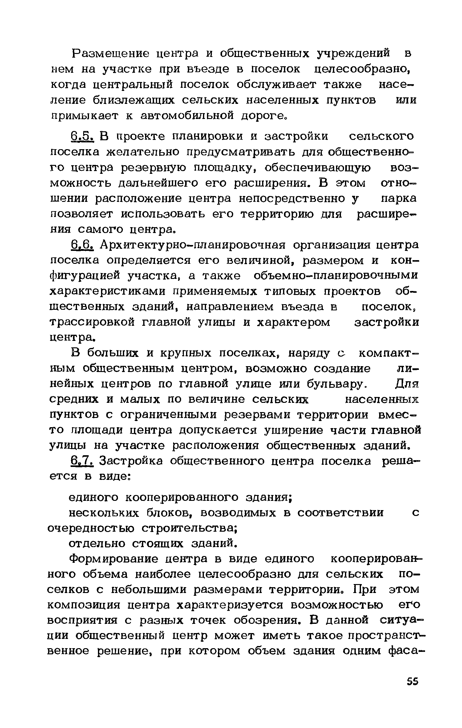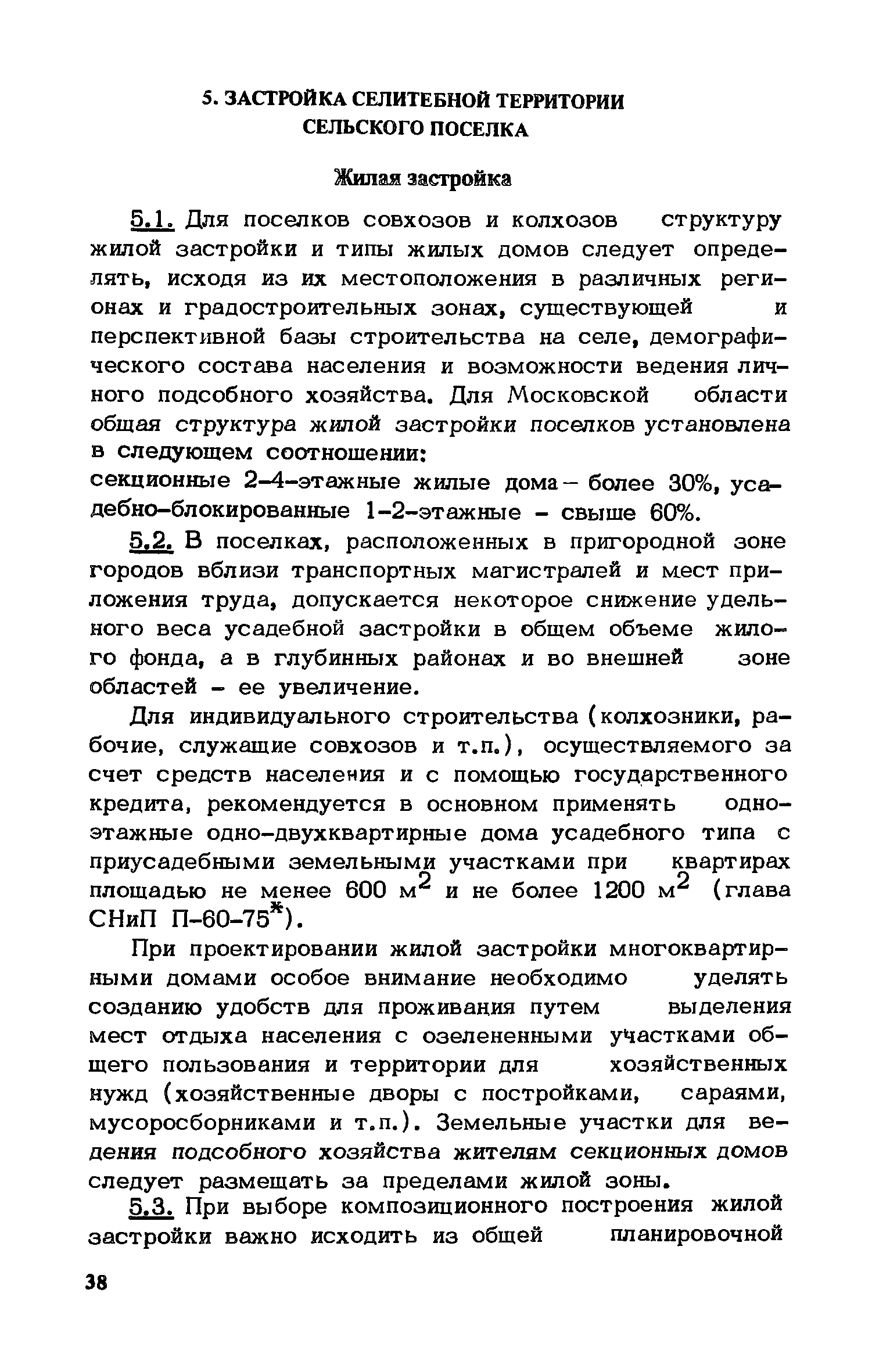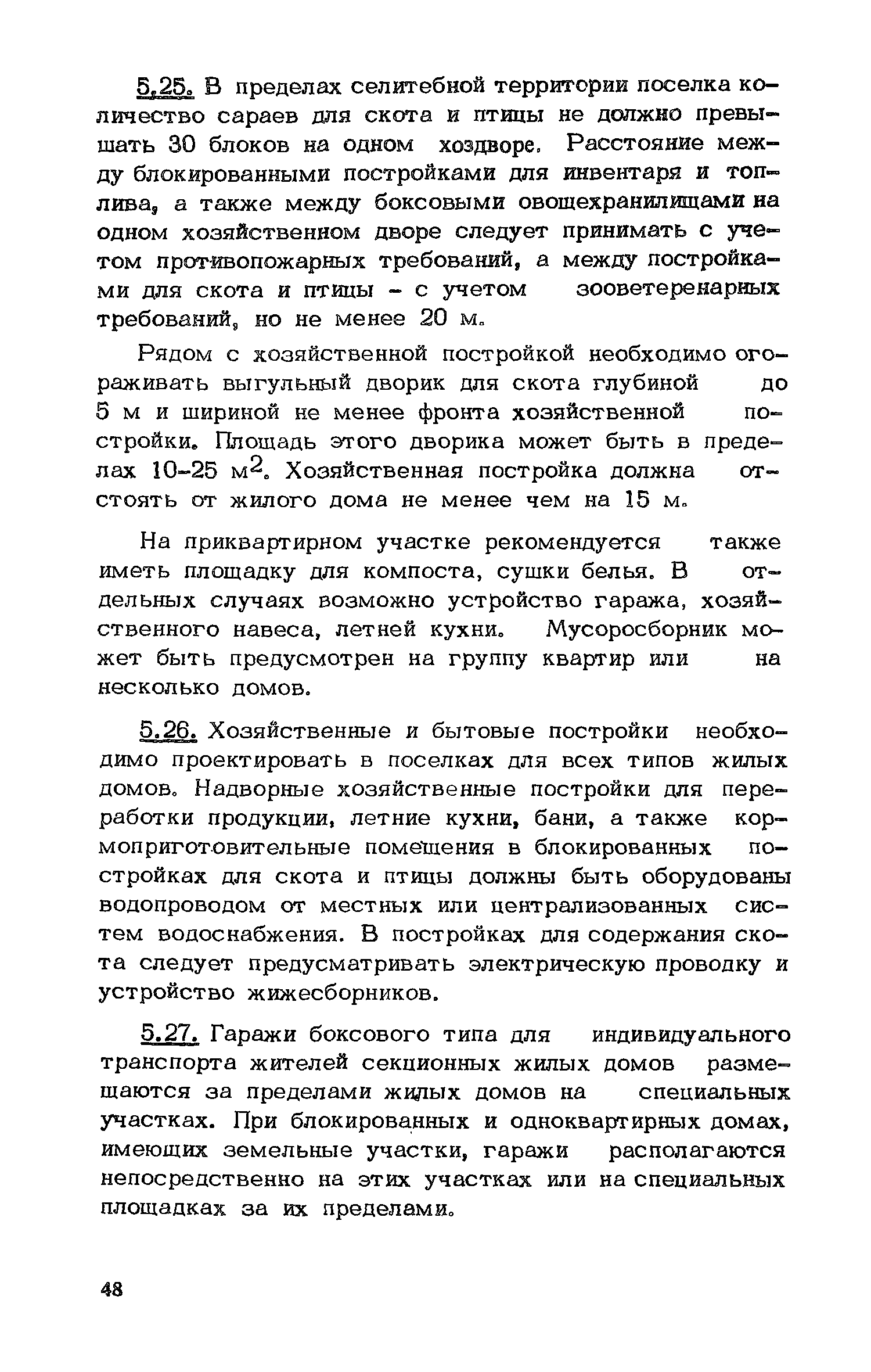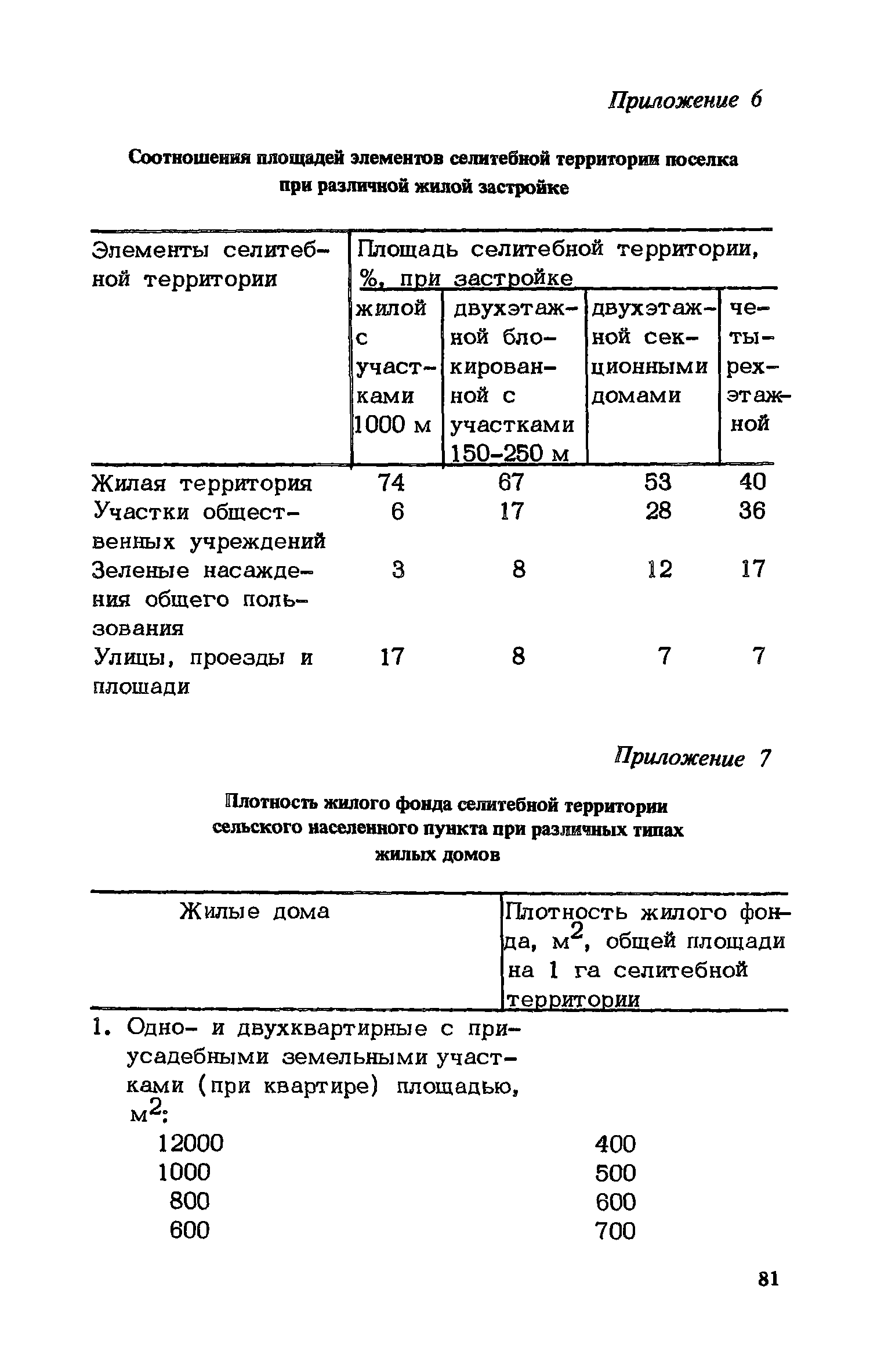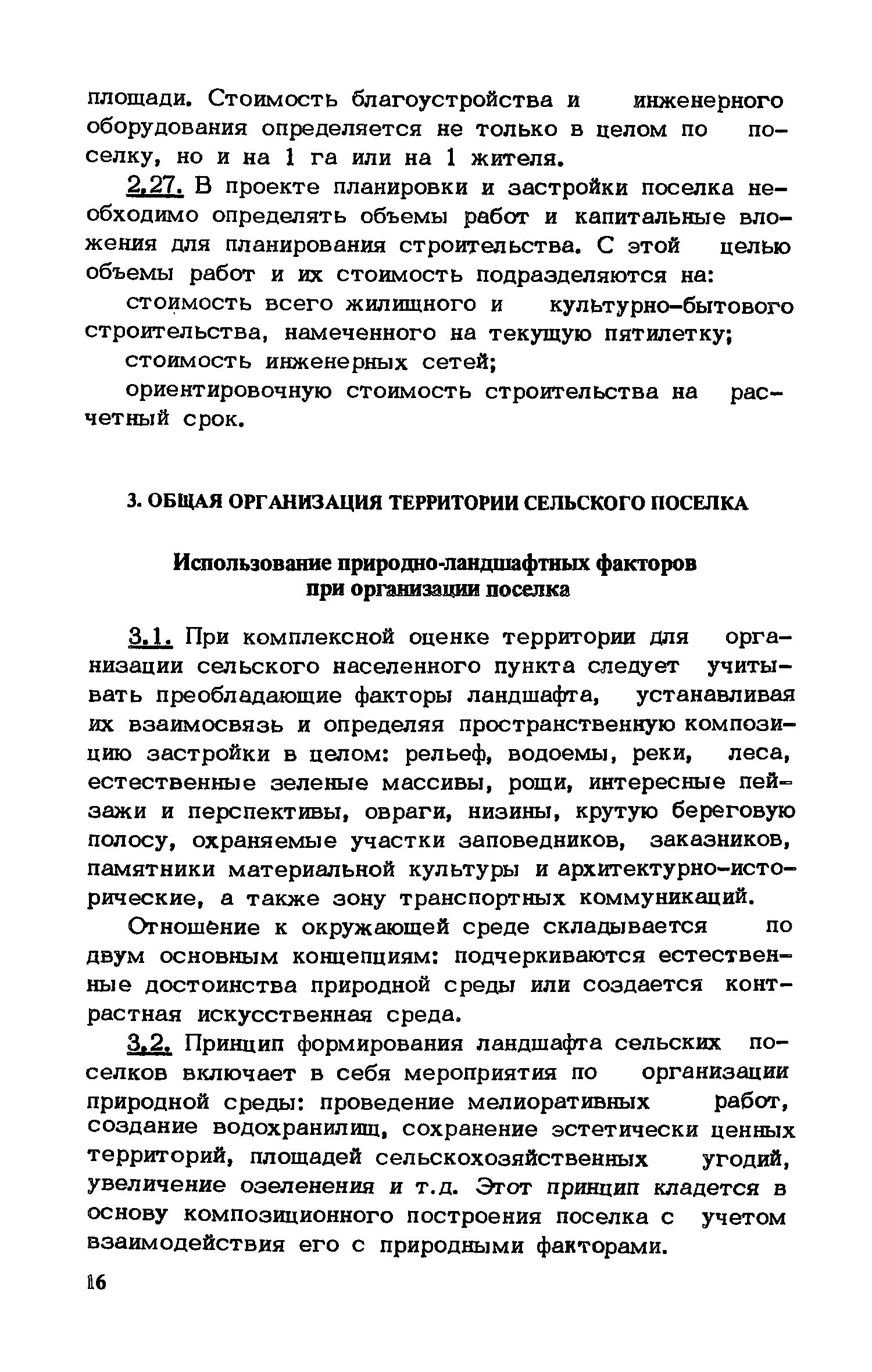 | Оглавление: | 1. Общие положения 2. Развитие сельских поселков Перспективные сельские населенные пункты Сселение мелких сельских населенных пунктов Сельские поселки рекреационного типа Технико-экономическое обоснование проектов планировки и застройки поселков 3. Общая организация территории сельского поселка Использование природно-ландшафтных факторов при организации поселка Охрана окружающей среды Выбор территории для строительства поселка Функциональное зонирование территории поселка Размещение первой очереди строительства поселка Использование исторических памятников в композиции сельских поселков 4. Планировка селитебной территории сельского поселка Архитектурно-планировочная организация поселка Планировка в условиях реконструкции поселка Определение объемов жилищного строительства 5. Застройка селитебной территории сельского поселка Жилая застройка Застройка усадебными домами Застройка блокированными домами Застройка секционными жилыми домами Размещение участков и хозяйственных построек при домах различных типов Организация личного подсобного хозяйства 6. Общественный центр поселка Размещение и застройка центра 7. Внешнее благоустройство и озеленение сельского поселка Размещение зеленых насаждений общего пользования Озеленение санитарно-защитной зоны Малые архитектурные формы 8. Инженерное оборудование сельских поселков Водоснабжение, канализация, теплоснабжение, газоснабжение, электроснабжение 9. Производственная зона сельского поселка Размещение и организация производственных зон Состав производственной зоны Формирование территории животноводческих комплексов Приложение 1. Определение стоимостного показателя по проекту поселка Приложение 2. Определение расчетной численности рекреантов при проектирования поселков рекреационного типа Приложение 3. Расстояния между жилыми зданиями в застройке различной этажности Приложение 4. Размеры земельных участков школ в зависимости от числа учащихся Приложение 5. Расстояния от жилых и общественных зданий до наземных гаражей с различным числом автомобилей Приложение 6. Соотношения площадей элементов селитебной территории поселка при различной жилой застройки Приложение 7. Плотность жилого фонда селитебной территории сельского населенного пункта при различных типах жилых домов Приложение 8. Минимальные санитарно-гигиенические разрывы для хозяйственных построек и сооружений различного назначения Приложение 9. Допустимые продольные уклоны дорог, улиц и проездов в поселках Приложение 10. Размеры спортивных сооружений Приложение 11. Санитарно-гигиенические требования к очистке территории сельского населенного пункта |