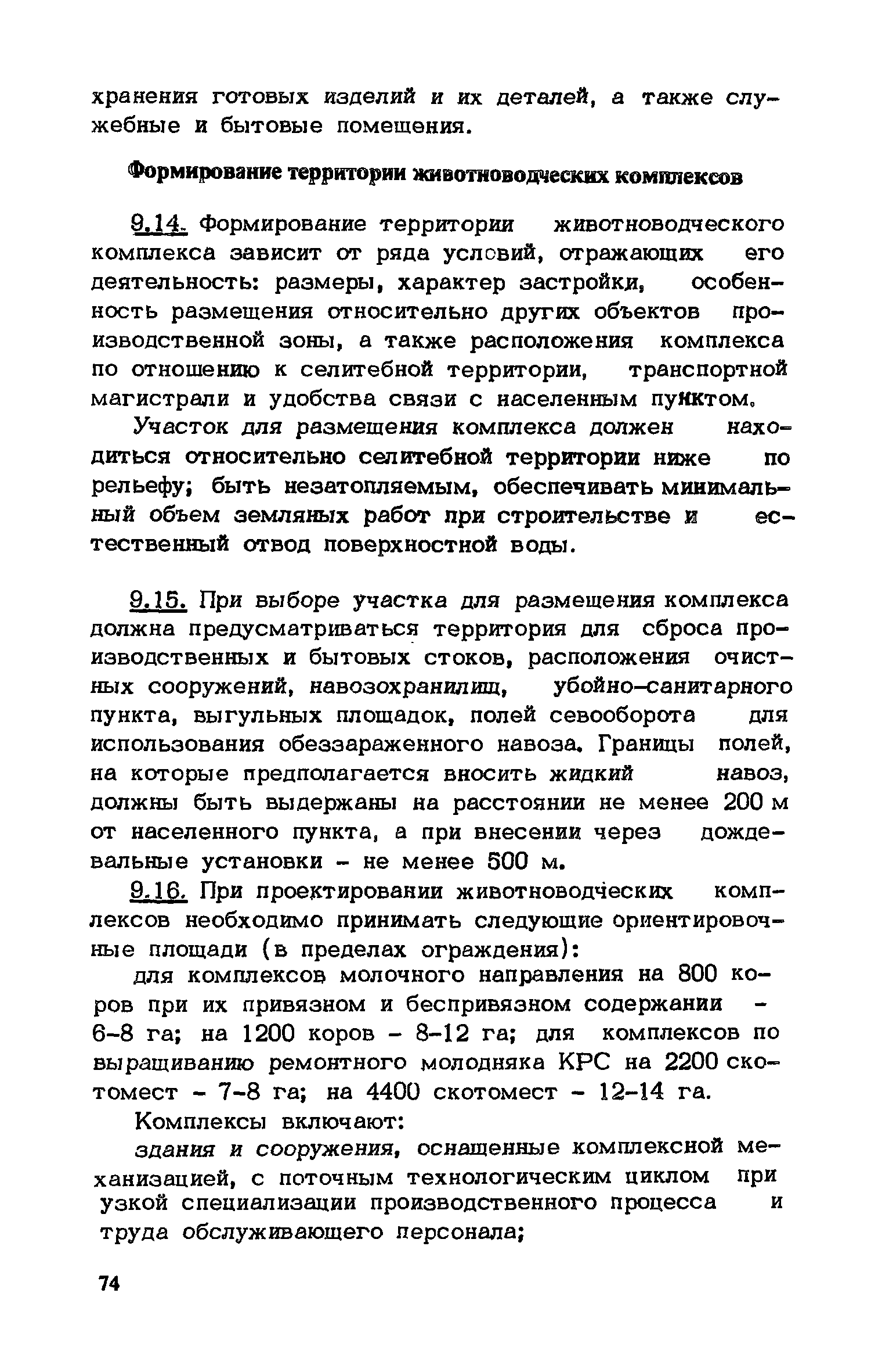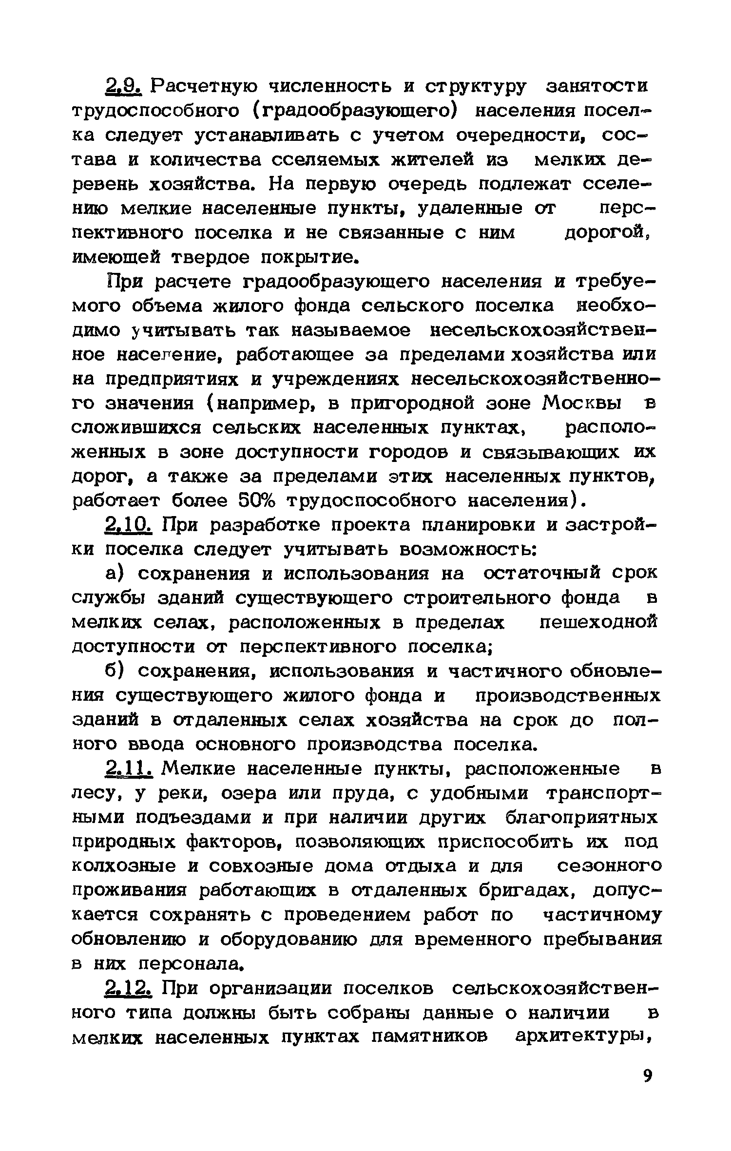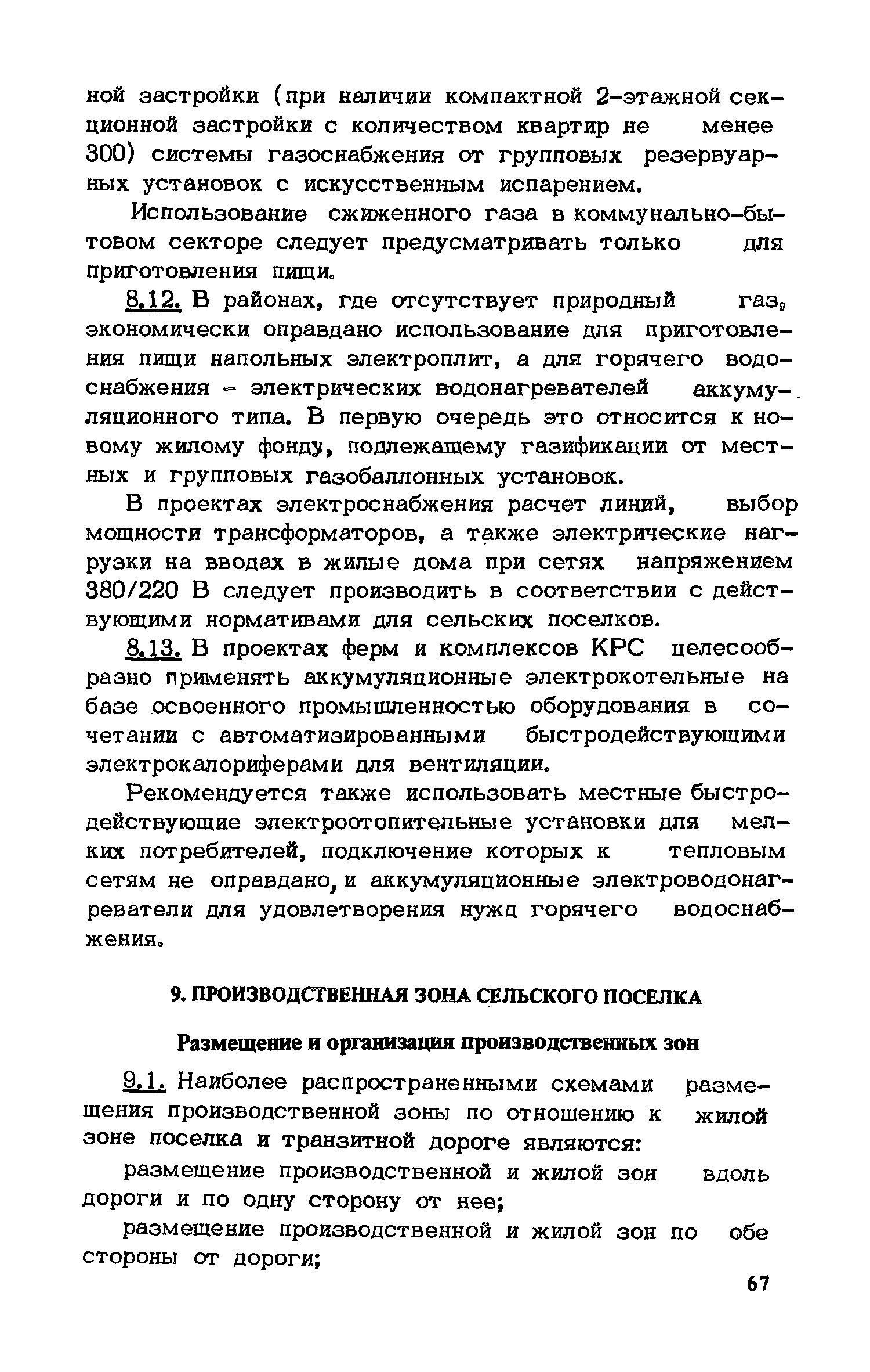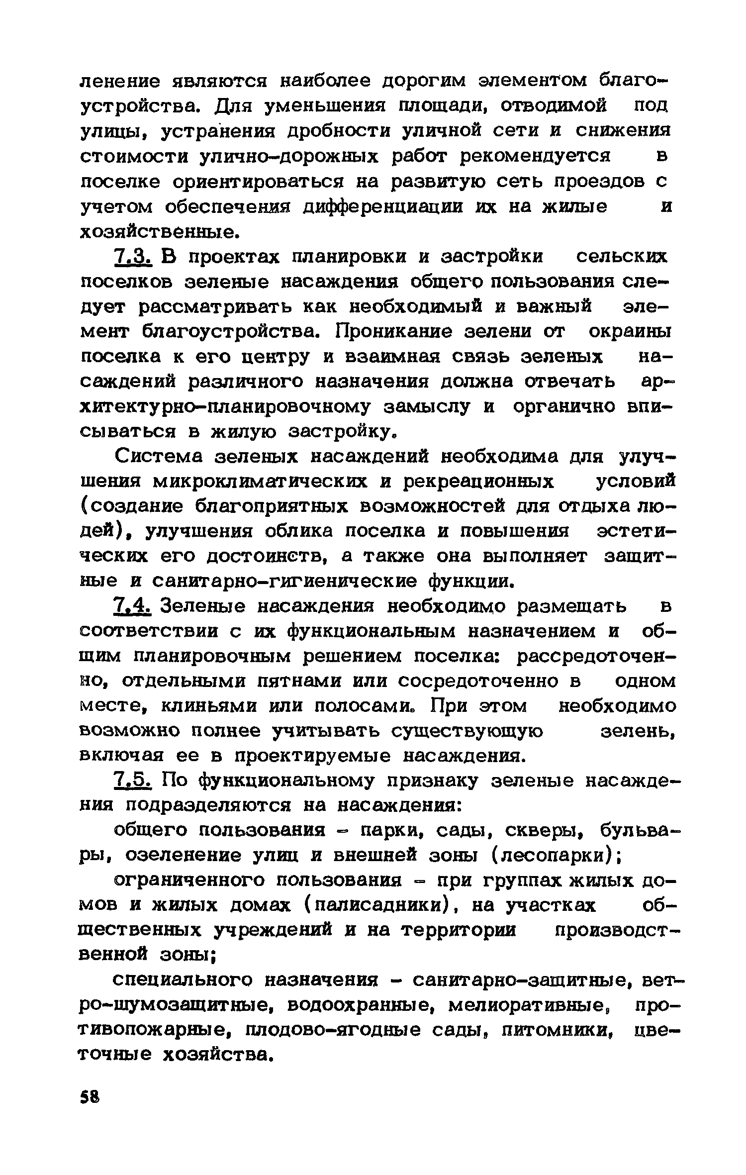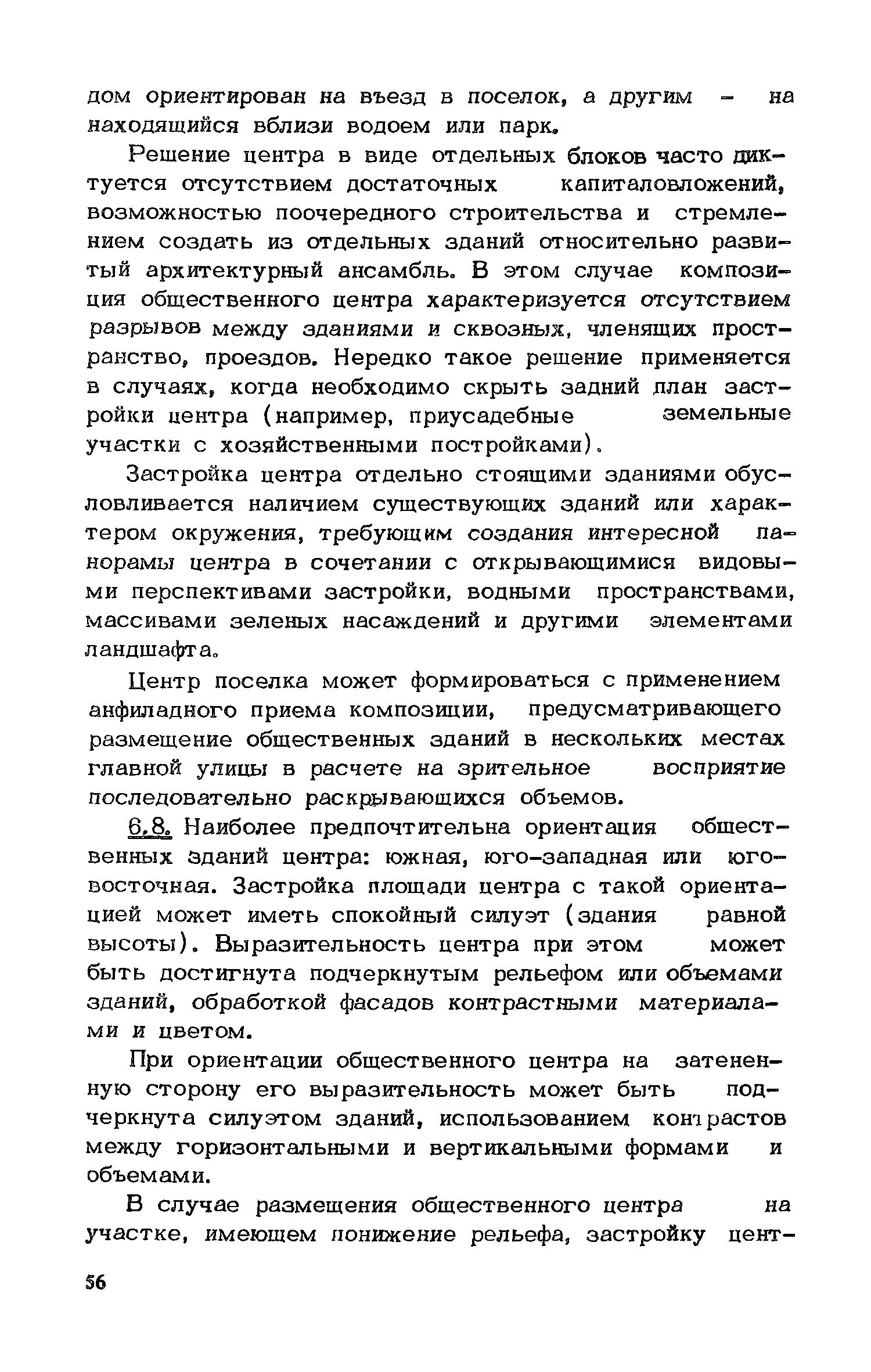| Оглавление: | 1. Общие положения 2. Развитие сельских поселков Перспективные сельские населенные пункты Сселение мелких сельских населенных пунктов Сельские поселки рекреационного типа Технико-экономическое обоснование проектов планировки и застройки поселков 3. Общая организация территории сельского поселка Использование природно-ландшафтных факторов при организации поселка Охрана окружающей среды Выбор территории для строительства поселка Функциональное зонирование территории поселка Размещение первой очереди строительства поселка Использование исторических памятников в композиции сельских поселков 4. Планировка селитебной территории сельского поселка Архитектурно-планировочная организация поселка Планировка в условиях реконструкции поселка Определение объемов жилищного строительства 5. Застройка селитебной территории сельского поселка Жилая застройка Застройка усадебными домами Застройка блокированными домами Застройка секционными жилыми домами Размещение участков и хозяйственных построек при домах различных типов Организация личного подсобного хозяйства 6. Общественный центр поселка Размещение и застройка центра 7. Внешнее благоустройство и озеленение сельского поселка Размещение зеленых насаждений общего пользования Озеленение санитарно-защитной зоны Малые архитектурные формы 8. Инженерное оборудование сельских поселков Водоснабжение, канализация, теплоснабжение, газоснабжение, электроснабжение 9. Производственная зона сельского поселка Размещение и организация производственных зон Состав производственной зоны Формирование территории животноводческих комплексов Приложение 1. Определение стоимостного показателя по проекту поселка Приложение 2. Определение расчетной численности рекреантов при проектирования поселков рекреационного типа Приложение 3. Расстояния между жилыми зданиями в застройке различной этажности Приложение 4. Размеры земельных участков школ в зависимости от числа учащихся Приложение 5. Расстояния от жилых и общественных зданий до наземных гаражей с различным числом автомобилей Приложение 6. Соотношения площадей элементов селитебной территории поселка при различной жилой застройки Приложение 7. Плотность жилого фонда селитебной территории сельского населенного пункта при различных типах жилых домов Приложение 8. Минимальные санитарно-гигиенические разрывы для хозяйственных построек и сооружений различного назначения Приложение 9. Допустимые продольные уклоны дорог, улиц и проездов в поселках Приложение 10. Размеры спортивных сооружений Приложение 11. Санитарно-гигиенические требования к очистке территории сельского населенного пункта |