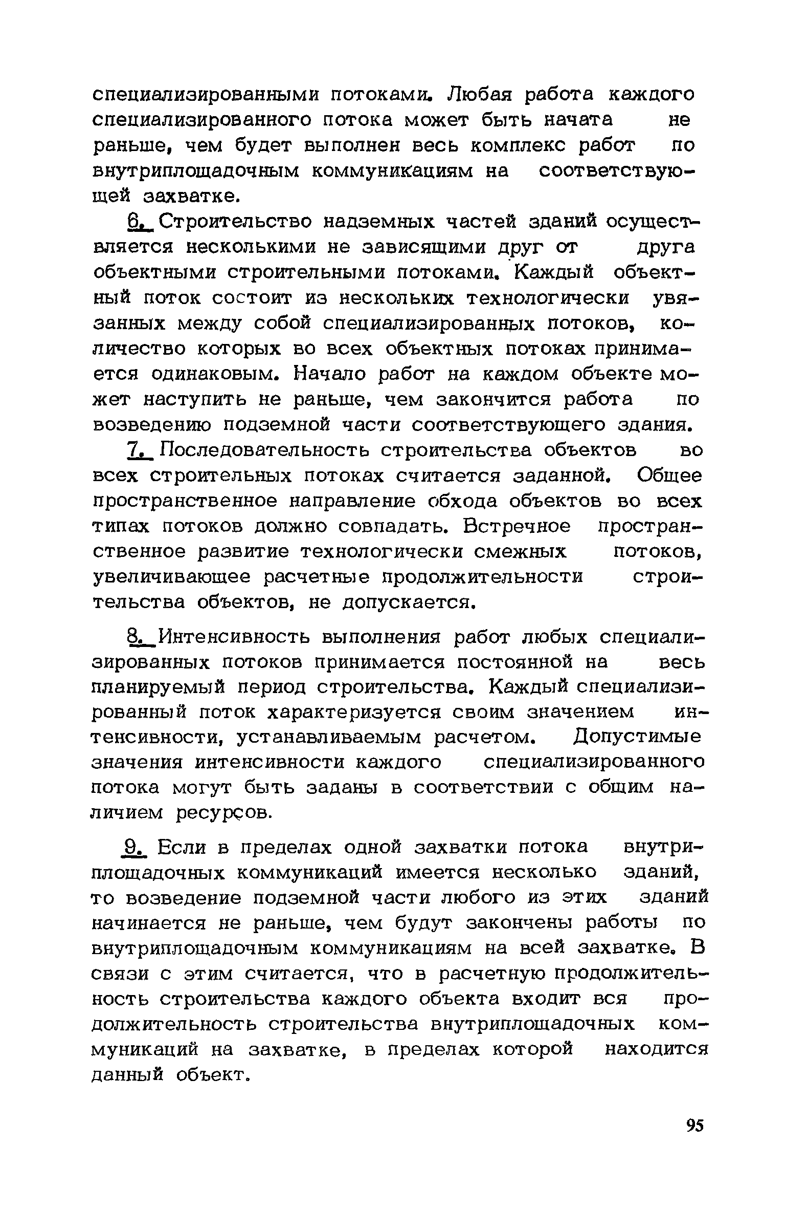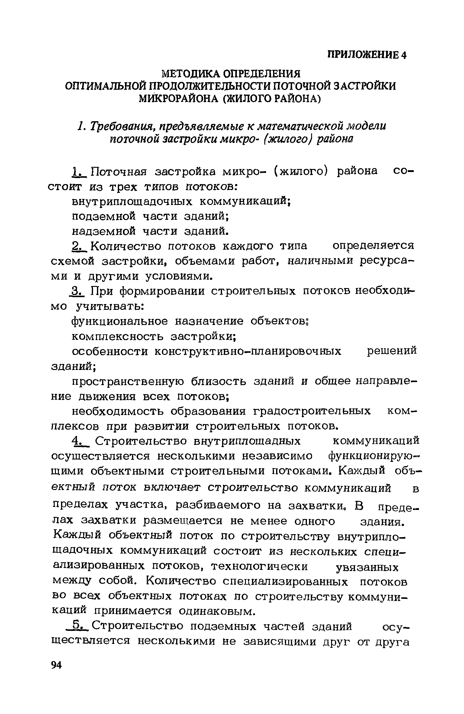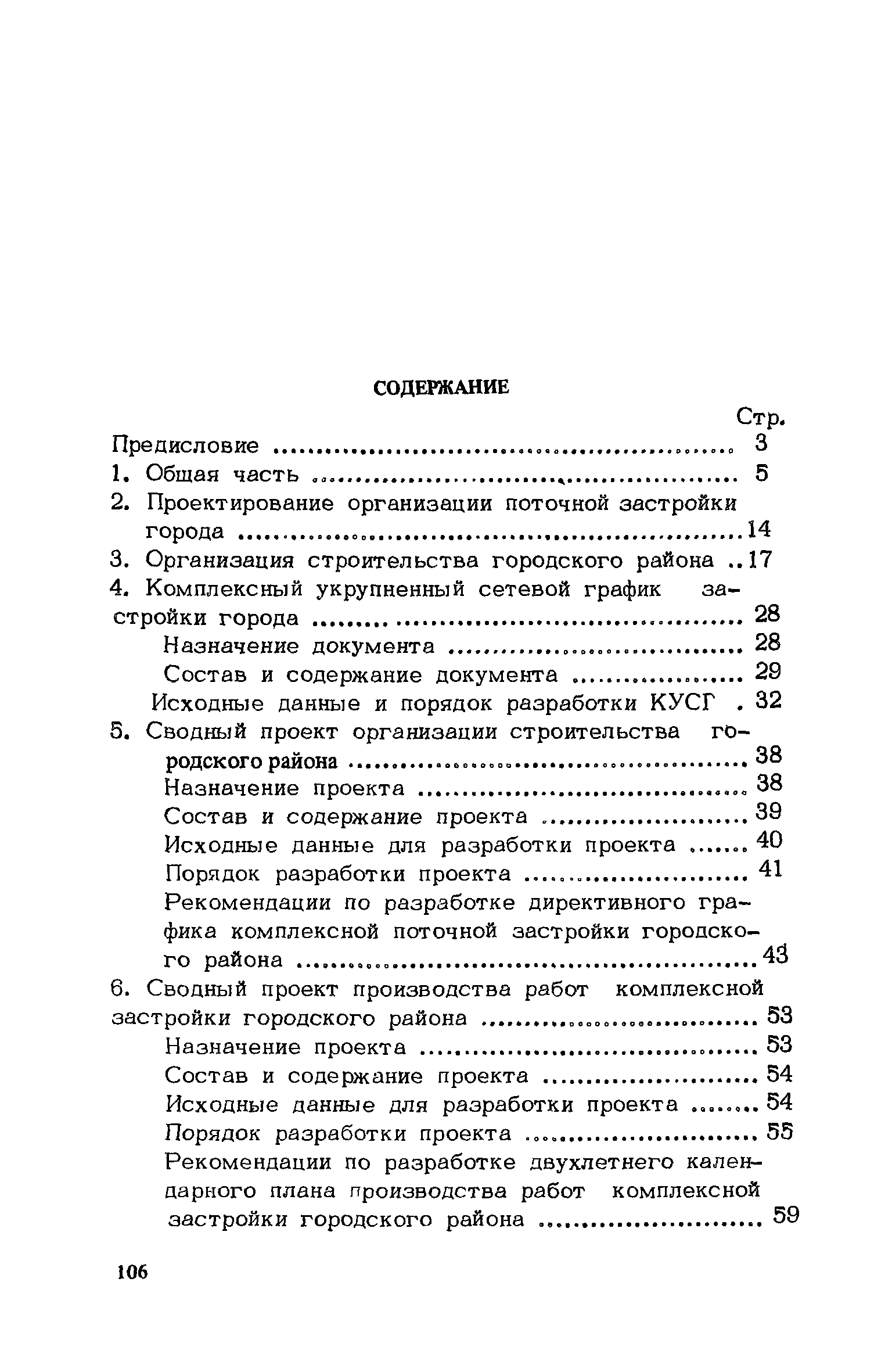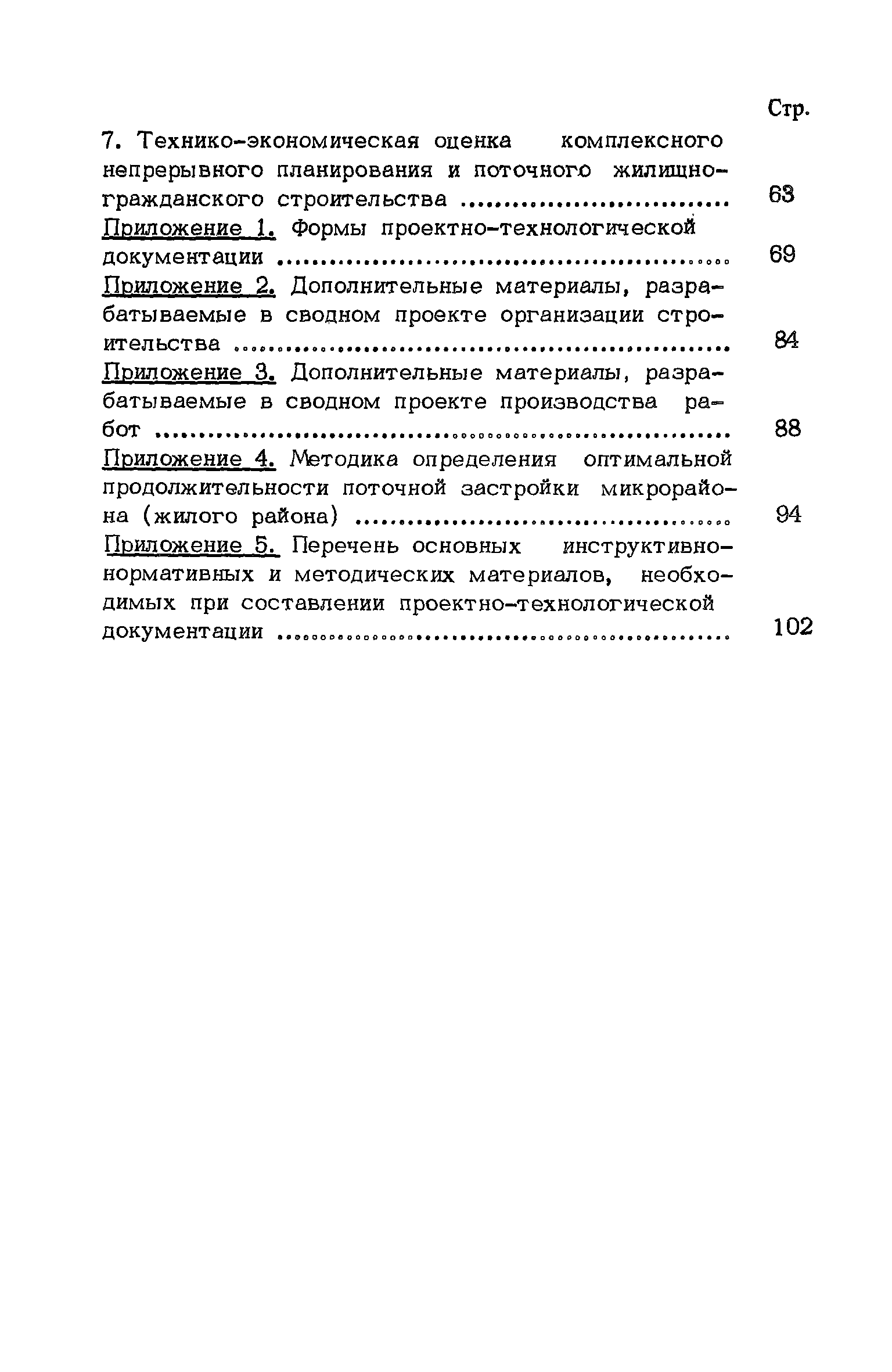 | Оглавление: | Предисловие 1. Общая часть 2. Проектирование организации поточной застройки города 3. Организация строительства городского района 4. Комплексный укрупненный сетевой график застройки города Назначение документа Состав и содержание документа Исходные данные и порядок разработки КУСГ 5. Сводный проект организации строительства городского района Назначение проекта Состав и содержание проекта Исходные данные для разработки проекта Порядок разработки проекта Рекомендации по разработке директивного графика комплексной поточной застройки городского района 6. Сводный проект производства работ комплексной застройки городского района Назначение проекта Состав и содержание проекта Исходные данные для разработки проекта Порядок разработки проекта Рекомендации по разработке двухлетнего календарного плана производства работ комплексной застройки городского района 7. Технико-экономическая оценка комплексного непрерывного планирования и поточного жилищно-гражданского строительства Приложение1. Формы проектно-технологической документации Приложение 2. Дополнительные материалы, разрабатываемые в сводном проекте организации строительства Приложение 3. Дополнительные материалы, разрабатываемые в сводном проекте производства работ Приложение 4. Методика определения оптимальной продолжительности поточной застройки микрорайона (Жилого района) Приложение 5. Перечень основных инструктивно-нормативных и методических материалов, необходимых при составлении проектно-технологической документации |