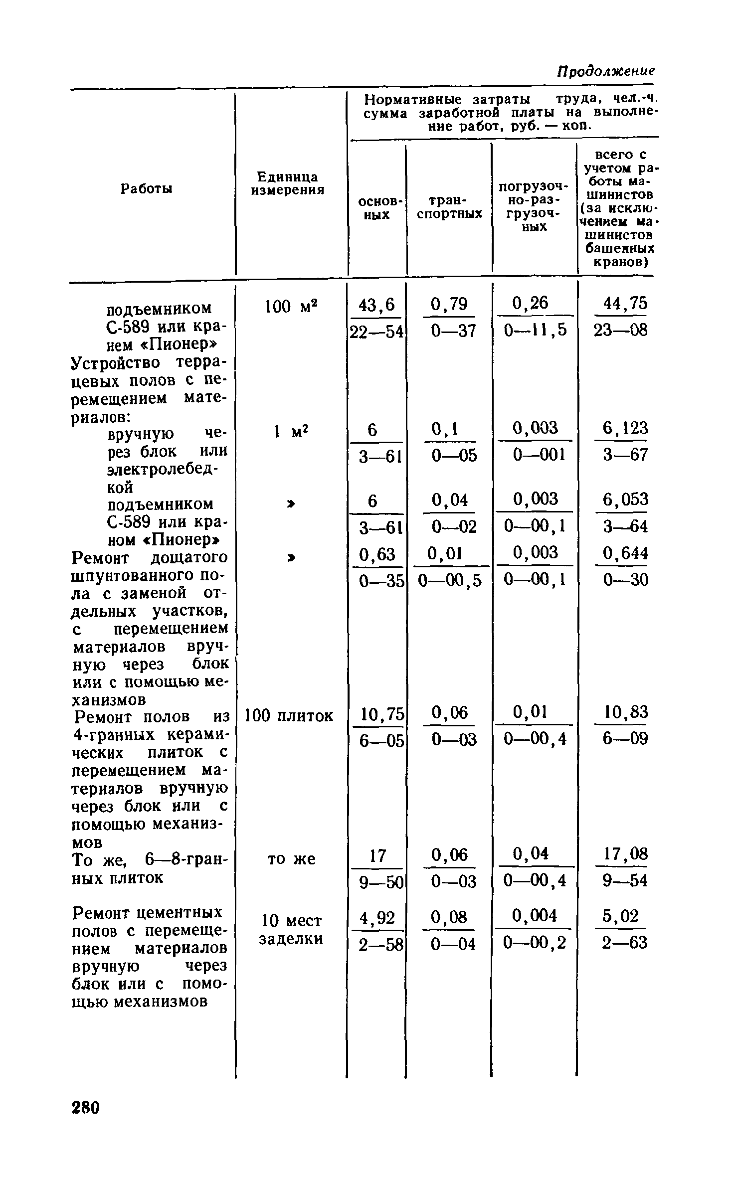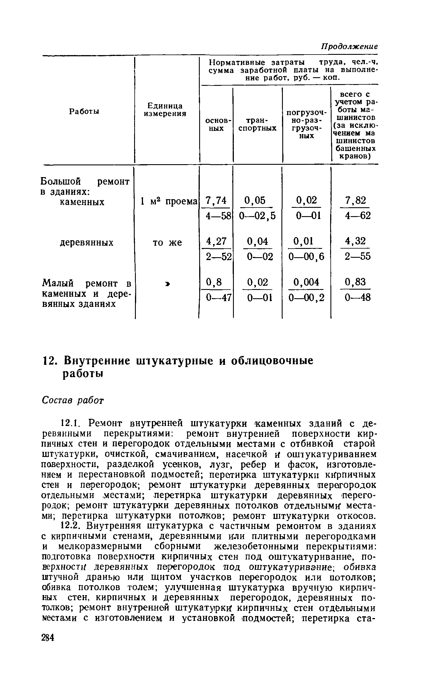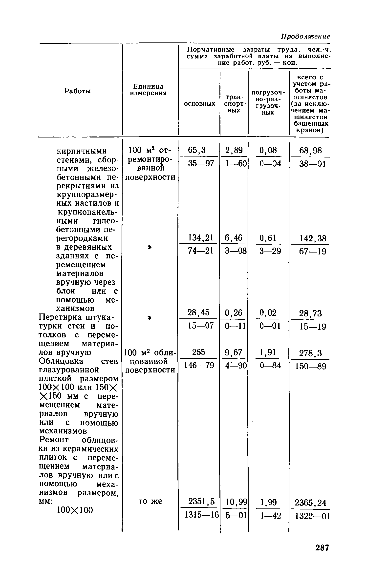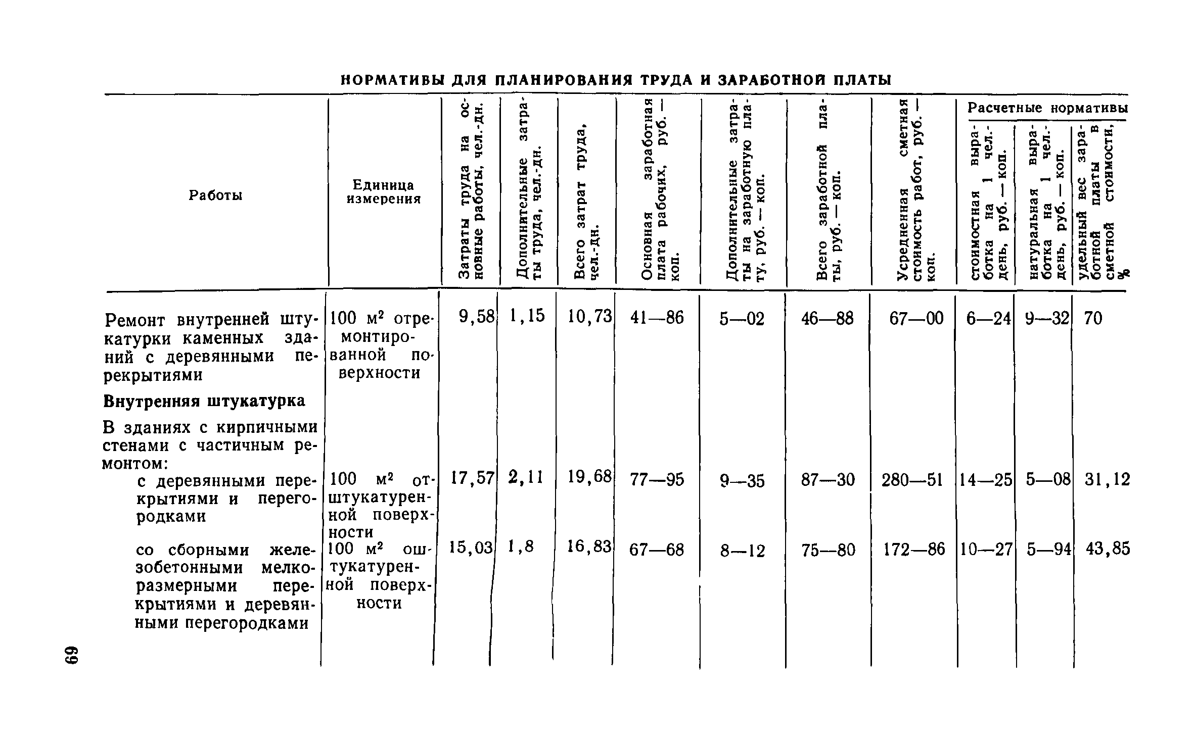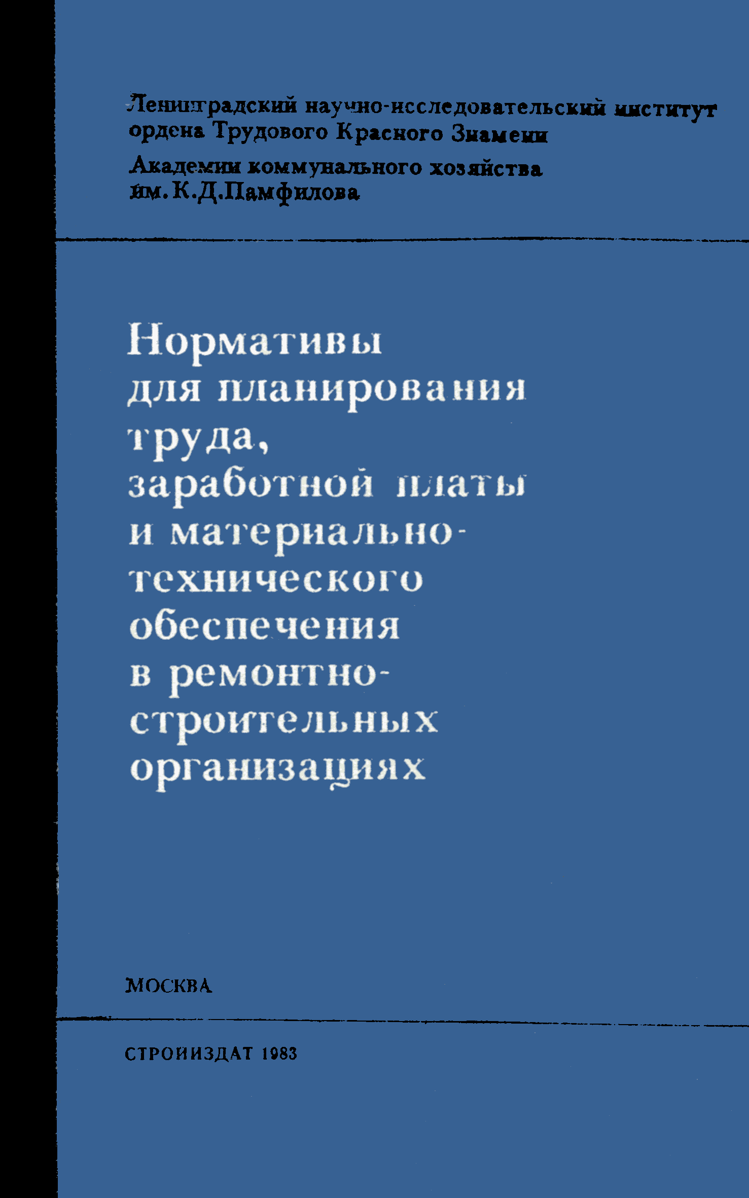 Нормативы для планирования труда, заработной платы и материально-технического обеспечения в ремонтно-строительных организациях| Статус: | справочные материалы, мп, тпр | | Название рус.: | Нормативы для планирования труда, заработной платы и материально-технического обеспечения в ремонтно-строительных организациях | | Дата добавления в базу: | 01.09.2013 | | Дата актуализации: | 01.01.2021 | | Область применения: | В документе приведены нормативы на основные виды общестроительных, электромонтажных и специальных работ, выполняемых при капитальном ремонте жилых и общественных зданий, нормативные затраты труда и заработной платы на измерители конечной продукции, затраты на выполнение всего комплекса основных, транспортных и погрузочно-разгрузочных работ, необходимых для выполнения единицы работы. Для инженерно-технических работников ремонтно-строительных и проектно-сметных организаций. | | Оглавление: | Предисловие Общие положения Базовые стоимостные нормативы затрат труда и заработной платы 1. Разборка строительных конструкций 2. Демонтаж инженерного оборудования 3. Фундаменты 4. Стены 5. Перекрытия 6. Перегородки 7. Лестницы н крыльца 8. Крыши 9. Печи и трубы 10. Полы 11. Оконные и дверные проемы 12. Внутренние штукатурные и облицовочные работы 13. Малярные и стекольные работы 14. Ремонт фасадов 15. Разные работы 16. Внутренние санитарно-технические работы 17. Внутренние электромонтажные и слаботочные работы 18. Наружные сети (с земляными работами) 19. Благоустройство 20. Оборудование отопительных котельных Укрупненные нормативные затраты труда и заработной платы на комплексные ремонтно-строительные процессы с подразделением на основные, транспортные и погрузочно-разгрузочные работы Общая часть 1. Разборка строительных конструкций 2. Демонтаж инженерного оборудования 3. Фундаменты 4. Стены 5. Перекрытия 6. Перегородки 7. Лестницы и крыльца 8. Крыши 9. Печи и трубы 10. Полы 11. Оконные и дверные проемы 12. Внутренние штукатурные и облицовочные работы 13. Малярные и стекольные работы 14. Ремонт фасадов 15. Разные работы 16. Внутренние санитарно-технические работы 17. Внутренние электромонтажные и слаботочные работы 18. Наружные сети (с земляными работами) 19. Благоустройство 20. Оборудование отопительных котельных Укрупненные нормативные затраты труда и заработной платы на комплексные ремонтно-строительные процессы Общая часть 1. Разборка строительных конструкций 2. Демонтаж инженерного оборудования 3. Фундаменты 4. Стены 5. Перекрытия 6. Перегородки 7. Лестницы и крыльца 8. Крыши 9. Печи и трубы 10. Полы 11. Оконные и дверные проемы 12. Внутренние штукатурные и облицовочные работы 13. Малярные и стекольные работы 14. Ремонт фасадов 15. Разные работы 16. Внутренние санитарно-технические работы 17. Внутренние электромонтажные и слаботочные работы 18. Наружные сети (с земляными работами) 19. Благоустройство 20. Оборудование отопительных котельных | | Разработан: | Ленинградский НИИ АКХ им. К.Д. Памфилова ЦНИС МЖКХ РСФСР Трест Оргремжилстрой