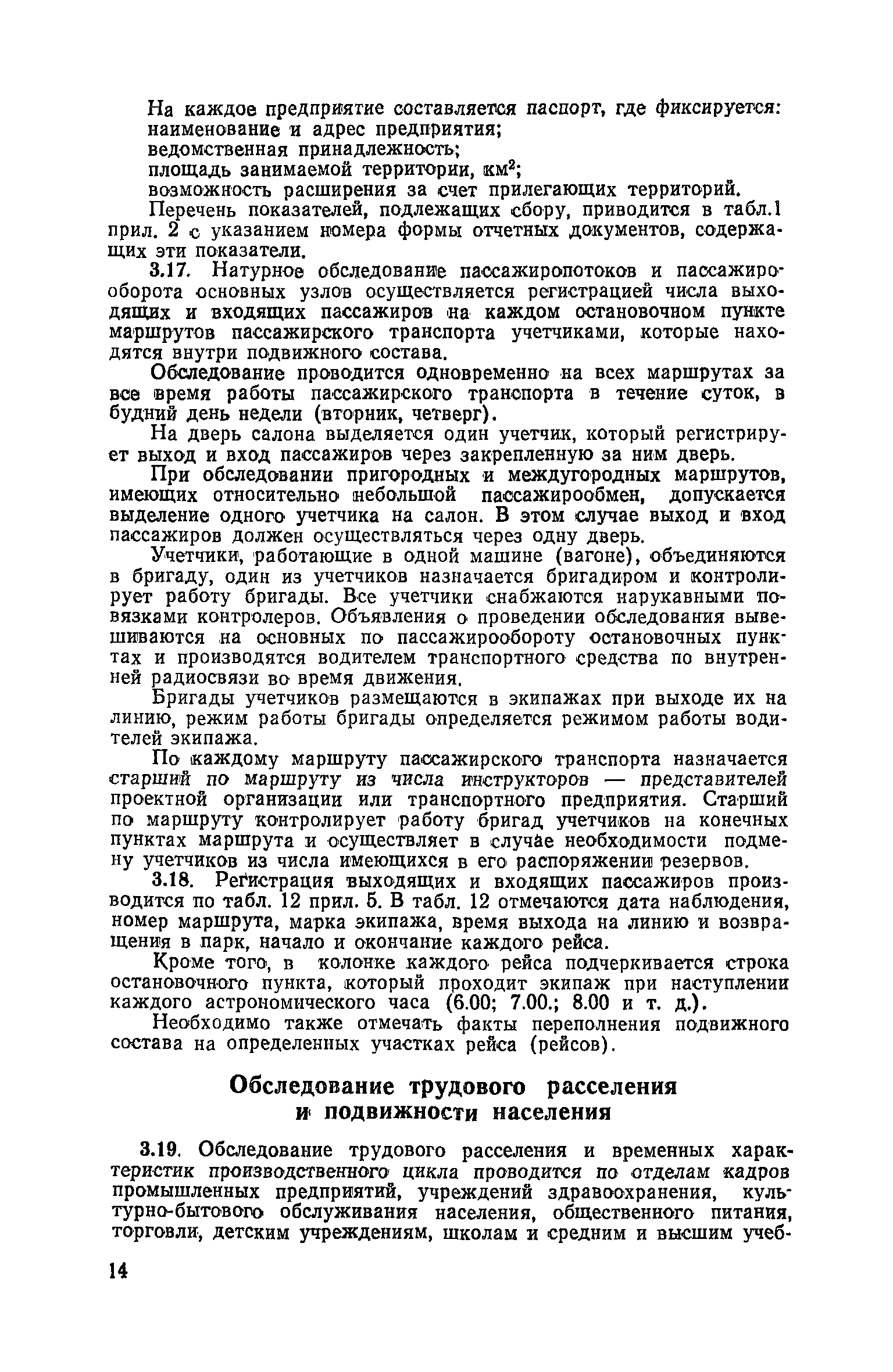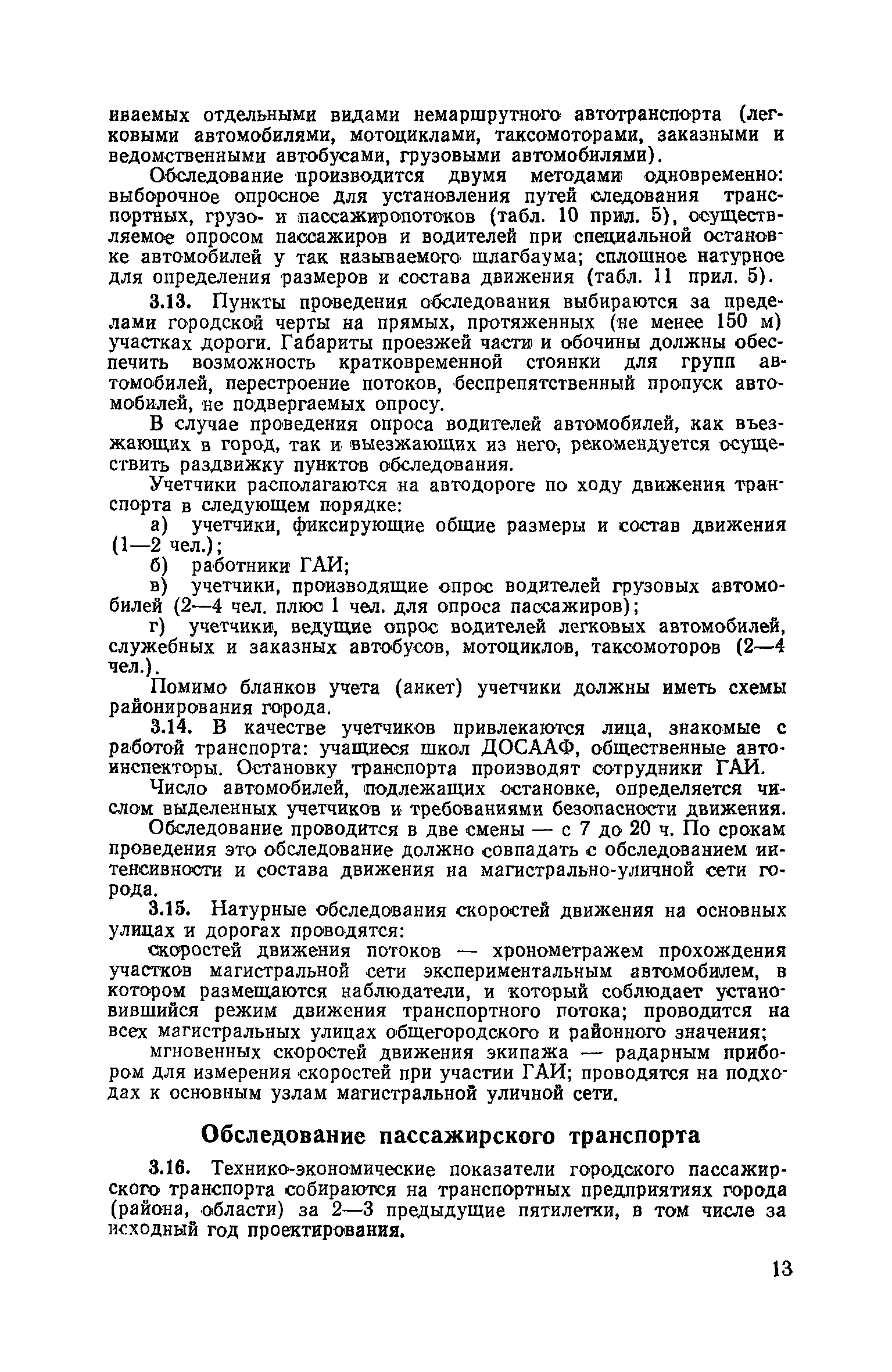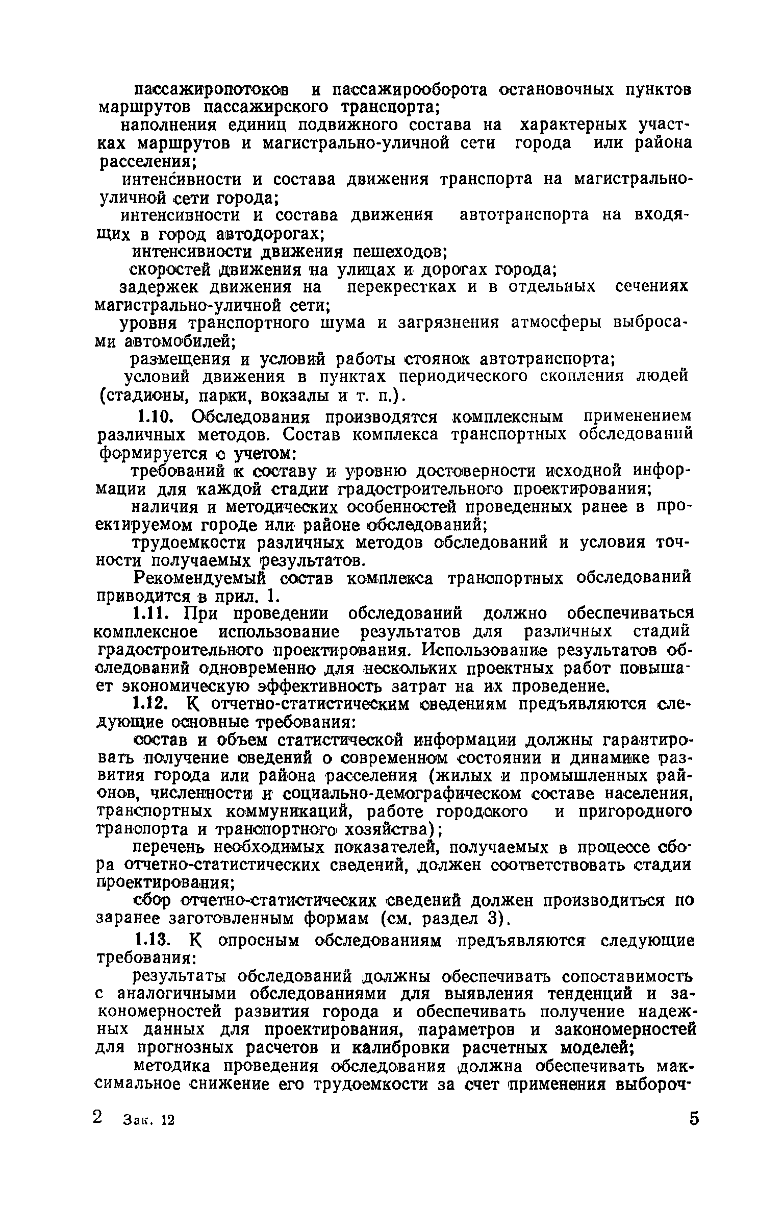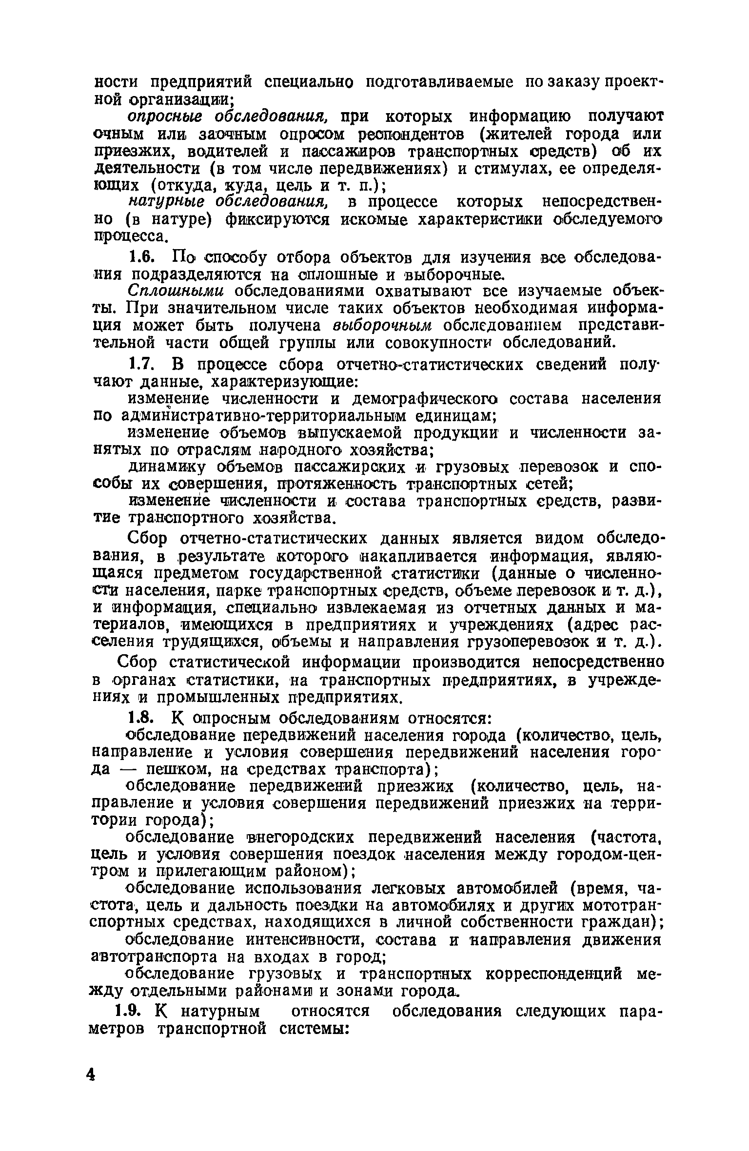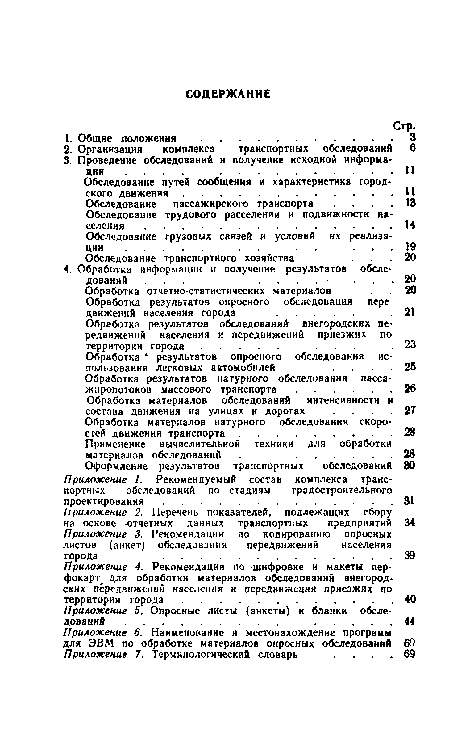 | Оглавление: | 1. Общие положения 2. Организация комплекса транспортных обследований 3. Проведение обследований и получение исходной информации Обследование путей сообщения и характеристика городского движения Обследование пассажирского транспорта Обследование трудового расселения и подвижности населения Обследование грузовых связей и условий их реализации Обследование транспортного хозяйства 4. Обработка информации н получение результатов обследований Обработка отчетно-статистических материалов Обработка результатов опросного обследования передвижений населения города Обработка результатов обследований внегородских передвижений населения и передвижений приезжих по территории города Обработка результатов опросного обследования использования легковых автомобилей Обработка результатов натурного обследования пассажиропотоков массового транспорта Обработка материалов обследований интенсивности состава движения на улицах и дорогах Обработка материалов натурного обследования скоростей движения транспорта Применение вычислительной техники для обработки материалов обследований Оформление результатов транспортных обследований Приложение 1. Рекомендуемый состав комплекса транспортных обследований по стадиям градостроительного проектирования Приложение 2. Перечень показателей, подлежащих сбору на основе отчетных данных транспортных предприятий Приложение 3. Рекомендации по кодированию опросных листов (анкет) обследования передвижений населения города Приложение 4. Рекомендации по шифровке и макеты перфокарт для обработки материалов обследований внегородских передвижений населения и передвижения приезжих по территории города Приложение 5. Опросные листы (анкеты) и бланки обследований приложение 6. Наименование и местонахождение программ для ЭВМ по обработке материалов опросных обследований Приложение 7. Терминологический словарь |