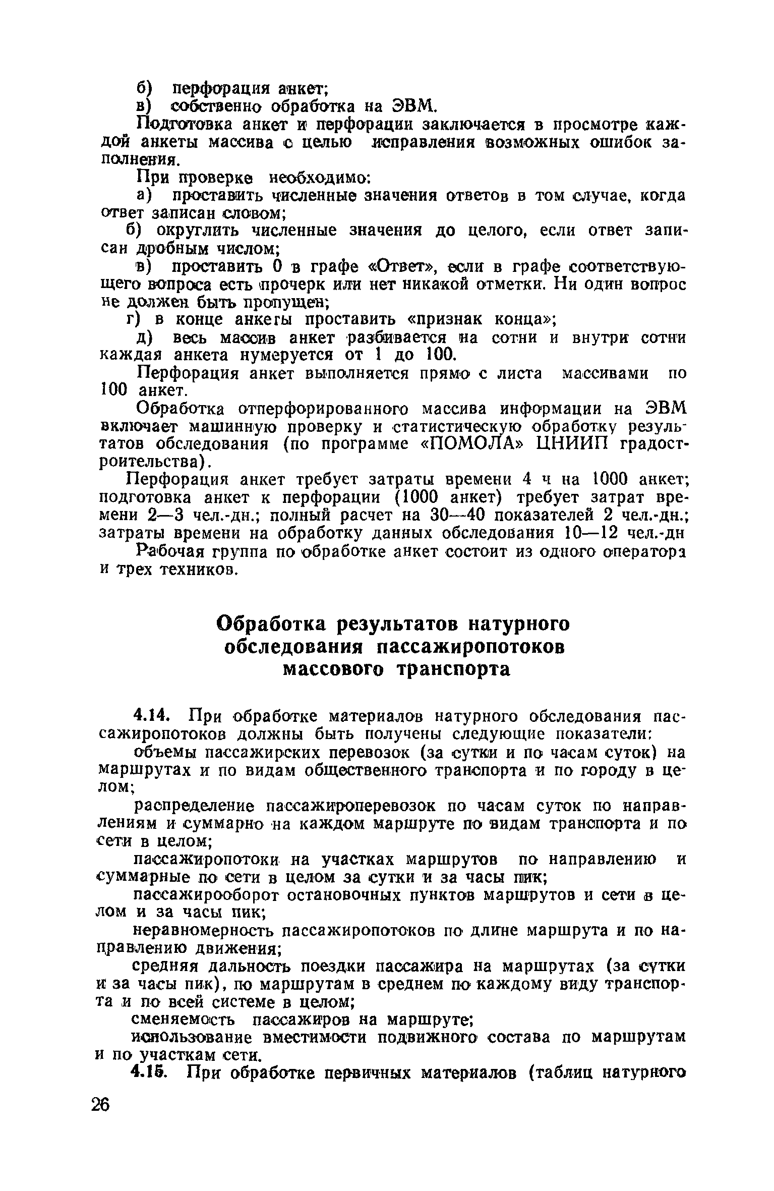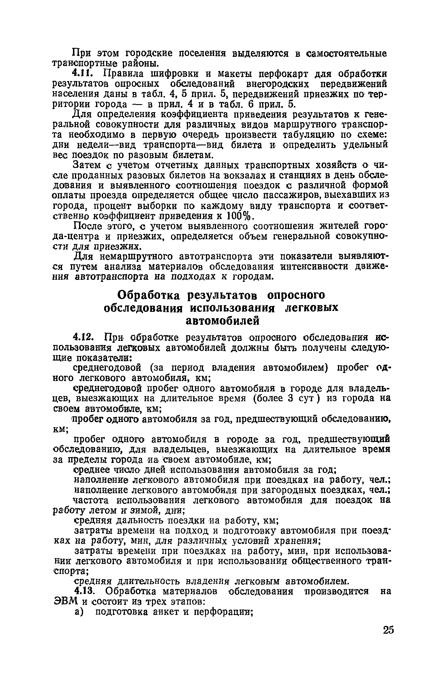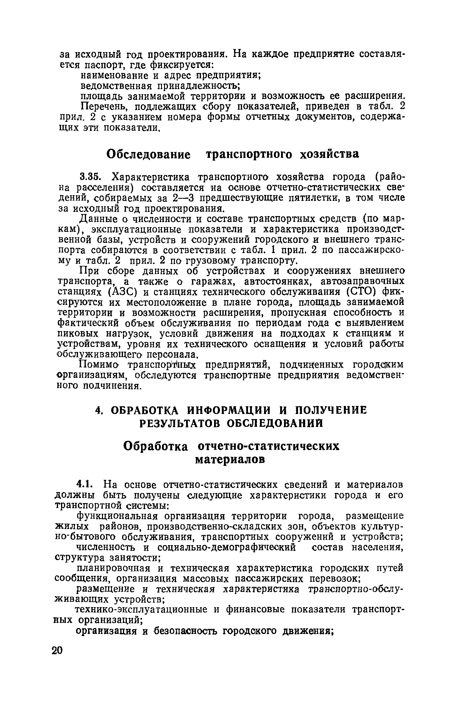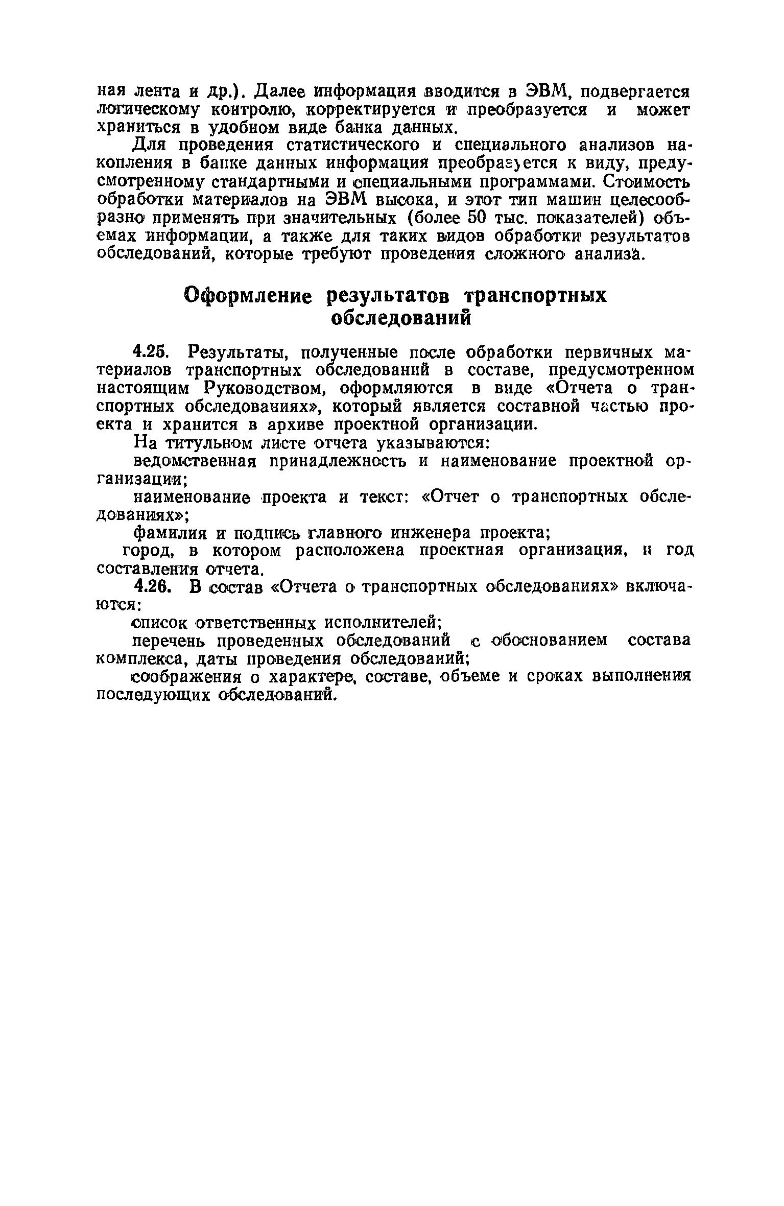 | Оглавление: | 1. Общие положения 2. Организация комплекса транспортных обследований 3. Проведение обследований и получение исходной информации Обследование путей сообщения и характеристика городского движения Обследование пассажирского транспорта Обследование трудового расселения и подвижности населения Обследование грузовых связей и условий их реализации Обследование транспортного хозяйства 4. Обработка информации н получение результатов обследований Обработка отчетно-статистических материалов Обработка результатов опросного обследования передвижений населения города Обработка результатов обследований внегородских передвижений населения и передвижений приезжих по территории города Обработка результатов опросного обследования использования легковых автомобилей Обработка результатов натурного обследования пассажиропотоков массового транспорта Обработка материалов обследований интенсивности состава движения на улицах и дорогах Обработка материалов натурного обследования скоростей движения транспорта Применение вычислительной техники для обработки материалов обследований Оформление результатов транспортных обследований Приложение 1. Рекомендуемый состав комплекса транспортных обследований по стадиям градостроительного проектирования Приложение 2. Перечень показателей, подлежащих сбору на основе отчетных данных транспортных предприятий Приложение 3. Рекомендации по кодированию опросных листов (анкет) обследования передвижений населения города Приложение 4. Рекомендации по шифровке и макеты перфокарт для обработки материалов обследований внегородских передвижений населения и передвижения приезжих по территории города Приложение 5. Опросные листы (анкеты) и бланки обследований приложение 6. Наименование и местонахождение программ для ЭВМ по обработке материалов опросных обследований Приложение 7. Терминологический словарь |