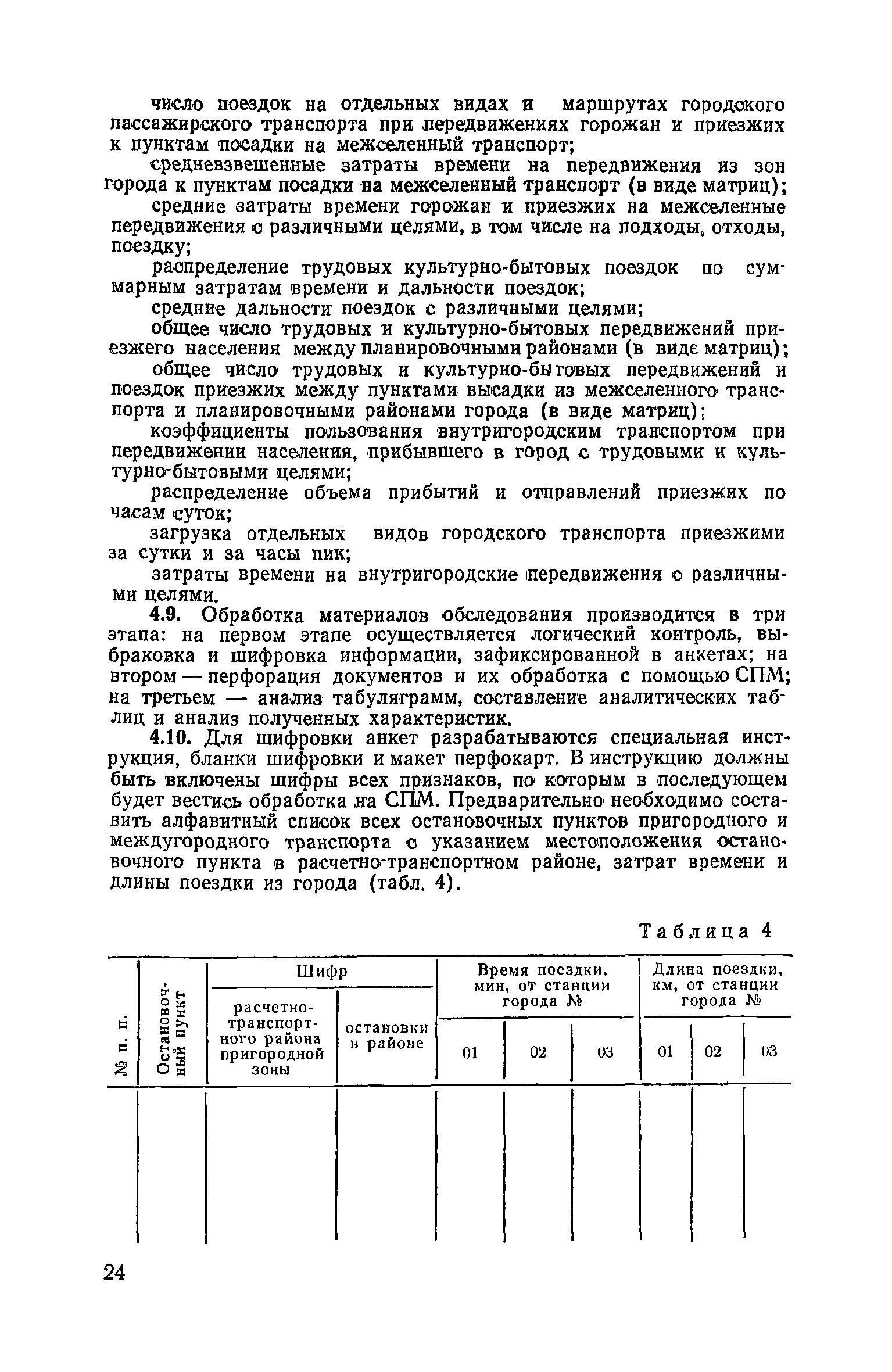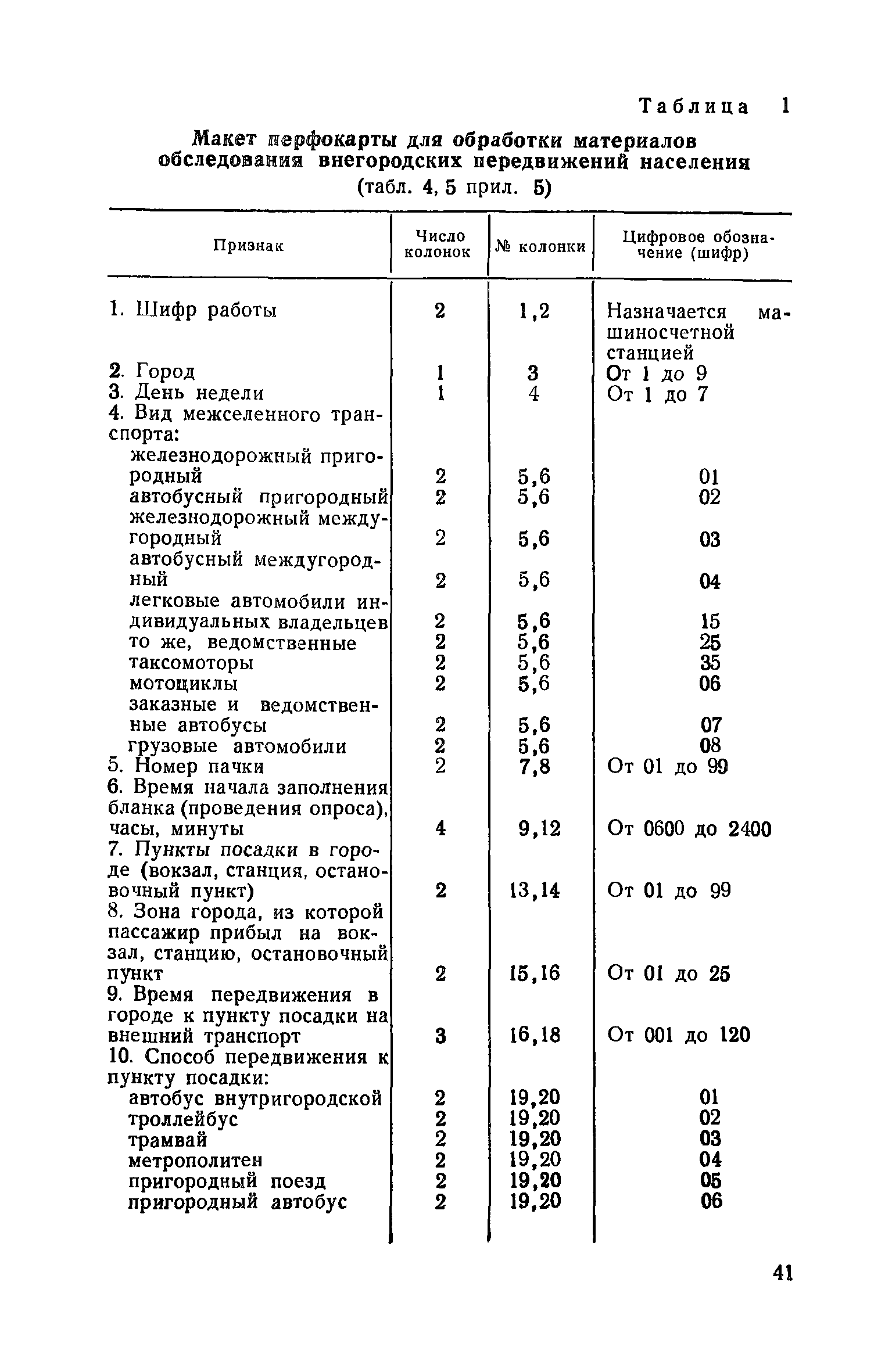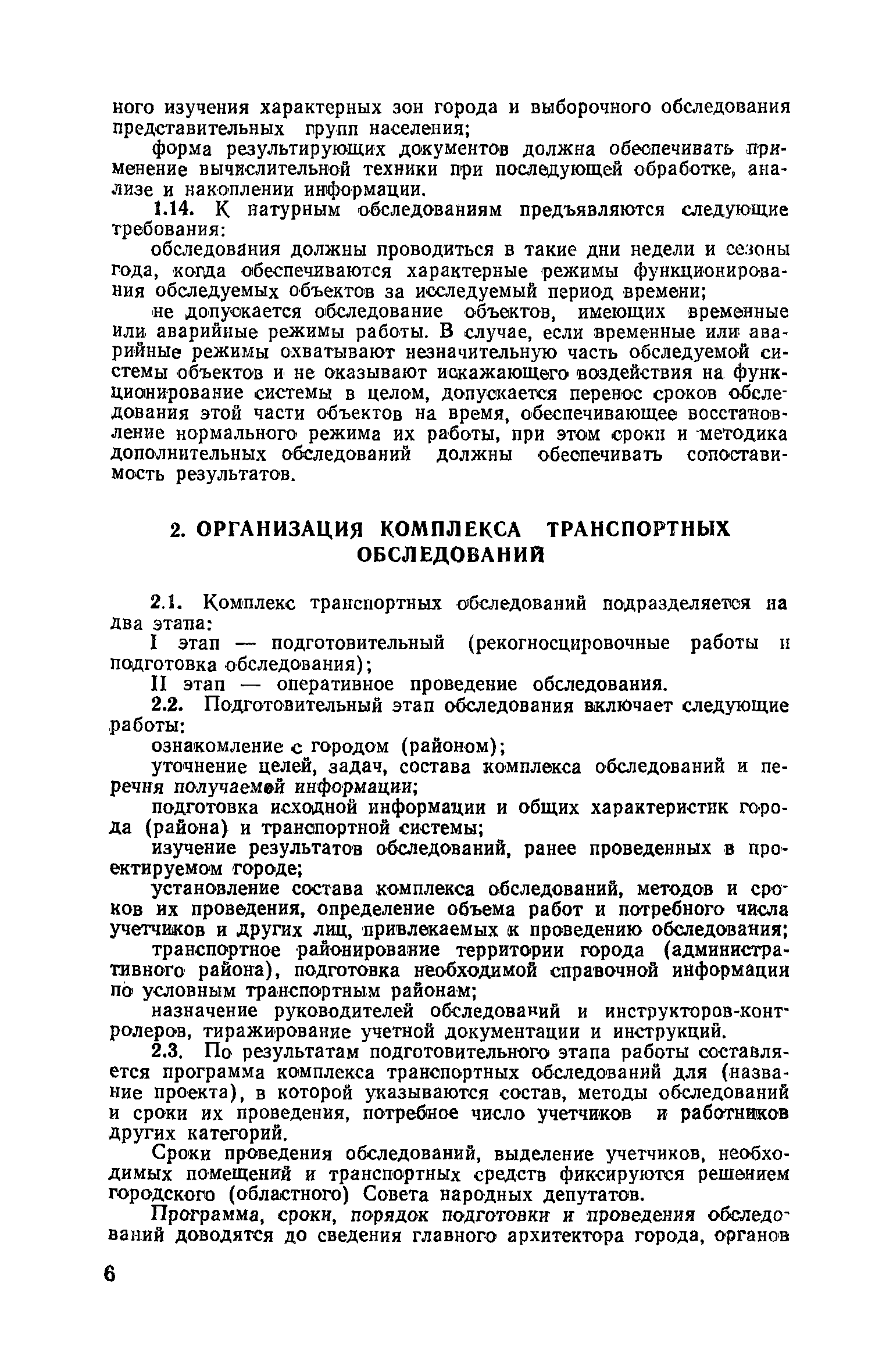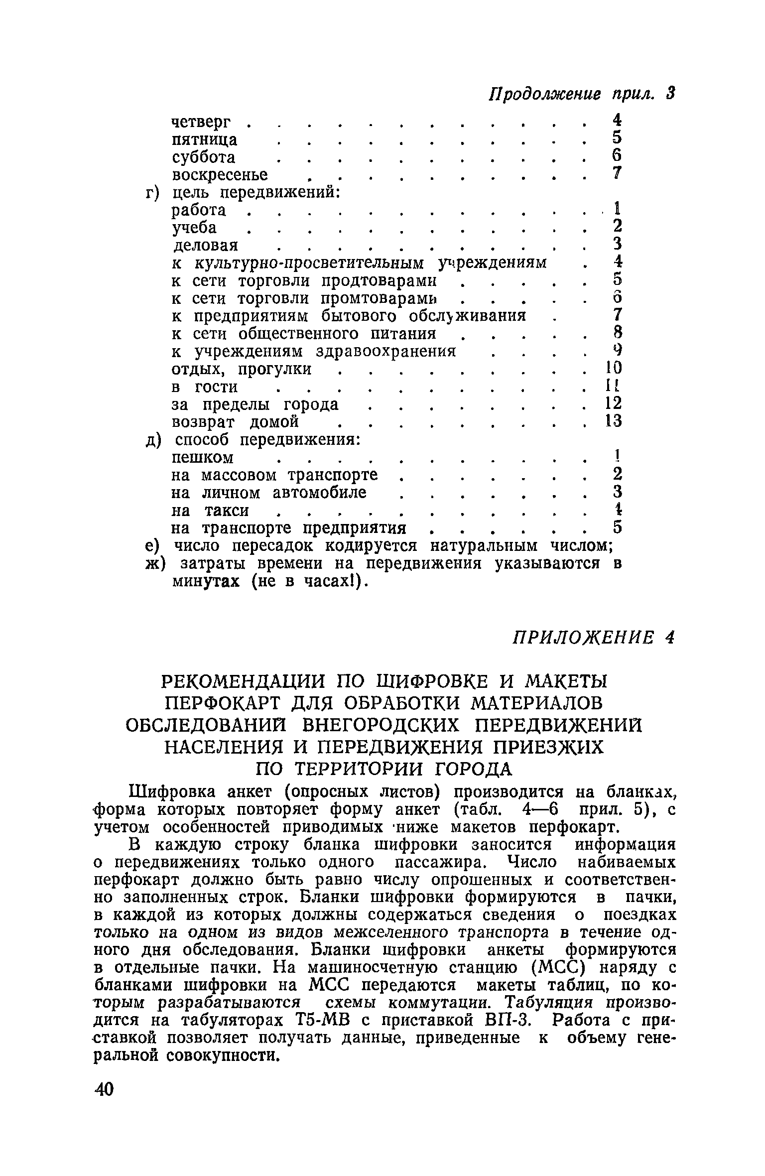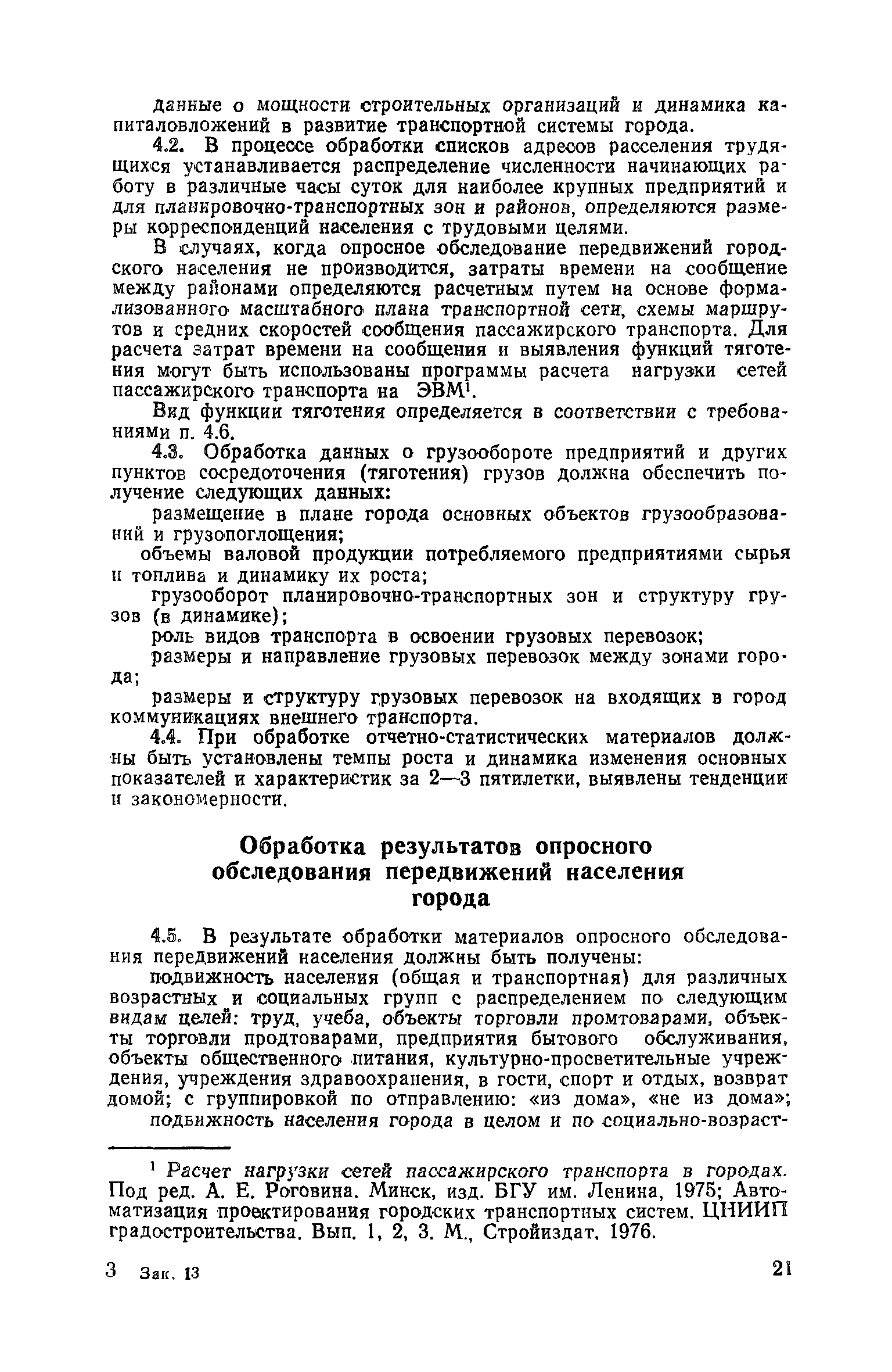 | Оглавление: | 1. Общие положения 2. Организация комплекса транспортных обследований 3. Проведение обследований и получение исходной информации Обследование путей сообщения и характеристика городского движения Обследование пассажирского транспорта Обследование трудового расселения и подвижности населения Обследование грузовых связей и условий их реализации Обследование транспортного хозяйства 4. Обработка информации н получение результатов обследований Обработка отчетно-статистических материалов Обработка результатов опросного обследования передвижений населения города Обработка результатов обследований внегородских передвижений населения и передвижений приезжих по территории города Обработка результатов опросного обследования использования легковых автомобилей Обработка результатов натурного обследования пассажиропотоков массового транспорта Обработка материалов обследований интенсивности состава движения на улицах и дорогах Обработка материалов натурного обследования скоростей движения транспорта Применение вычислительной техники для обработки материалов обследований Оформление результатов транспортных обследований Приложение 1. Рекомендуемый состав комплекса транспортных обследований по стадиям градостроительного проектирования Приложение 2. Перечень показателей, подлежащих сбору на основе отчетных данных транспортных предприятий Приложение 3. Рекомендации по кодированию опросных листов (анкет) обследования передвижений населения города Приложение 4. Рекомендации по шифровке и макеты перфокарт для обработки материалов обследований внегородских передвижений населения и передвижения приезжих по территории города Приложение 5. Опросные листы (анкеты) и бланки обследований приложение 6. Наименование и местонахождение программ для ЭВМ по обработке материалов опросных обследований Приложение 7. Терминологический словарь |