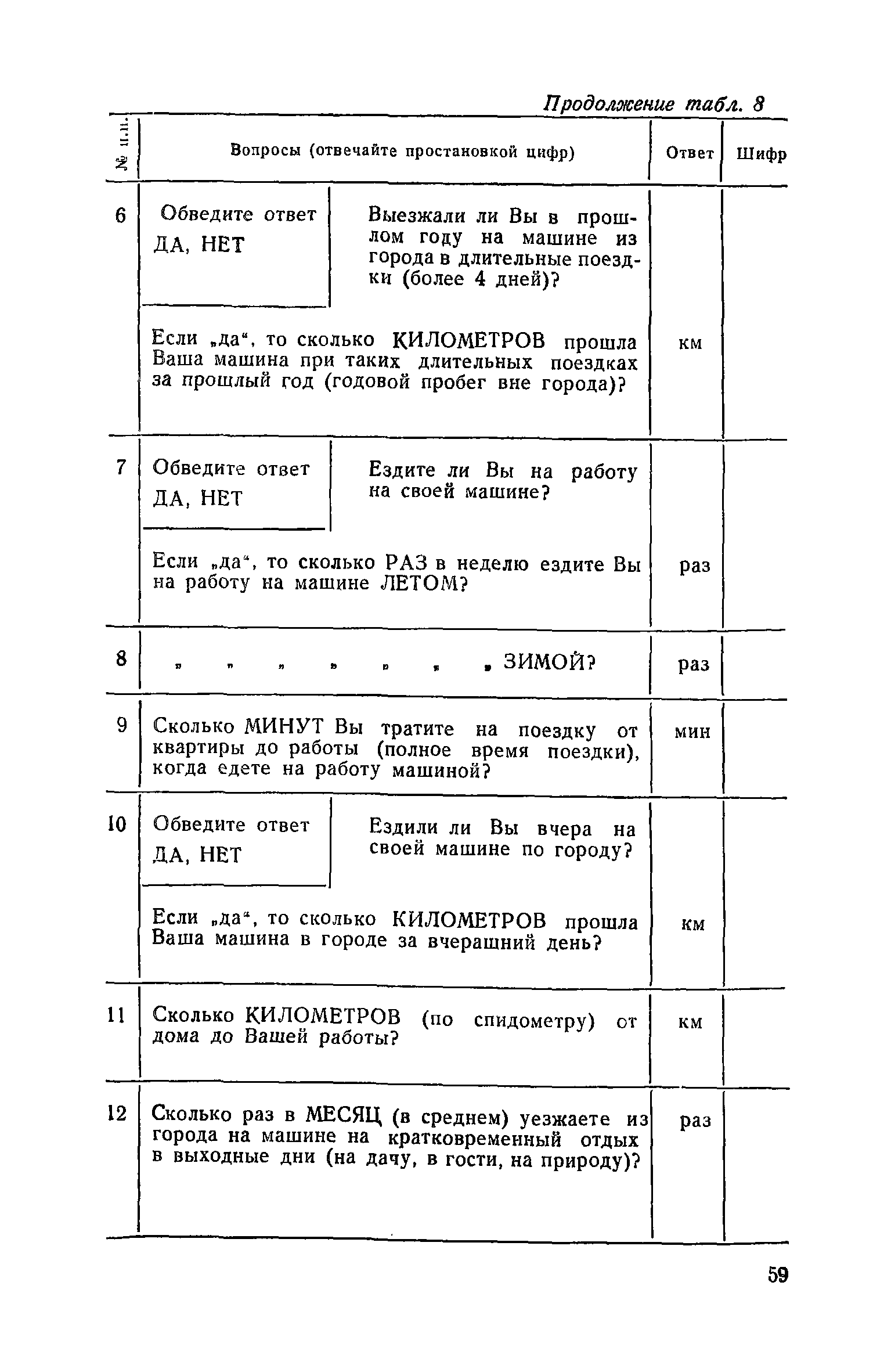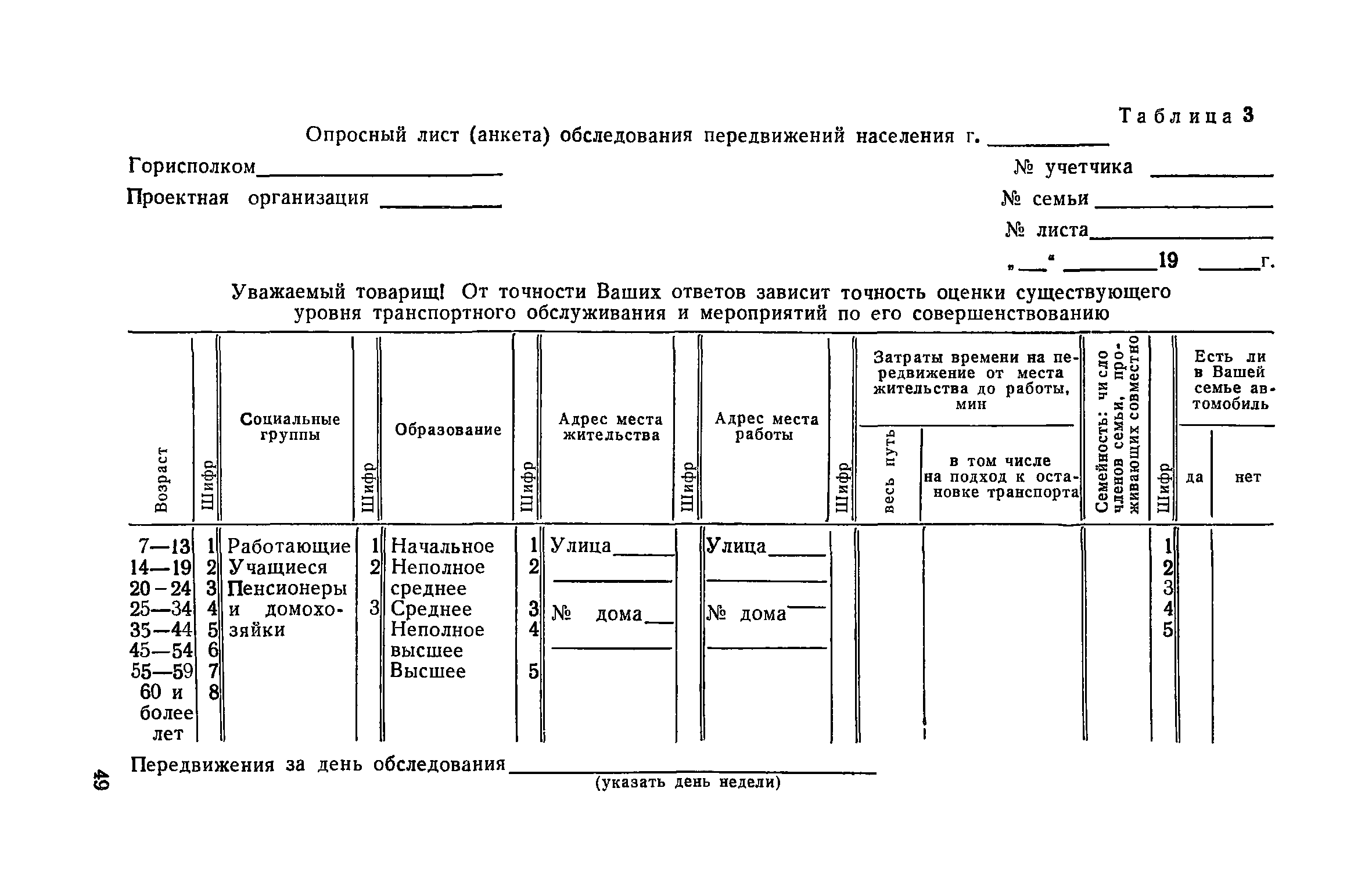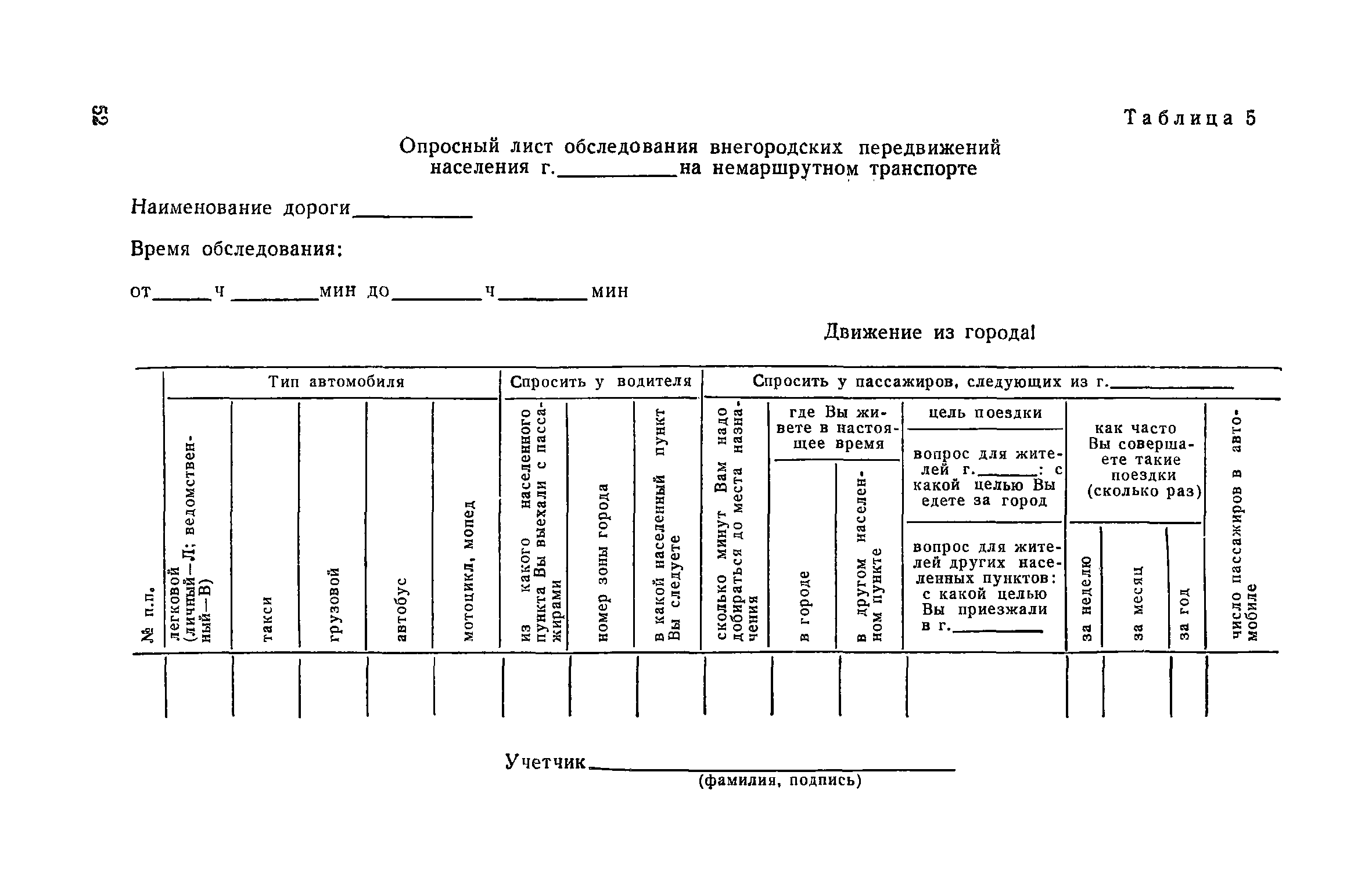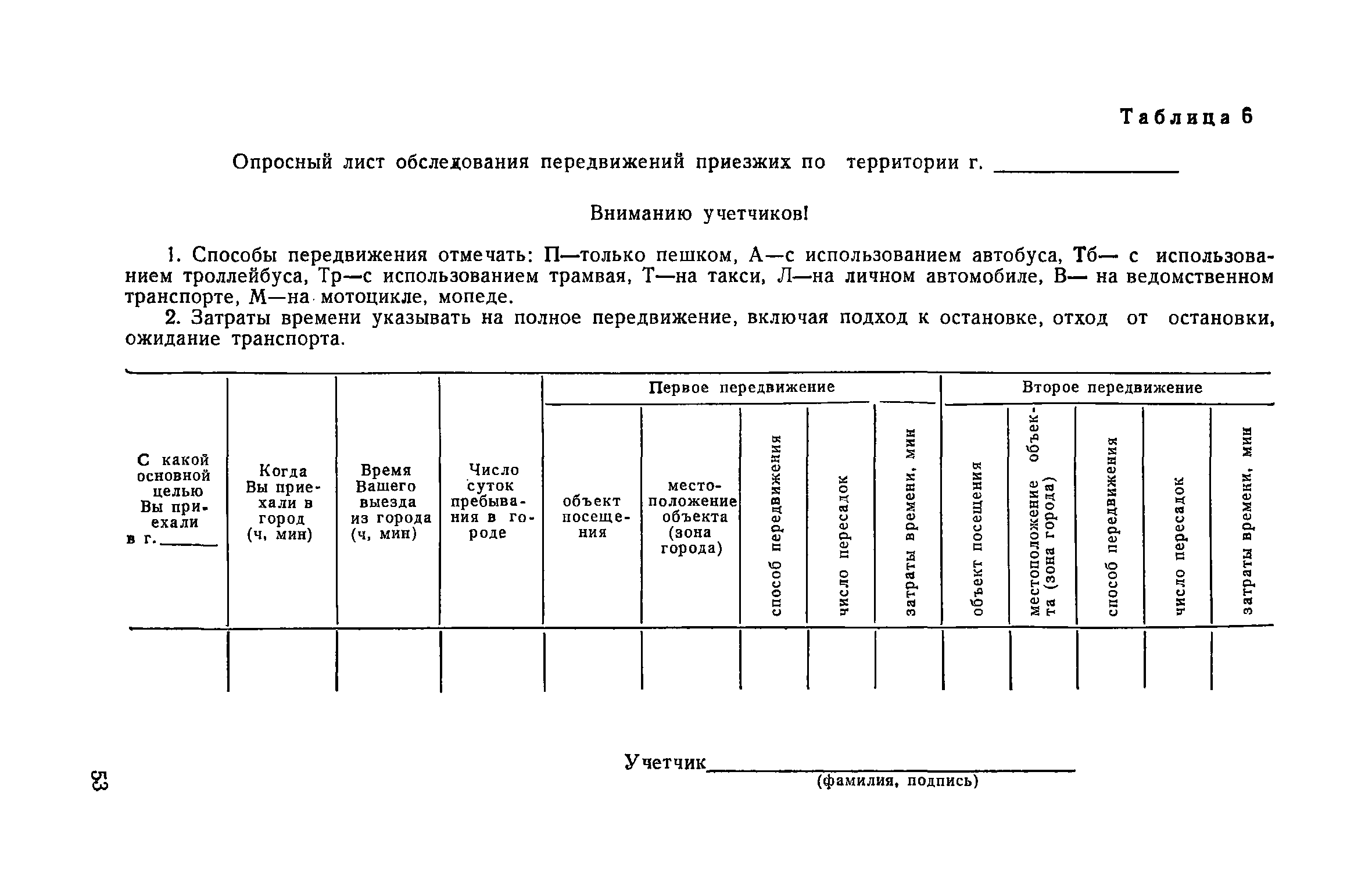 | Оглавление: | 1. Общие положения 2. Организация комплекса транспортных обследований 3. Проведение обследований и получение исходной информации Обследование путей сообщения и характеристика городского движения Обследование пассажирского транспорта Обследование трудового расселения и подвижности населения Обследование грузовых связей и условий их реализации Обследование транспортного хозяйства 4. Обработка информации н получение результатов обследований Обработка отчетно-статистических материалов Обработка результатов опросного обследования передвижений населения города Обработка результатов обследований внегородских передвижений населения и передвижений приезжих по территории города Обработка результатов опросного обследования использования легковых автомобилей Обработка результатов натурного обследования пассажиропотоков массового транспорта Обработка материалов обследований интенсивности состава движения на улицах и дорогах Обработка материалов натурного обследования скоростей движения транспорта Применение вычислительной техники для обработки материалов обследований Оформление результатов транспортных обследований Приложение 1. Рекомендуемый состав комплекса транспортных обследований по стадиям градостроительного проектирования Приложение 2. Перечень показателей, подлежащих сбору на основе отчетных данных транспортных предприятий Приложение 3. Рекомендации по кодированию опросных листов (анкет) обследования передвижений населения города Приложение 4. Рекомендации по шифровке и макеты перфокарт для обработки материалов обследований внегородских передвижений населения и передвижения приезжих по территории города Приложение 5. Опросные листы (анкеты) и бланки обследований приложение 6. Наименование и местонахождение программ для ЭВМ по обработке материалов опросных обследований Приложение 7. Терминологический словарь |