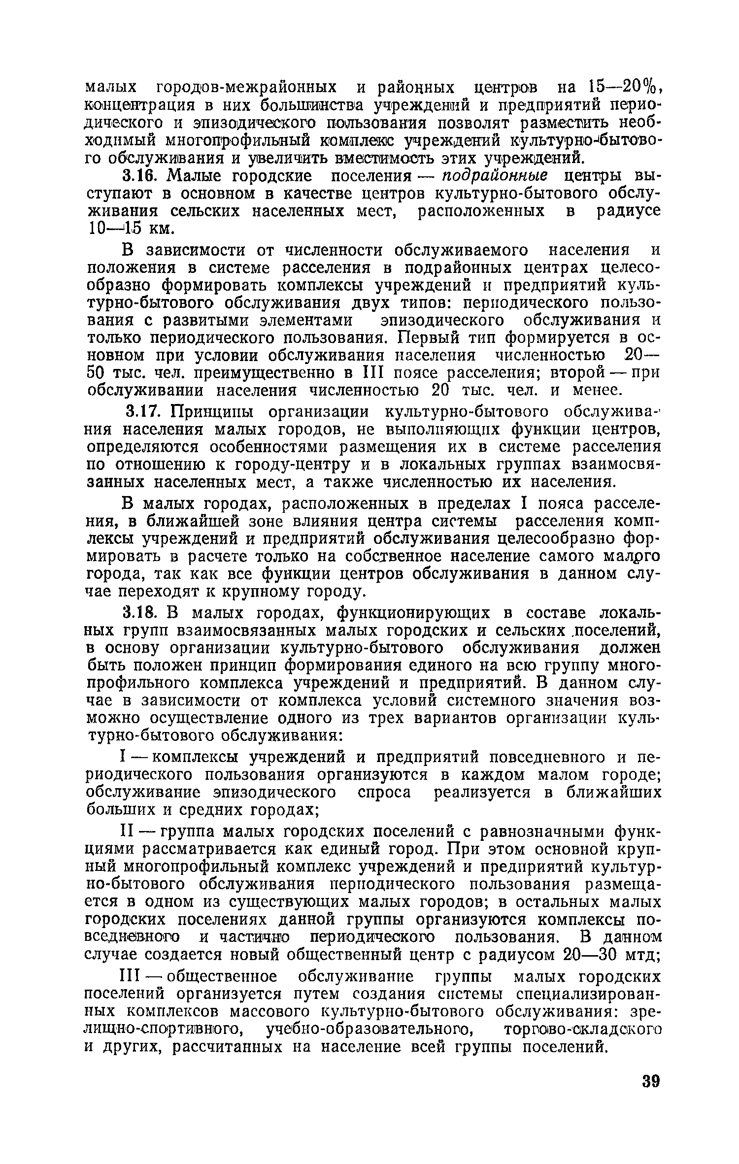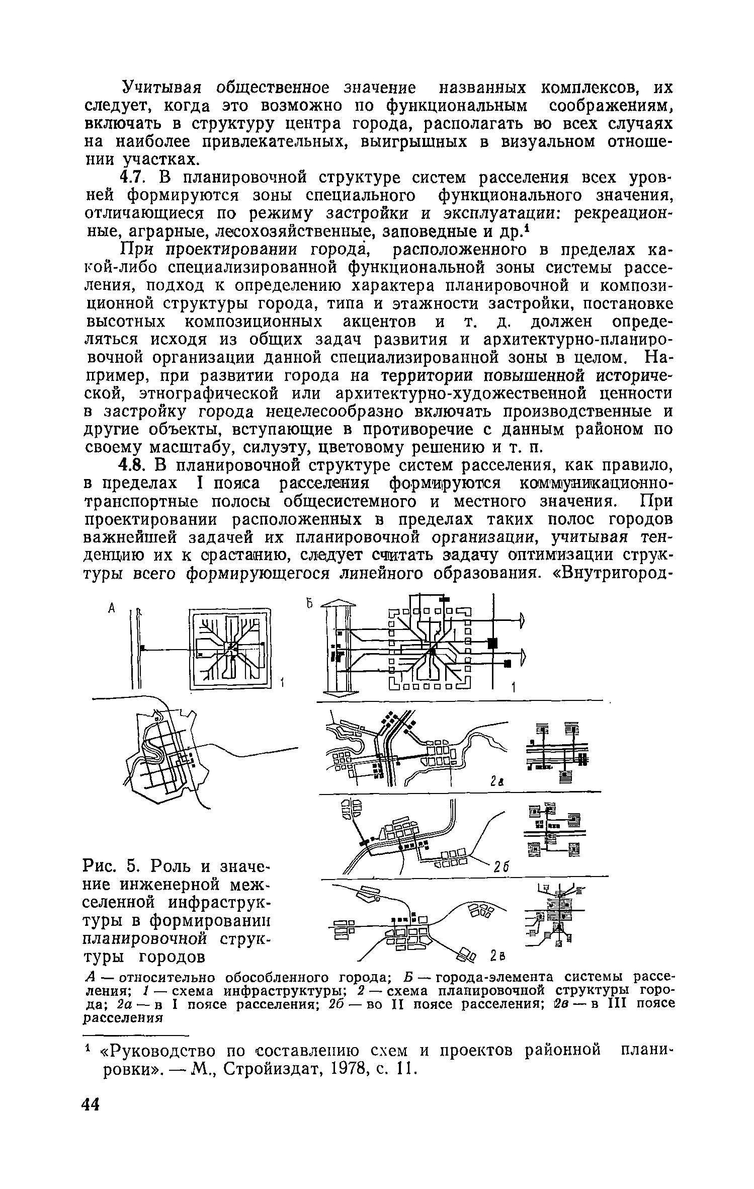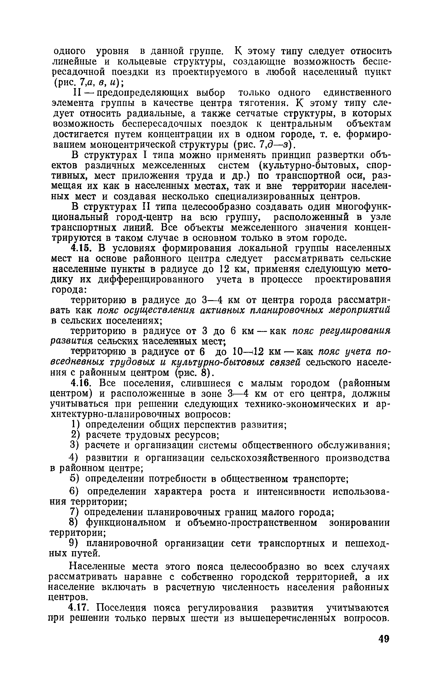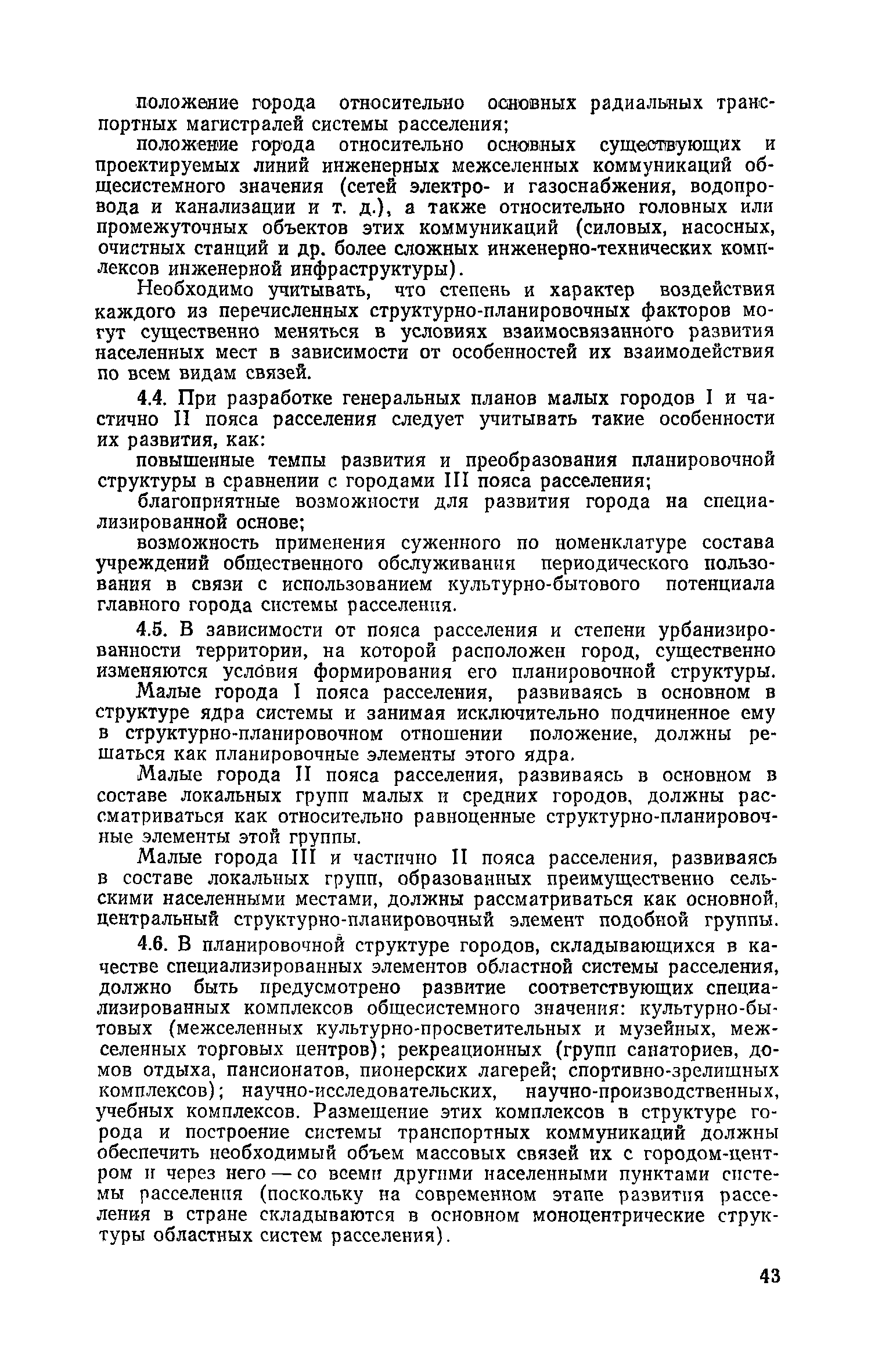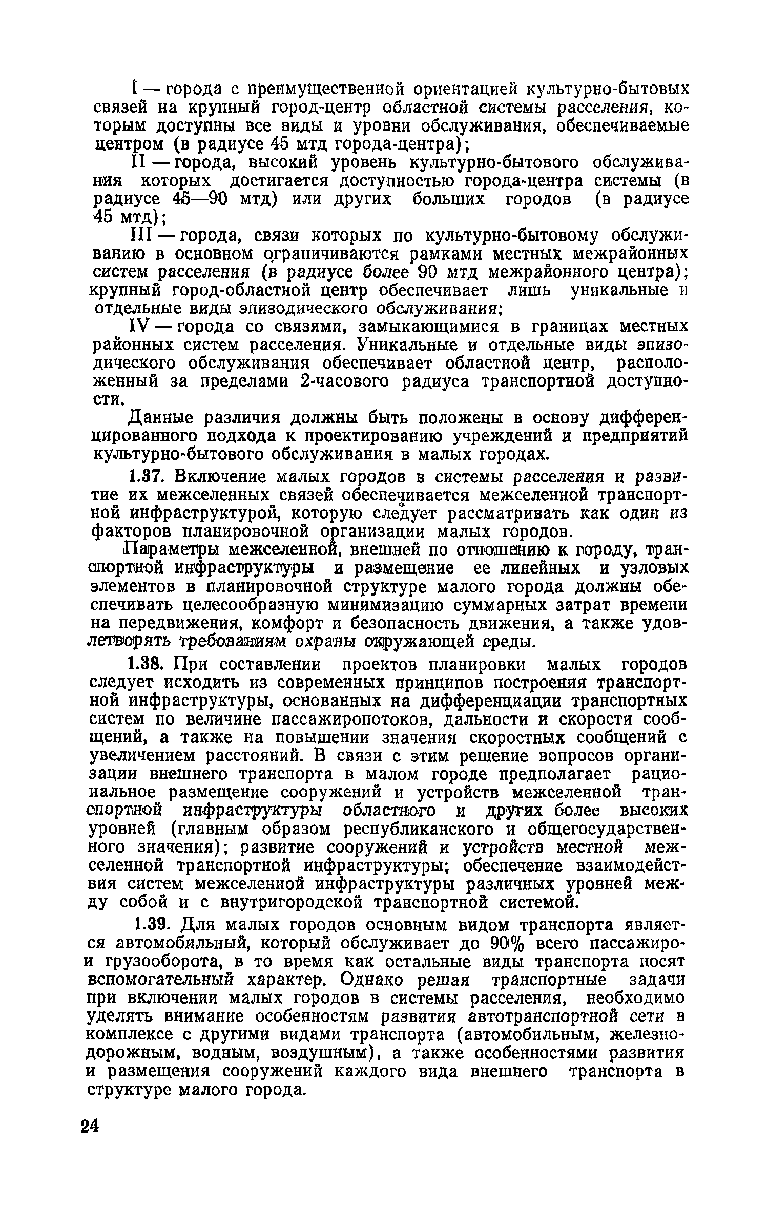 Руководство по проектированию малых городов в системах расселения| Статус: | справочные материалы, мп, тпр | | Название рус.: | Руководство по проектированию малых городов в системах расселения | | Дата добавления в базу: | 01.09.2013 | | Дата актуализации: | 01.01.2021 | | Область применения: | В Руководстве изложен подход к проектированию населенных мест и условиях формирования систем расселения различных иерархических уровней с учетом положении, функциональной роли и перспектив развития малых городов в этих системах. Рассмотрены вопросы формирования архитектурно-планировочной структуры малых городов под влиянием комплекса межселенных связей (производственных, трудовых, культурно-бытовых, территориально-планировочных и др.), а также особенности организации транспорта, систем общественного обслуживания и инженерного оборудования малых городов как структурно-функциональных элементов систем расселения. Руководство предназначено для проектировщиков, градостроителей, составляющих проекты планировки и застройки городов, схемы и проекты районной планировки, а также для работников местных архитектурно-планировочных и плановых органов. | | Оглавление: | Предисловие 1. Основные положения по развитию малых городов в системах расселения Задачи и условия формирования малых городов как элементов систем расселения Межселенные связи и организация транспорта малых городов 2. Определение перспектив развития малых городов Формирование экономической базы Расчет численности населения 3. Формирование систем культурно-бытового обслуживания населения в малых городах Общие положения Учреждения и комплексы культурно-бытового обслуживания Методика расчета учреждений культурно-бытового обслуживания 4. Архитектурно-планировочная организация малых городов Общие положения Зонирование территории города Жилая застройка Общественный центр Места приложения труда Формирование внешней зоны 5. Инженерное оборудование малых городов Общие положения Водоснабжение и водоотведение городов Энергоснабжение Приложение 1. Местные сырьевые и трудовые ресурсы (формы) Приложение 2. Перечень промышленных предприятий, размещение которых возможно в малых городах Приложение 3. Градостроительная характеристика предприятий аграрно-промышленного комплекса, размещаемых в малых городах Приложение 4. Основной состав учреждений и объектов общегородских центров малых городов Приложение 5. Ориентировочные перспективные скорости сообщения и транспортная доступность города-центра областной системы расселения Приложение 6. Показатели типовых проектов пассажирских станций | | Разработан: | ЦНИИП градостроительства