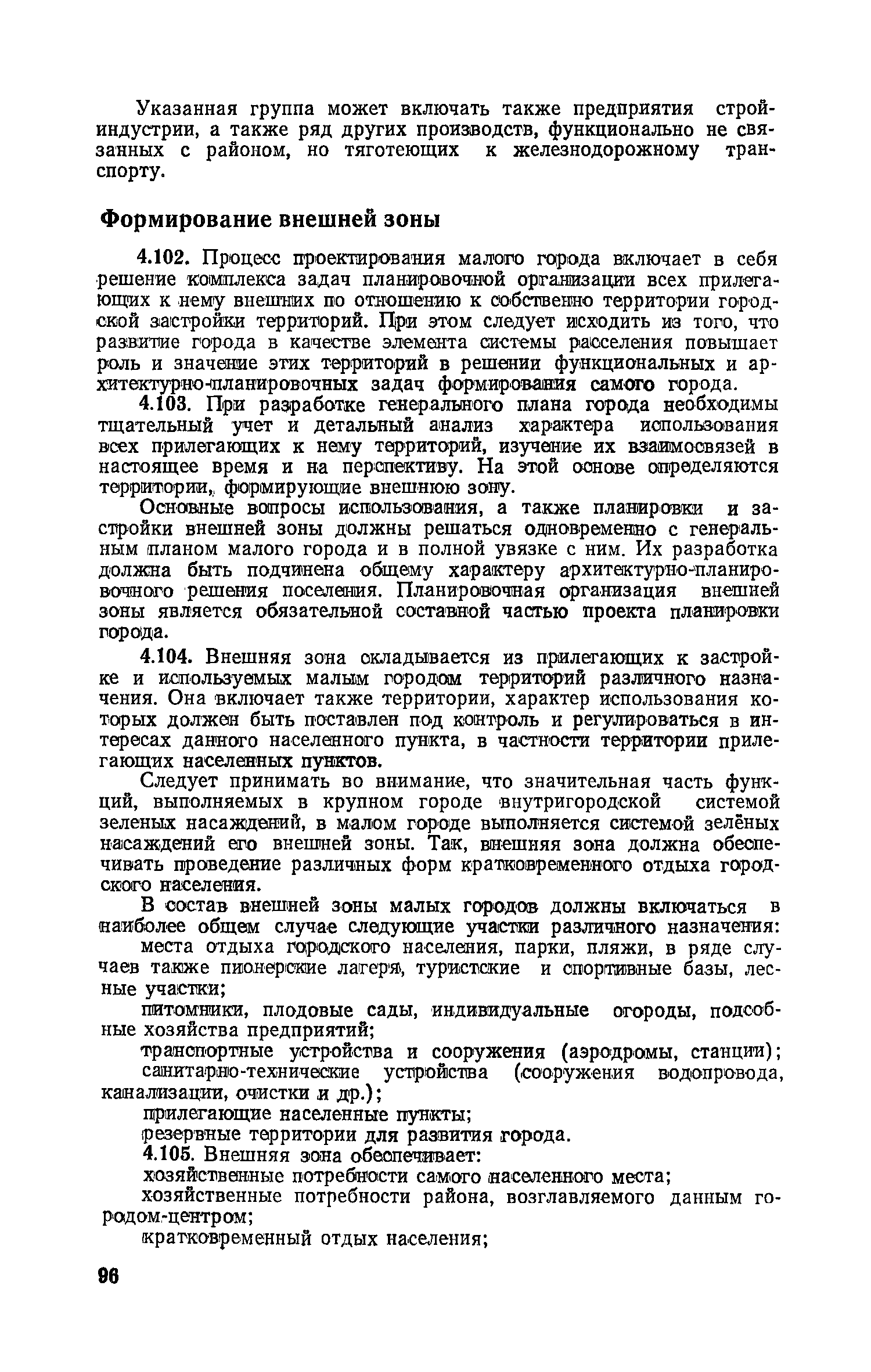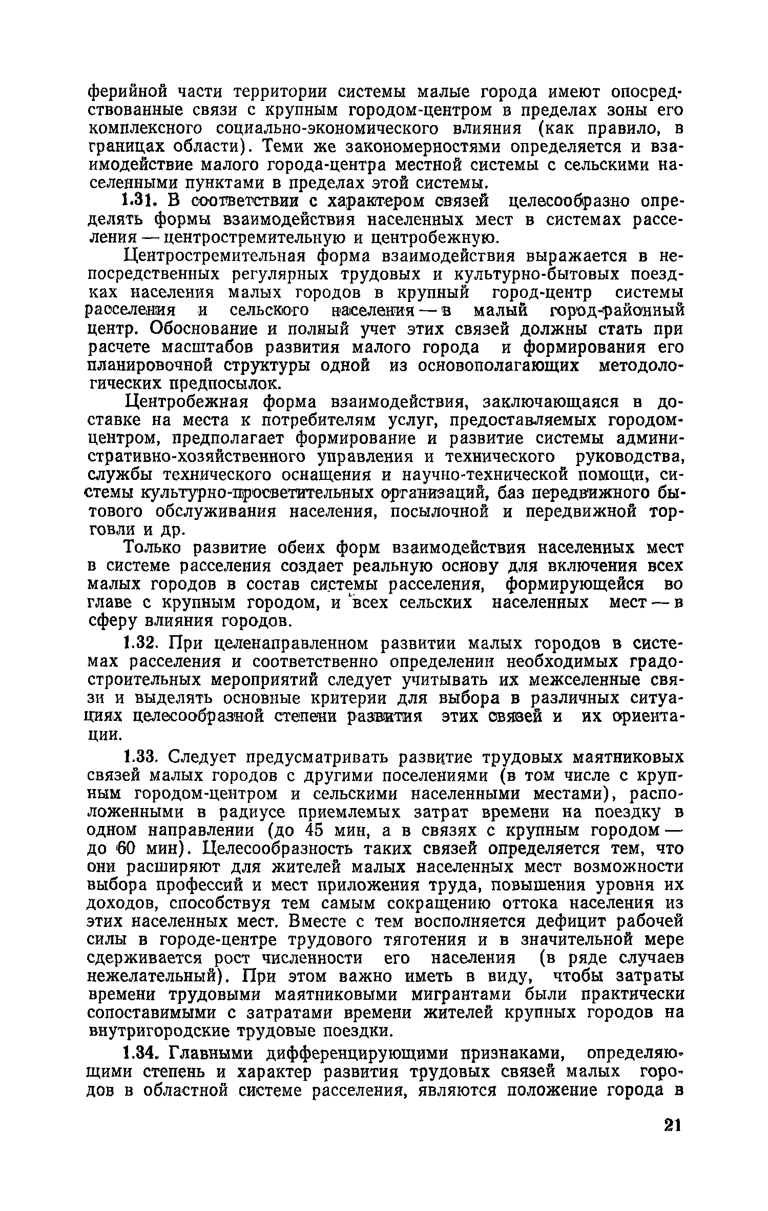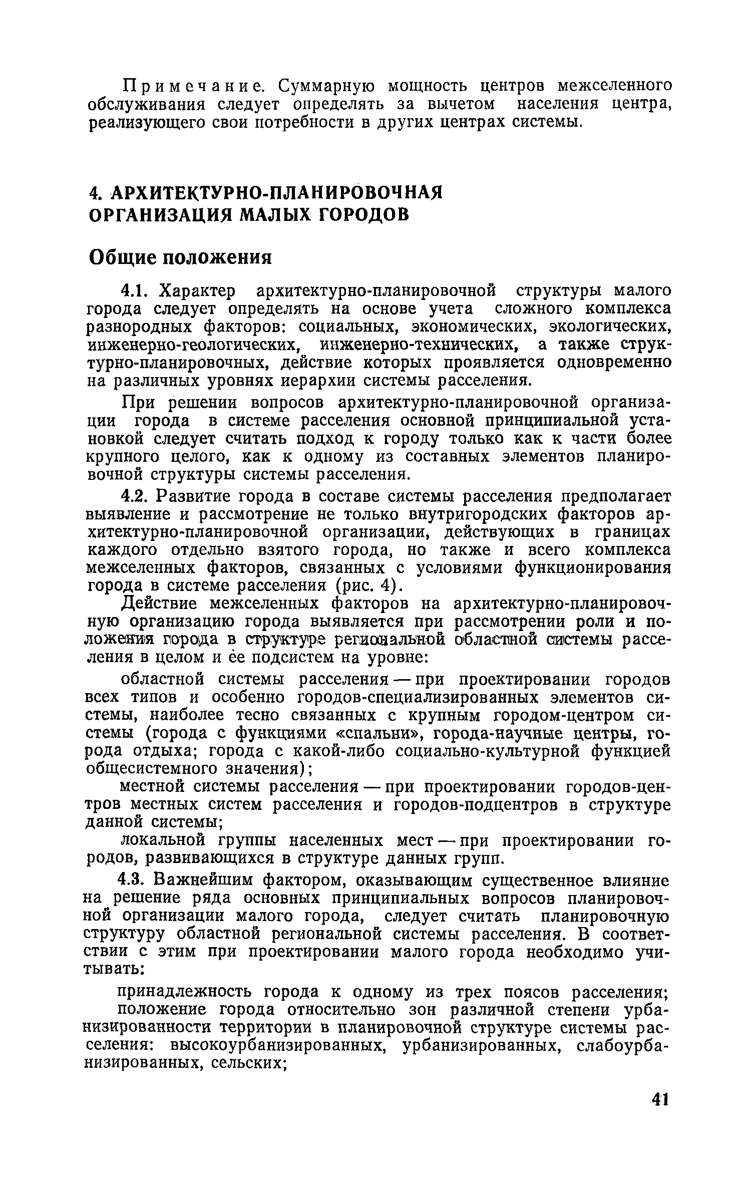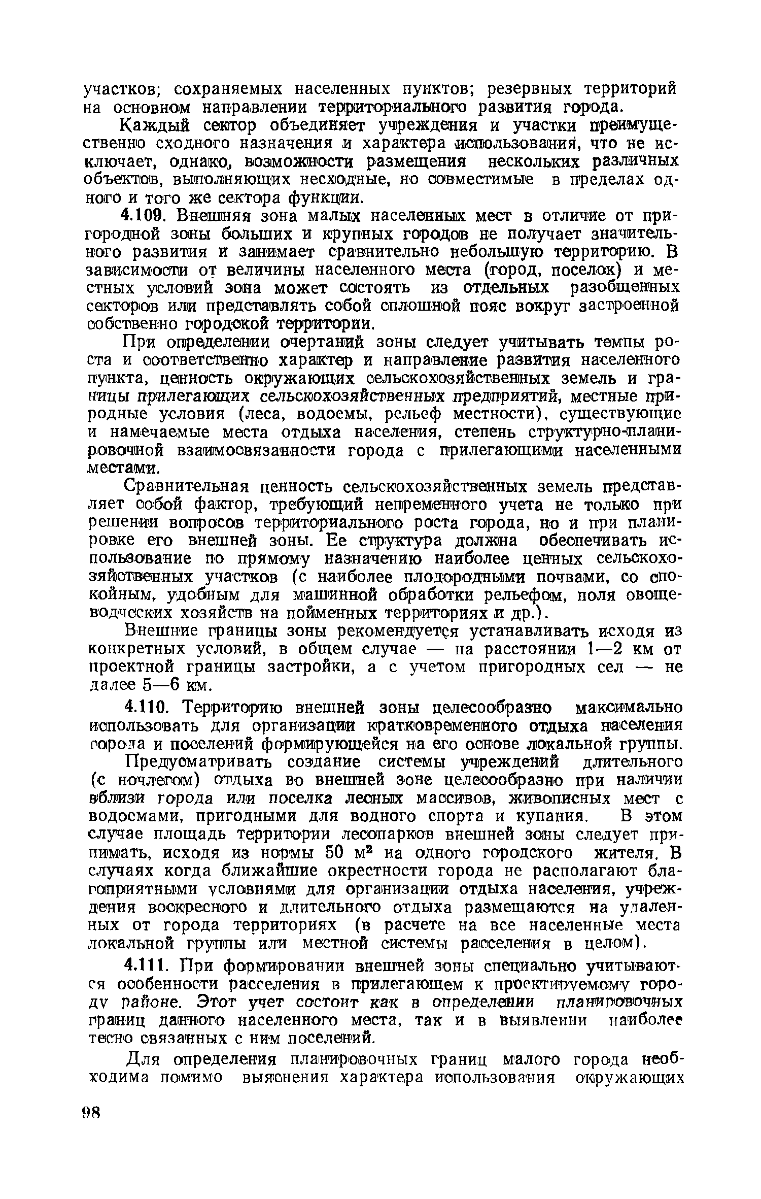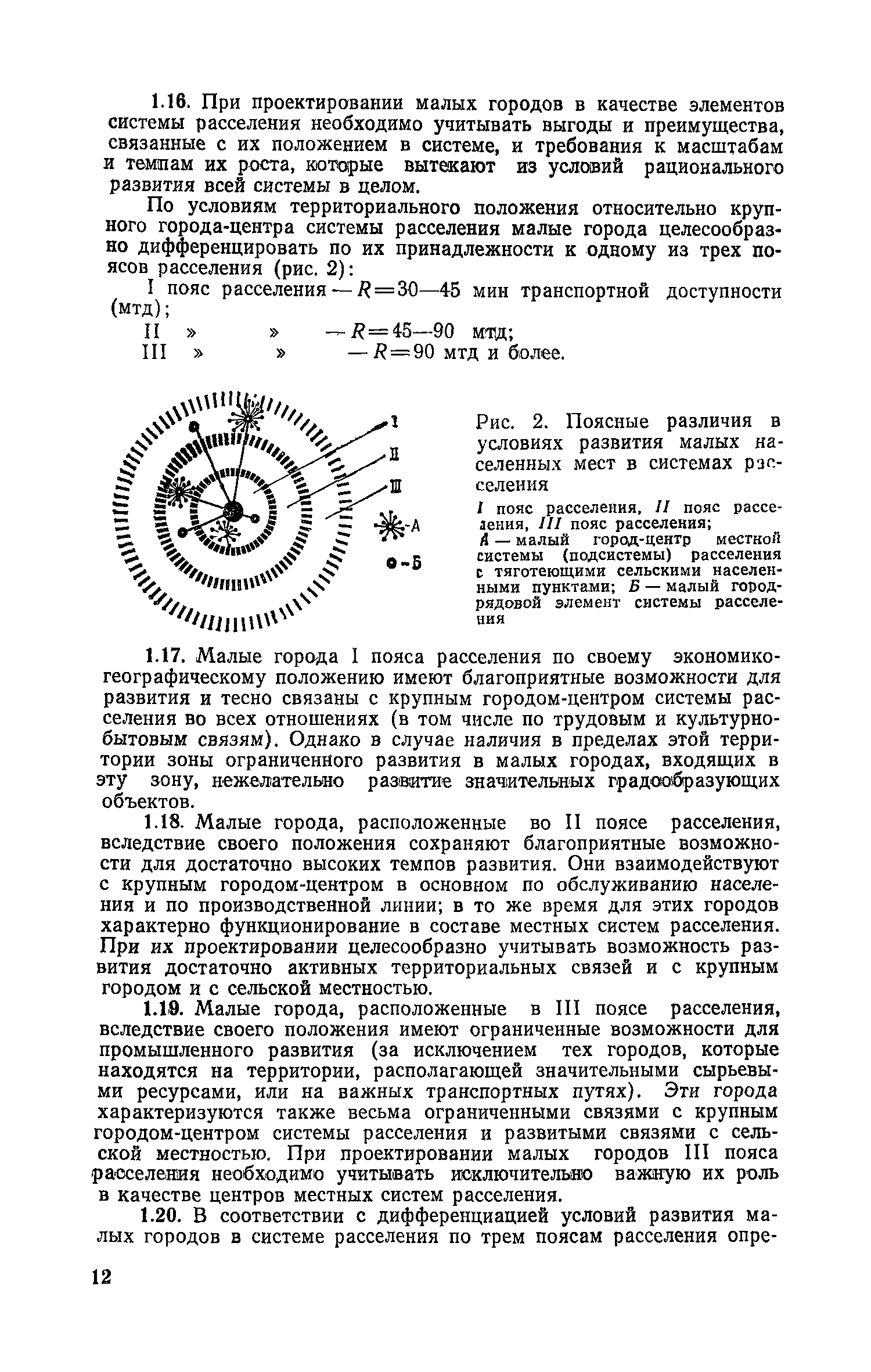 Руководство по проектированию малых городов в системах расселения| Статус: | справочные материалы, мп, тпр | | Название рус.: | Руководство по проектированию малых городов в системах расселения | | Дата добавления в базу: | 01.09.2013 | | Дата актуализации: | 01.01.2021 | | Область применения: | В Руководстве изложен подход к проектированию населенных мест и условиях формирования систем расселения различных иерархических уровней с учетом положении, функциональной роли и перспектив развития малых городов в этих системах. Рассмотрены вопросы формирования архитектурно-планировочной структуры малых городов под влиянием комплекса межселенных связей (производственных, трудовых, культурно-бытовых, территориально-планировочных и др.), а также особенности организации транспорта, систем общественного обслуживания и инженерного оборудования малых городов как структурно-функциональных элементов систем расселения. Руководство предназначено для проектировщиков, градостроителей, составляющих проекты планировки и застройки городов, схемы и проекты районной планировки, а также для работников местных архитектурно-планировочных и плановых органов. | | Оглавление: | Предисловие 1. Основные положения по развитию малых городов в системах расселения Задачи и условия формирования малых городов как элементов систем расселения Межселенные связи и организация транспорта малых городов 2. Определение перспектив развития малых городов Формирование экономической базы Расчет численности населения 3. Формирование систем культурно-бытового обслуживания населения в малых городах Общие положения Учреждения и комплексы культурно-бытового обслуживания Методика расчета учреждений культурно-бытового обслуживания 4. Архитектурно-планировочная организация малых городов Общие положения Зонирование территории города Жилая застройка Общественный центр Места приложения труда Формирование внешней зоны 5. Инженерное оборудование малых городов Общие положения Водоснабжение и водоотведение городов Энергоснабжение Приложение 1. Местные сырьевые и трудовые ресурсы (формы) Приложение 2. Перечень промышленных предприятий, размещение которых возможно в малых городах Приложение 3. Градостроительная характеристика предприятий аграрно-промышленного комплекса, размещаемых в малых городах Приложение 4. Основной состав учреждений и объектов общегородских центров малых городов Приложение 5. Ориентировочные перспективные скорости сообщения и транспортная доступность города-центра областной системы расселения Приложение 6. Показатели типовых проектов пассажирских станций | | Разработан: | ЦНИИП градостроительства
