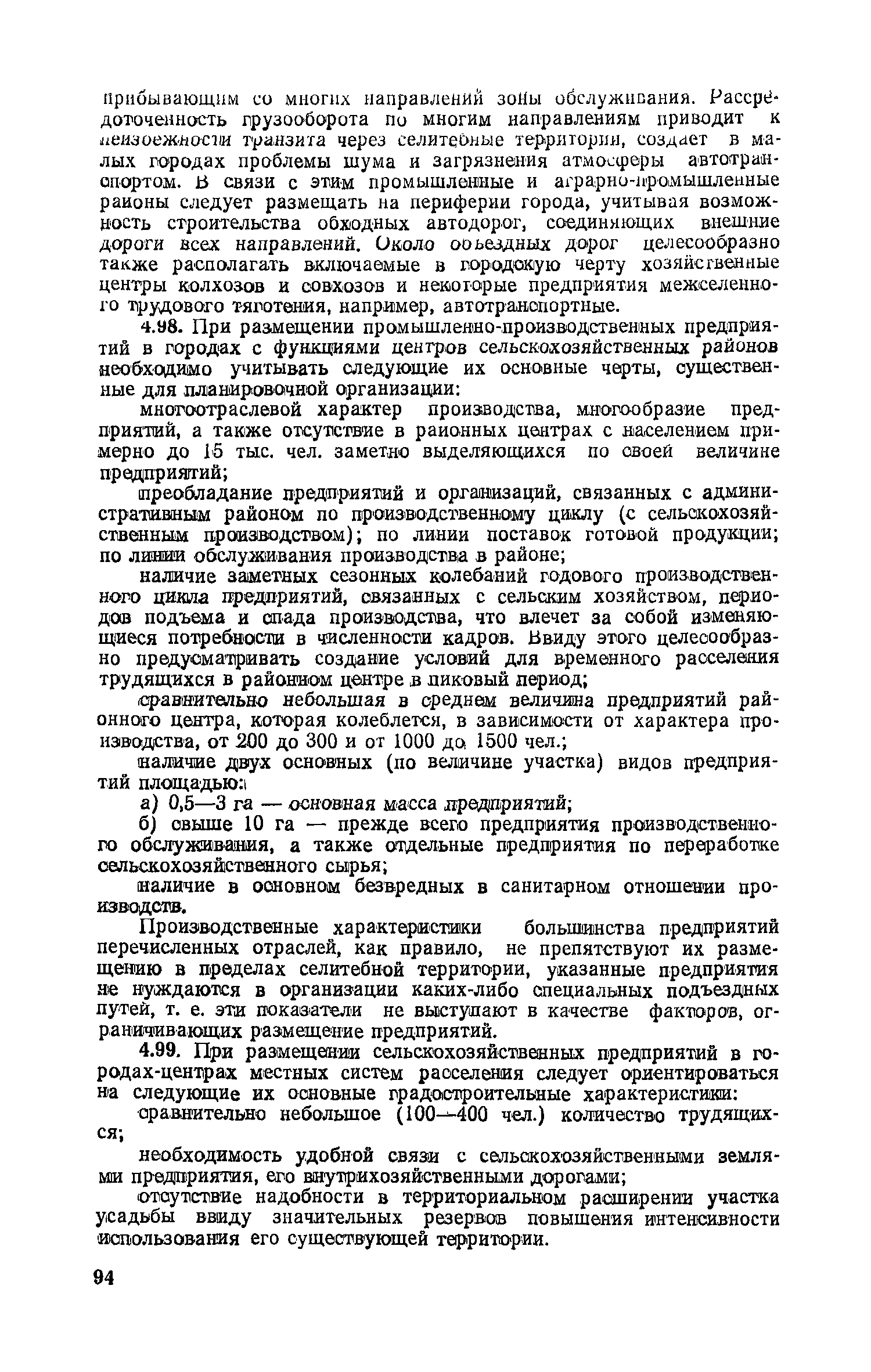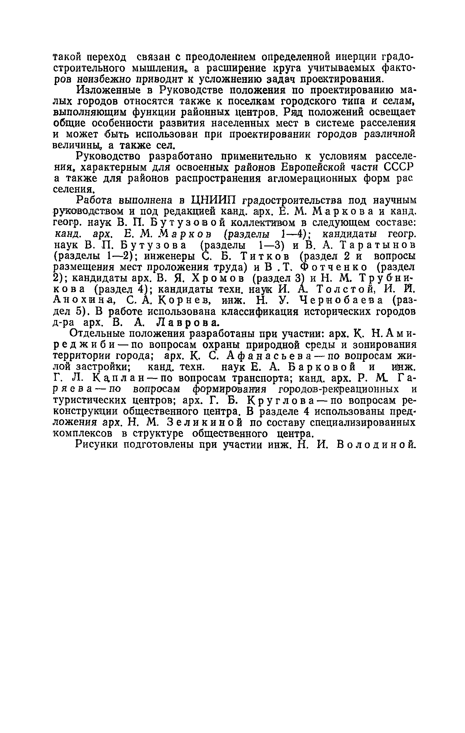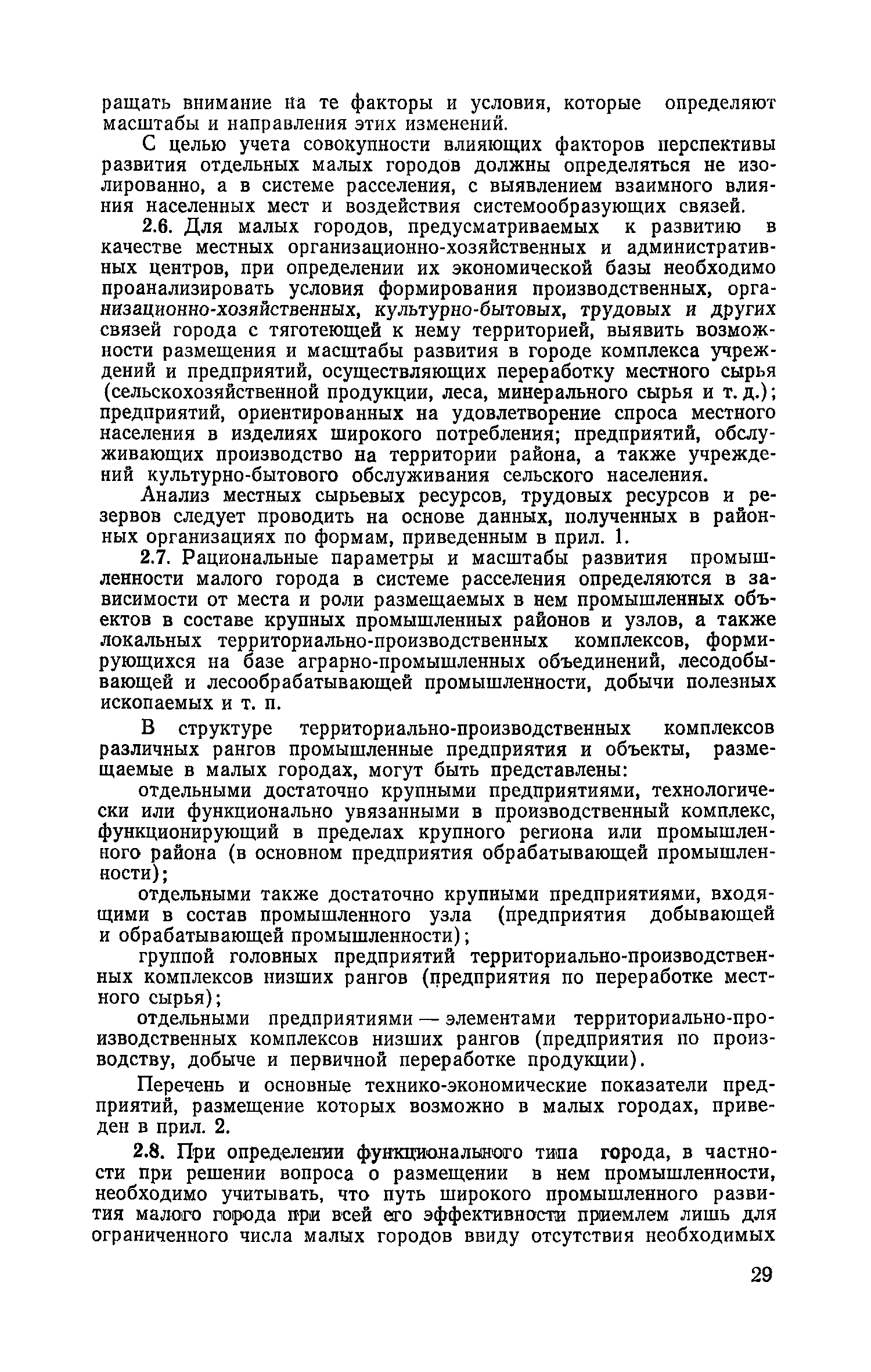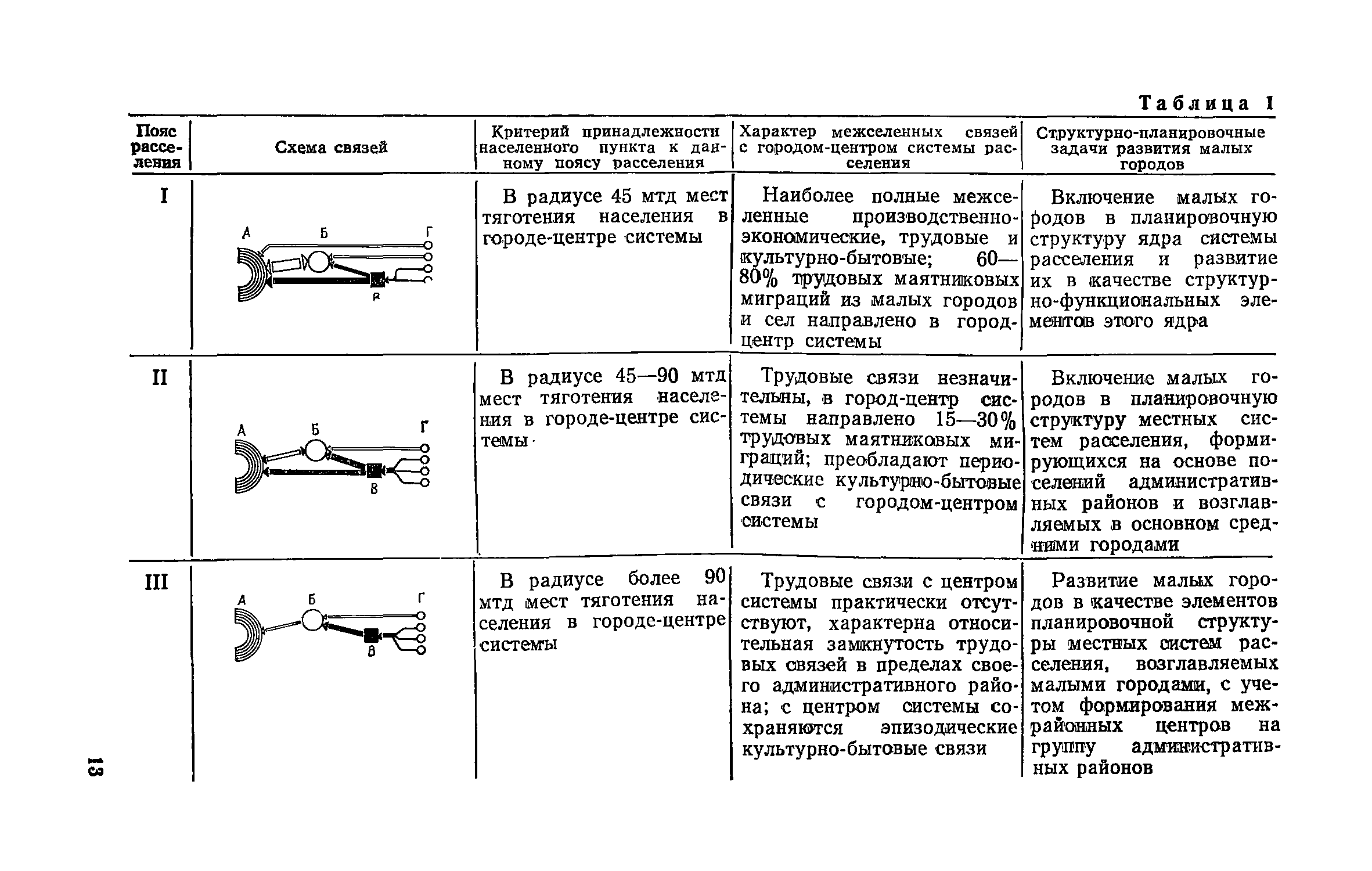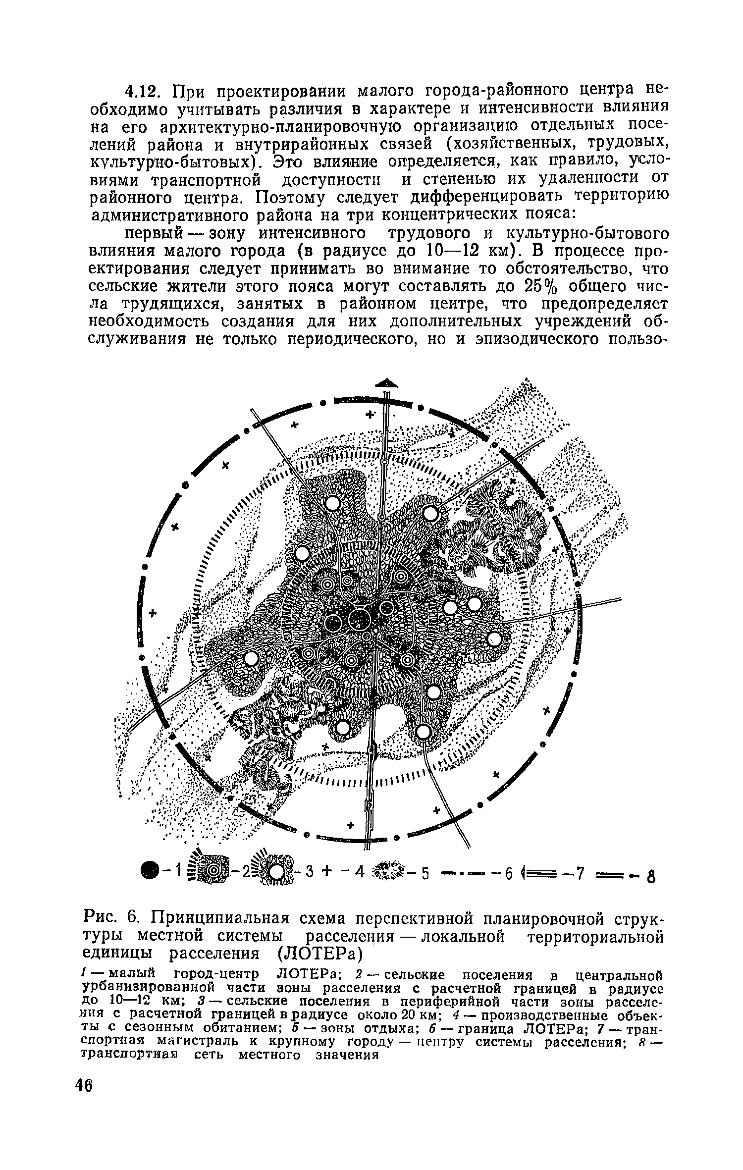 Руководство по проектированию малых городов в системах расселения| Статус: | справочные материалы, мп, тпр | | Название рус.: | Руководство по проектированию малых городов в системах расселения | | Дата добавления в базу: | 01.09.2013 | | Дата актуализации: | 01.01.2021 | | Область применения: | В Руководстве изложен подход к проектированию населенных мест и условиях формирования систем расселения различных иерархических уровней с учетом положении, функциональной роли и перспектив развития малых городов в этих системах. Рассмотрены вопросы формирования архитектурно-планировочной структуры малых городов под влиянием комплекса межселенных связей (производственных, трудовых, культурно-бытовых, территориально-планировочных и др.), а также особенности организации транспорта, систем общественного обслуживания и инженерного оборудования малых городов как структурно-функциональных элементов систем расселения. Руководство предназначено для проектировщиков, градостроителей, составляющих проекты планировки и застройки городов, схемы и проекты районной планировки, а также для работников местных архитектурно-планировочных и плановых органов. | | Оглавление: | Предисловие 1. Основные положения по развитию малых городов в системах расселения Задачи и условия формирования малых городов как элементов систем расселения Межселенные связи и организация транспорта малых городов 2. Определение перспектив развития малых городов Формирование экономической базы Расчет численности населения 3. Формирование систем культурно-бытового обслуживания населения в малых городах Общие положения Учреждения и комплексы культурно-бытового обслуживания Методика расчета учреждений культурно-бытового обслуживания 4. Архитектурно-планировочная организация малых городов Общие положения Зонирование территории города Жилая застройка Общественный центр Места приложения труда Формирование внешней зоны 5. Инженерное оборудование малых городов Общие положения Водоснабжение и водоотведение городов Энергоснабжение Приложение 1. Местные сырьевые и трудовые ресурсы (формы) Приложение 2. Перечень промышленных предприятий, размещение которых возможно в малых городах Приложение 3. Градостроительная характеристика предприятий аграрно-промышленного комплекса, размещаемых в малых городах Приложение 4. Основной состав учреждений и объектов общегородских центров малых городов Приложение 5. Ориентировочные перспективные скорости сообщения и транспортная доступность города-центра областной системы расселения Приложение 6. Показатели типовых проектов пассажирских станций | | Разработан: | ЦНИИП градостроительства