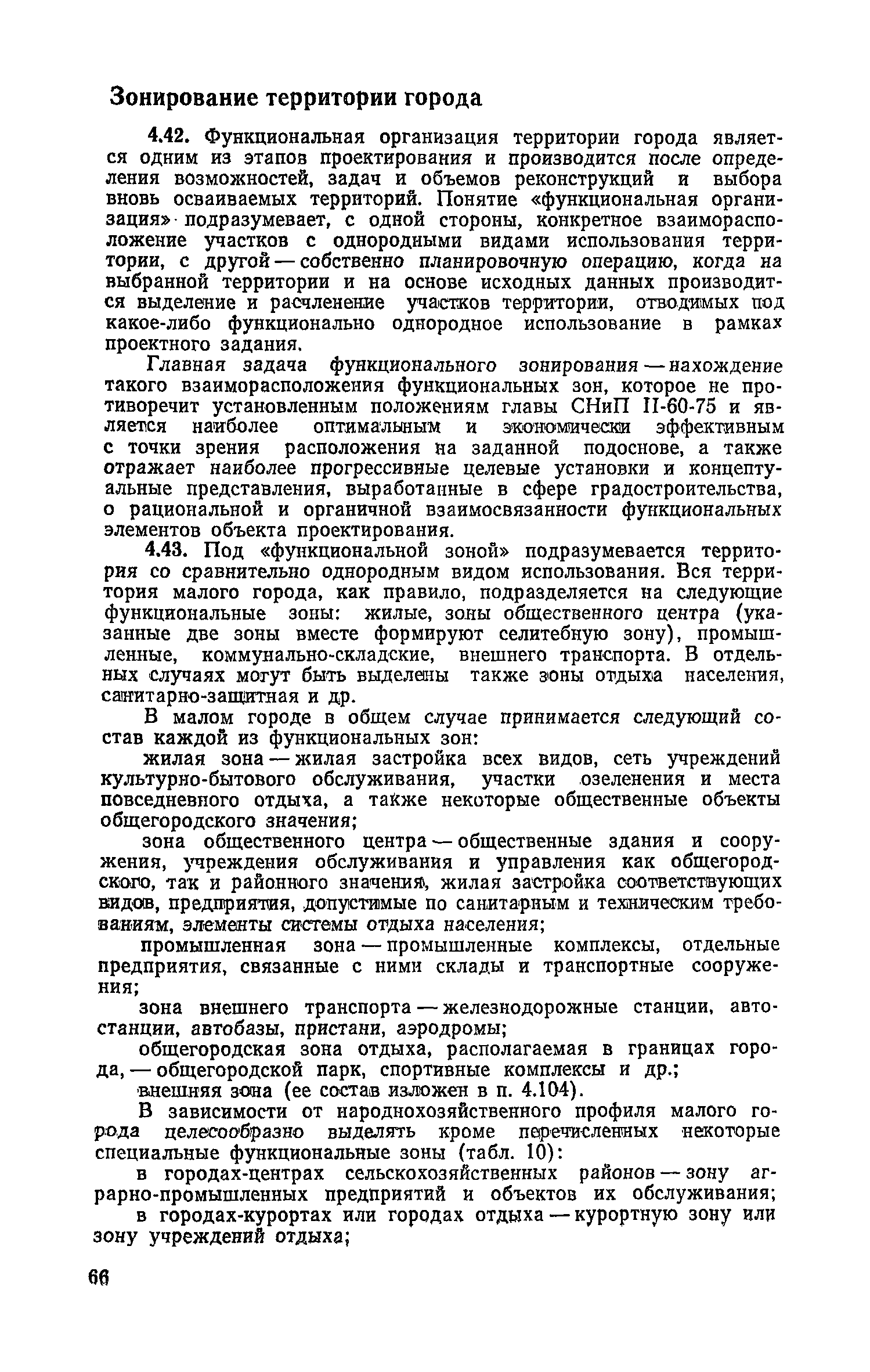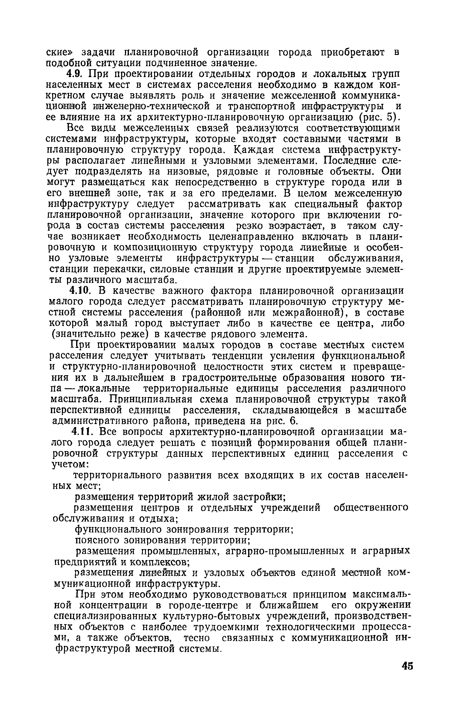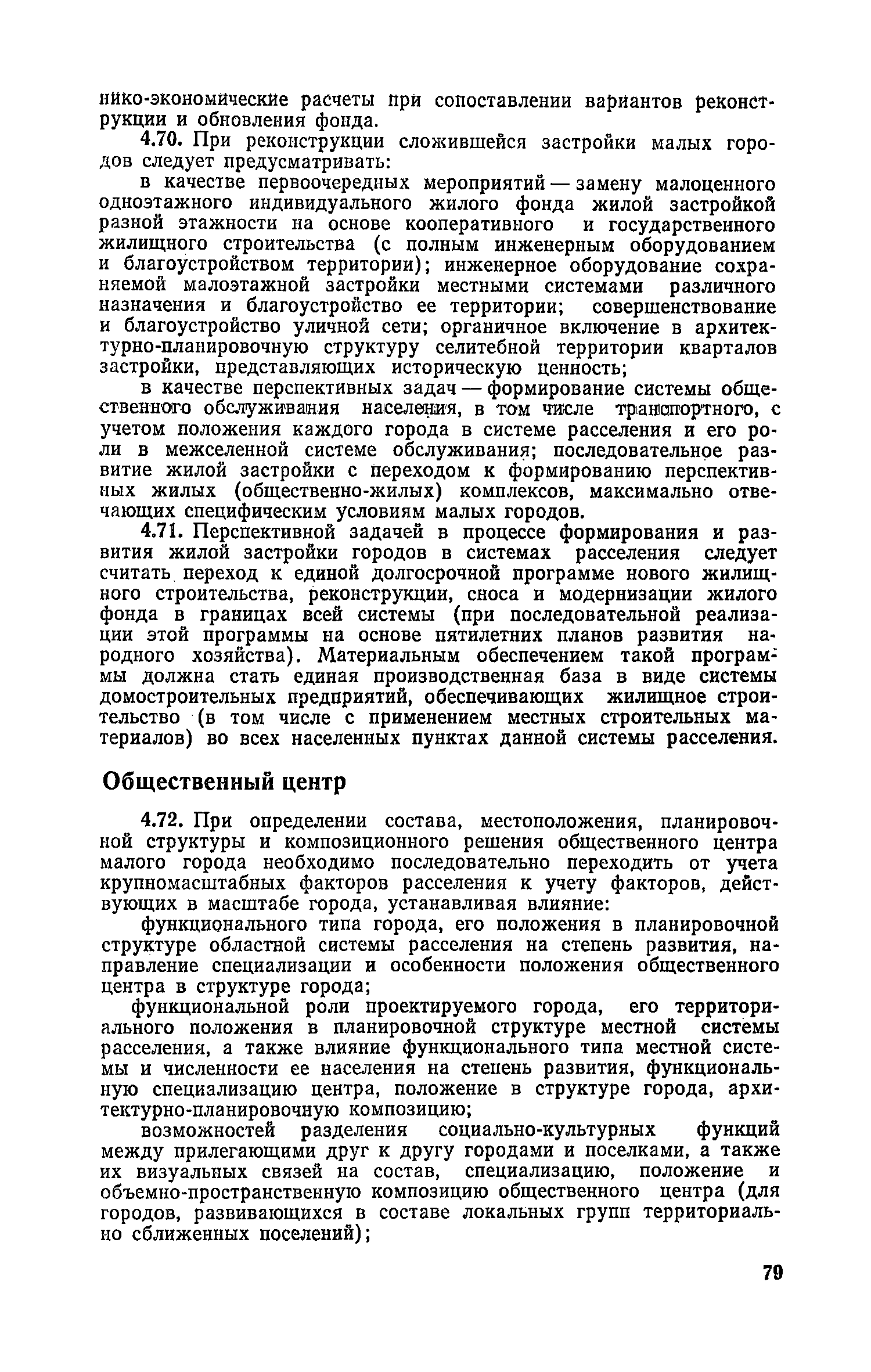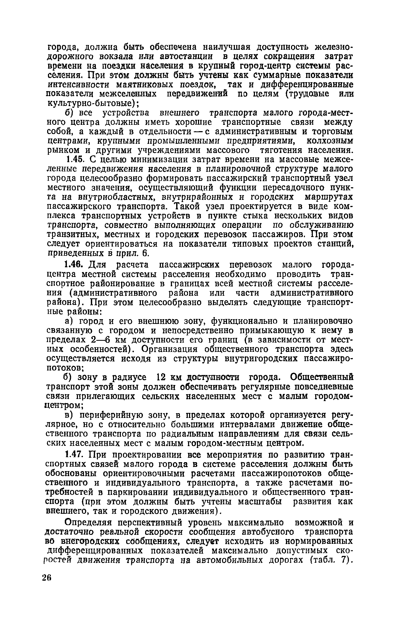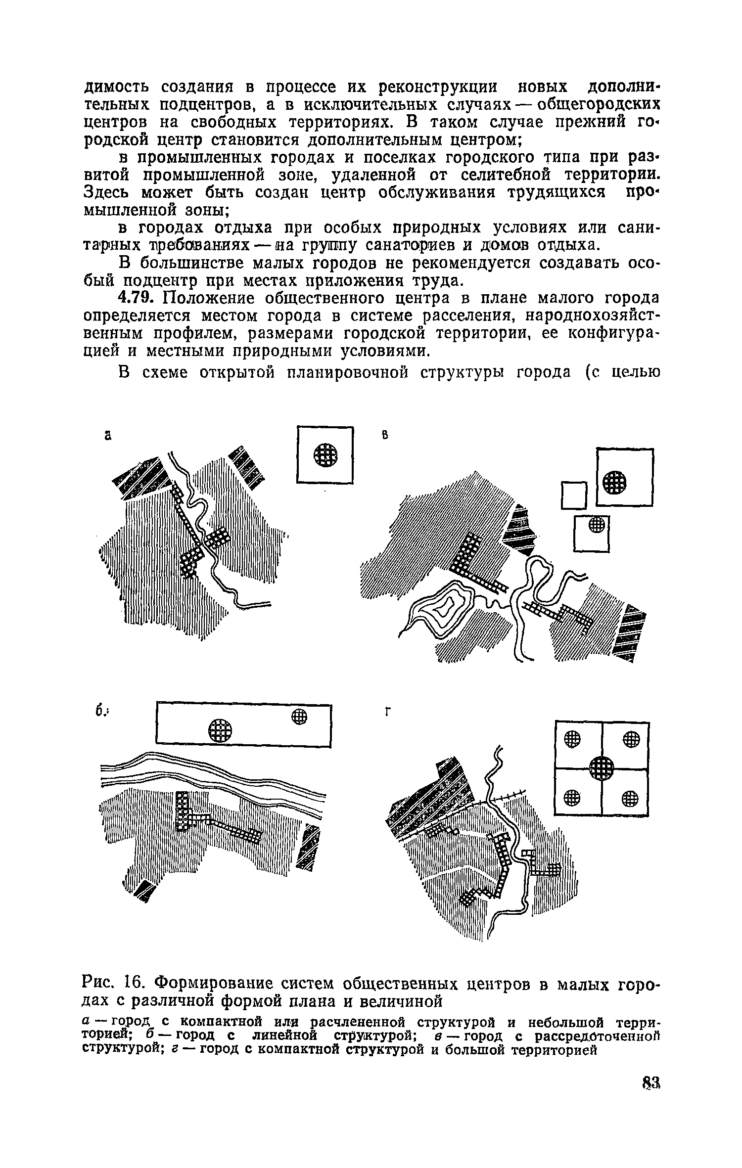 Руководство по проектированию малых городов в системах расселения| Статус: | справочные материалы, мп, тпр | | Название рус.: | Руководство по проектированию малых городов в системах расселения | | Дата добавления в базу: | 01.09.2013 | | Дата актуализации: | 01.01.2021 | | Область применения: | В Руководстве изложен подход к проектированию населенных мест и условиях формирования систем расселения различных иерархических уровней с учетом положении, функциональной роли и перспектив развития малых городов в этих системах. Рассмотрены вопросы формирования архитектурно-планировочной структуры малых городов под влиянием комплекса межселенных связей (производственных, трудовых, культурно-бытовых, территориально-планировочных и др.), а также особенности организации транспорта, систем общественного обслуживания и инженерного оборудования малых городов как структурно-функциональных элементов систем расселения. Руководство предназначено для проектировщиков, градостроителей, составляющих проекты планировки и застройки городов, схемы и проекты районной планировки, а также для работников местных архитектурно-планировочных и плановых органов. | | Оглавление: | Предисловие 1. Основные положения по развитию малых городов в системах расселения Задачи и условия формирования малых городов как элементов систем расселения Межселенные связи и организация транспорта малых городов 2. Определение перспектив развития малых городов Формирование экономической базы Расчет численности населения 3. Формирование систем культурно-бытового обслуживания населения в малых городах Общие положения Учреждения и комплексы культурно-бытового обслуживания Методика расчета учреждений культурно-бытового обслуживания 4. Архитектурно-планировочная организация малых городов Общие положения Зонирование территории города Жилая застройка Общественный центр Места приложения труда Формирование внешней зоны 5. Инженерное оборудование малых городов Общие положения Водоснабжение и водоотведение городов Энергоснабжение Приложение 1. Местные сырьевые и трудовые ресурсы (формы) Приложение 2. Перечень промышленных предприятий, размещение которых возможно в малых городах Приложение 3. Градостроительная характеристика предприятий аграрно-промышленного комплекса, размещаемых в малых городах Приложение 4. Основной состав учреждений и объектов общегородских центров малых городов Приложение 5. Ориентировочные перспективные скорости сообщения и транспортная доступность города-центра областной системы расселения Приложение 6. Показатели типовых проектов пассажирских станций | | Разработан: | ЦНИИП градостроительства