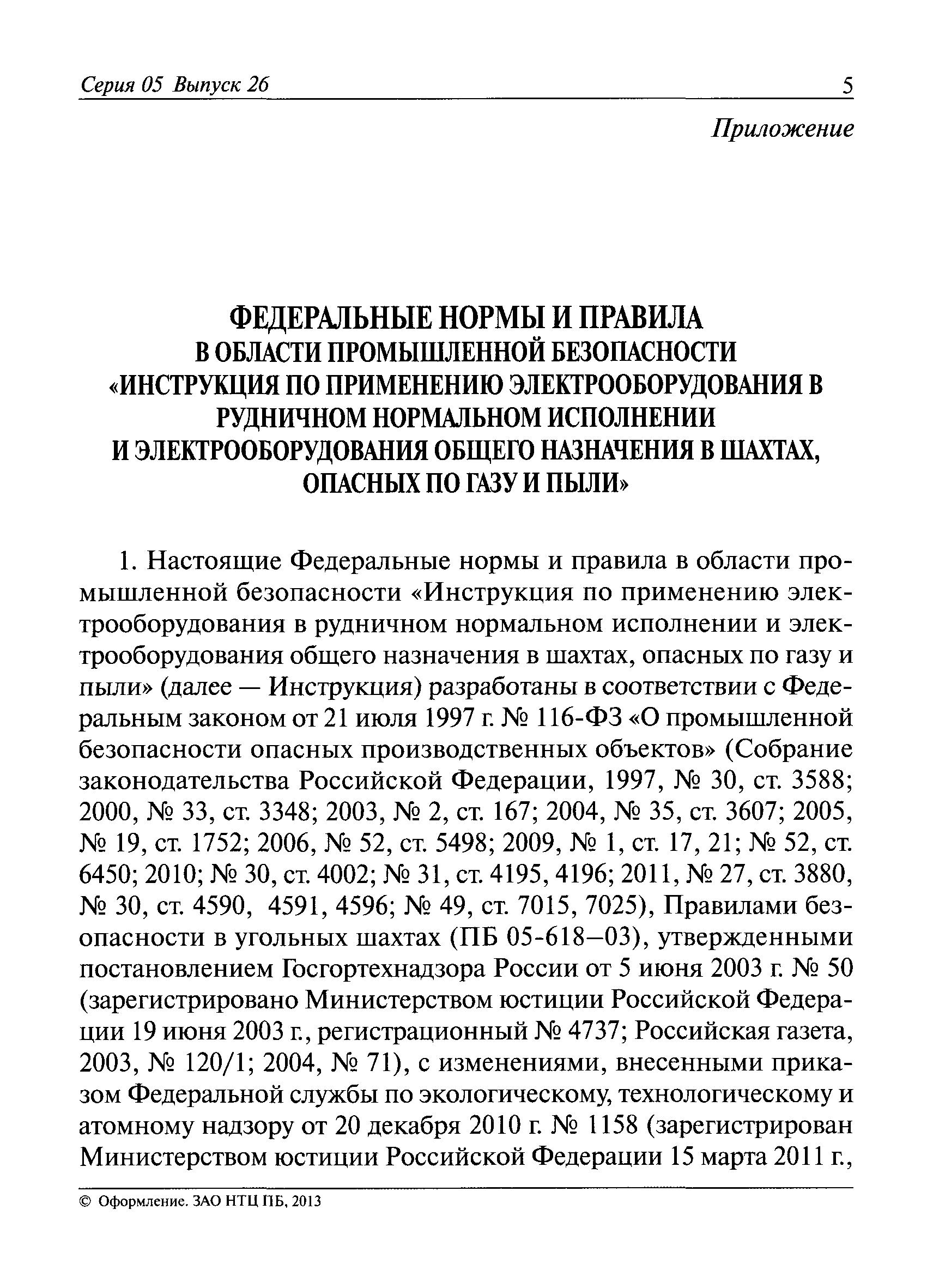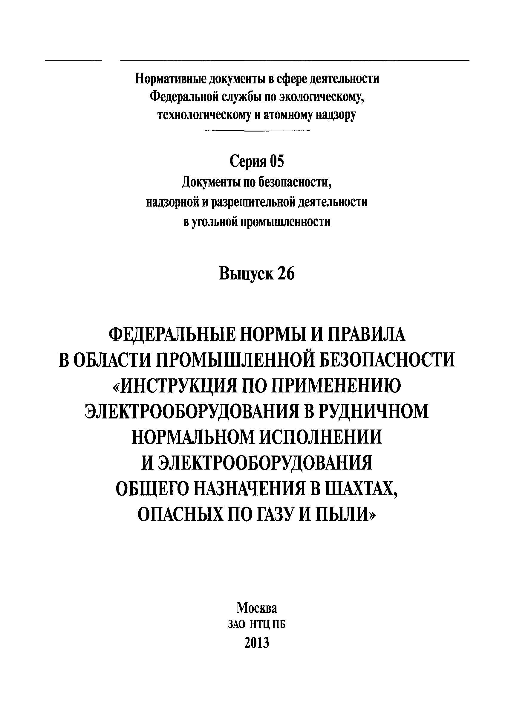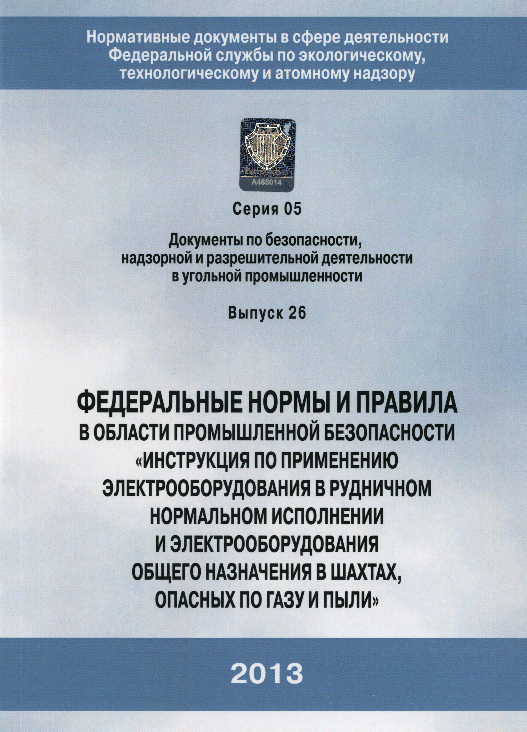 Федеральные нормы и правила в области промышленной безопасности "Инструкция по применению электрооборудования в рудничном нормальном исполнении и электрооборудования общего назначения в шахтах, опасных по газу и пыли"| Статус: | действует | | Название рус.: | Федеральные нормы и правила в области промышленной безопасности "Инструкция по применению электрооборудования в рудничном нормальном исполнении и электрооборудования общего назначения в шахтах, опасных по газу и пыли" | | Дата добавления в базу: | 01.09.2013 | | Дата актуализации: | 01.01.2021 | | Дата введения: | 01.03.2013 | | Область применения: | Инструкция содержит порядок применения электрооборудования в рудничном нормальном исполнении и электрооборудования общего назначения в шахтах, опасных по газу и пыли. | | Утверждён: | 06.11.2012 Федеральная служба по экологическому, технологическому и атомному надзору (629)