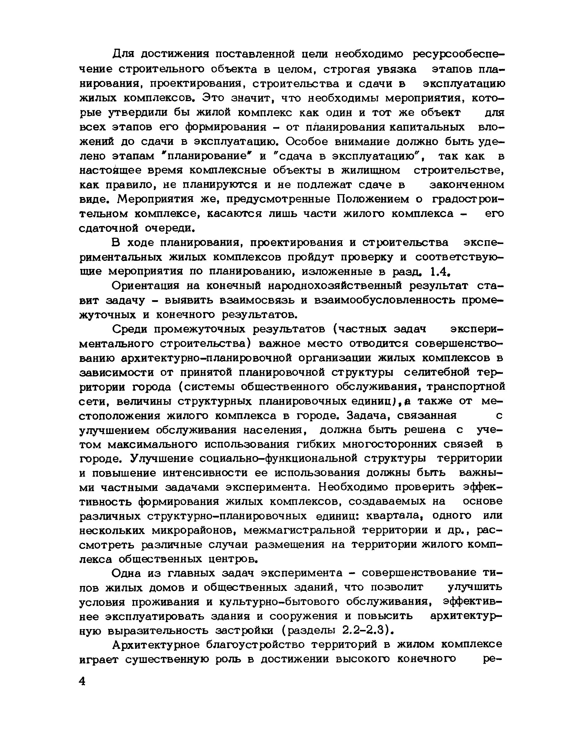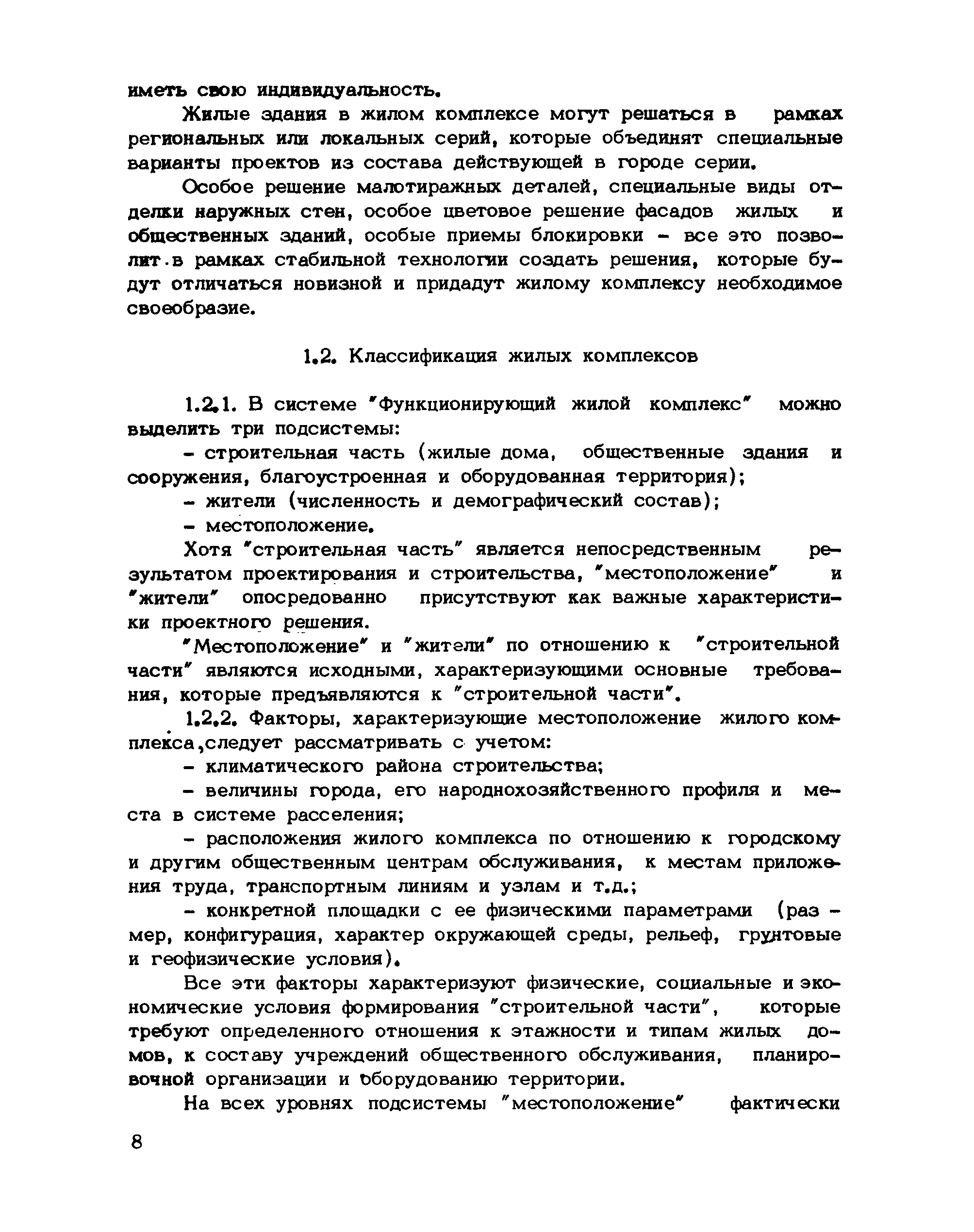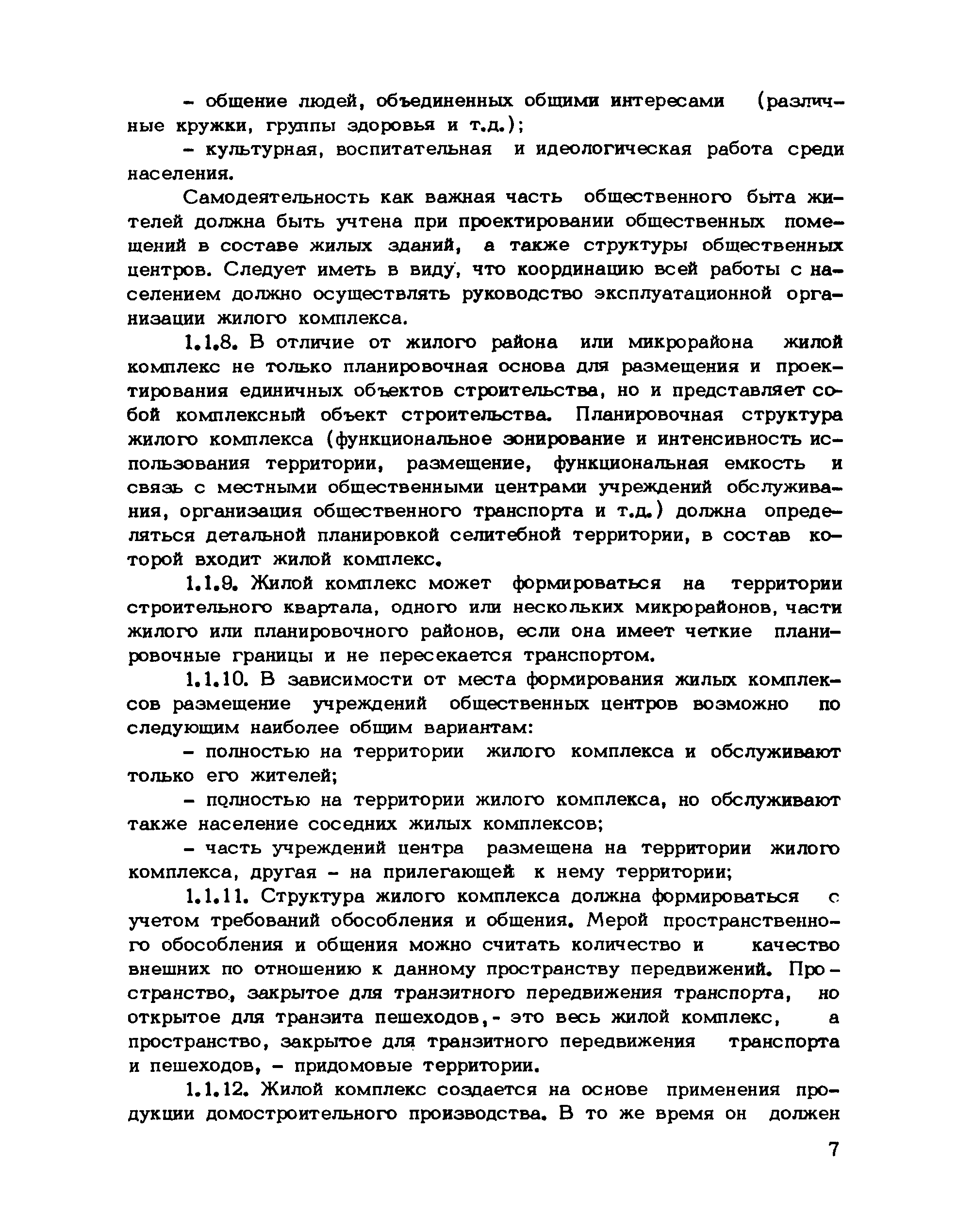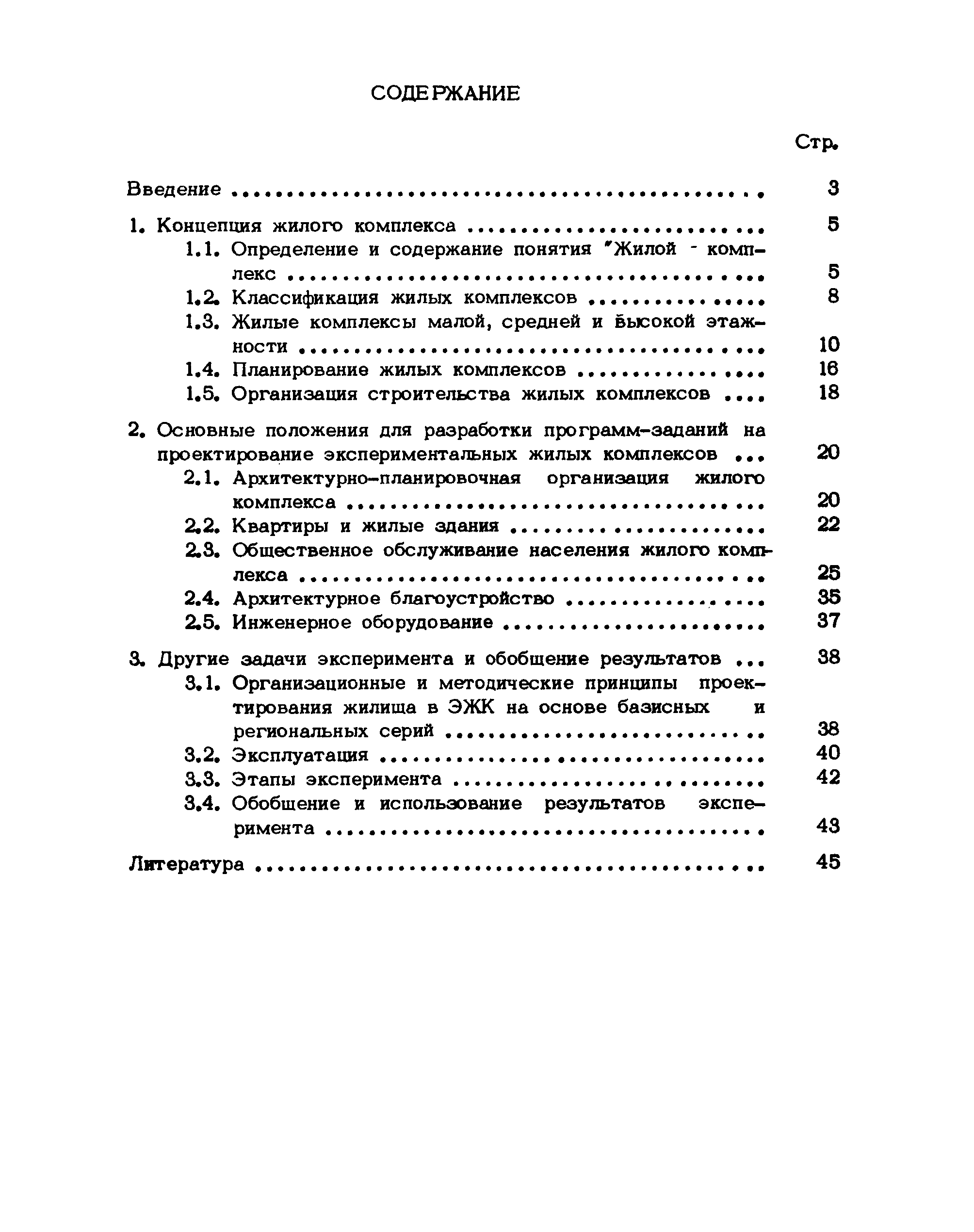 | Оглавление: | Введение 1. Концепция жилого комплекса 1.1. Определение и содержание понятия "Жилой - комплекс" 1.2. Классификация жилых комплексов 1.3. Жилые комплексы малой, средней и высокой этажности 1.4. Планирование жилых комплексов 1.5. Организация строительства жилых комплексов 2. Основные положения для разработки программ-заданий на проектирование экспериментальных жилых комплексов 2.1. Архитектурно-планировочная организация жилого комплекса 2.2. Квартиры и жилые здания 2.3. Общественное обслуживание населения жилого комплекса 2.4. Архитектурное благоустройство 2.5. Инженерное оборудование 3. Другие задачи эксперимента и обобщение результатов 3.1. Организационные и методические принципы проектирования жилища в ЭЖК на основе базисных и региональных серий 3.2. Эксплуатация 3.3. Этапы эксперимента 3.4. Обобщение и использование результатов эксперимента Литература |