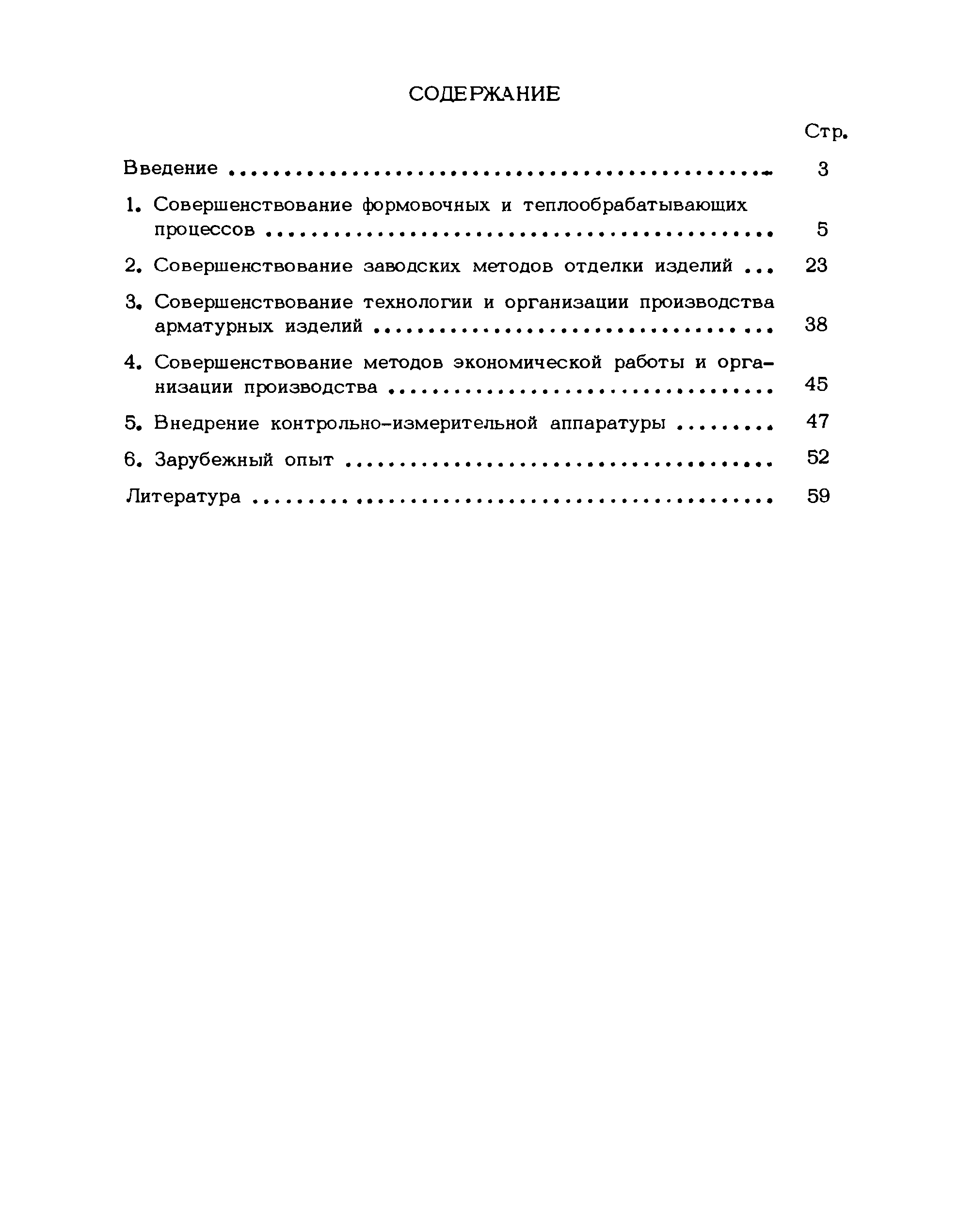 | Оглавление: | Введение 1. Совершенствование формовочных и теплообрабатывающих процессов 2. Совершенствование заводских методов отделки изделий 3. Совершенствование технологии и организации производства арматурных изделий 4. Совершенствование методов экономической работы и организации производства 5. Внедрение контрольно-измерительной аппаратуры 6. Зарубежный опыт Литература |