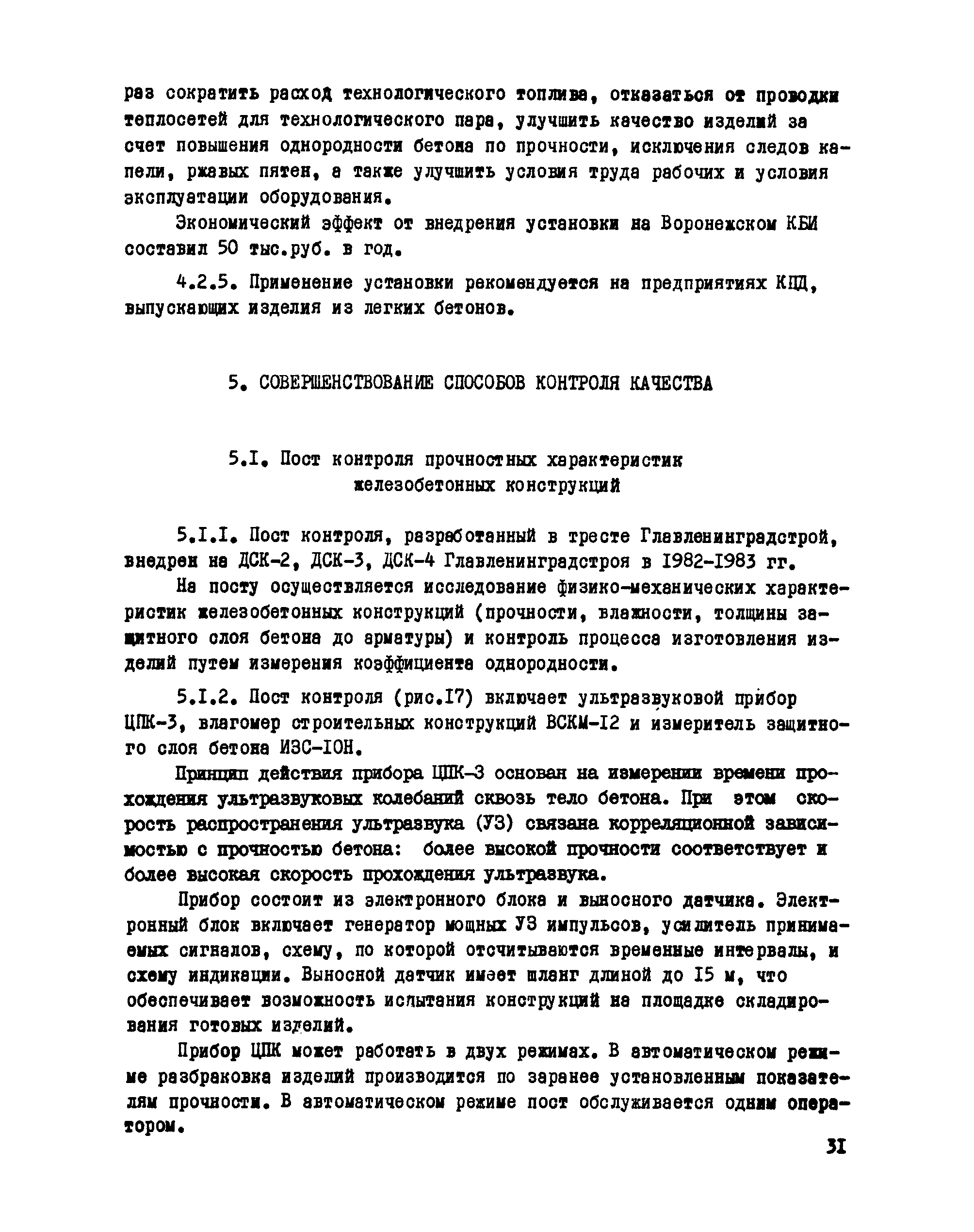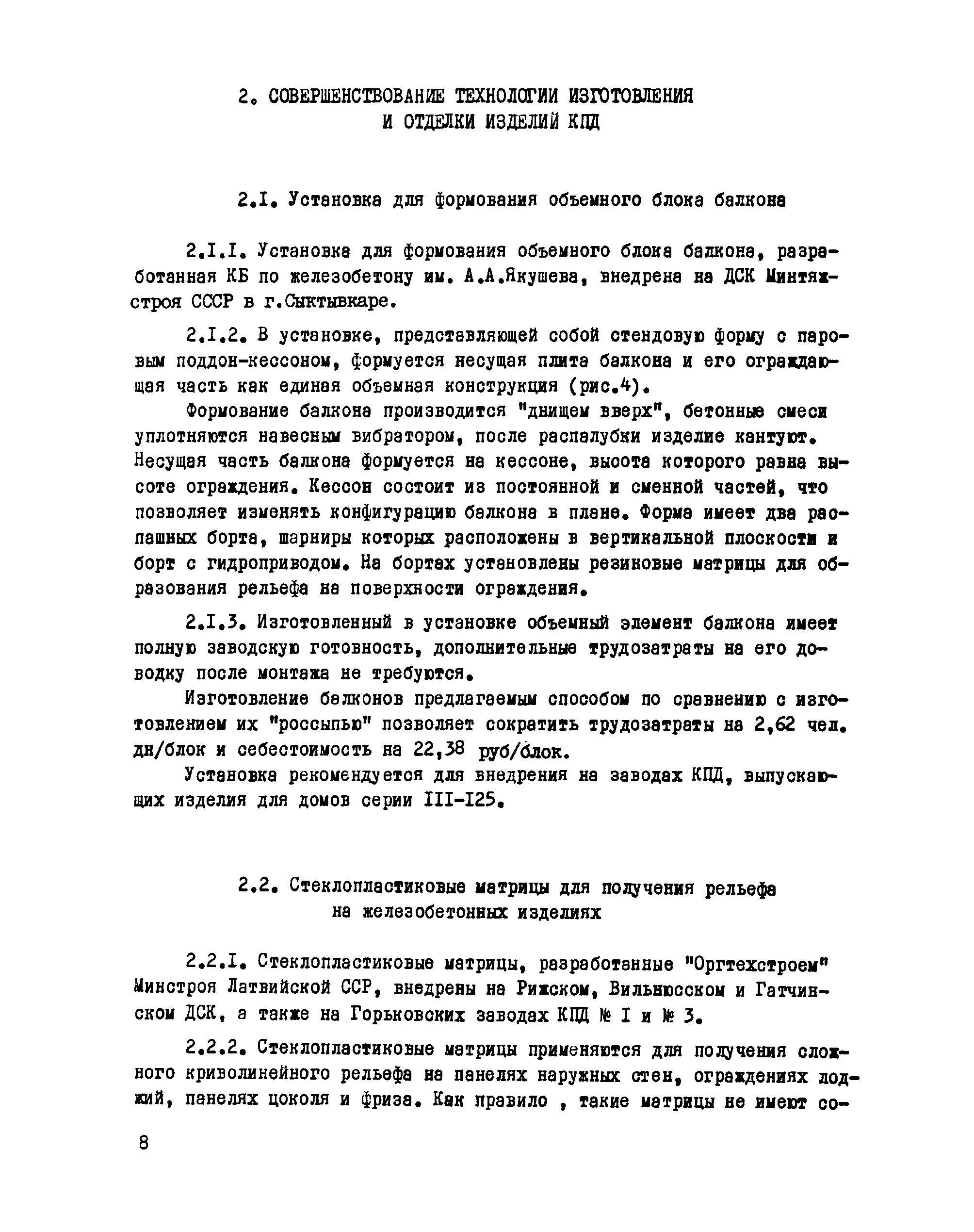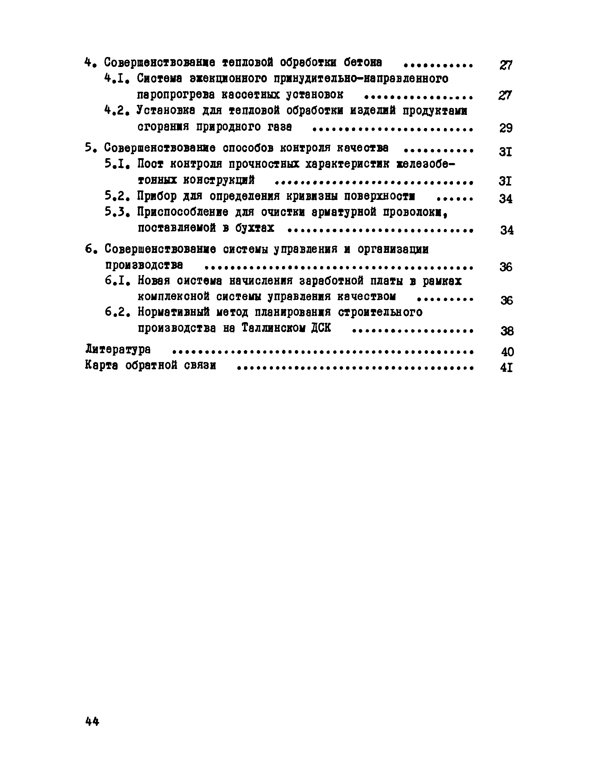 | Оглавление: | 1 Совершенствование технологии приготовления бетонных смесей 1.1 Электрохимическая обработка воды для затворения бетона 1.2 Применение комплексных добавок для бетонных смесей 1.3 Автоматизация бетоносмесительных установок периодического действия 2. Совершенствование технологии изготовления и отделки изделий КПД 2.1 Установка для формования объемного блока балкона 2.2. Стеклопластиковые матрицы для получения рельефа на железобетонных изделиях 2.3. Железобетонные матрицы для получения рельефа на ограждениях балконов и лоджий 2.4. Матрицы из листовой холоднокатанной стали для получения рельефа на ограждающих конструкциях зданий 2.5. Установка для шпаклевки железобетонных и бетонных поверхностей 2.6. Подстилающий слой из водного раствора сульфитно-дрожжевой бражки (СДБ) 2.7. Эмульсионная смазка ОПЛ-С 2.8 Роторно-пульсационный аппарат для приготовления смазки 3. Совершенствование арматурных работ 3.1 Полуавтоматическая линия ПДС-6м по производству двухветвевых каркасов 3.2. Подвесные сварочные клещи 3.3. Пневмогидроножницы для высечки проемов в армокаркасах 3.4. Ручной инструмент для вязки арматурных конструкций 4. Совершенствование тепловой обработки бетона 4.1 Система эжекционного принудительно-направленного паропрогрева кассетных установок 4.2. Установка для тепловой обработки изделий продуктами сгорания природного газа 5. Совершенствование способов контроля качества 5.1 Пост контроля прочностных характеристик железобетонных конструкций 5.2. Прибор для определения кривизны поверхности 5.3, Приспособление для очистки арматурной проволоки, поставляемой в бухтах 6. Совершенствование системы управления и организации производства 6.1 Новая система начисления заработной платы в рамках комплексной системы управления качеством 6.2. Нормативный метод планирования строительного производства на Таллинском ДСК Литературе Карта обратной связи |