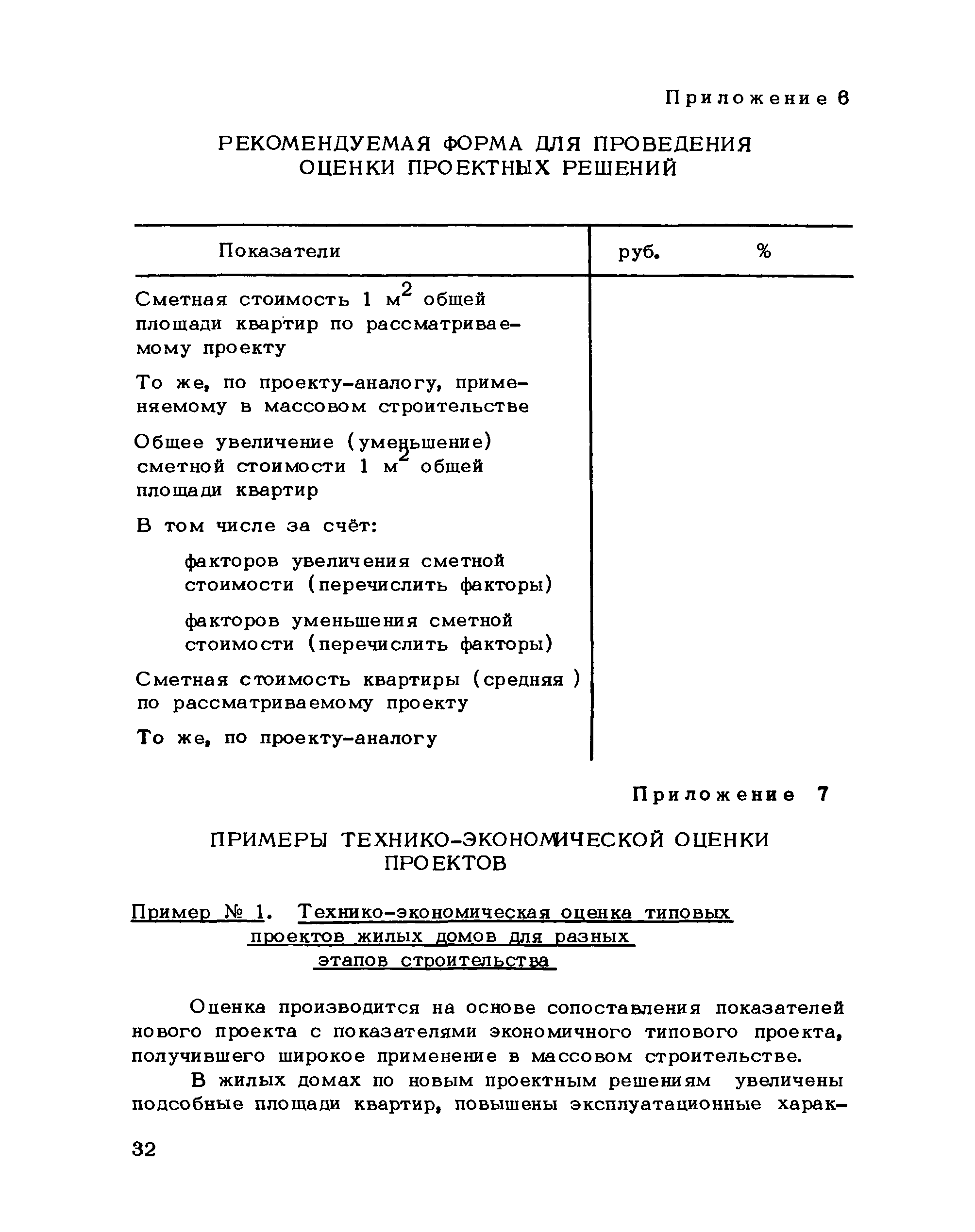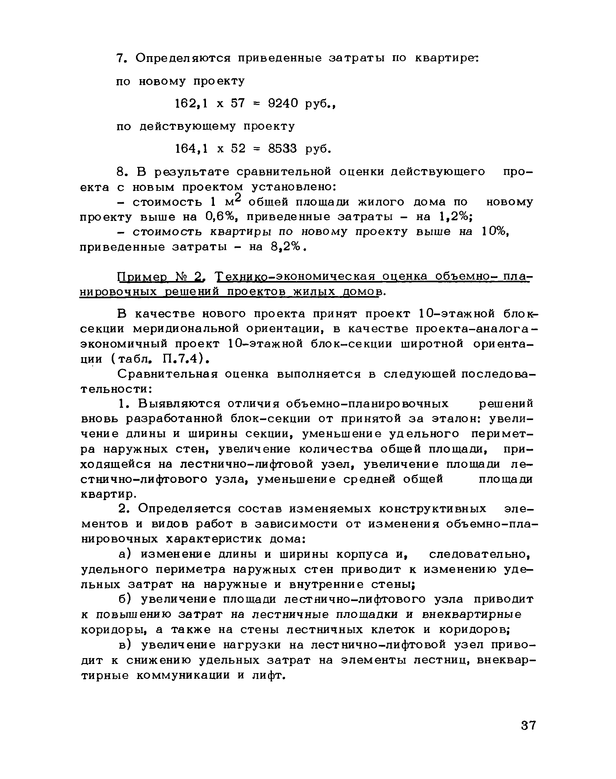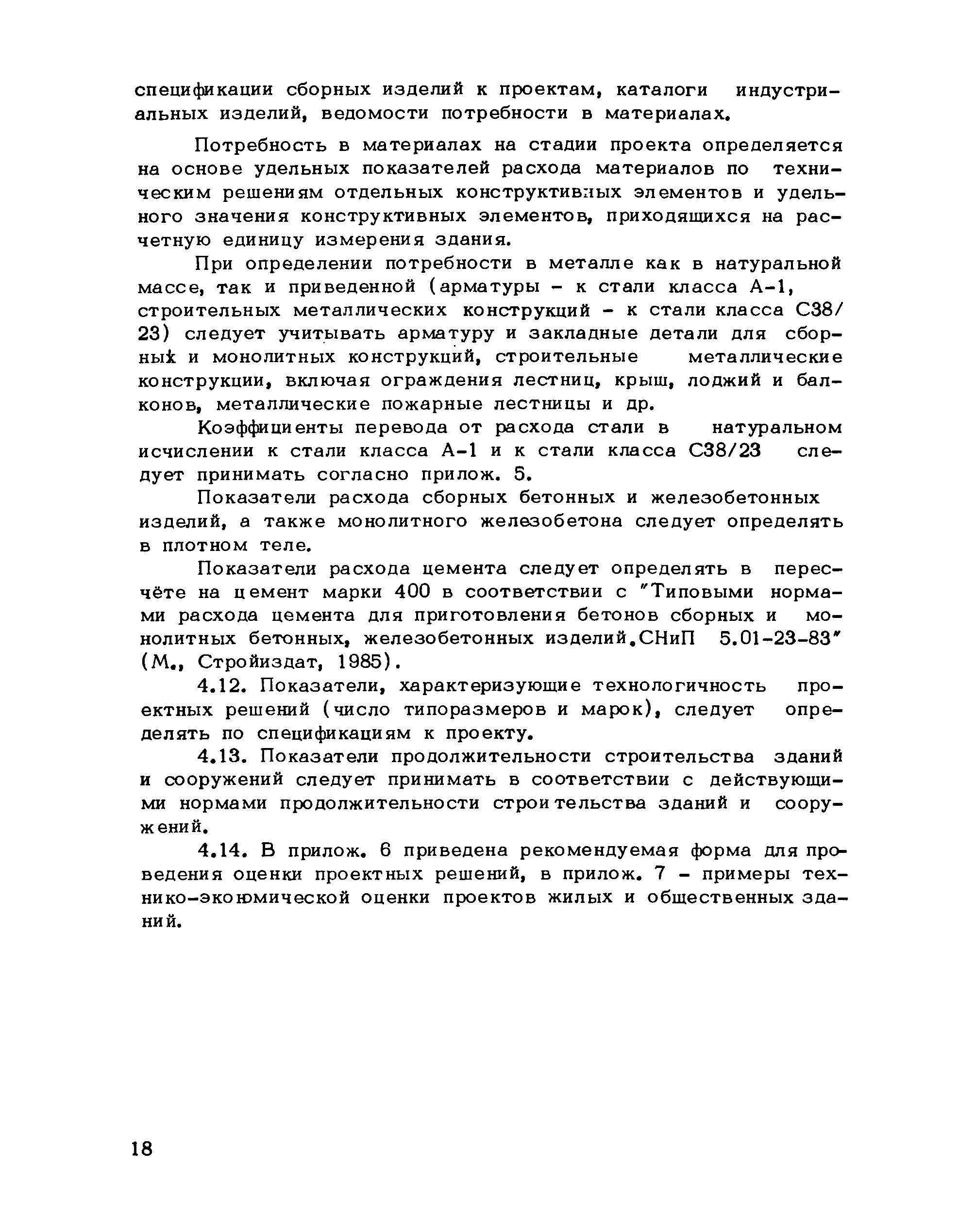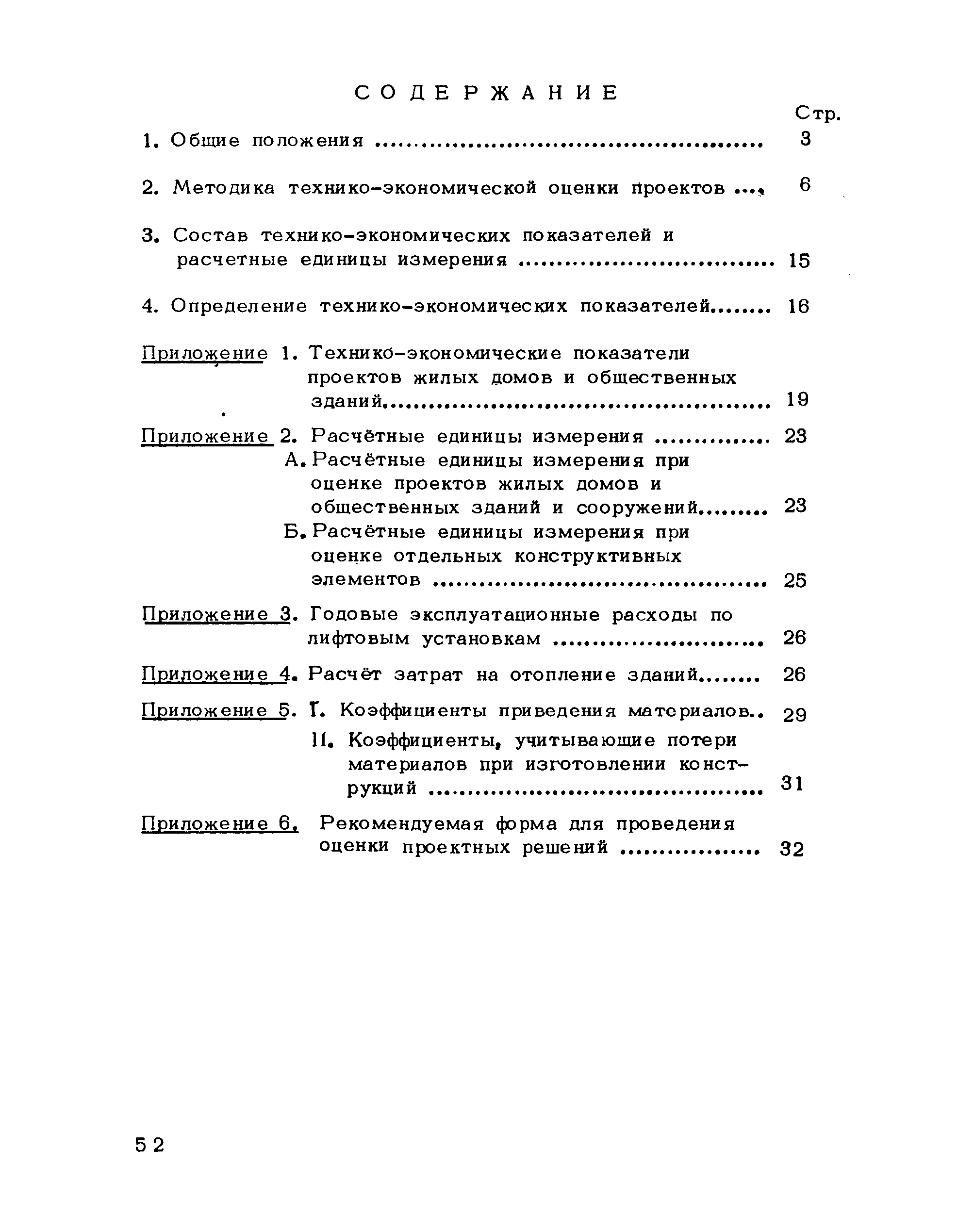 | Оглавление: | 1. Общие положения 2. Методика технико-экономической оценки проектов 3. Состав технико-экономических показателей и расчетные единицы измерения 4. Определение технико-экономических показателей Приложение 1. Технико-экономические показатели проектов жилых домов и общественных зданий Приложение 2. Расчётные единицы измерения А. Расчётные единицы измерения при оценке проектов жилых домов и общественных зданий и сооружений Б. Расчётные единицы измерения при оценке отдельных конструктивных элементов Приложение 3. Годовые эксплуатационные расходы по лифтовым установкам Приложение 4. Расчет затрат на отопление зданий Приложение 5. I. Коэффициенты приведения материалов II. Коэффициенты, учитывающие потери материалов при изготовлении конструкций Приложение 6. Рекомендуемая норма для проведения оценки проектных решений Приложение 7. Примеры технико-экономической оценки проектов Пример 1. Технико-экономическая оценка типовых проектов жилых домов для разных этапов строительства Пример 2. Технико-экономическая оценка объемно-планировочных решений проектов жилых домов Пример 3. Технико-экономическая оценка жилых домов усадебного типа Пример 4. Технико-экономическая оценка нового типового проекта детского дошкольного учреждения Пример 5. Технико-экономическая оценка типового проекта школы |