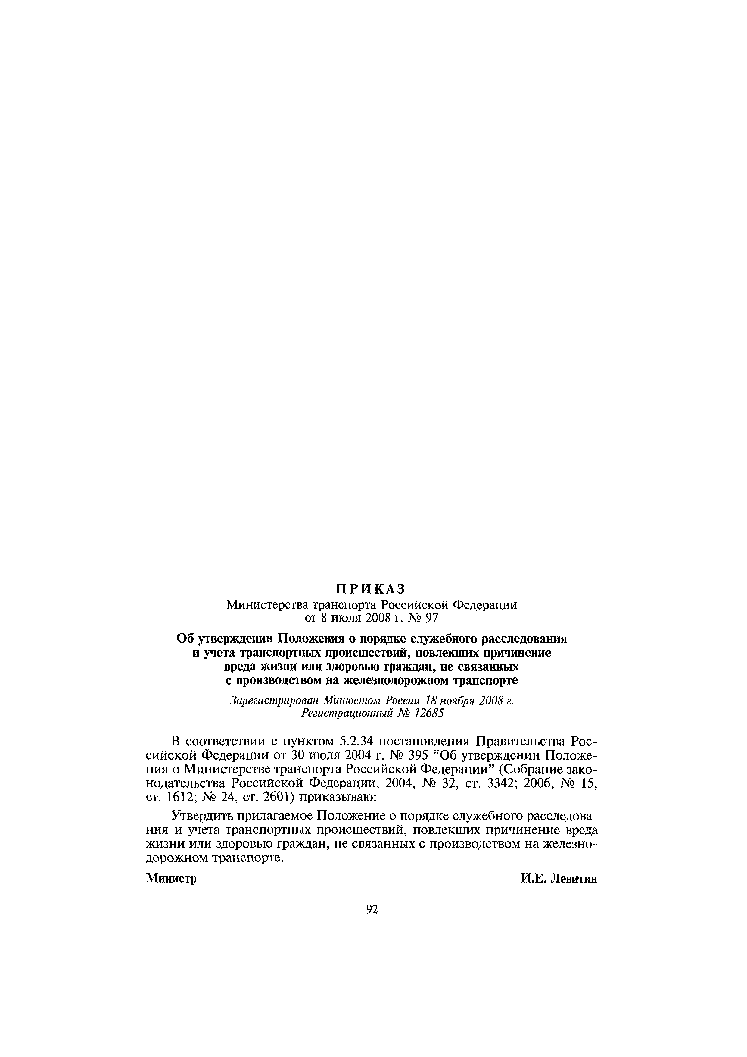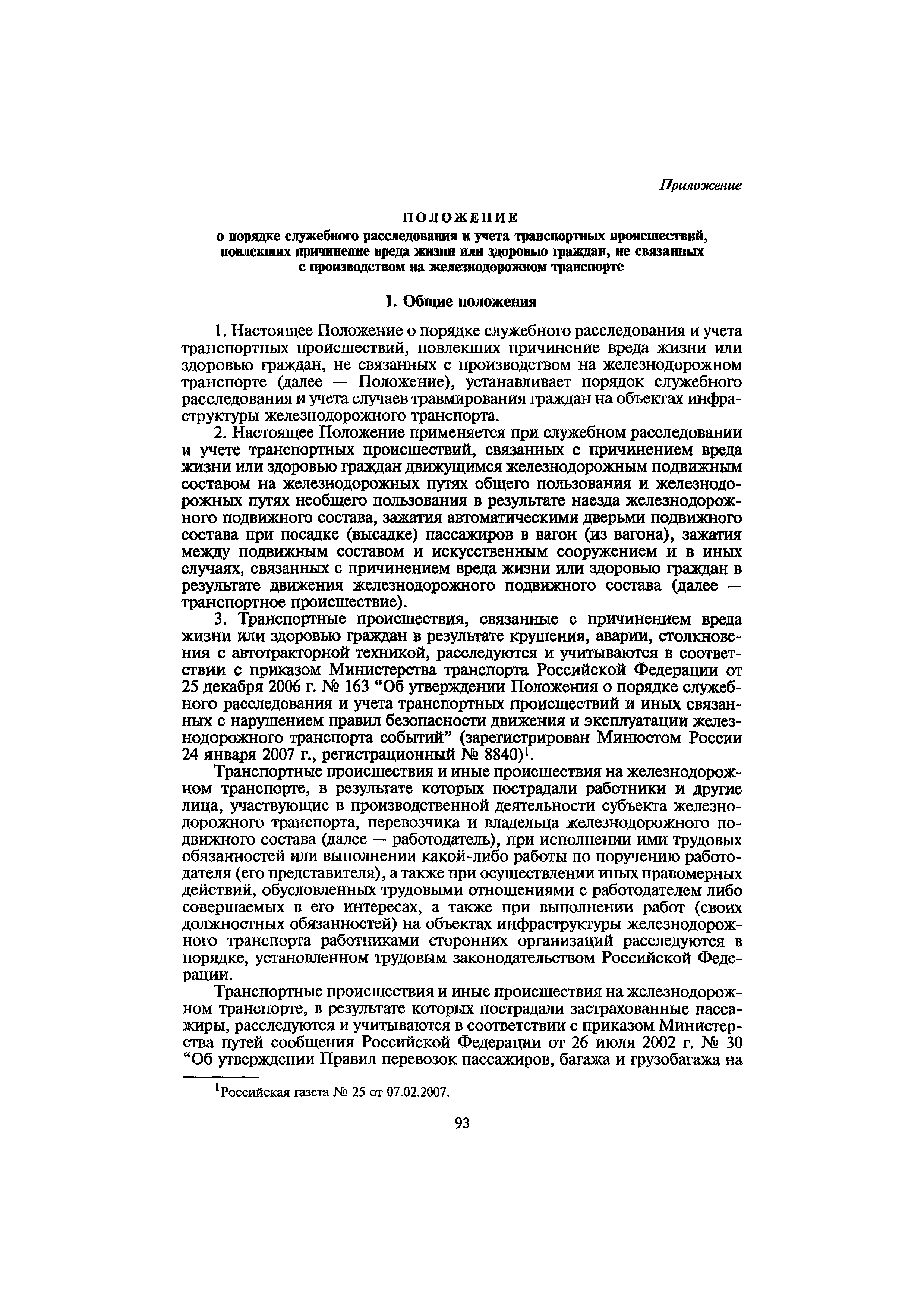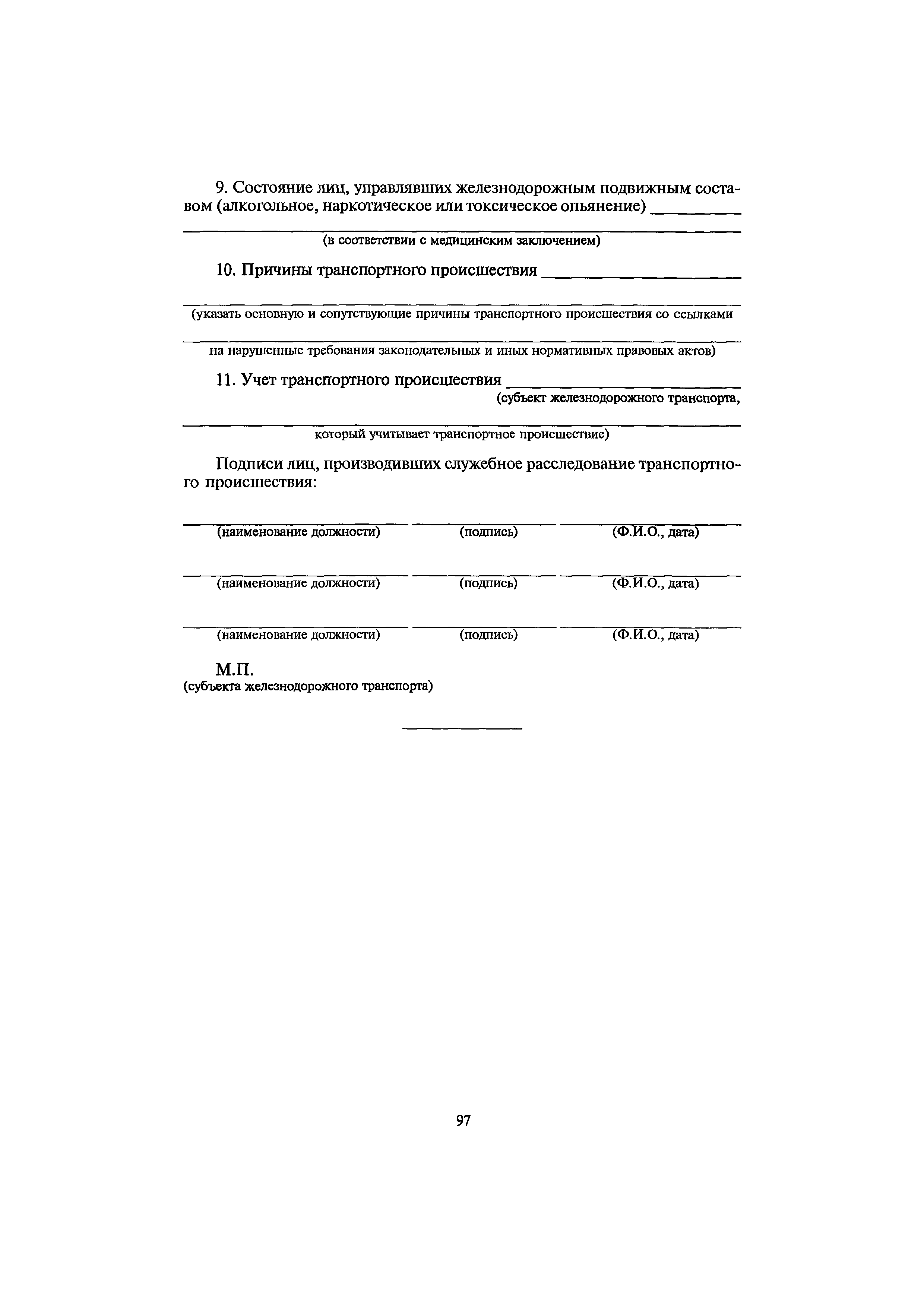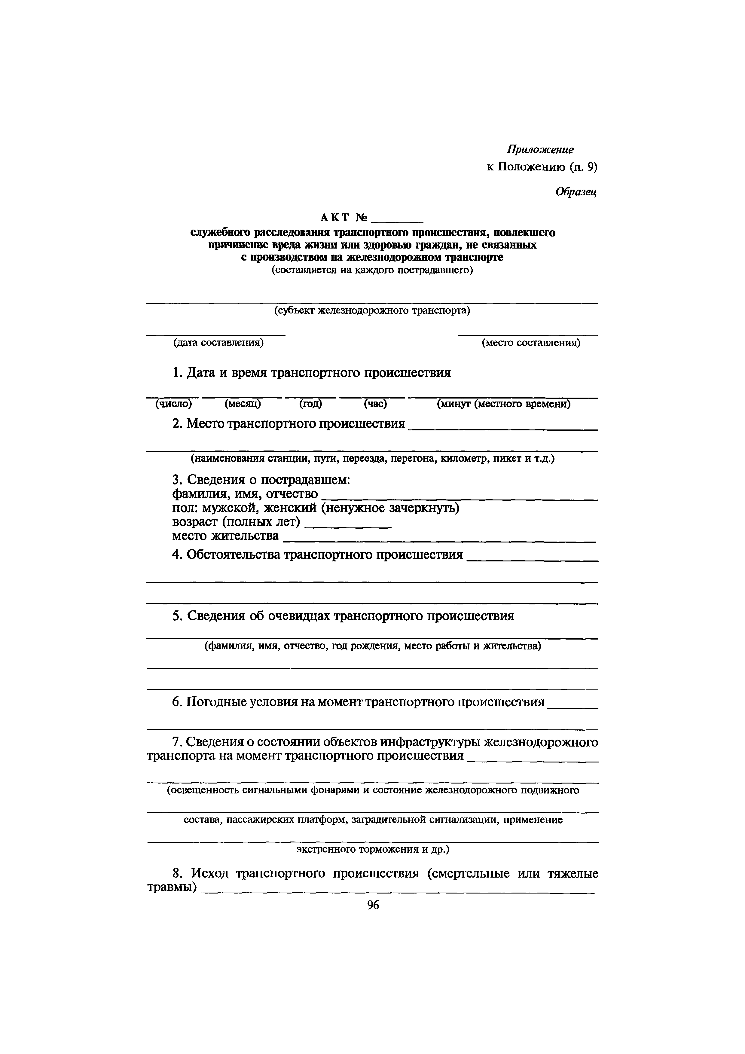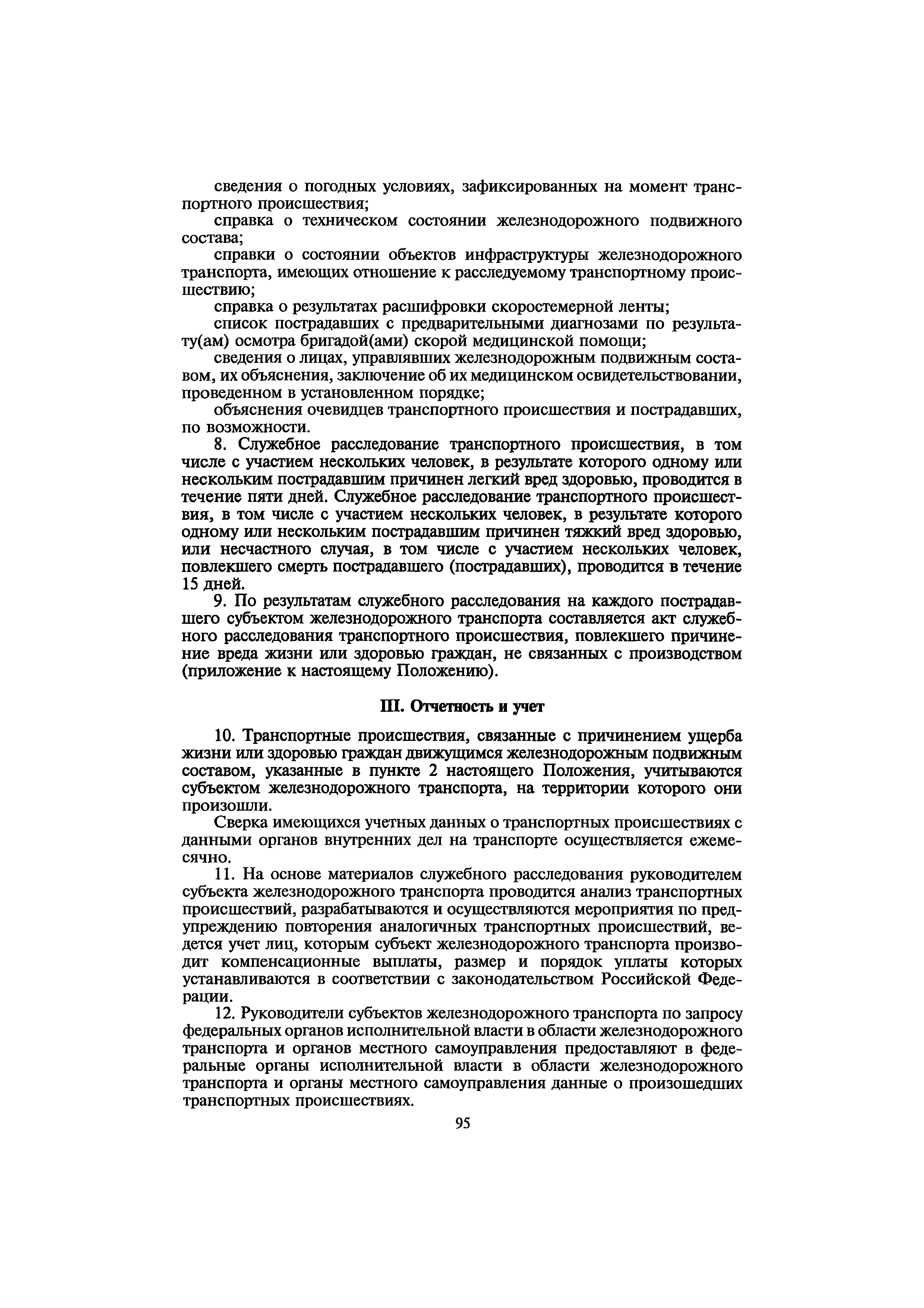 Положение о порядке служебного расследования и учета транспортных происшествий, повлекших причинение вреда жизни или здоровью граждан, не связанных с производством на железнодорожном транспорте| Статус: | действует | | Название рус.: | Положение о порядке служебного расследования и учета транспортных происшествий, повлекших причинение вреда жизни или здоровью граждан, не связанных с производством на железнодорожном транспорте | | Дата добавления в базу: | 01.09.2013 | | Дата актуализации: | 01.01.2021 | | Дата введения: | 12.12.2008 | | Область применения: | Положение устанавливает порядок служебного расследования и учета случаев травмирования граждан на объектах инфраструктуры железнодорожного транспорта | | Оглавление: | I. Общие положения II. Служебное расследование транспортных происшествий, повлекших причинение вреда жизни или здоровью граждан, не связанных с производством на железнодорожном транспорте, и порядок оформления его результатов III. Отчетность и учет Приложение. Акт служебного расследования транспортного происшествия, повлекшего причинение вреда жизни или здоровью граждан, не связанных с производством на железнодорожном транспорте | | Утверждён: | 08.07.2008 Минтранс РФ (Russian Federation Mintrans 97)