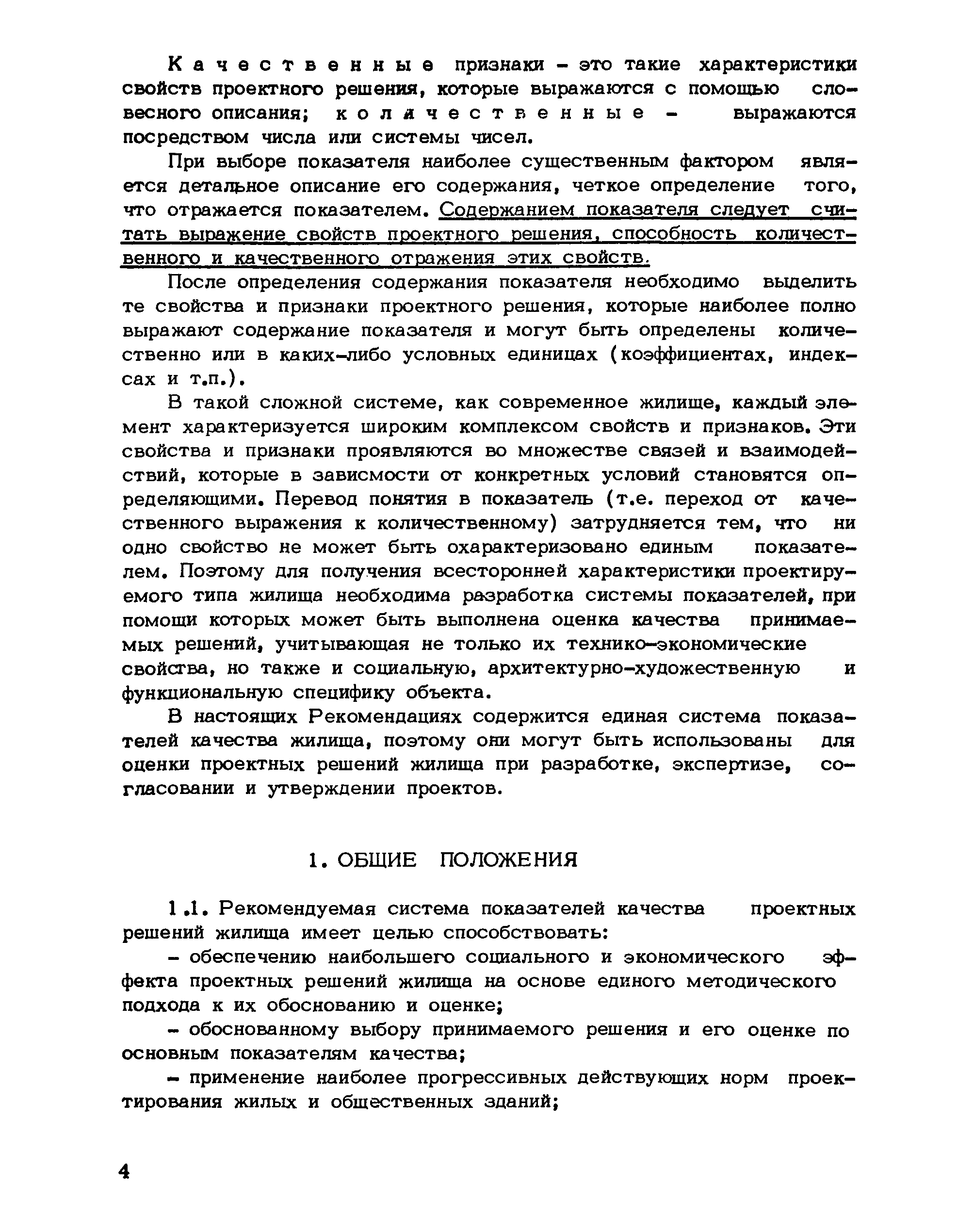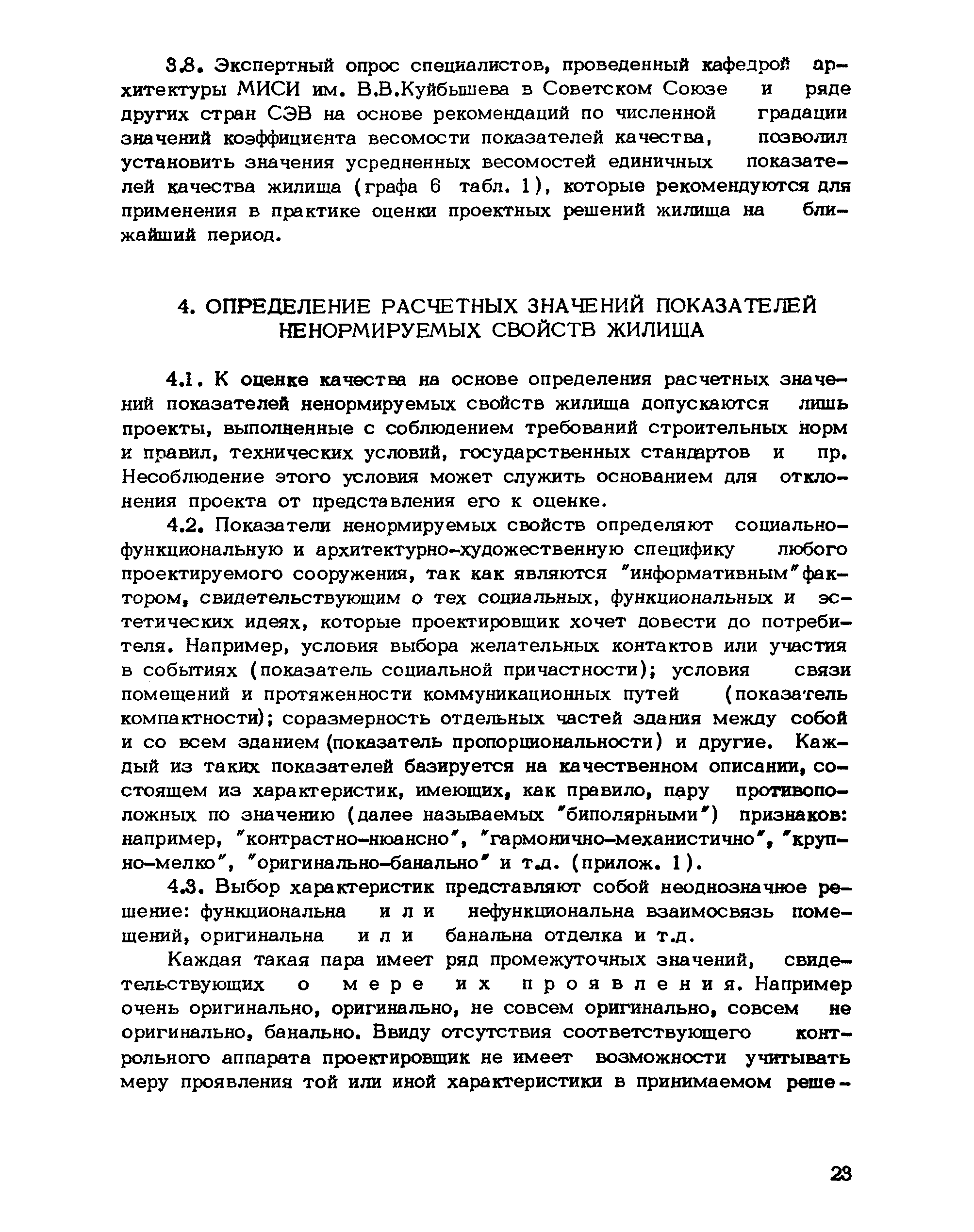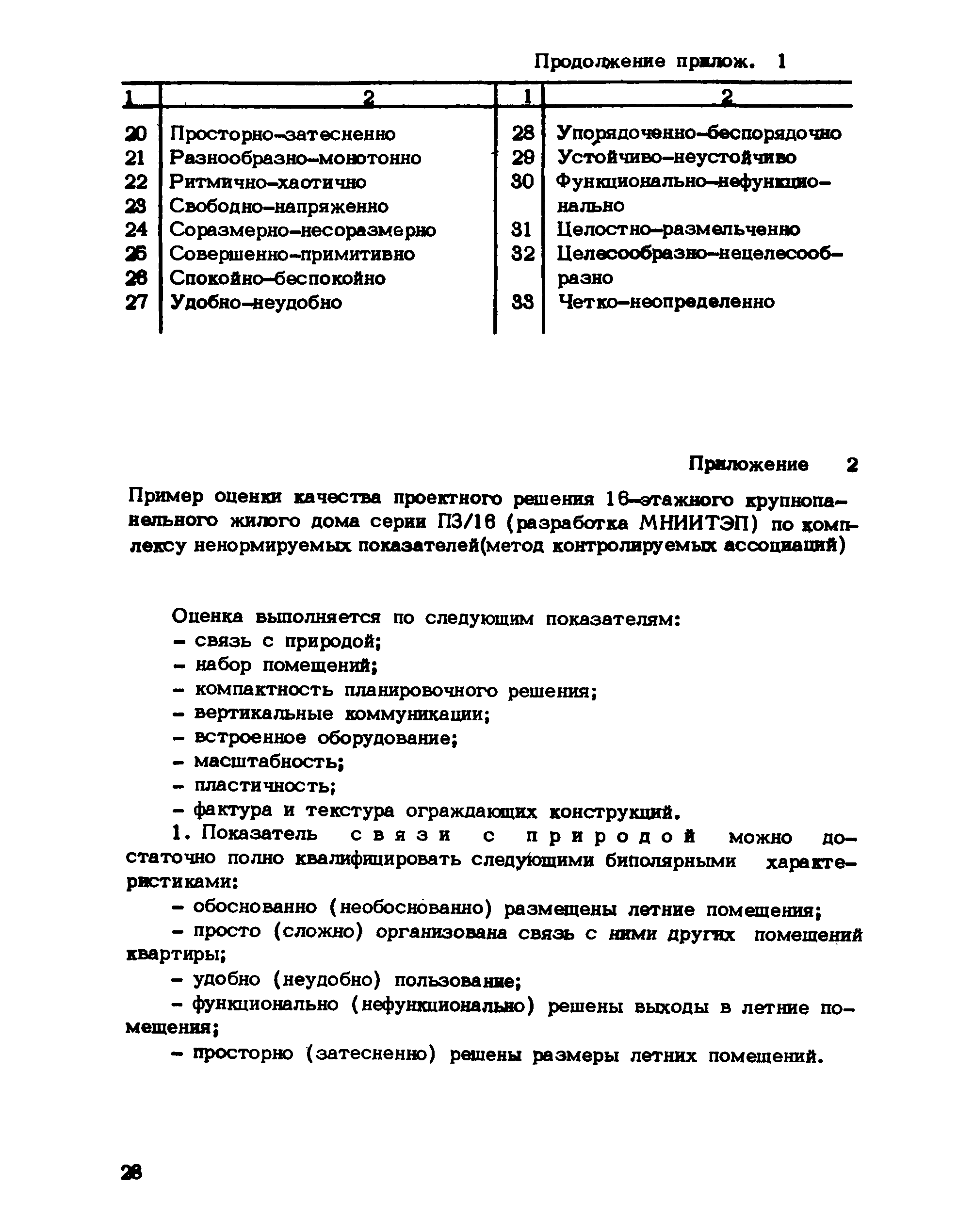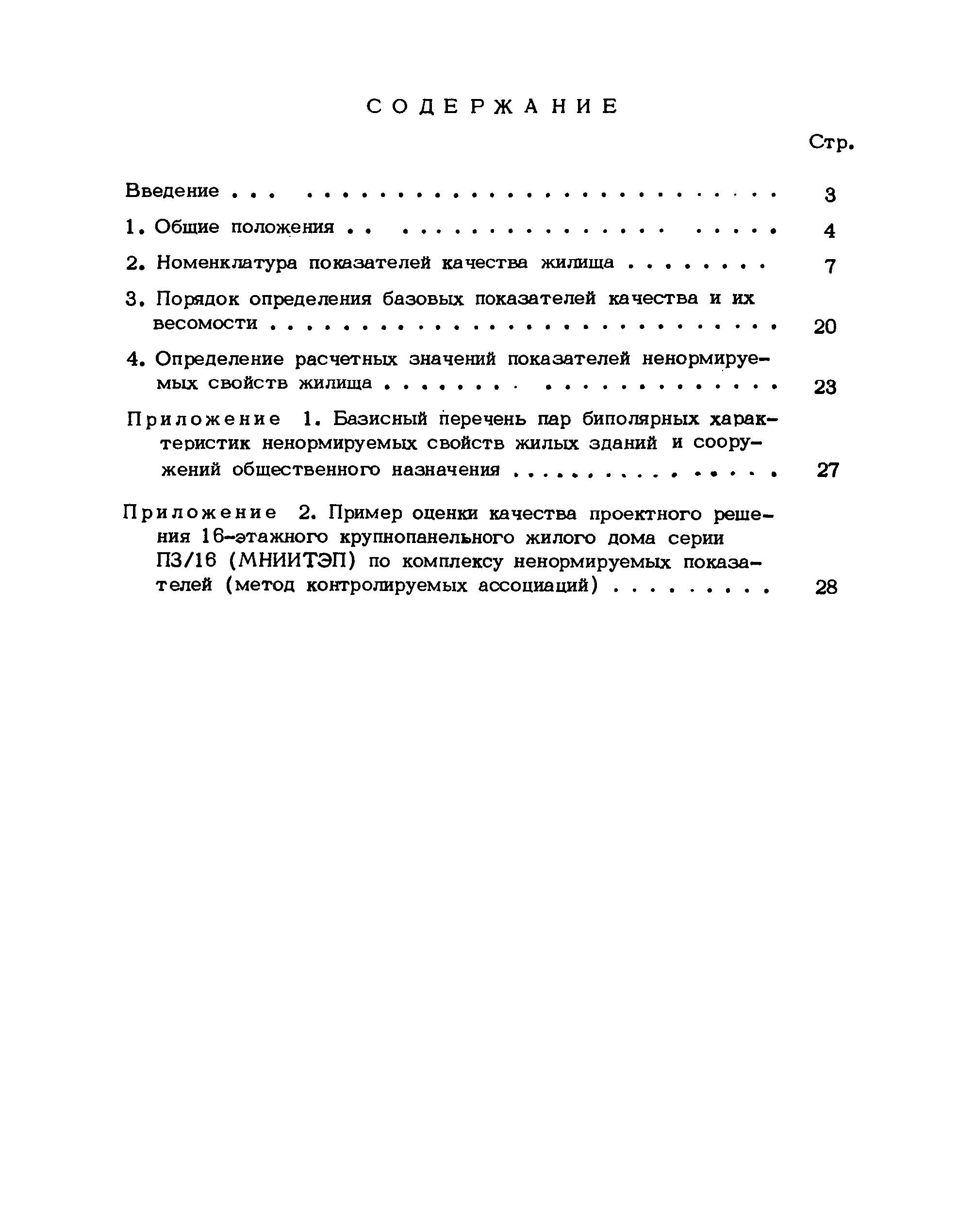 | Оглавление: | Введение 1. Общие положения 2. Номенклатура показателей качества жилища 3. Порядок определения базовых показателей качества и их весомости 4. Определение расчетных значений показателей ненормируемых свойств жилища Приложение 1. Базисный перечень пар биполярных характеристик ненормируемых свойств жилых зданий и сооружений общественного назначения Приложение 2. Пример оценки качества проектного решения 16-этажного крупнопанельного жилого дома серии ПЗ/16 (МНИИТЭП) по комплексу ненормируемых показателей (метод контролируемых ассоциаций) |