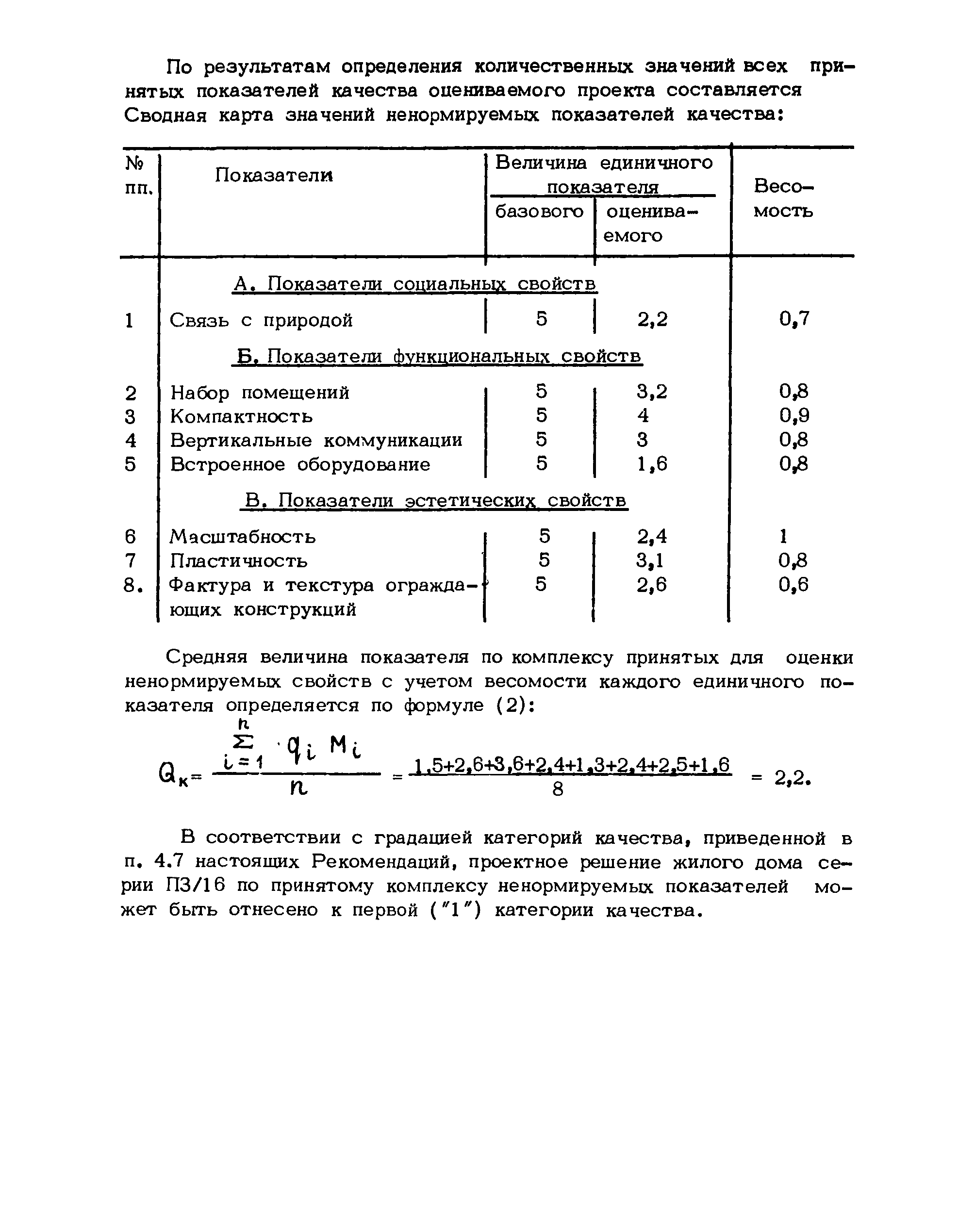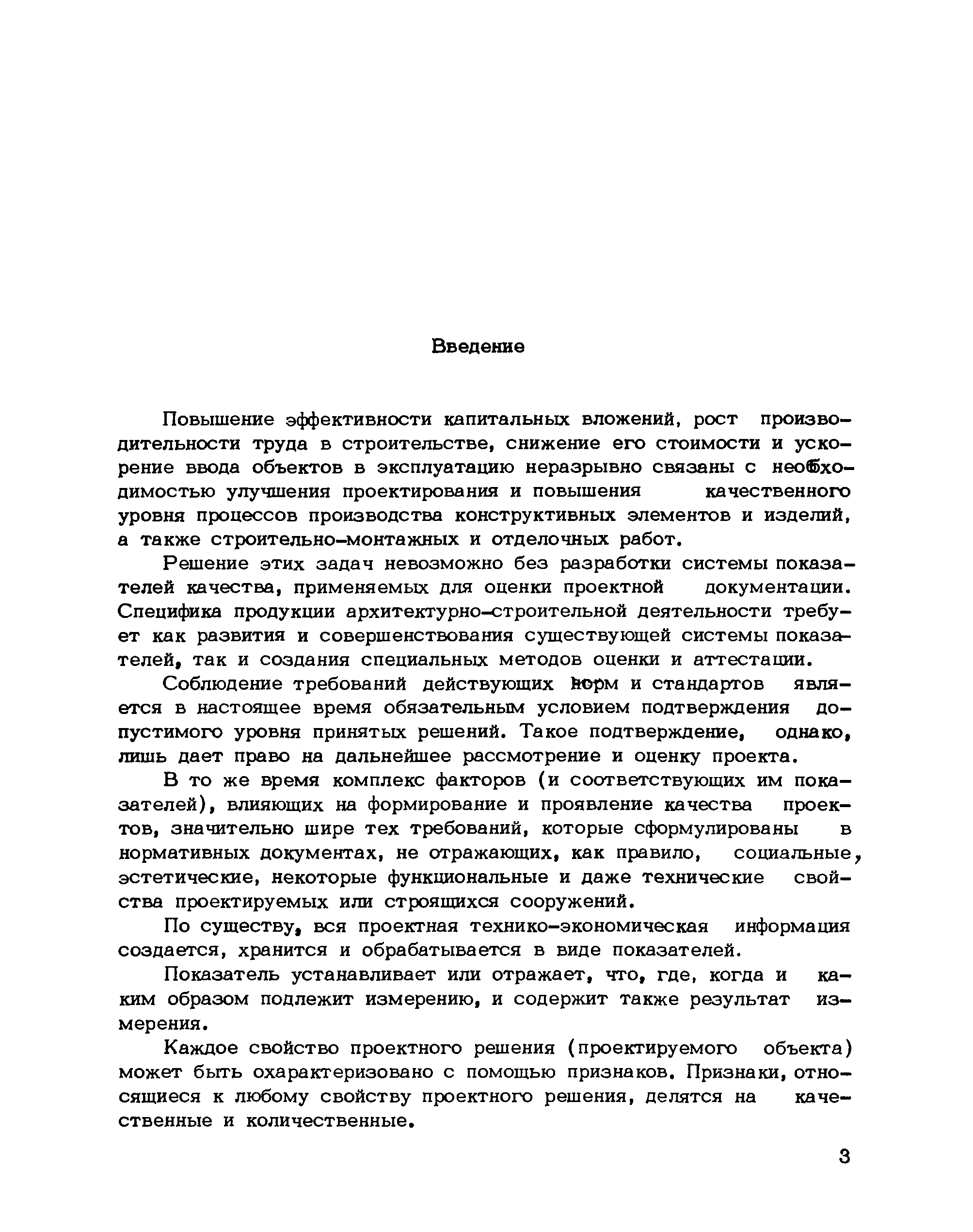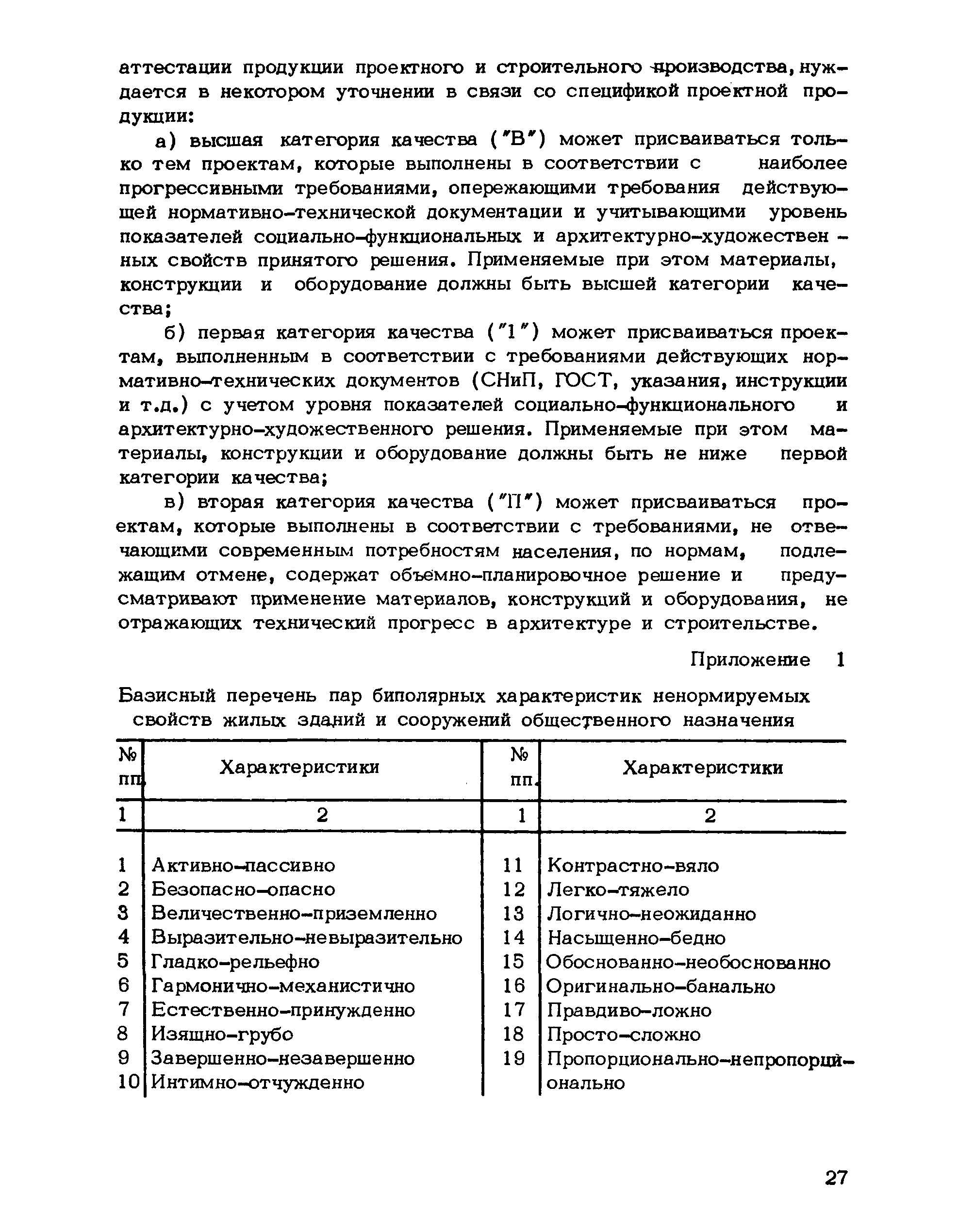 | Оглавление: | Введение 1. Общие положения 2. Номенклатура показателей качества жилища 3. Порядок определения базовых показателей качества и их весомости 4. Определение расчетных значений показателей ненормируемых свойств жилища Приложение 1. Базисный перечень пар биполярных характеристик ненормируемых свойств жилых зданий и сооружений общественного назначения Приложение 2. Пример оценки качества проектного решения 16-этажного крупнопанельного жилого дома серии ПЗ/16 (МНИИТЭП) по комплексу ненормируемых показателей (метод контролируемых ассоциаций) |