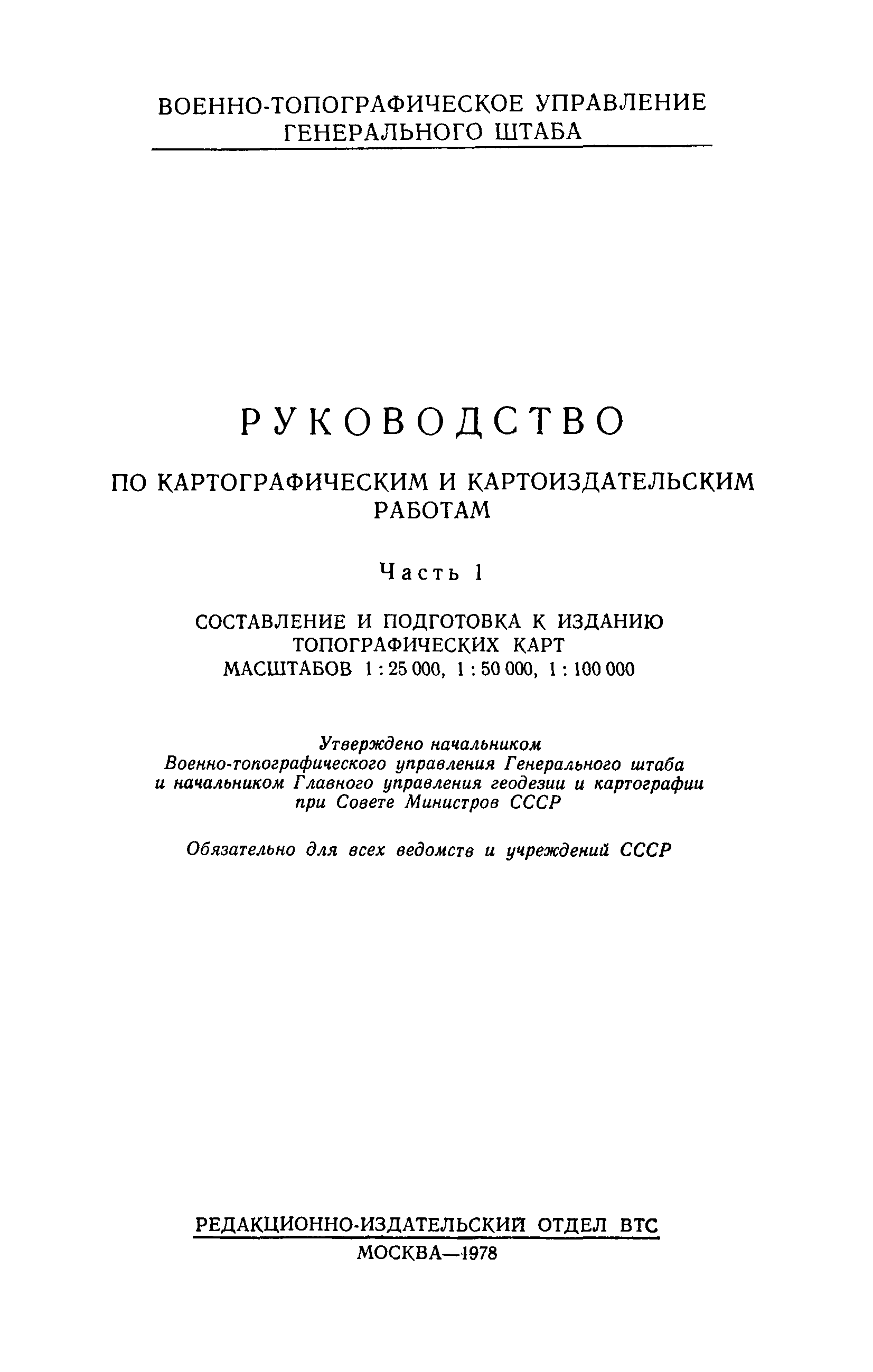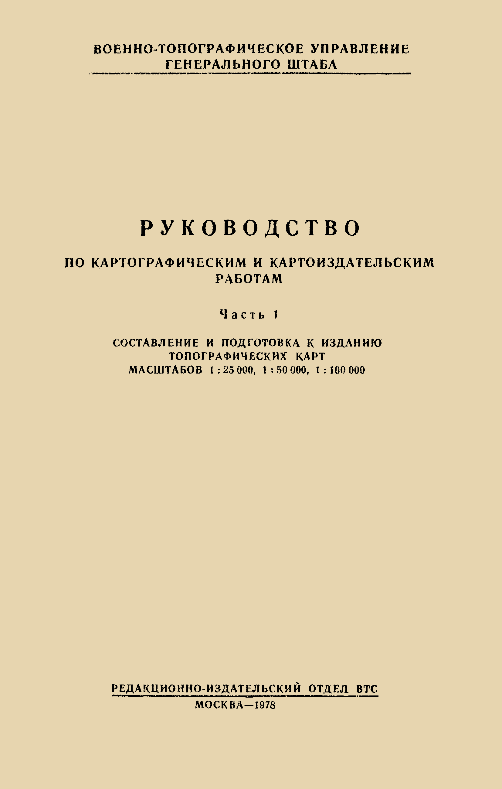 | Название рус.: | Руководство по картографическим и картоиздательским работам. Часть 1. Составление и подготовка к изданию топографических карт масштабов 1:25000, 1:50000, 1:100000 |