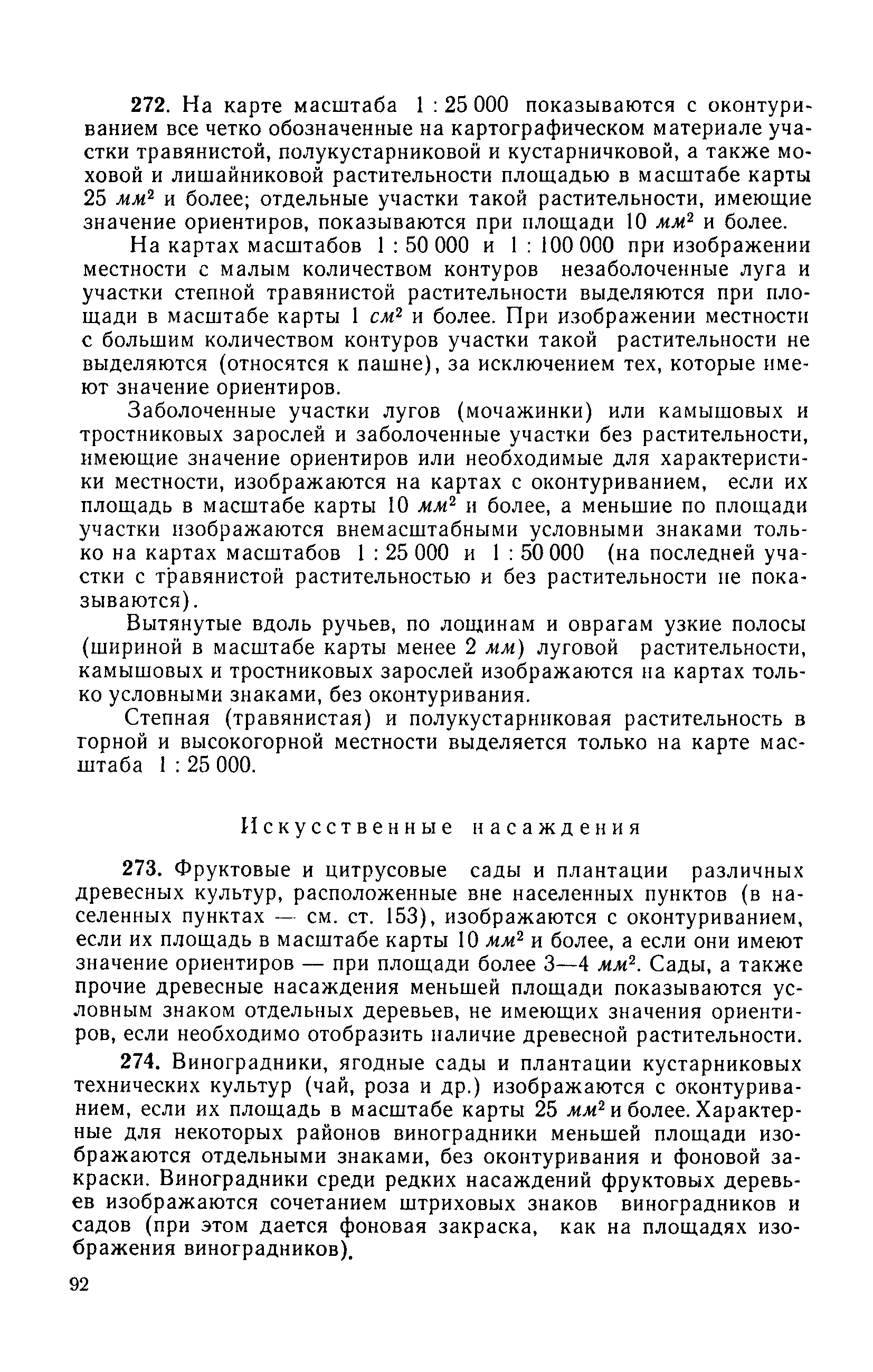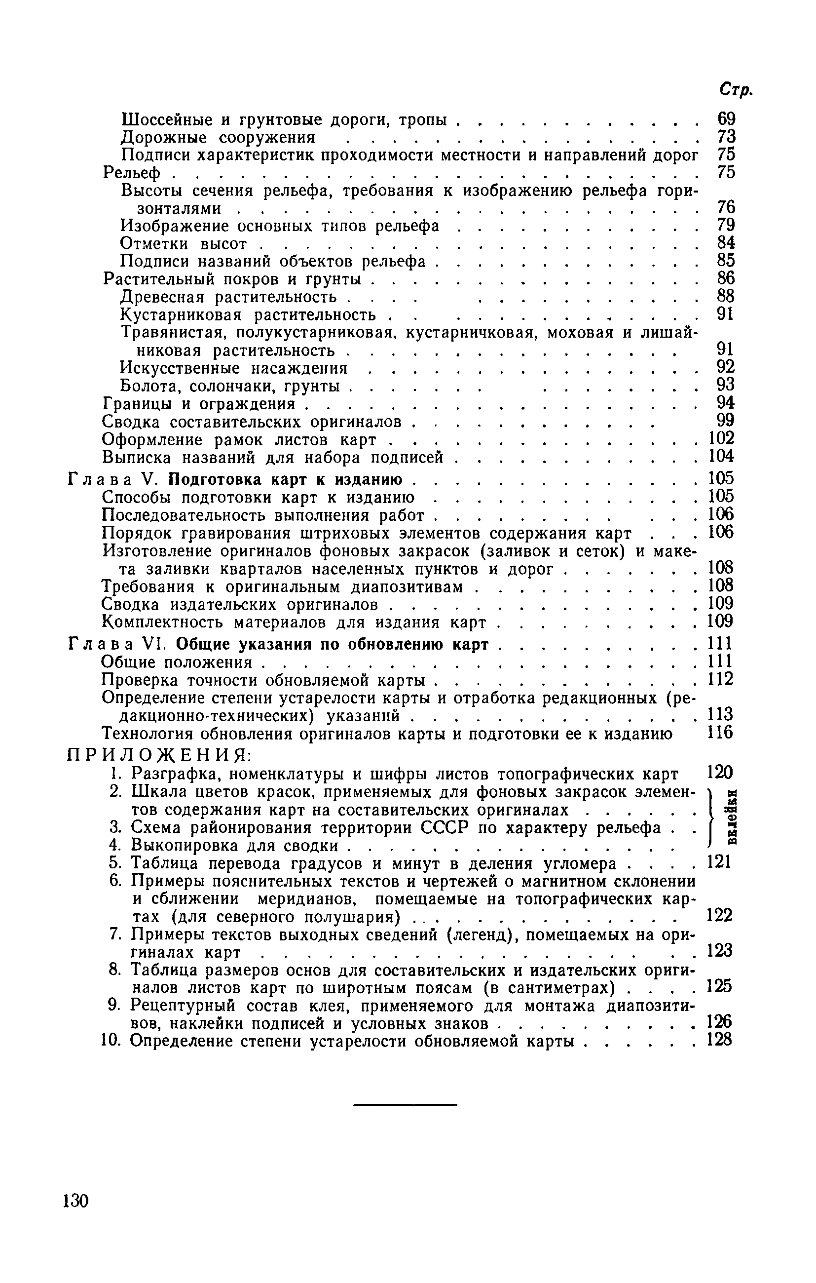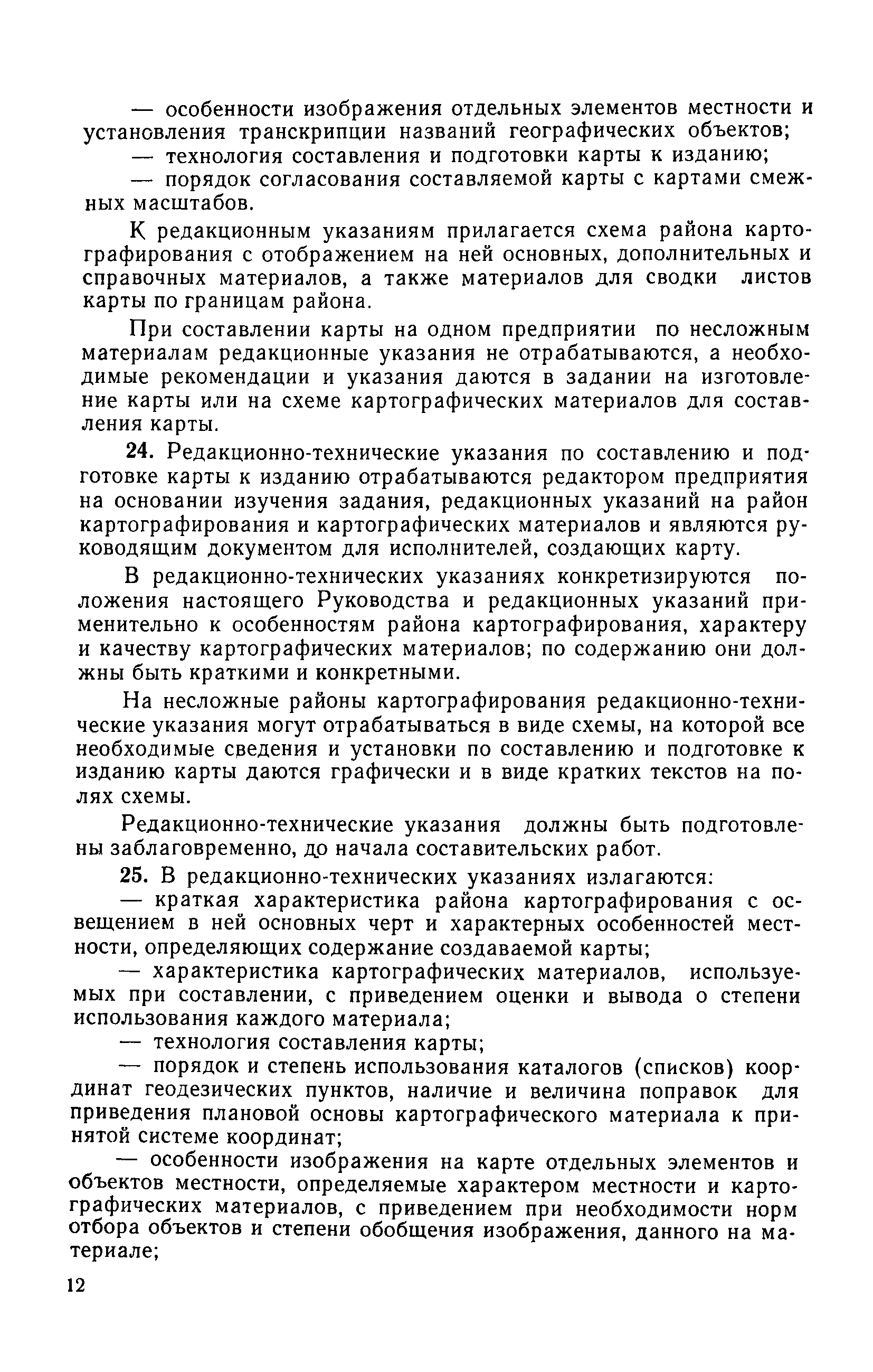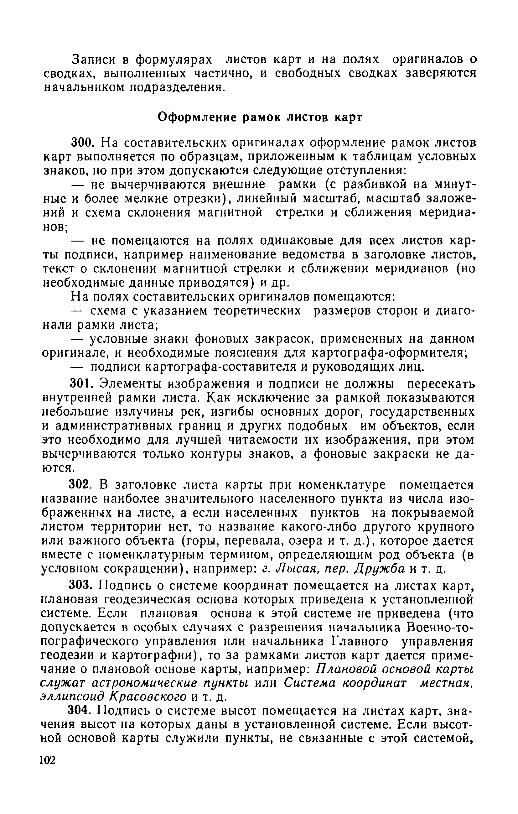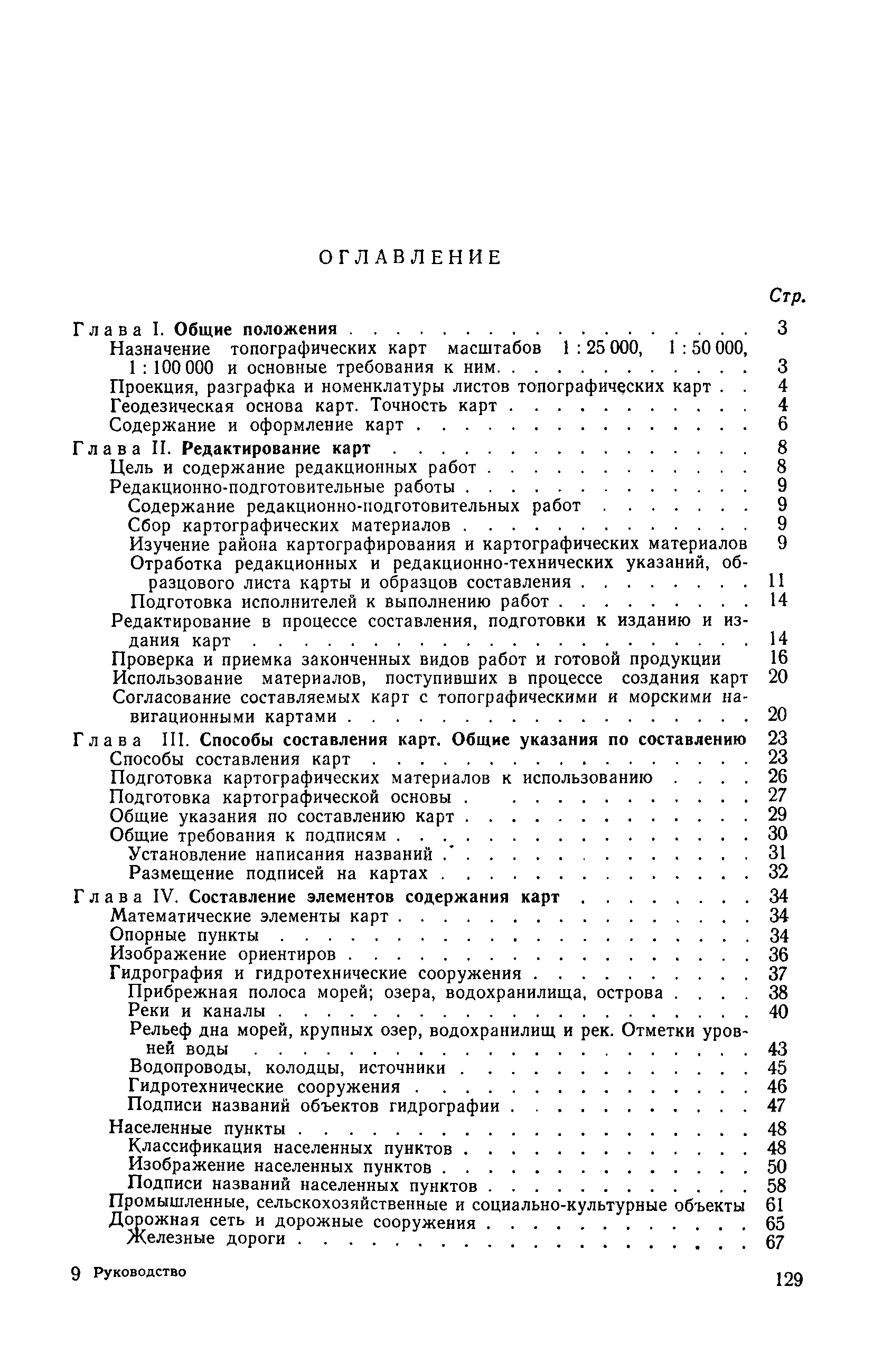 | Оглавление: | Глава 1. Общие положения Назначение топографических карт масштабов 1: 25000, 1: 50000, 1:100000 и основные требования к ним Проекция, разграфка и номенклатуры листов топографических карт Геодезическая основа карт. Точность карт Содержание и оформление карт Глава II. Редактирование карт Цель и содержание редакционных работ Редакционно-подготовительные работы Содержание редакционно-подготовительных работ Сбор картографических материалов Изучение района картографирования и картографических материалов Отработка редакционных и редакционно-технических указаний, образцового листа карты и образцов составления Подготовка исполнителей к выполнению работ Редактирование в процессе составления, подготовки к изданию и издания карт Проверка и приемка законченных видов работ и готовой продукции Использование материалов, поступивших в процессе создания карт Согласование составляемых карт с топографическими и морскими навигационными картами Глава III. Способы составления карт. Общие указания по составлению Способы составления карт Подготовка картографических материалов к использованию Подготовка картографической основы Общие указания по составлению карт Общие требования к подписям Установление написания названий Размещение подписей на картах Глава IV. Составление элементов содержания карт Математические элементы карт Опорные пункты Изображение ориентиров Гидрография и гидротехнические сооружения Прибрежная полоса морей; озера, водохранилища, острова Реки и каналы Рельеф дна морей, крупных озер, водохранилищ и рек. Отметки уровней воды Водопроводы, колодцы, источники Гидротехнические сооружения Подписи названий объектов гидрографии Населенные пункты Классификация населенных пунктов Изображение населенных пунктов Подписи названий населенных пунктов Промышленные, сельскохозяйственные и социально-культурные объекты Дорожная сеть и дорожные сооружения Железные дороги Шоссейные и грунтовые дороги, тропы Дорожные сооружения Подписи характеристик проходимости местности и направлений дорог Рельеф Высоты сечения рельефа, требования к изображению рельефа горизонталями Изображение основных типов рельефа Отметки высот Подписи названий объектов рельефа Растительный покров и грунты Древесная растительность Кустарниковая растительность Травянистая, полукустарниковая, кустарничковая, моховая и лишайниковая растительность Искусственные насаждения Болота, солончаки, грунты Границы и ограждения Сводка составительских оригиналов Оформление рамок листов карт Выписка названий для набора подписей Глава V. Подготовка карт к изданию Способы подготовки карт к изданию Последовательность выполнения работ Порядок гравирования штриховых элементов содержания карт Изготовление оригиналов фоновых закрасок (заливок и сеток) и макета заливки кварталов населенных пунктов и дорог Требования к оригинальным диапозитивам Сводка издательских оригиналов Комплектность материалов для издания карт Глава VI. Общие указания по обновлению карт Общие положения Проверка точности обновляемой карты Определение степени устарелости карты и отработка редакционных (редакционно-технических) указаний Технология обновления оригиналов карты и подготовки ее к изданию Приложения: 1. Разграфка, номенклатуры и шифры листов топограф