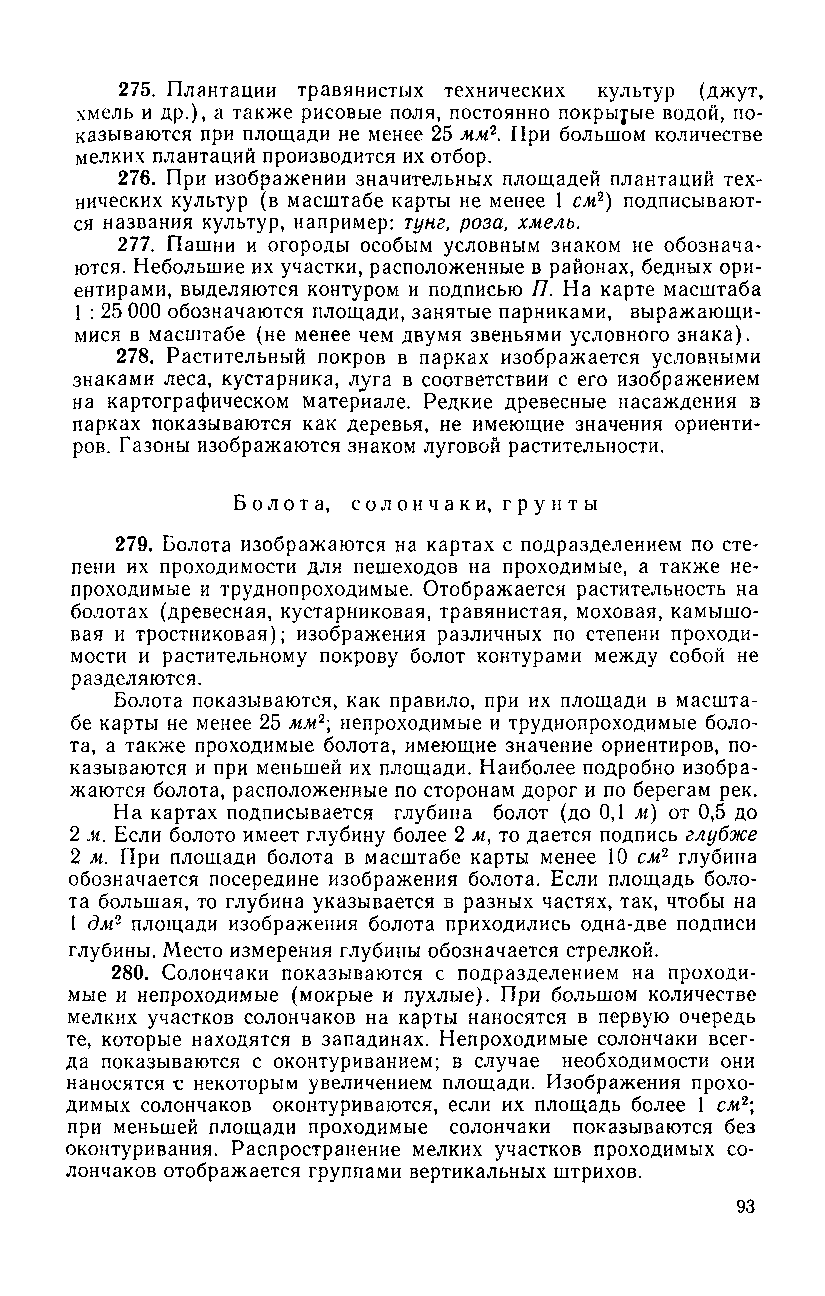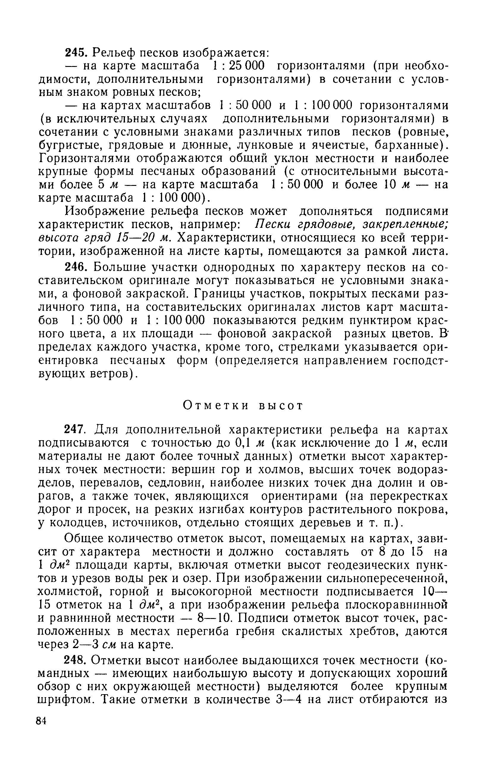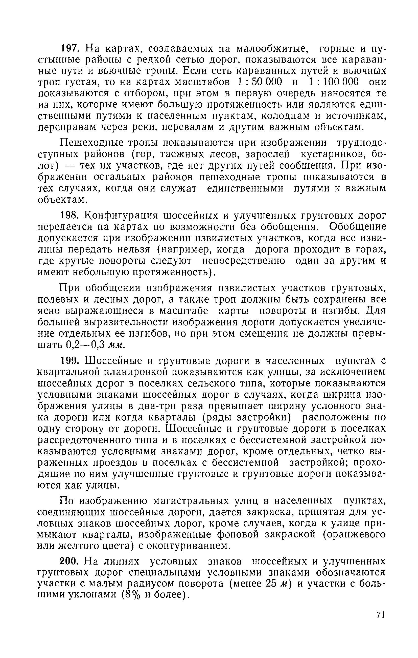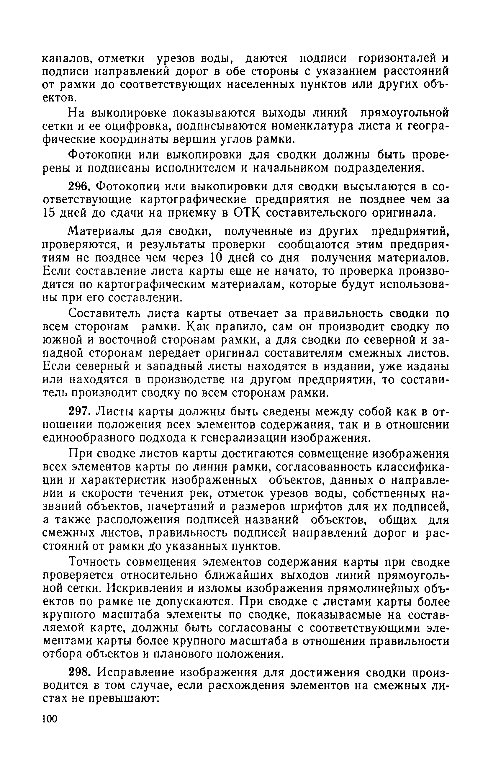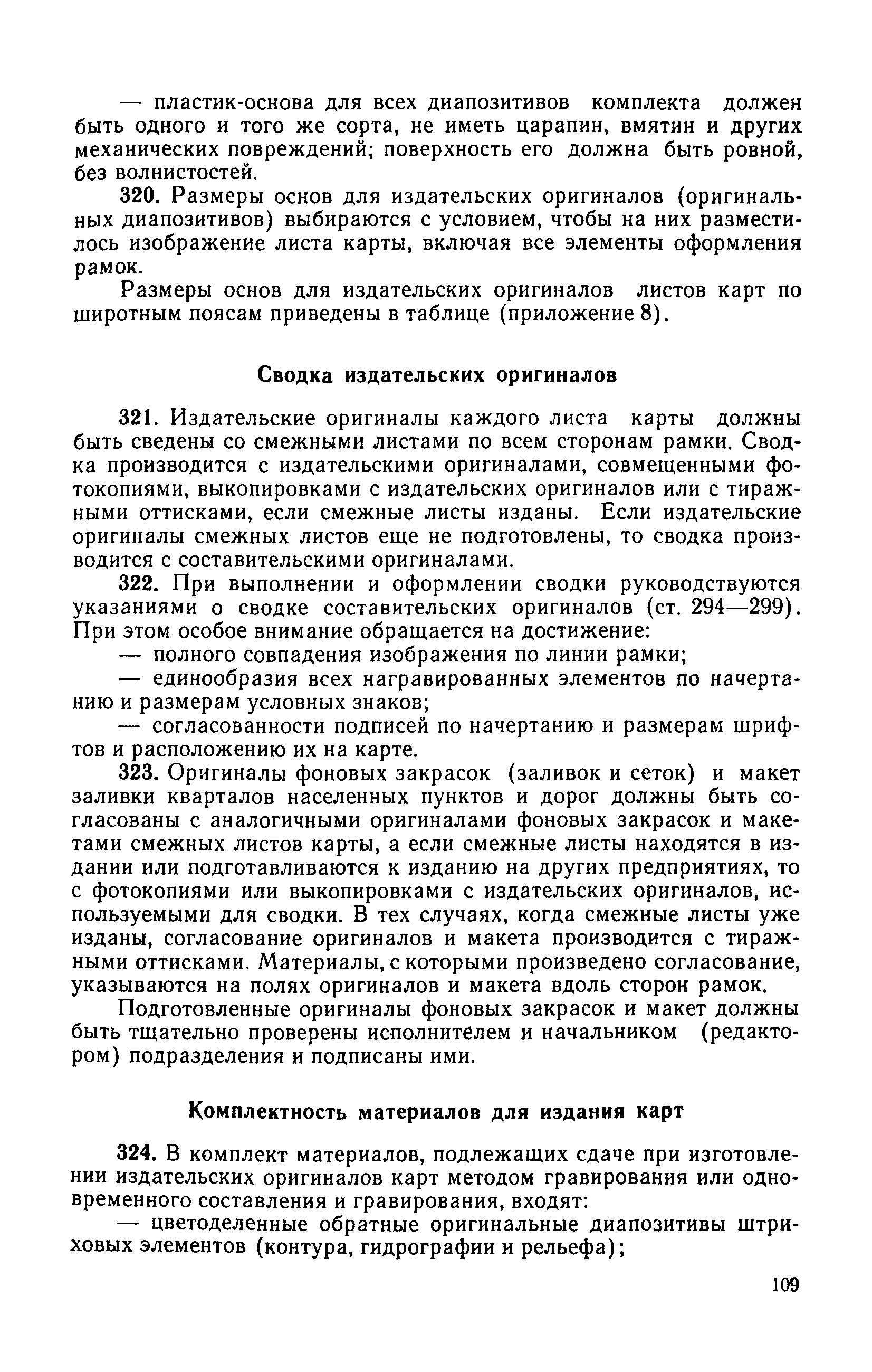 | Оглавление: | Глава 1. Общие положения Назначение топографических карт масштабов 1: 25000, 1: 50000, 1:100000 и основные требования к ним Проекция, разграфка и номенклатуры листов топографических карт Геодезическая основа карт. Точность карт Содержание и оформление карт Глава II. Редактирование карт Цель и содержание редакционных работ Редакционно-подготовительные работы Содержание редакционно-подготовительных работ Сбор картографических материалов Изучение района картографирования и картографических материалов Отработка редакционных и редакционно-технических указаний, образцового листа карты и образцов составления Подготовка исполнителей к выполнению работ Редактирование в процессе составления, подготовки к изданию и издания карт Проверка и приемка законченных видов работ и готовой продукции Использование материалов, поступивших в процессе создания карт Согласование составляемых карт с топографическими и морскими навигационными картами Глава III. Способы составления карт. Общие указания по составлению Способы составления карт Подготовка картографических материалов к использованию Подготовка картографической основы Общие указания по составлению карт Общие требования к подписям Установление написания названий Размещение подписей на картах Глава IV. Составление элементов содержания карт Математические элементы карт Опорные пункты Изображение ориентиров Гидрография и гидротехнические сооружения Прибрежная полоса морей; озера, водохранилища, острова Реки и каналы Рельеф дна морей, крупных озер, водохранилищ и рек. Отметки уровней воды Водопроводы, колодцы, источники Гидротехнические сооружения Подписи названий объектов гидрографии Населенные пункты Классификация населенных пунктов Изображение населенных пунктов Подписи названий населенных пунктов Промышленные, сельскохозяйственные и социально-культурные объекты Дорожная сеть и дорожные сооружения Железные дороги Шоссейные и грунтовые дороги, тропы Дорожные сооружения Подписи характеристик проходимости местности и направлений дорог Рельеф Высоты сечения рельефа, требования к изображению рельефа горизонталями Изображение основных типов рельефа Отметки высот Подписи названий объектов рельефа Растительный покров и грунты Древесная растительность Кустарниковая растительность Травянистая, полукустарниковая, кустарничковая, моховая и лишайниковая растительность Искусственные насаждения Болота, солончаки, грунты Границы и ограждения Сводка составительских оригиналов Оформление рамок листов карт Выписка названий для набора подписей Глава V. Подготовка карт к изданию Способы подготовки карт к изданию Последовательность выполнения работ Порядок гравирования штриховых элементов содержания карт Изготовление оригиналов фоновых закрасок (заливок и сеток) и макета заливки кварталов населенных пунктов и дорог Требования к оригинальным диапозитивам Сводка издательских оригиналов Комплектность материалов для издания карт Глава VI. Общие указания по обновлению карт Общие положения Проверка точности обновляемой карты Определение степени устарелости карты и отработка редакционных (редакционно-технических) указаний Технология обновления оригиналов карты и подготовки ее к изданию Приложения: 1. Разграфка, номенклатуры и шифры листов топограф