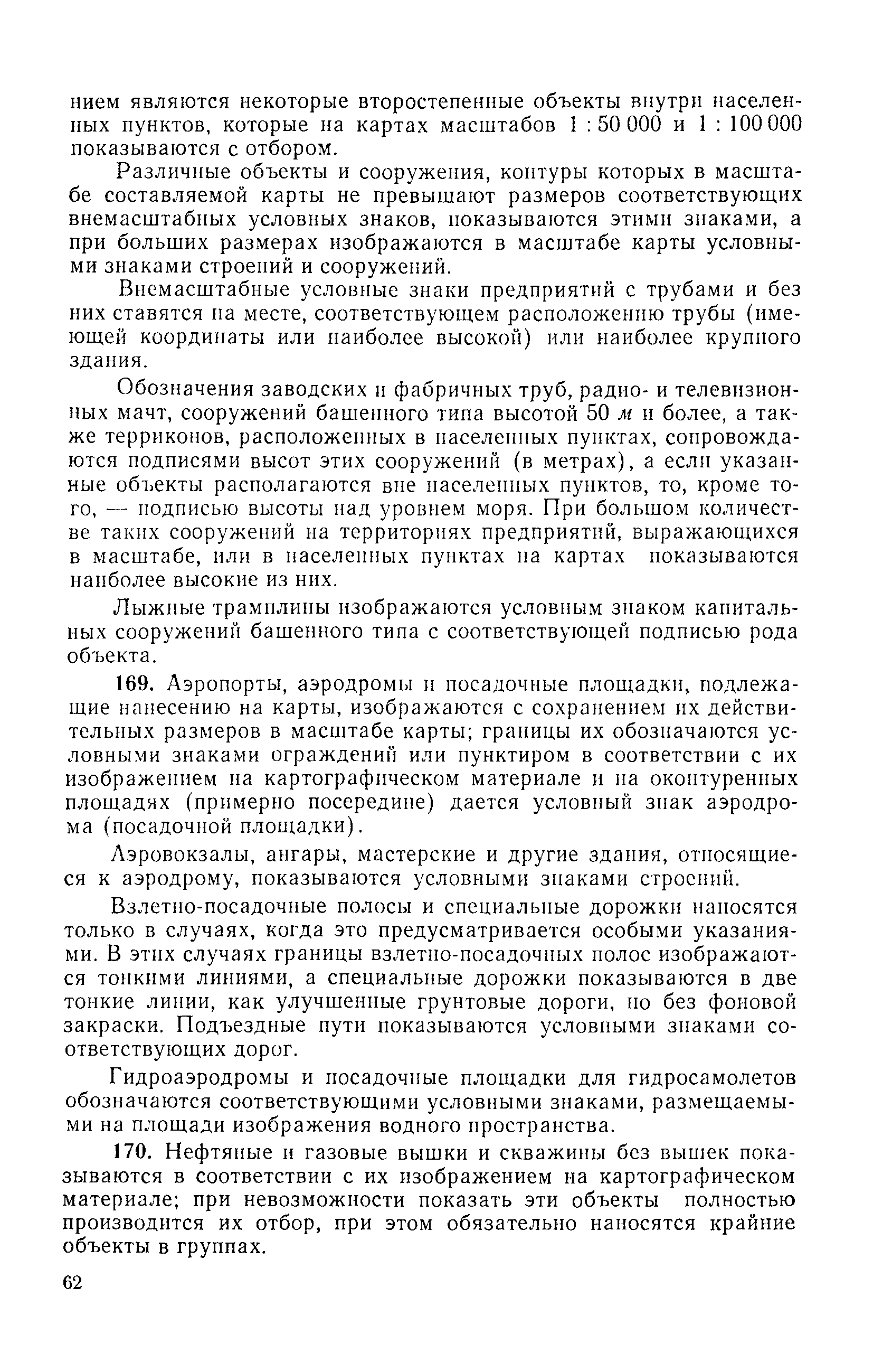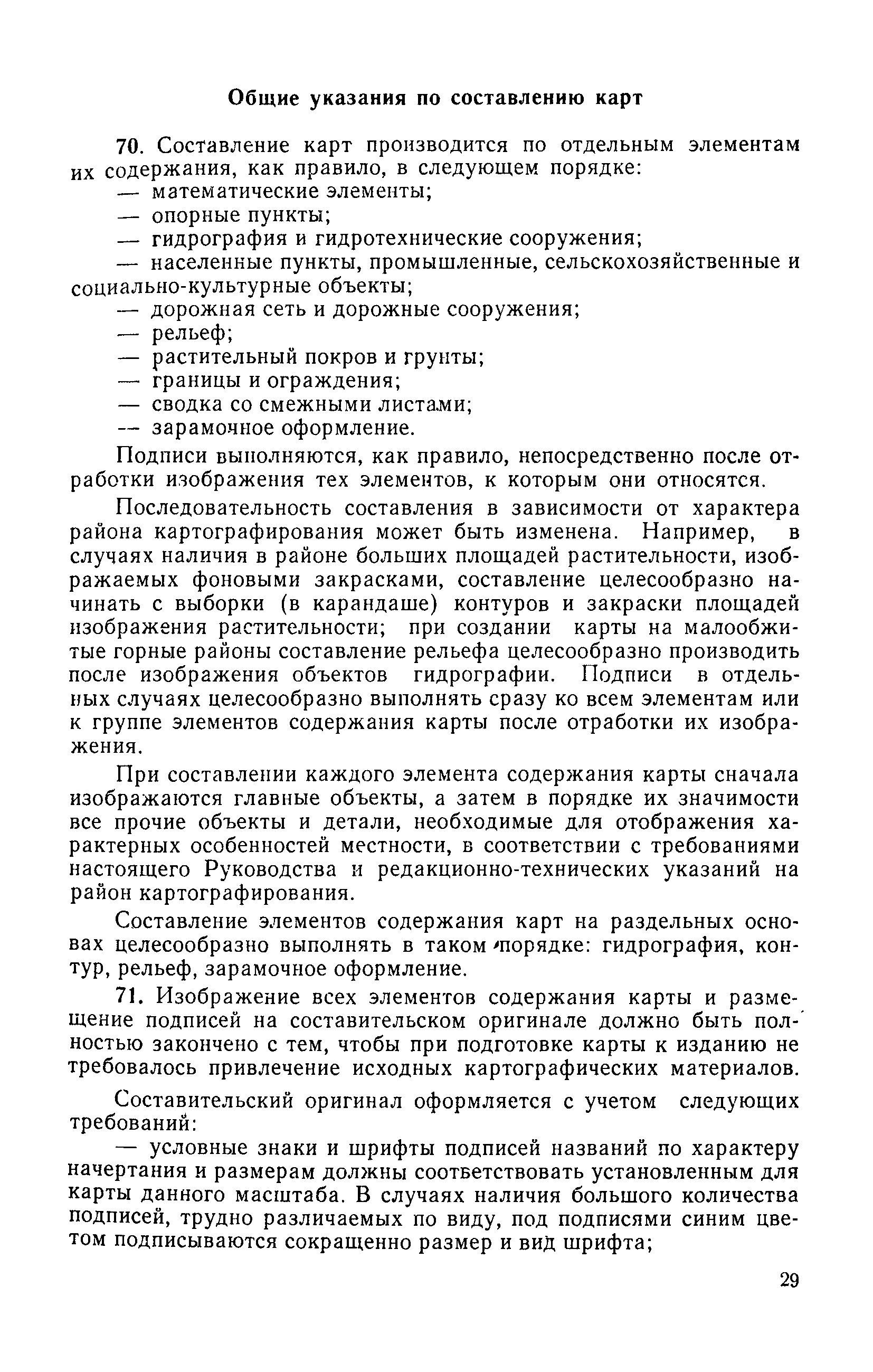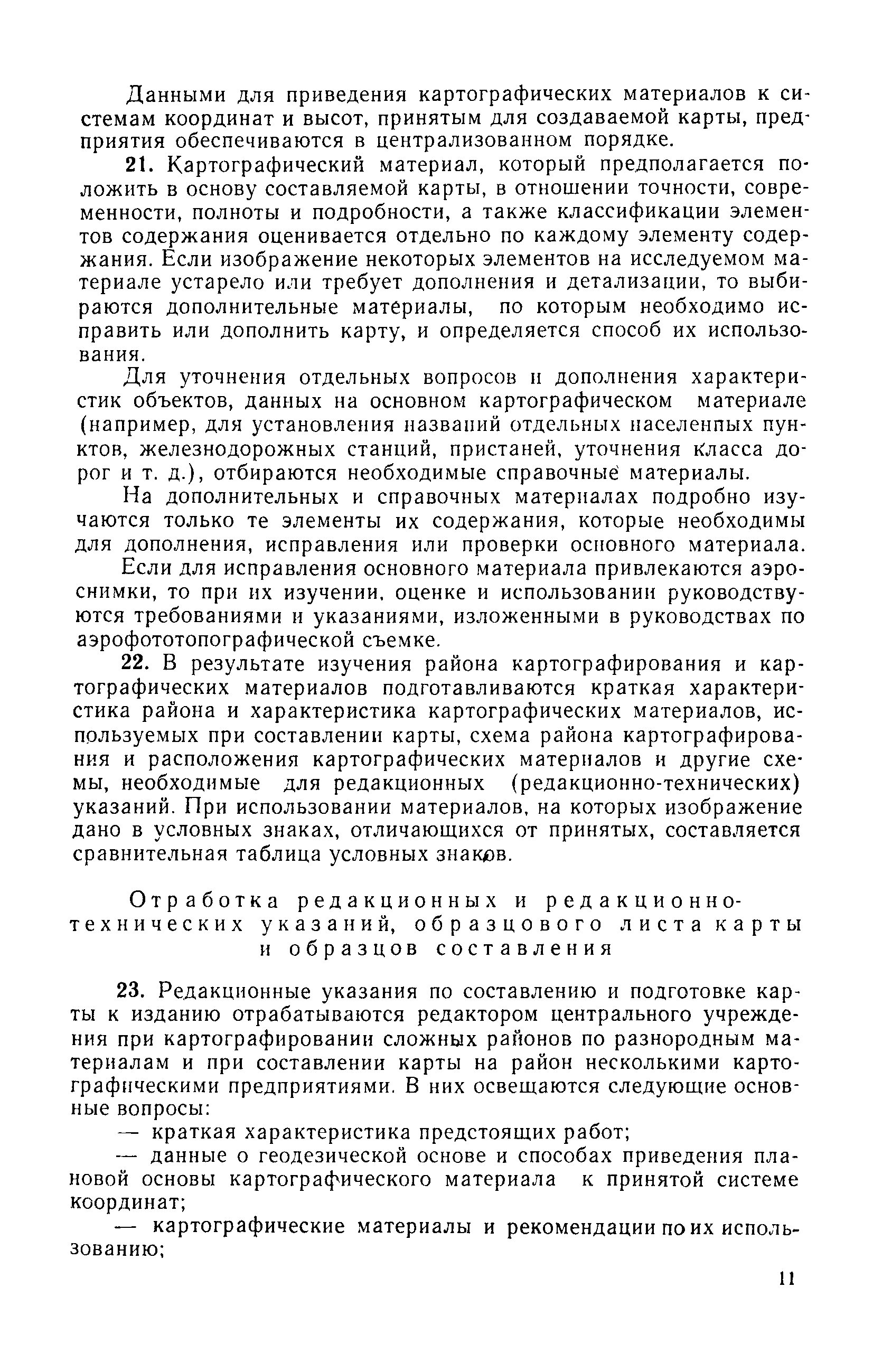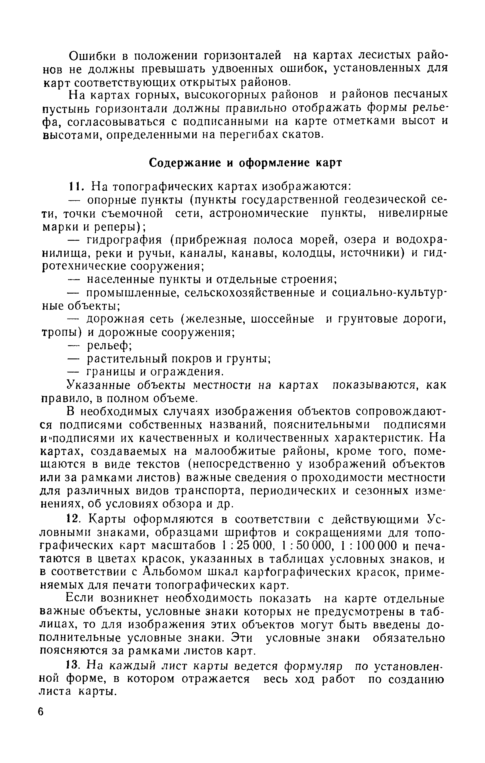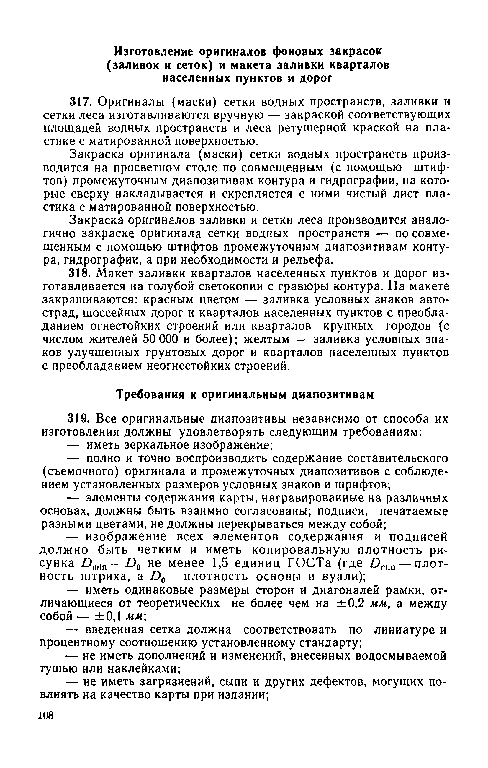 | Оглавление: | Глава 1. Общие положения Назначение топографических карт масштабов 1: 25000, 1: 50000, 1:100000 и основные требования к ним Проекция, разграфка и номенклатуры листов топографических карт Геодезическая основа карт. Точность карт Содержание и оформление карт Глава II. Редактирование карт Цель и содержание редакционных работ Редакционно-подготовительные работы Содержание редакционно-подготовительных работ Сбор картографических материалов Изучение района картографирования и картографических материалов Отработка редакционных и редакционно-технических указаний, образцового листа карты и образцов составления Подготовка исполнителей к выполнению работ Редактирование в процессе составления, подготовки к изданию и издания карт Проверка и приемка законченных видов работ и готовой продукции Использование материалов, поступивших в процессе создания карт Согласование составляемых карт с топографическими и морскими навигационными картами Глава III. Способы составления карт. Общие указания по составлению Способы составления карт Подготовка картографических материалов к использованию Подготовка картографической основы Общие указания по составлению карт Общие требования к подписям Установление написания названий Размещение подписей на картах Глава IV. Составление элементов содержания карт Математические элементы карт Опорные пункты Изображение ориентиров Гидрография и гидротехнические сооружения Прибрежная полоса морей; озера, водохранилища, острова Реки и каналы Рельеф дна морей, крупных озер, водохранилищ и рек. Отметки уровней воды Водопроводы, колодцы, источники Гидротехнические сооружения Подписи названий объектов гидрографии Населенные пункты Классификация населенных пунктов Изображение населенных пунктов Подписи названий населенных пунктов Промышленные, сельскохозяйственные и социально-культурные объекты Дорожная сеть и дорожные сооружения Железные дороги Шоссейные и грунтовые дороги, тропы Дорожные сооружения Подписи характеристик проходимости местности и направлений дорог Рельеф Высоты сечения рельефа, требования к изображению рельефа горизонталями Изображение основных типов рельефа Отметки высот Подписи названий объектов рельефа Растительный покров и грунты Древесная растительность Кустарниковая растительность Травянистая, полукустарниковая, кустарничковая, моховая и лишайниковая растительность Искусственные насаждения Болота, солончаки, грунты Границы и ограждения Сводка составительских оригиналов Оформление рамок листов карт Выписка названий для набора подписей Глава V. Подготовка карт к изданию Способы подготовки карт к изданию Последовательность выполнения работ Порядок гравирования штриховых элементов содержания карт Изготовление оригиналов фоновых закрасок (заливок и сеток) и макета заливки кварталов населенных пунктов и дорог Требования к оригинальным диапозитивам Сводка издательских оригиналов Комплектность материалов для издания карт Глава VI. Общие указания по обновлению карт Общие положения Проверка точности обновляемой карты Определение степени устарелости карты и отработка редакционных (редакционно-технических) указаний Технология обновления оригиналов карты и подготовки ее к изданию Приложения: 1. Разграфка, номенклатуры и шифры листов топограф