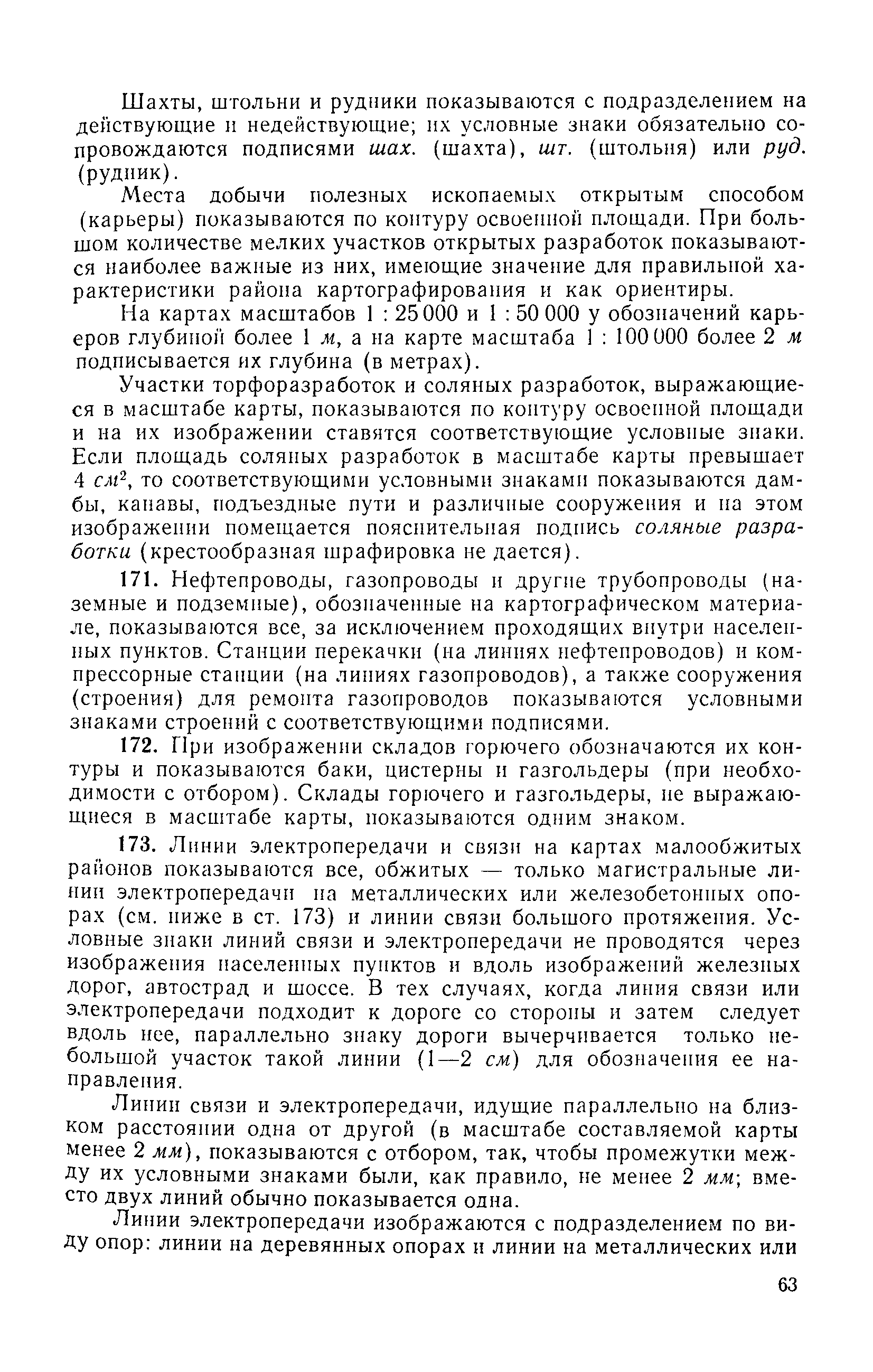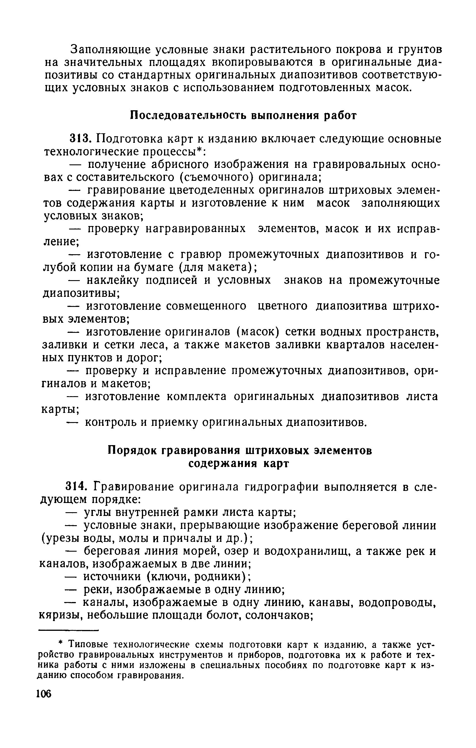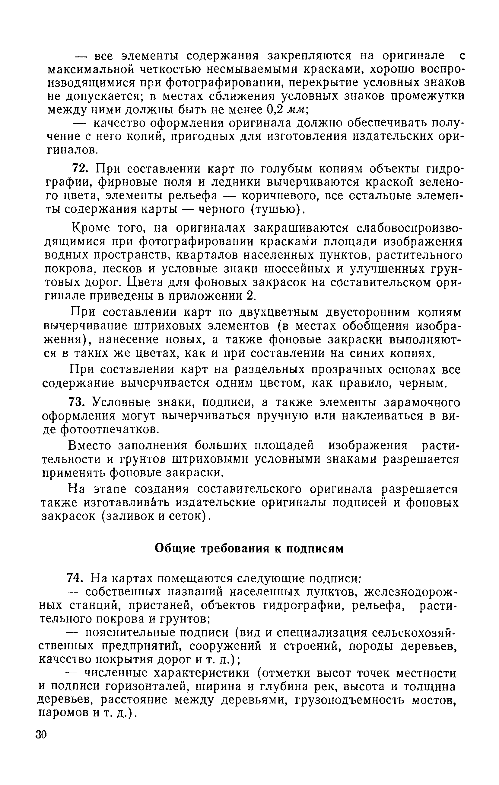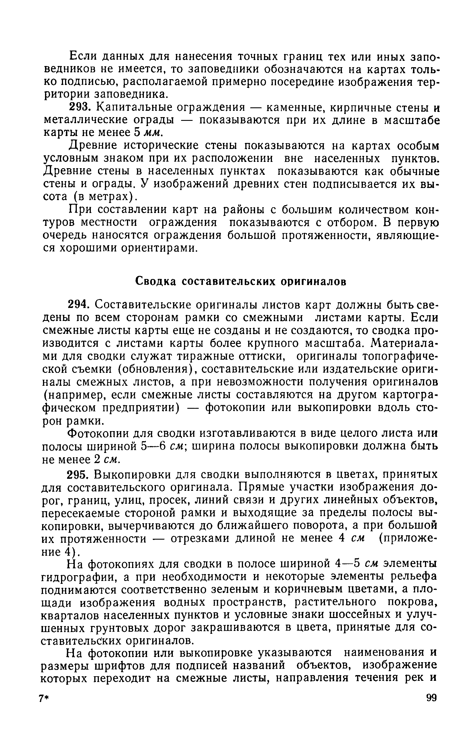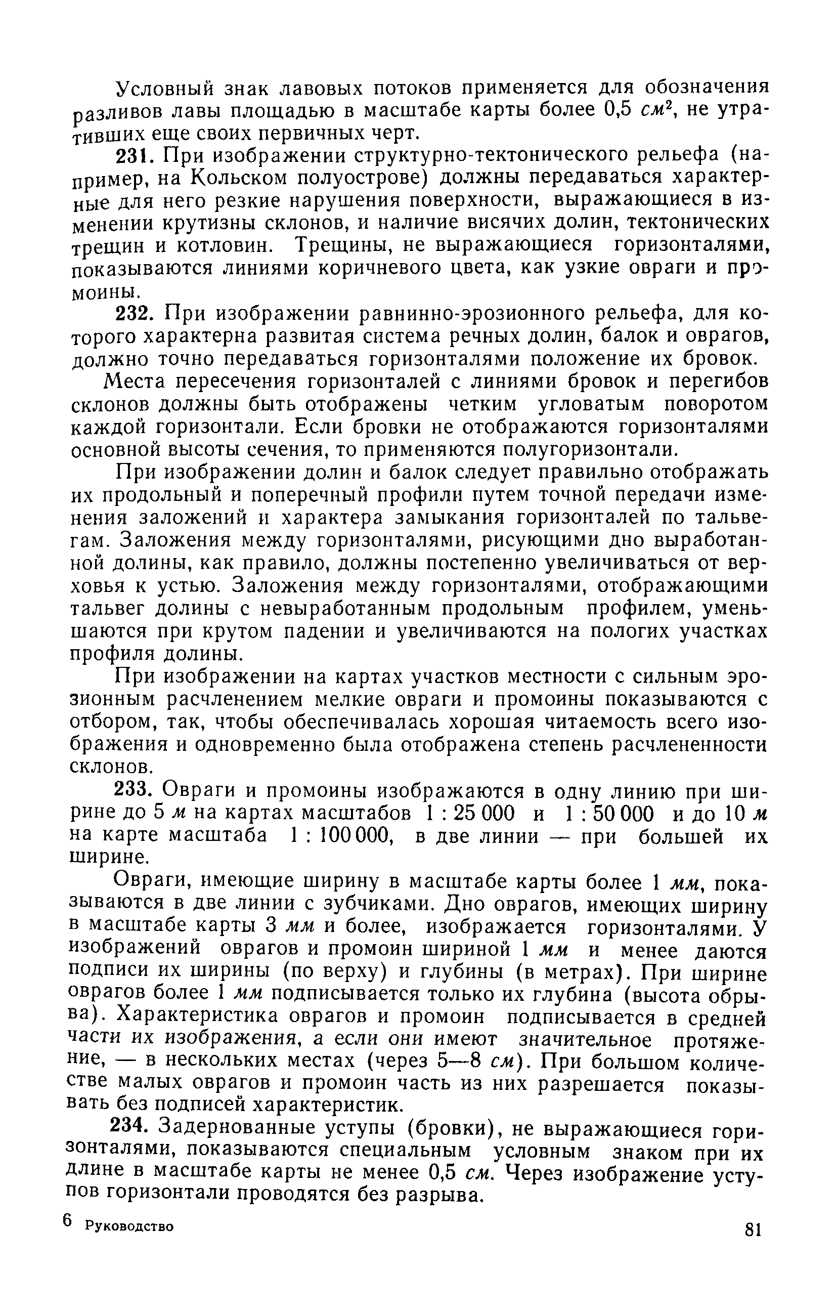| Оглавление: | Глава 1. Общие положения Назначение топографических карт масштабов 1: 25000, 1: 50000, 1:100000 и основные требования к ним Проекция, разграфка и номенклатуры листов топографических карт Геодезическая основа карт. Точность карт Содержание и оформление карт Глава II. Редактирование карт Цель и содержание редакционных работ Редакционно-подготовительные работы Содержание редакционно-подготовительных работ Сбор картографических материалов Изучение района картографирования и картографических материалов Отработка редакционных и редакционно-технических указаний, образцового листа карты и образцов составления Подготовка исполнителей к выполнению работ Редактирование в процессе составления, подготовки к изданию и издания карт Проверка и приемка законченных видов работ и готовой продукции Использование материалов, поступивших в процессе создания карт Согласование составляемых карт с топографическими и морскими навигационными картами Глава III. Способы составления карт. Общие указания по составлению Способы составления карт Подготовка картографических материалов к использованию Подготовка картографической основы Общие указания по составлению карт Общие требования к подписям Установление написания названий Размещение подписей на картах Глава IV. Составление элементов содержания карт Математические элементы карт Опорные пункты Изображение ориентиров Гидрография и гидротехнические сооружения Прибрежная полоса морей; озера, водохранилища, острова Реки и каналы Рельеф дна морей, крупных озер, водохранилищ и рек. Отметки уровней воды Водопроводы, колодцы, источники Гидротехнические сооружения Подписи названий объектов гидрографии Населенные пункты Классификация населенных пунктов Изображение населенных пунктов Подписи названий населенных пунктов Промышленные, сельскохозяйственные и социально-культурные объекты Дорожная сеть и дорожные сооружения Железные дороги Шоссейные и грунтовые дороги, тропы Дорожные сооружения Подписи характеристик проходимости местности и направлений дорог Рельеф Высоты сечения рельефа, требования к изображению рельефа горизонталями Изображение основных типов рельефа Отметки высот Подписи названий объектов рельефа Растительный покров и грунты Древесная растительность Кустарниковая растительность Травянистая, полукустарниковая, кустарничковая, моховая и лишайниковая растительность Искусственные насаждения Болота, солончаки, грунты Границы и ограждения Сводка составительских оригиналов Оформление рамок листов карт Выписка названий для набора подписей Глава V. Подготовка карт к изданию Способы подготовки карт к изданию Последовательность выполнения работ Порядок гравирования штриховых элементов содержания карт Изготовление оригиналов фоновых закрасок (заливок и сеток) и макета заливки кварталов населенных пунктов и дорог Требования к оригинальным диапозитивам Сводка издательских оригиналов Комплектность материалов для издания карт Глава VI. Общие указания по обновлению карт Общие положения Проверка точности обновляемой карты Определение степени устарелости карты и отработка редакционных (редакционно-технических) указаний Технология обновления оригиналов карты и подготовки ее к изданию Приложения: 1. Разграфка, номенклатуры и шифры листов топограф