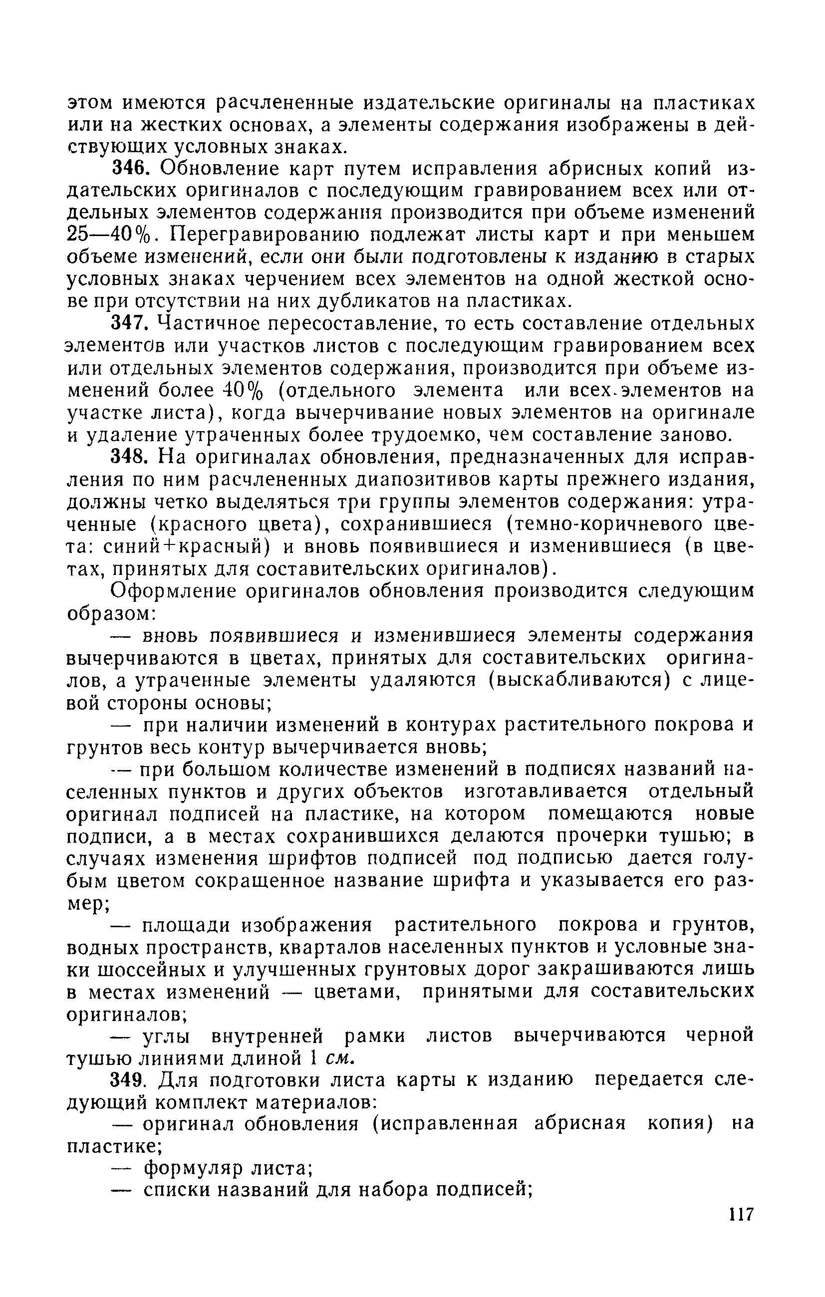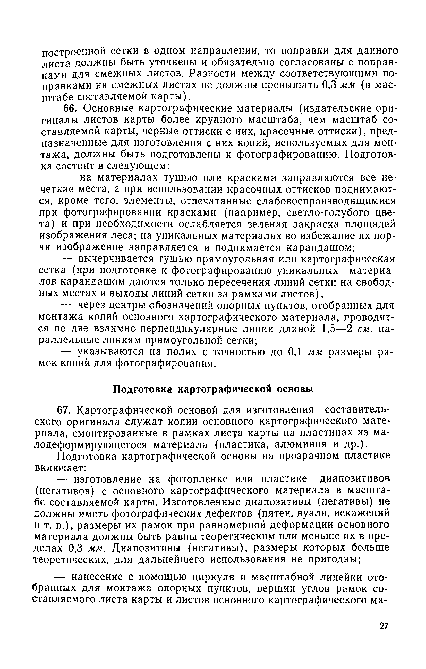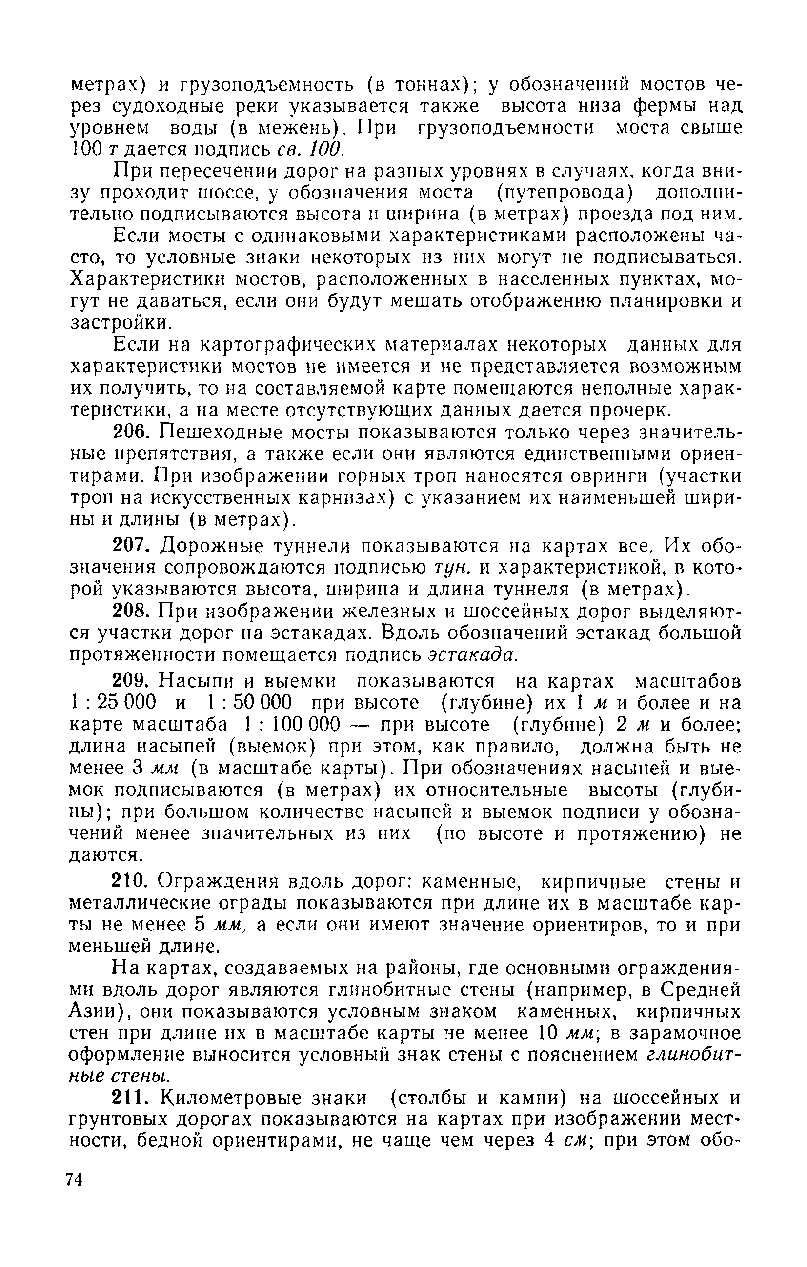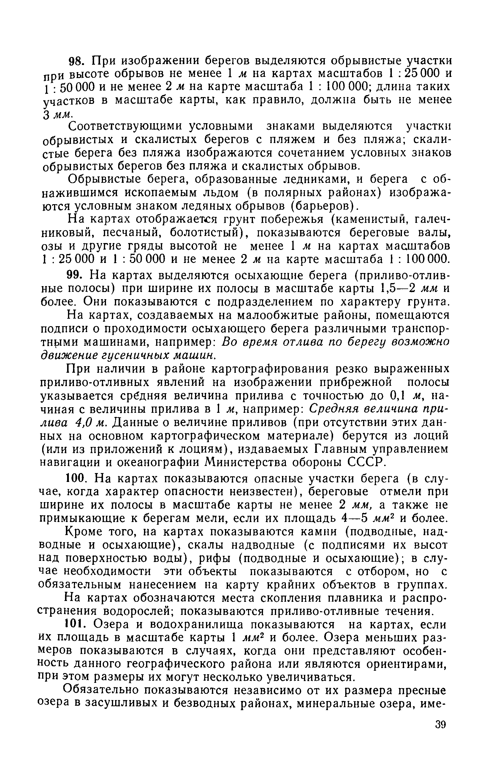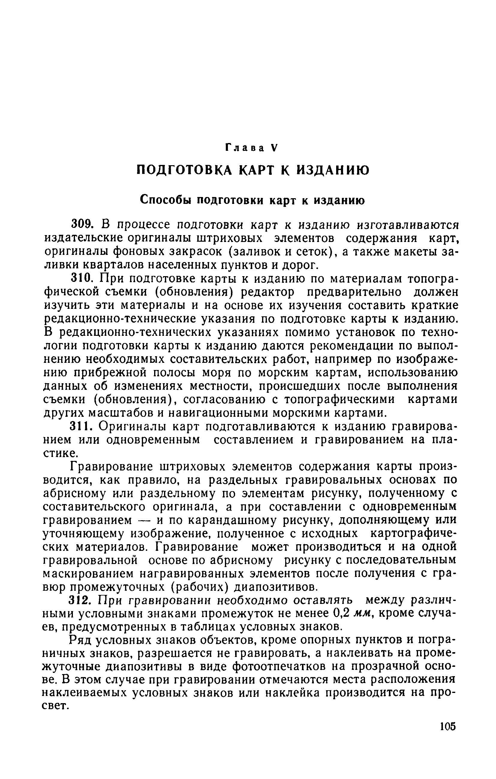 | Оглавление: | Глава 1. Общие положения Назначение топографических карт масштабов 1: 25000, 1: 50000, 1:100000 и основные требования к ним Проекция, разграфка и номенклатуры листов топографических карт Геодезическая основа карт. Точность карт Содержание и оформление карт Глава II. Редактирование карт Цель и содержание редакционных работ Редакционно-подготовительные работы Содержание редакционно-подготовительных работ Сбор картографических материалов Изучение района картографирования и картографических материалов Отработка редакционных и редакционно-технических указаний, образцового листа карты и образцов составления Подготовка исполнителей к выполнению работ Редактирование в процессе составления, подготовки к изданию и издания карт Проверка и приемка законченных видов работ и готовой продукции Использование материалов, поступивших в процессе создания карт Согласование составляемых карт с топографическими и морскими навигационными картами Глава III. Способы составления карт. Общие указания по составлению Способы составления карт Подготовка картографических материалов к использованию Подготовка картографической основы Общие указания по составлению карт Общие требования к подписям Установление написания названий Размещение подписей на картах Глава IV. Составление элементов содержания карт Математические элементы карт Опорные пункты Изображение ориентиров Гидрография и гидротехнические сооружения Прибрежная полоса морей; озера, водохранилища, острова Реки и каналы Рельеф дна морей, крупных озер, водохранилищ и рек. Отметки уровней воды Водопроводы, колодцы, источники Гидротехнические сооружения Подписи названий объектов гидрографии Населенные пункты Классификация населенных пунктов Изображение населенных пунктов Подписи названий населенных пунктов Промышленные, сельскохозяйственные и социально-культурные объекты Дорожная сеть и дорожные сооружения Железные дороги Шоссейные и грунтовые дороги, тропы Дорожные сооружения Подписи характеристик проходимости местности и направлений дорог Рельеф Высоты сечения рельефа, требования к изображению рельефа горизонталями Изображение основных типов рельефа Отметки высот Подписи названий объектов рельефа Растительный покров и грунты Древесная растительность Кустарниковая растительность Травянистая, полукустарниковая, кустарничковая, моховая и лишайниковая растительность Искусственные насаждения Болота, солончаки, грунты Границы и ограждения Сводка составительских оригиналов Оформление рамок листов карт Выписка названий для набора подписей Глава V. Подготовка карт к изданию Способы подготовки карт к изданию Последовательность выполнения работ Порядок гравирования штриховых элементов содержания карт Изготовление оригиналов фоновых закрасок (заливок и сеток) и макета заливки кварталов населенных пунктов и дорог Требования к оригинальным диапозитивам Сводка издательских оригиналов Комплектность материалов для издания карт Глава VI. Общие указания по обновлению карт Общие положения Проверка точности обновляемой карты Определение степени устарелости карты и отработка редакционных (редакционно-технических) указаний Технология обновления оригиналов карты и подготовки ее к изданию Приложения: 1. Разграфка, номенклатуры и шифры листов топограф