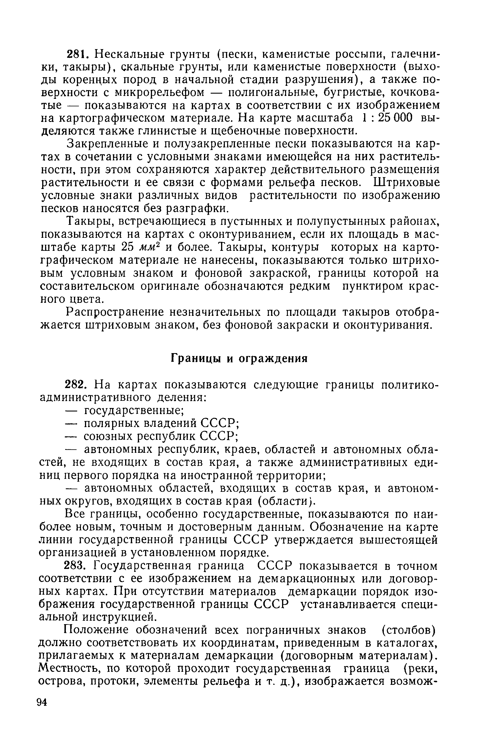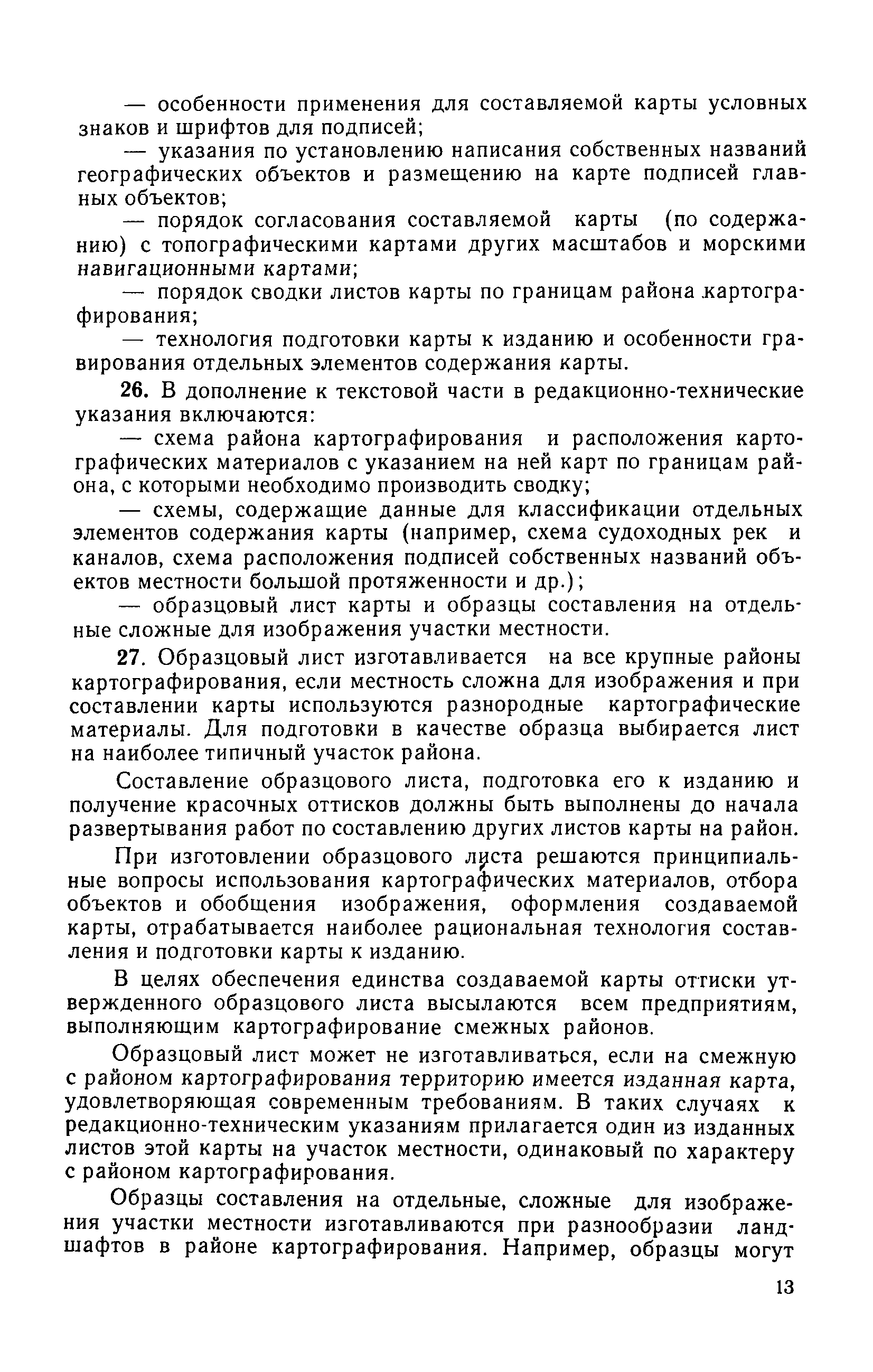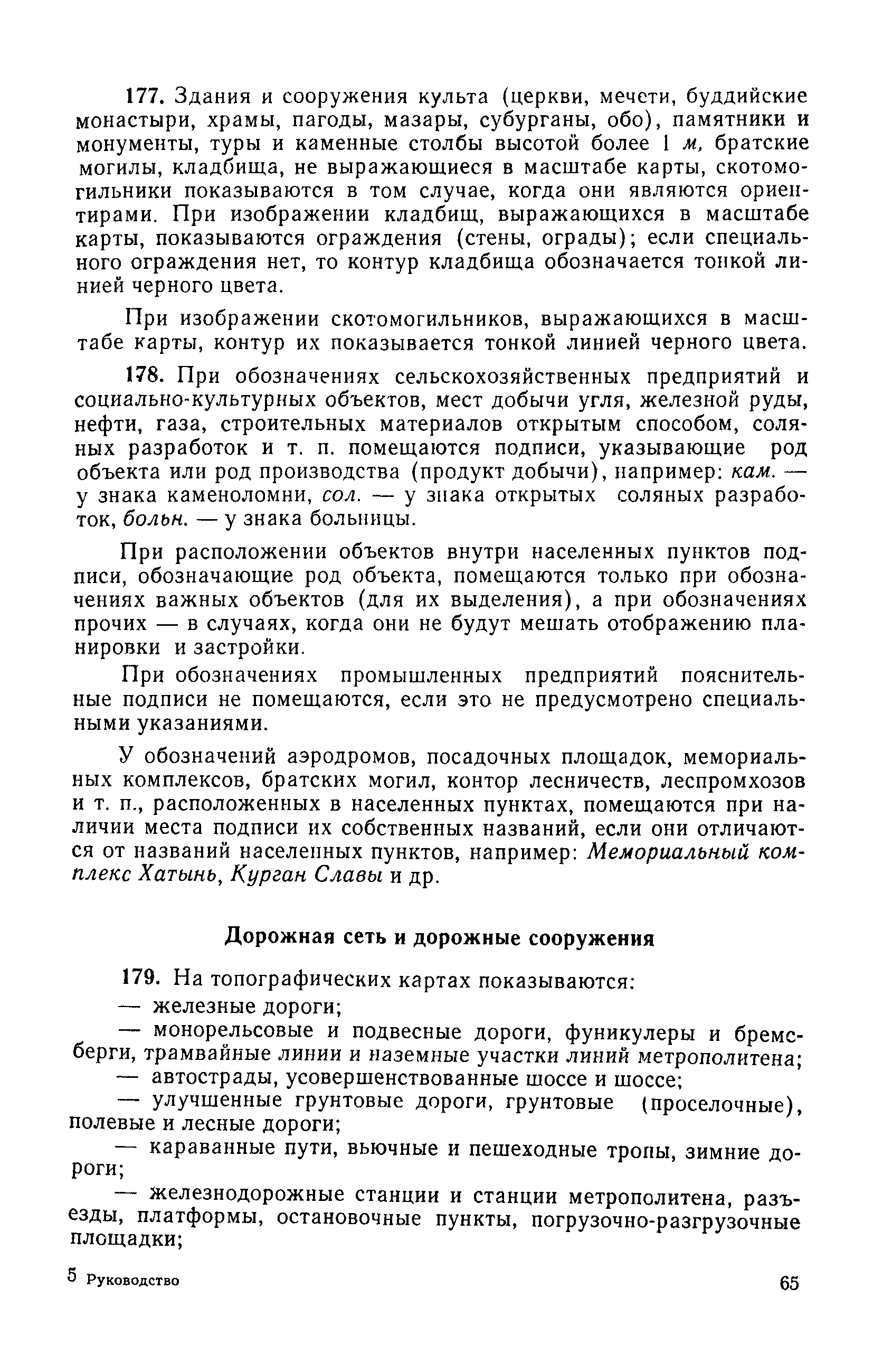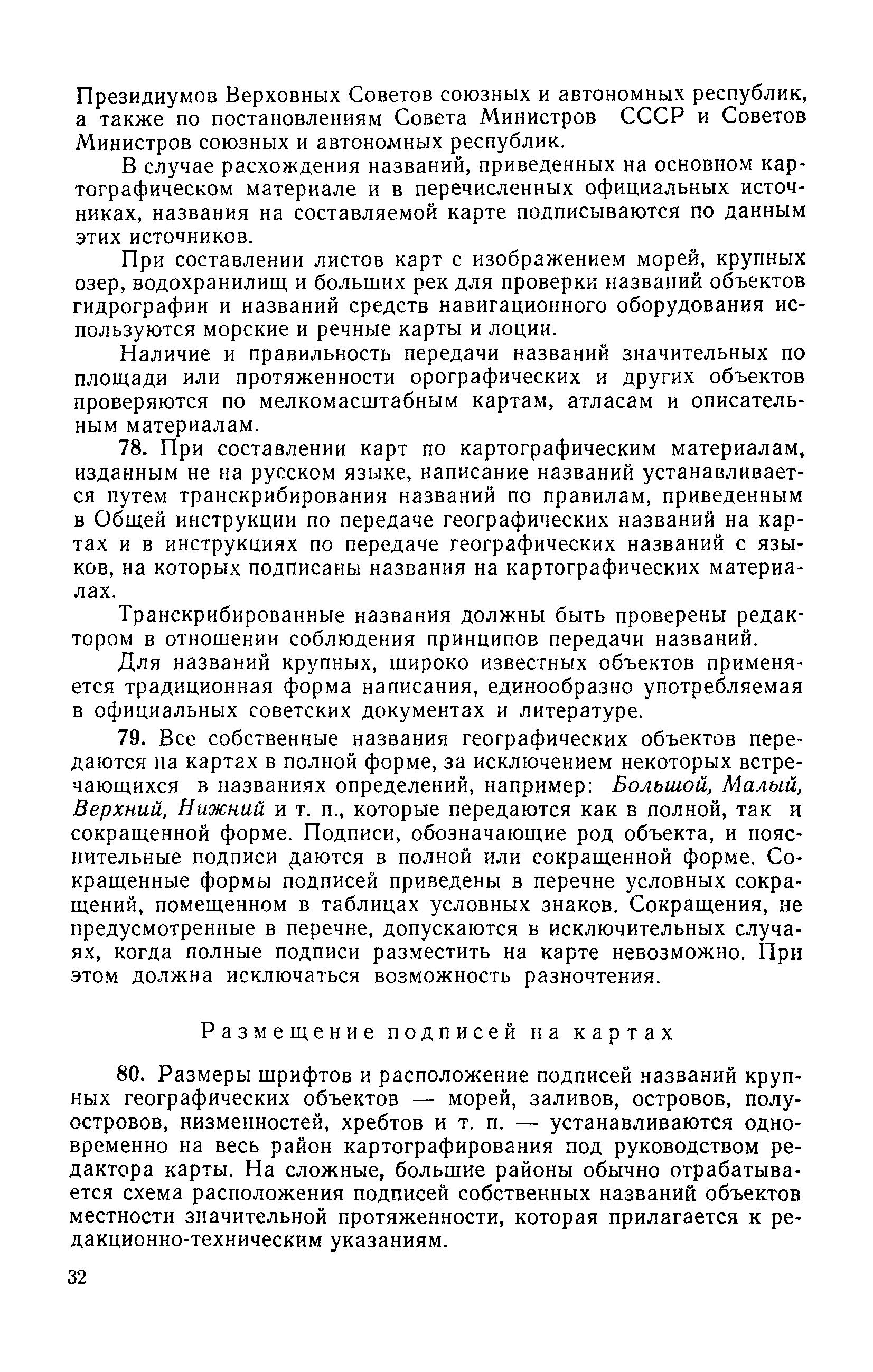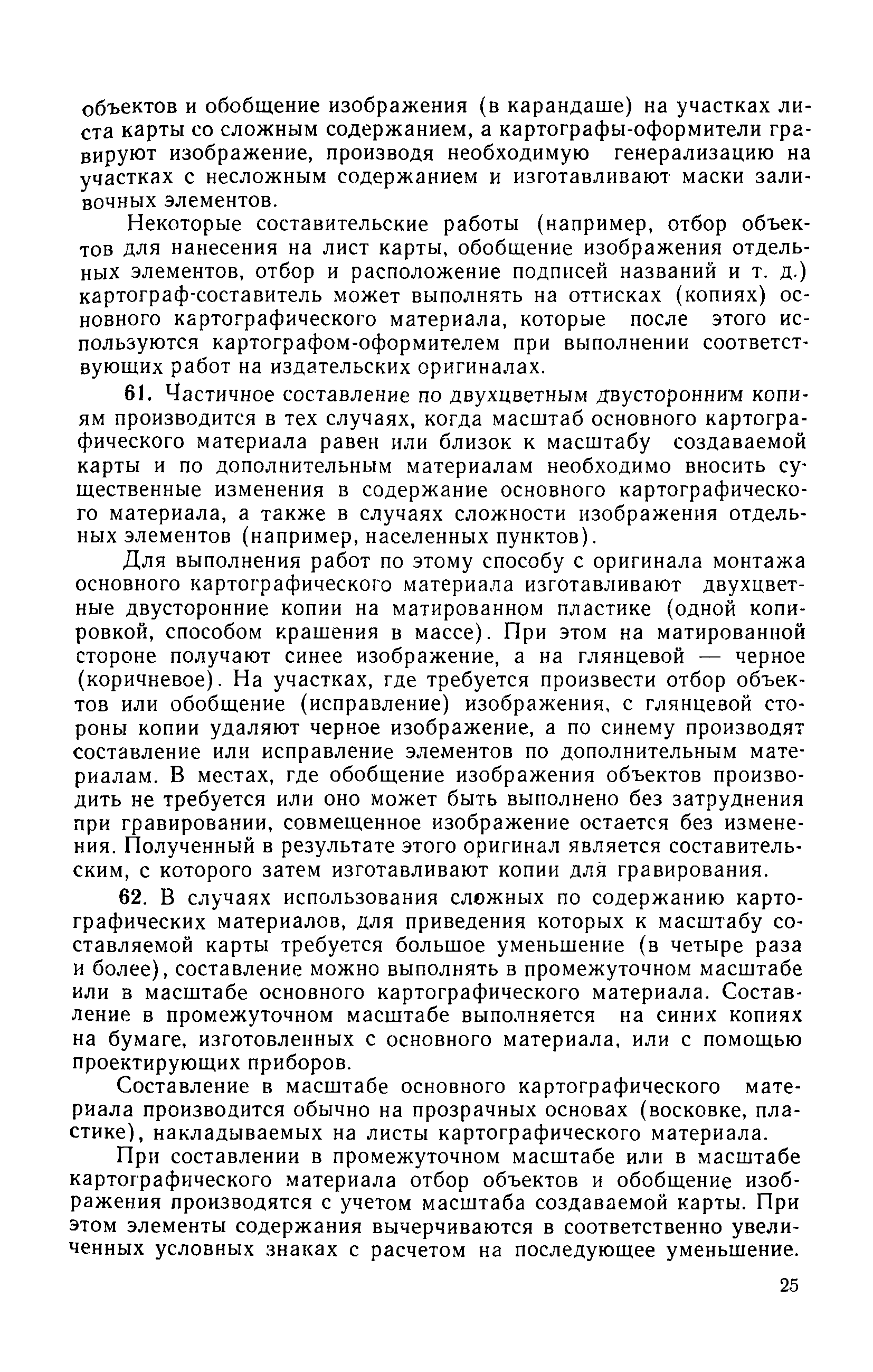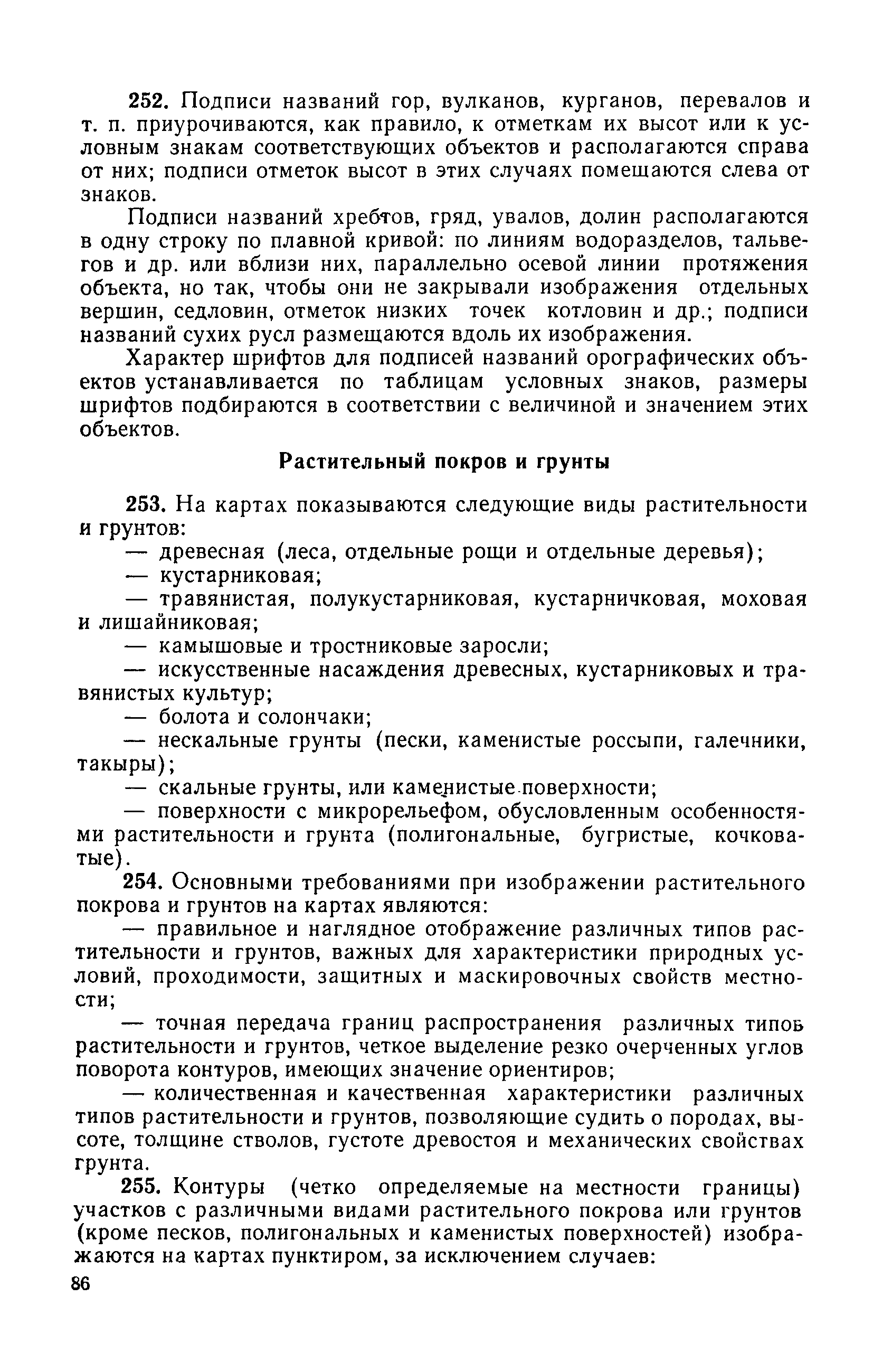 | Оглавление: | Глава 1. Общие положения Назначение топографических карт масштабов 1: 25000, 1: 50000, 1:100000 и основные требования к ним Проекция, разграфка и номенклатуры листов топографических карт Геодезическая основа карт. Точность карт Содержание и оформление карт Глава II. Редактирование карт Цель и содержание редакционных работ Редакционно-подготовительные работы Содержание редакционно-подготовительных работ Сбор картографических материалов Изучение района картографирования и картографических материалов Отработка редакционных и редакционно-технических указаний, образцового листа карты и образцов составления Подготовка исполнителей к выполнению работ Редактирование в процессе составления, подготовки к изданию и издания карт Проверка и приемка законченных видов работ и готовой продукции Использование материалов, поступивших в процессе создания карт Согласование составляемых карт с топографическими и морскими навигационными картами Глава III. Способы составления карт. Общие указания по составлению Способы составления карт Подготовка картографических материалов к использованию Подготовка картографической основы Общие указания по составлению карт Общие требования к подписям Установление написания названий Размещение подписей на картах Глава IV. Составление элементов содержания карт Математические элементы карт Опорные пункты Изображение ориентиров Гидрография и гидротехнические сооружения Прибрежная полоса морей; озера, водохранилища, острова Реки и каналы Рельеф дна морей, крупных озер, водохранилищ и рек. Отметки уровней воды Водопроводы, колодцы, источники Гидротехнические сооружения Подписи названий объектов гидрографии Населенные пункты Классификация населенных пунктов Изображение населенных пунктов Подписи названий населенных пунктов Промышленные, сельскохозяйственные и социально-культурные объекты Дорожная сеть и дорожные сооружения Железные дороги Шоссейные и грунтовые дороги, тропы Дорожные сооружения Подписи характеристик проходимости местности и направлений дорог Рельеф Высоты сечения рельефа, требования к изображению рельефа горизонталями Изображение основных типов рельефа Отметки высот Подписи названий объектов рельефа Растительный покров и грунты Древесная растительность Кустарниковая растительность Травянистая, полукустарниковая, кустарничковая, моховая и лишайниковая растительность Искусственные насаждения Болота, солончаки, грунты Границы и ограждения Сводка составительских оригиналов Оформление рамок листов карт Выписка названий для набора подписей Глава V. Подготовка карт к изданию Способы подготовки карт к изданию Последовательность выполнения работ Порядок гравирования штриховых элементов содержания карт Изготовление оригиналов фоновых закрасок (заливок и сеток) и макета заливки кварталов населенных пунктов и дорог Требования к оригинальным диапозитивам Сводка издательских оригиналов Комплектность материалов для издания карт Глава VI. Общие указания по обновлению карт Общие положения Проверка точности обновляемой карты Определение степени устарелости карты и отработка редакционных (редакционно-технических) указаний Технология обновления оригиналов карты и подготовки ее к изданию Приложения: 1. Разграфка, номенклатуры и шифры листов топограф