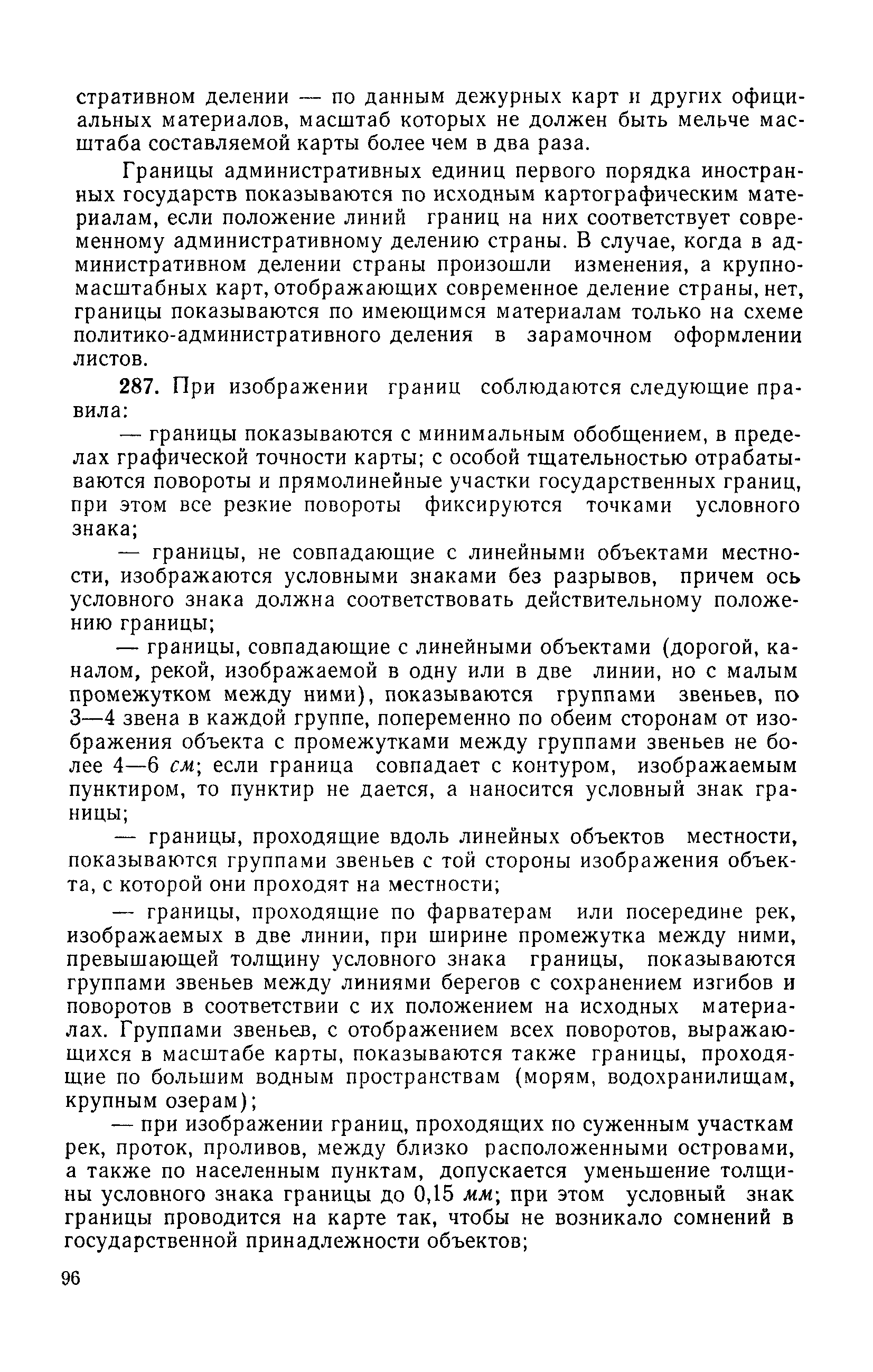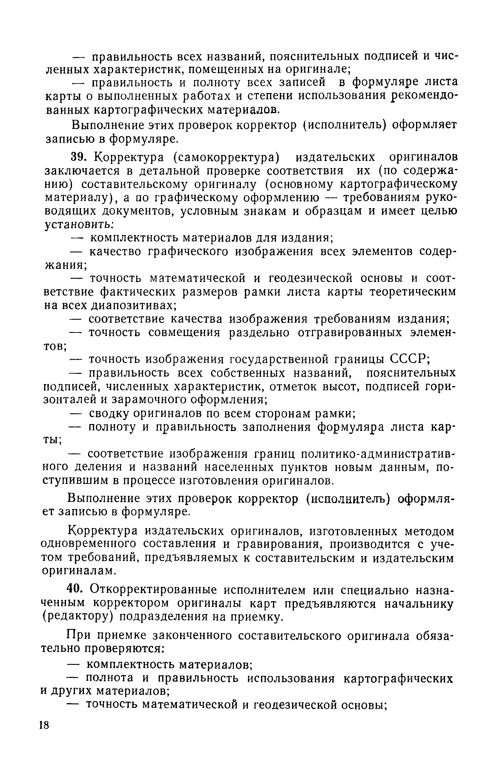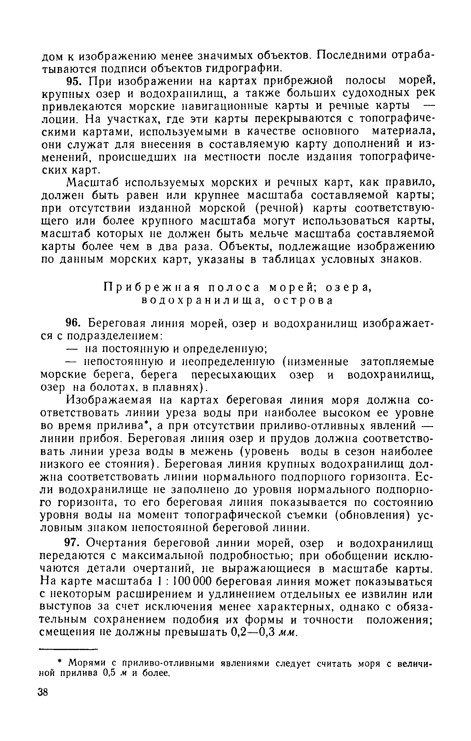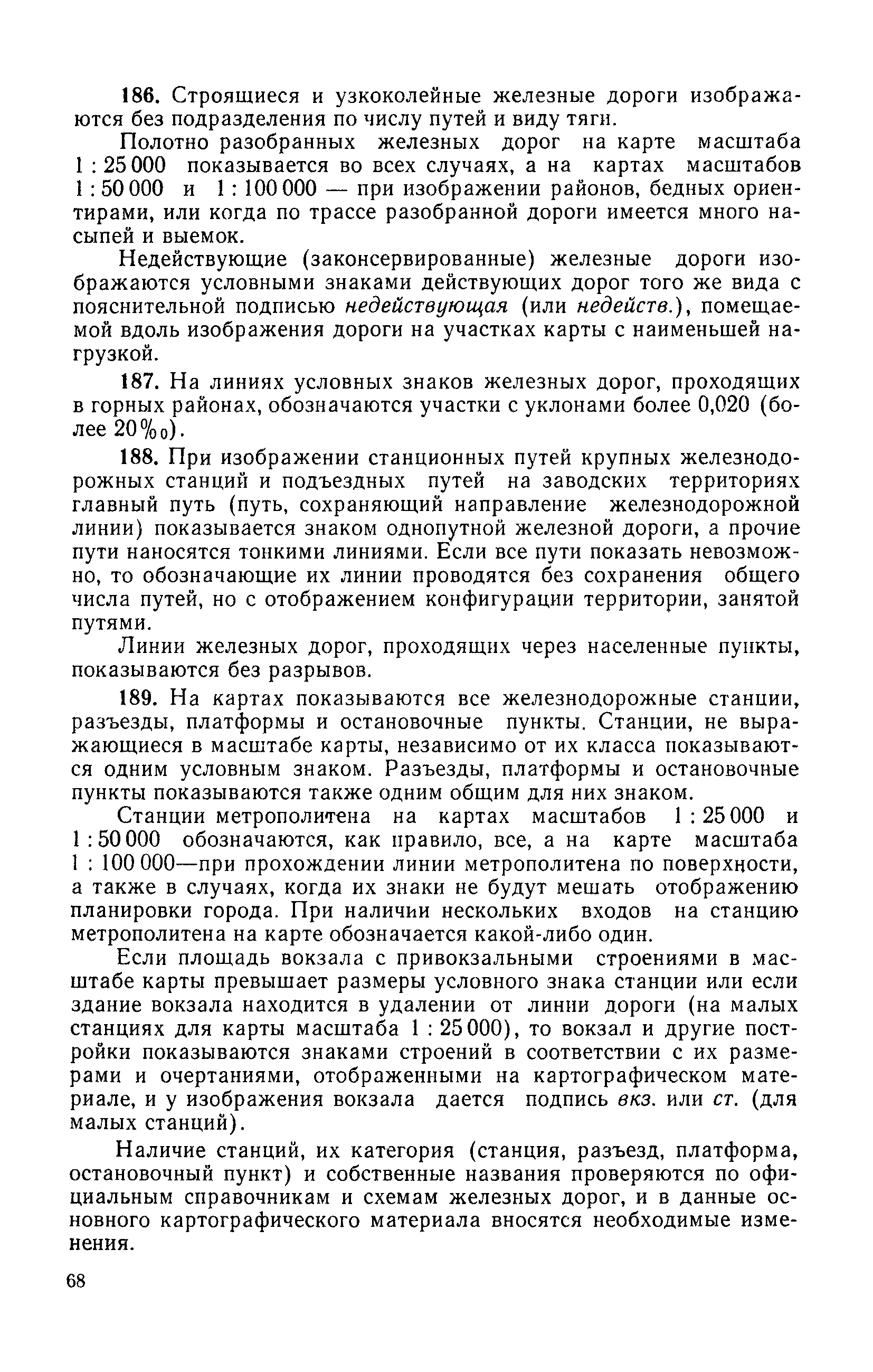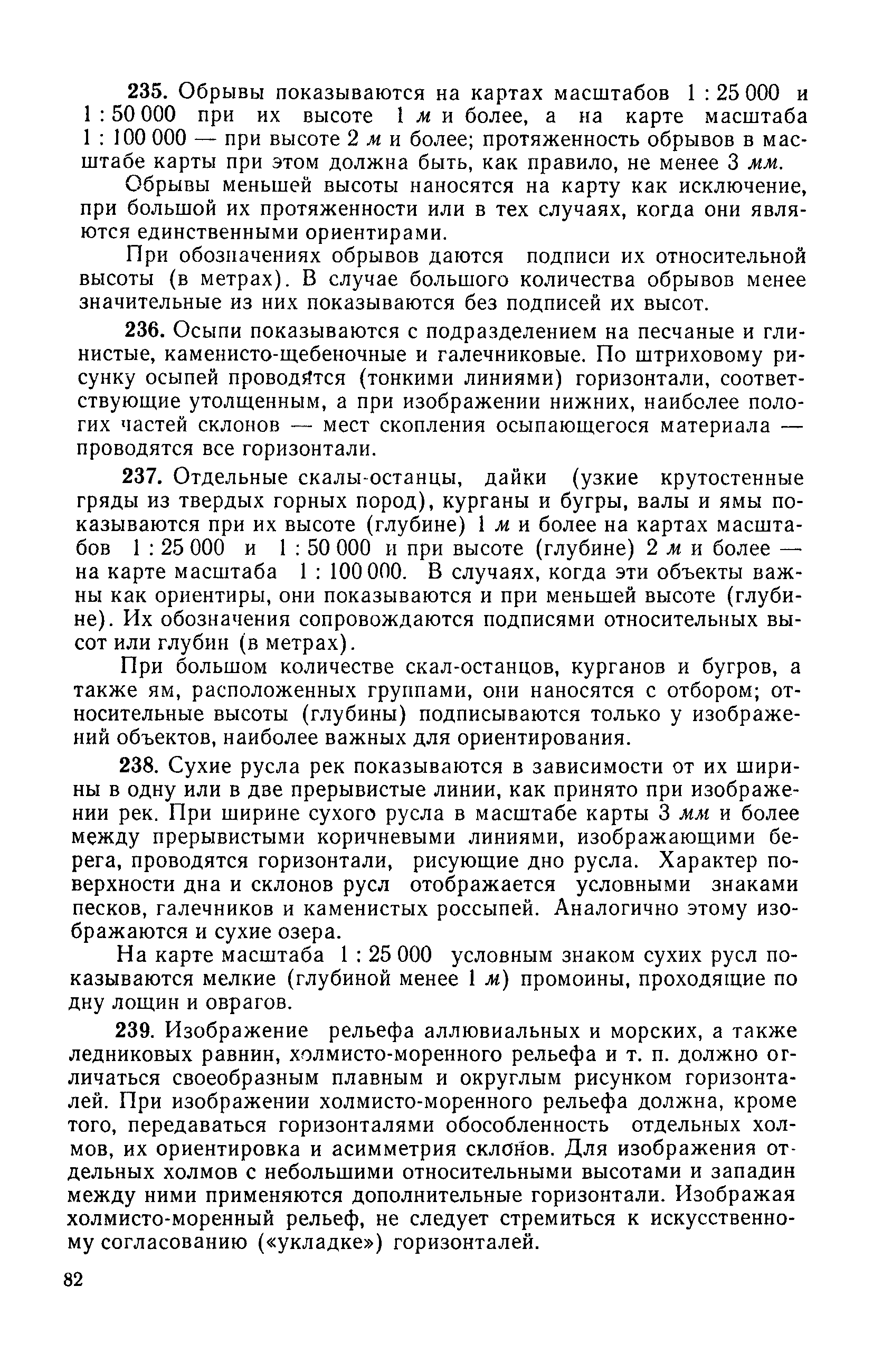 | Оглавление: | Глава 1. Общие положения Назначение топографических карт масштабов 1: 25000, 1: 50000, 1:100000 и основные требования к ним Проекция, разграфка и номенклатуры листов топографических карт Геодезическая основа карт. Точность карт Содержание и оформление карт Глава II. Редактирование карт Цель и содержание редакционных работ Редакционно-подготовительные работы Содержание редакционно-подготовительных работ Сбор картографических материалов Изучение района картографирования и картографических материалов Отработка редакционных и редакционно-технических указаний, образцового листа карты и образцов составления Подготовка исполнителей к выполнению работ Редактирование в процессе составления, подготовки к изданию и издания карт Проверка и приемка законченных видов работ и готовой продукции Использование материалов, поступивших в процессе создания карт Согласование составляемых карт с топографическими и морскими навигационными картами Глава III. Способы составления карт. Общие указания по составлению Способы составления карт Подготовка картографических материалов к использованию Подготовка картографической основы Общие указания по составлению карт Общие требования к подписям Установление написания названий Размещение подписей на картах Глава IV. Составление элементов содержания карт Математические элементы карт Опорные пункты Изображение ориентиров Гидрография и гидротехнические сооружения Прибрежная полоса морей; озера, водохранилища, острова Реки и каналы Рельеф дна морей, крупных озер, водохранилищ и рек. Отметки уровней воды Водопроводы, колодцы, источники Гидротехнические сооружения Подписи названий объектов гидрографии Населенные пункты Классификация населенных пунктов Изображение населенных пунктов Подписи названий населенных пунктов Промышленные, сельскохозяйственные и социально-культурные объекты Дорожная сеть и дорожные сооружения Железные дороги Шоссейные и грунтовые дороги, тропы Дорожные сооружения Подписи характеристик проходимости местности и направлений дорог Рельеф Высоты сечения рельефа, требования к изображению рельефа горизонталями Изображение основных типов рельефа Отметки высот Подписи названий объектов рельефа Растительный покров и грунты Древесная растительность Кустарниковая растительность Травянистая, полукустарниковая, кустарничковая, моховая и лишайниковая растительность Искусственные насаждения Болота, солончаки, грунты Границы и ограждения Сводка составительских оригиналов Оформление рамок листов карт Выписка названий для набора подписей Глава V. Подготовка карт к изданию Способы подготовки карт к изданию Последовательность выполнения работ Порядок гравирования штриховых элементов содержания карт Изготовление оригиналов фоновых закрасок (заливок и сеток) и макета заливки кварталов населенных пунктов и дорог Требования к оригинальным диапозитивам Сводка издательских оригиналов Комплектность материалов для издания карт Глава VI. Общие указания по обновлению карт Общие положения Проверка точности обновляемой карты Определение степени устарелости карты и отработка редакционных (редакционно-технических) указаний Технология обновления оригиналов карты и подготовки ее к изданию Приложения: 1. Разграфка, номенклатуры и шифры листов топограф