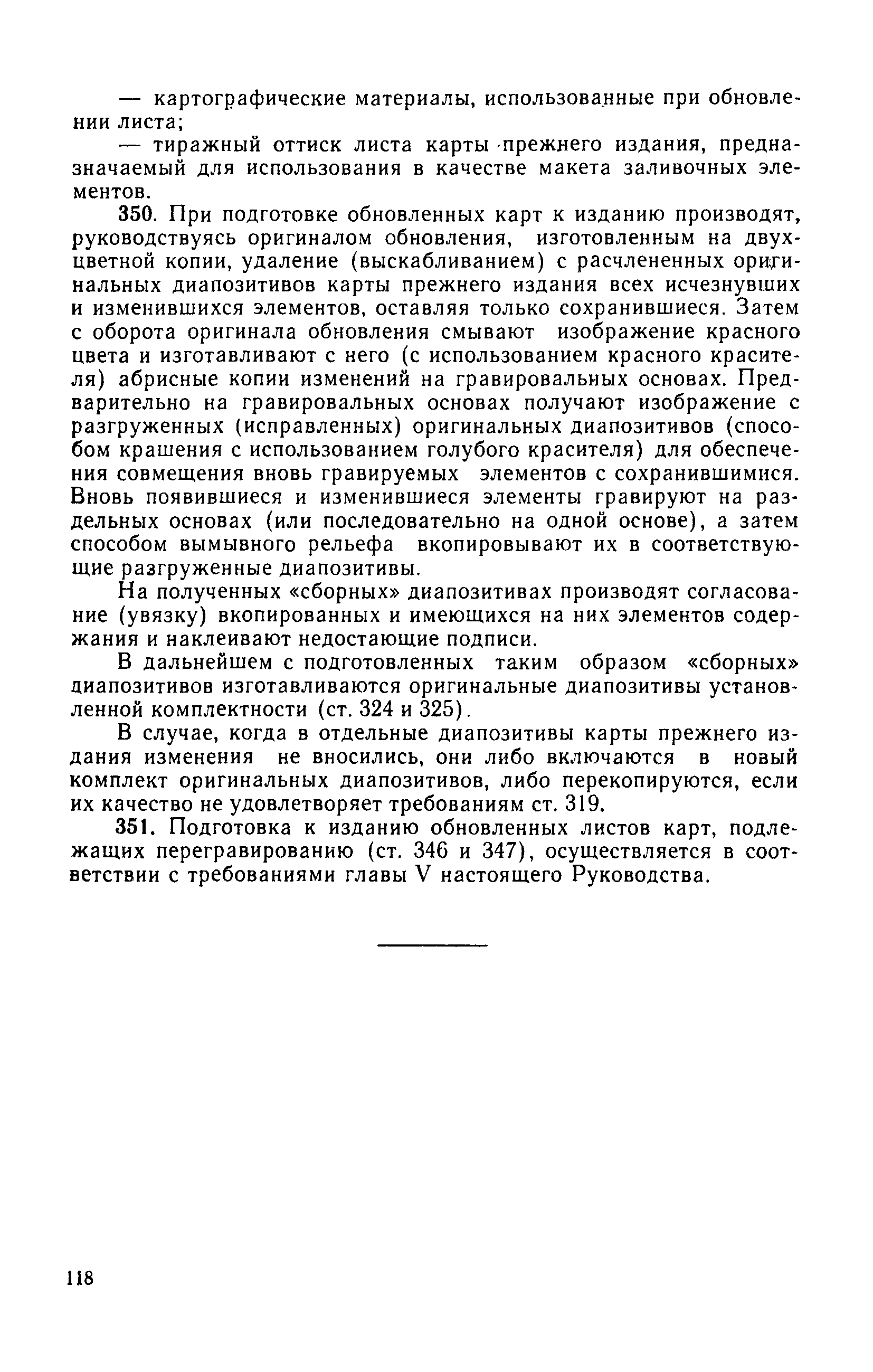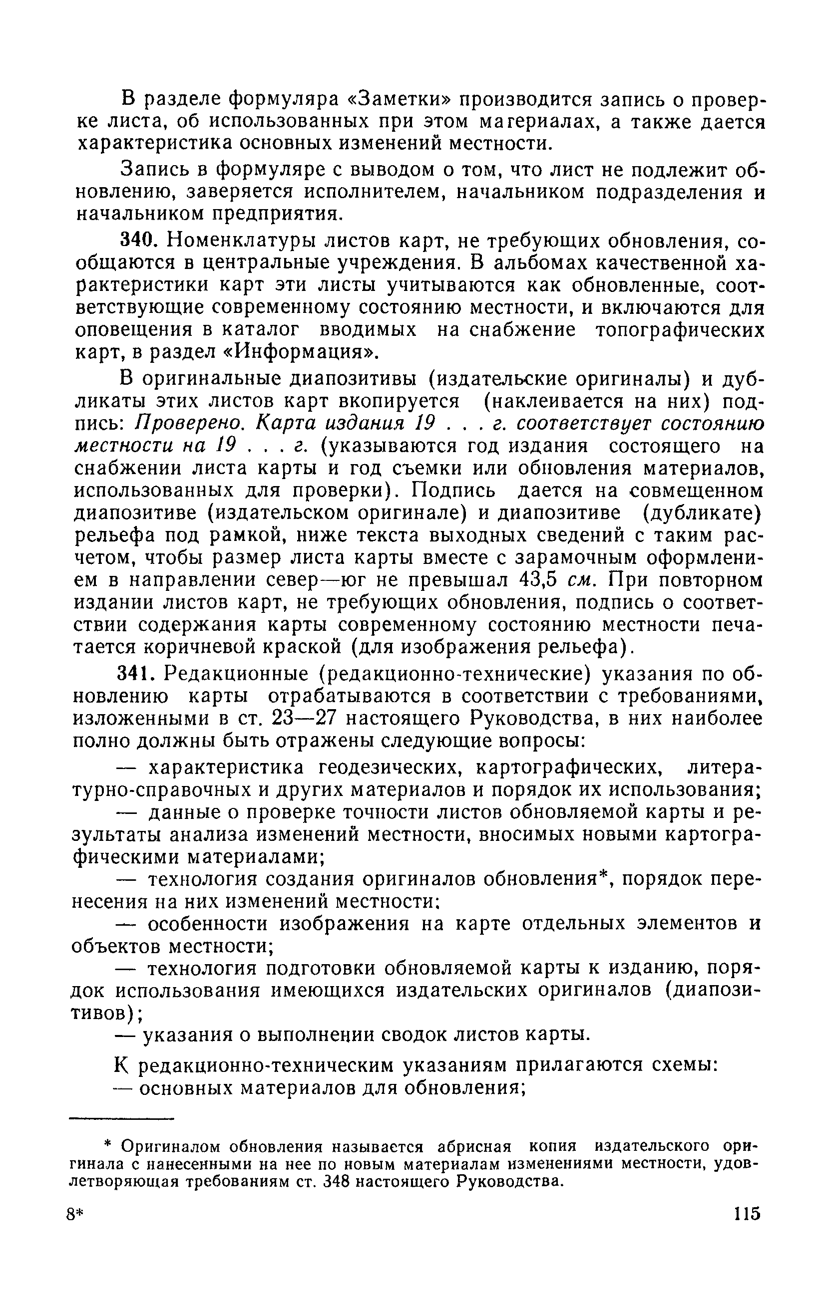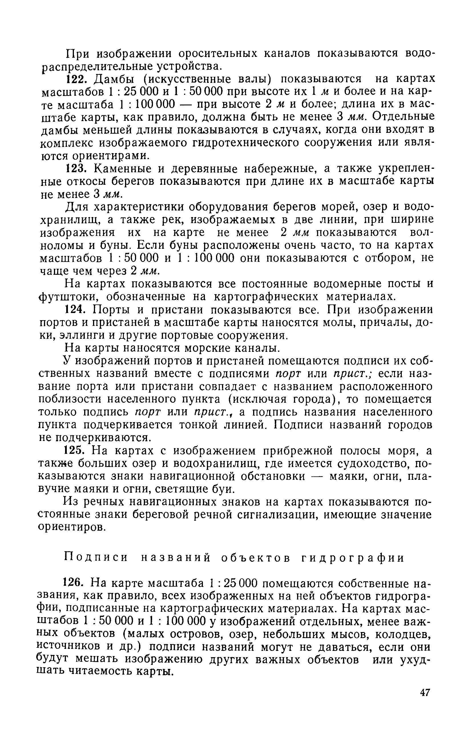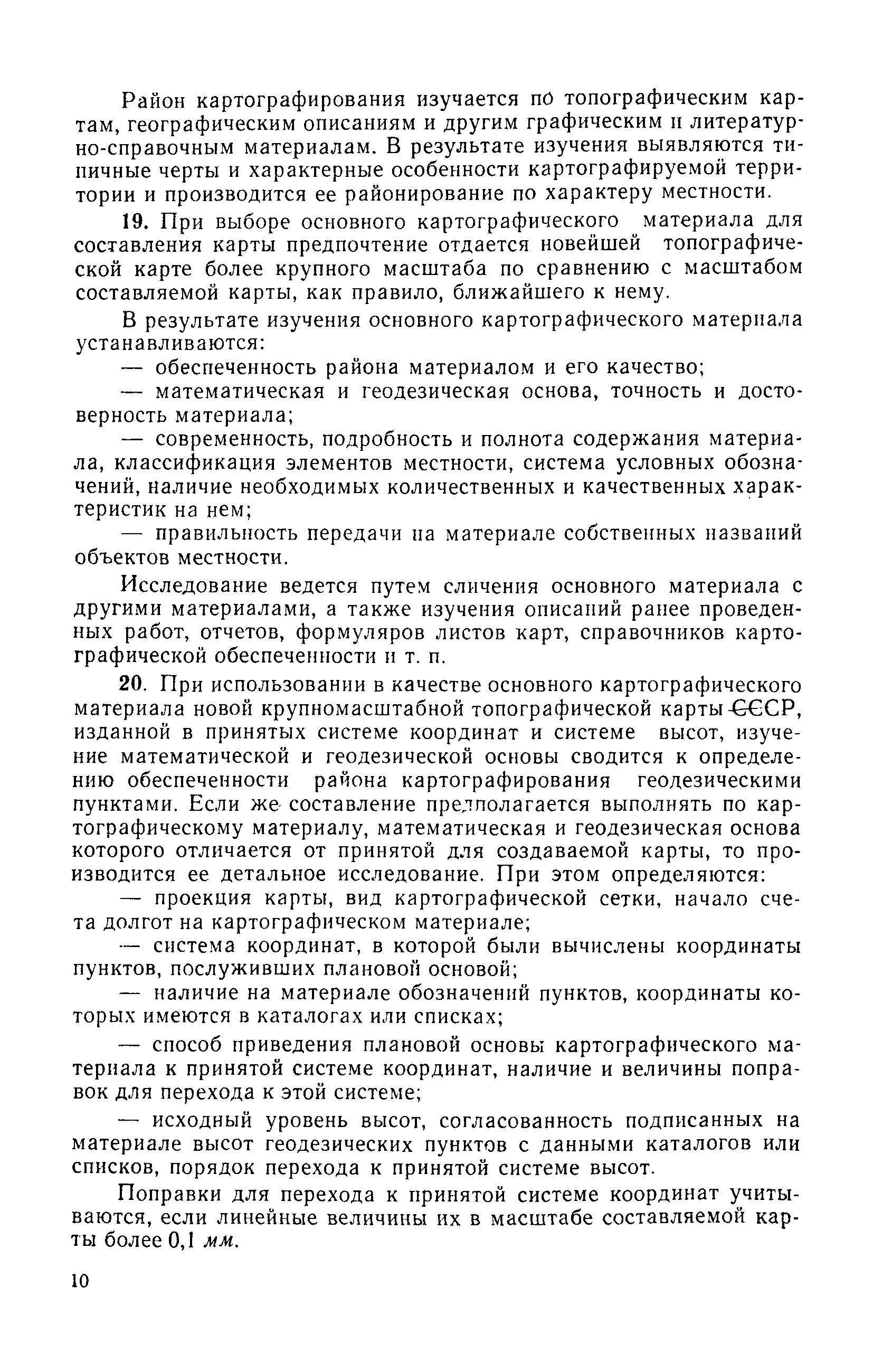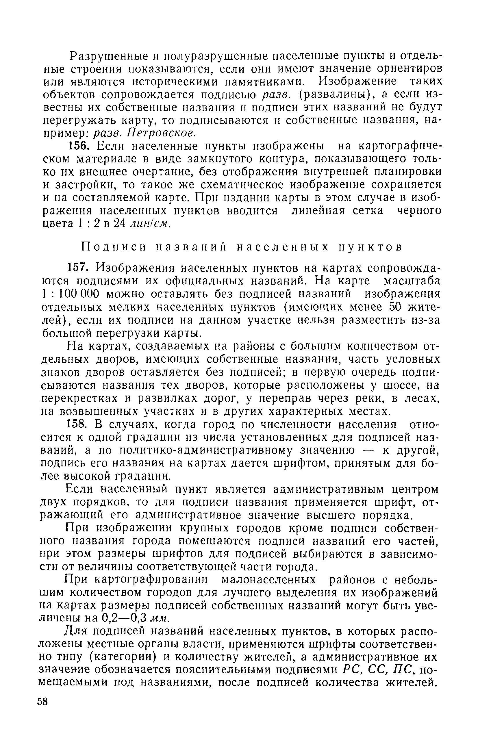 | Оглавление: | Глава 1. Общие положения Назначение топографических карт масштабов 1: 25000, 1: 50000, 1:100000 и основные требования к ним Проекция, разграфка и номенклатуры листов топографических карт Геодезическая основа карт. Точность карт Содержание и оформление карт Глава II. Редактирование карт Цель и содержание редакционных работ Редакционно-подготовительные работы Содержание редакционно-подготовительных работ Сбор картографических материалов Изучение района картографирования и картографических материалов Отработка редакционных и редакционно-технических указаний, образцового листа карты и образцов составления Подготовка исполнителей к выполнению работ Редактирование в процессе составления, подготовки к изданию и издания карт Проверка и приемка законченных видов работ и готовой продукции Использование материалов, поступивших в процессе создания карт Согласование составляемых карт с топографическими и морскими навигационными картами Глава III. Способы составления карт. Общие указания по составлению Способы составления карт Подготовка картографических материалов к использованию Подготовка картографической основы Общие указания по составлению карт Общие требования к подписям Установление написания названий Размещение подписей на картах Глава IV. Составление элементов содержания карт Математические элементы карт Опорные пункты Изображение ориентиров Гидрография и гидротехнические сооружения Прибрежная полоса морей; озера, водохранилища, острова Реки и каналы Рельеф дна морей, крупных озер, водохранилищ и рек. Отметки уровней воды Водопроводы, колодцы, источники Гидротехнические сооружения Подписи названий объектов гидрографии Населенные пункты Классификация населенных пунктов Изображение населенных пунктов Подписи названий населенных пунктов Промышленные, сельскохозяйственные и социально-культурные объекты Дорожная сеть и дорожные сооружения Железные дороги Шоссейные и грунтовые дороги, тропы Дорожные сооружения Подписи характеристик проходимости местности и направлений дорог Рельеф Высоты сечения рельефа, требования к изображению рельефа горизонталями Изображение основных типов рельефа Отметки высот Подписи названий объектов рельефа Растительный покров и грунты Древесная растительность Кустарниковая растительность Травянистая, полукустарниковая, кустарничковая, моховая и лишайниковая растительность Искусственные насаждения Болота, солончаки, грунты Границы и ограждения Сводка составительских оригиналов Оформление рамок листов карт Выписка названий для набора подписей Глава V. Подготовка карт к изданию Способы подготовки карт к изданию Последовательность выполнения работ Порядок гравирования штриховых элементов содержания карт Изготовление оригиналов фоновых закрасок (заливок и сеток) и макета заливки кварталов населенных пунктов и дорог Требования к оригинальным диапозитивам Сводка издательских оригиналов Комплектность материалов для издания карт Глава VI. Общие указания по обновлению карт Общие положения Проверка точности обновляемой карты Определение степени устарелости карты и отработка редакционных (редакционно-технических) указаний Технология обновления оригиналов карты и подготовки ее к изданию Приложения: 1. Разграфка, номенклатуры и шифры листов топограф