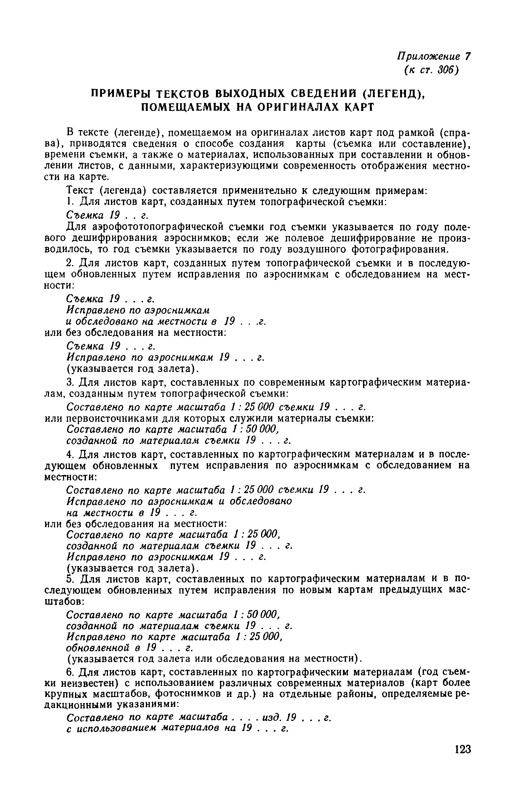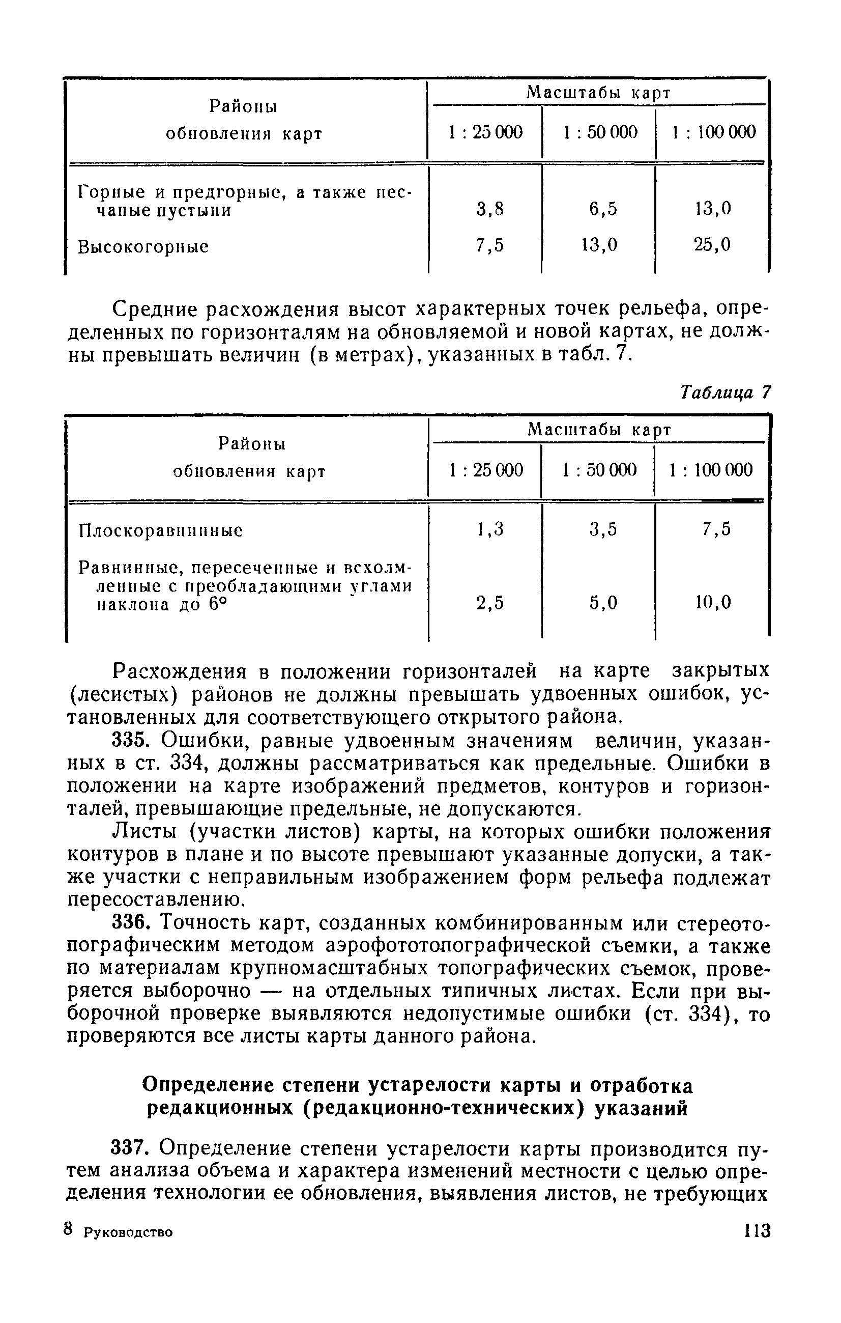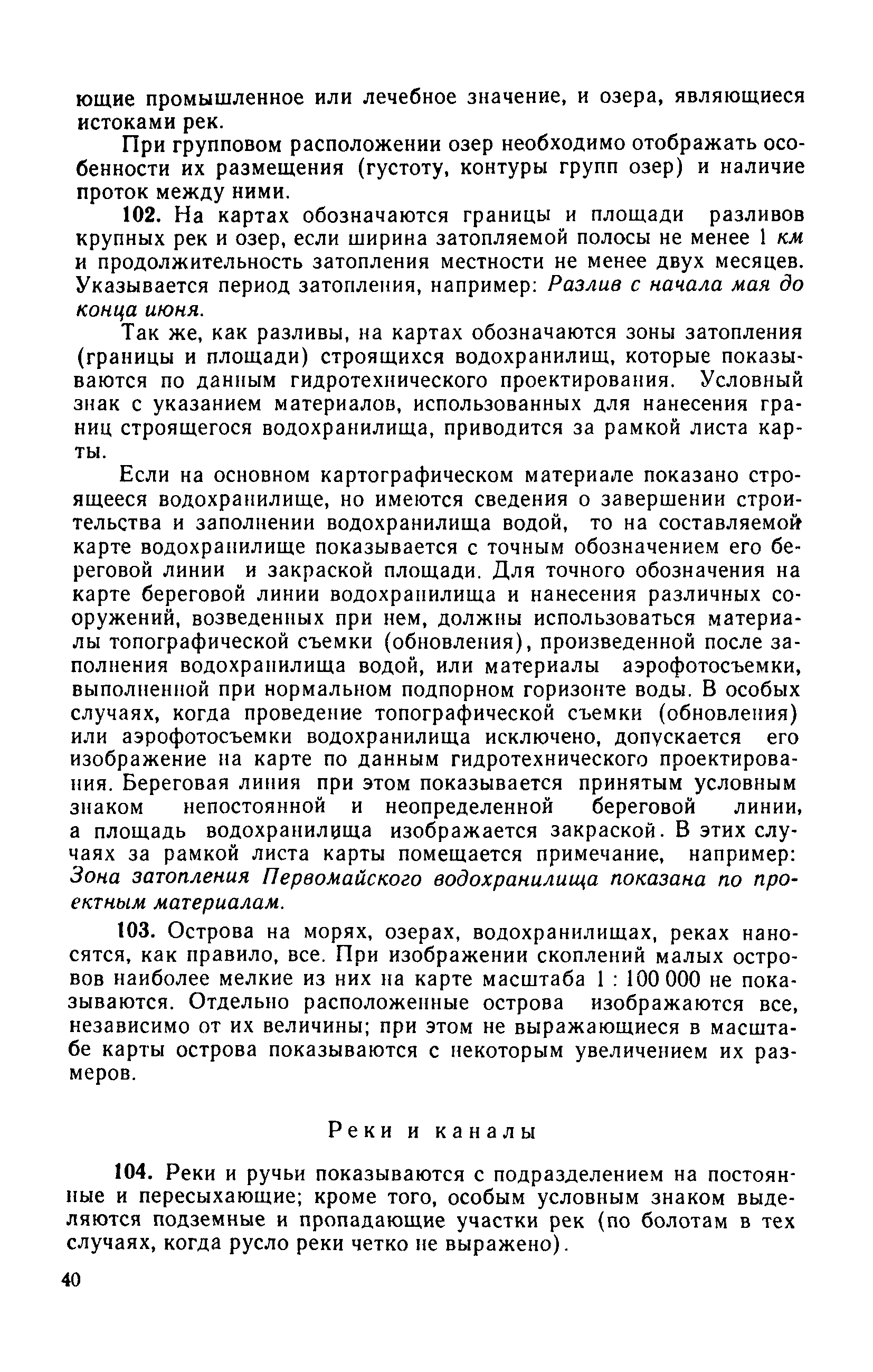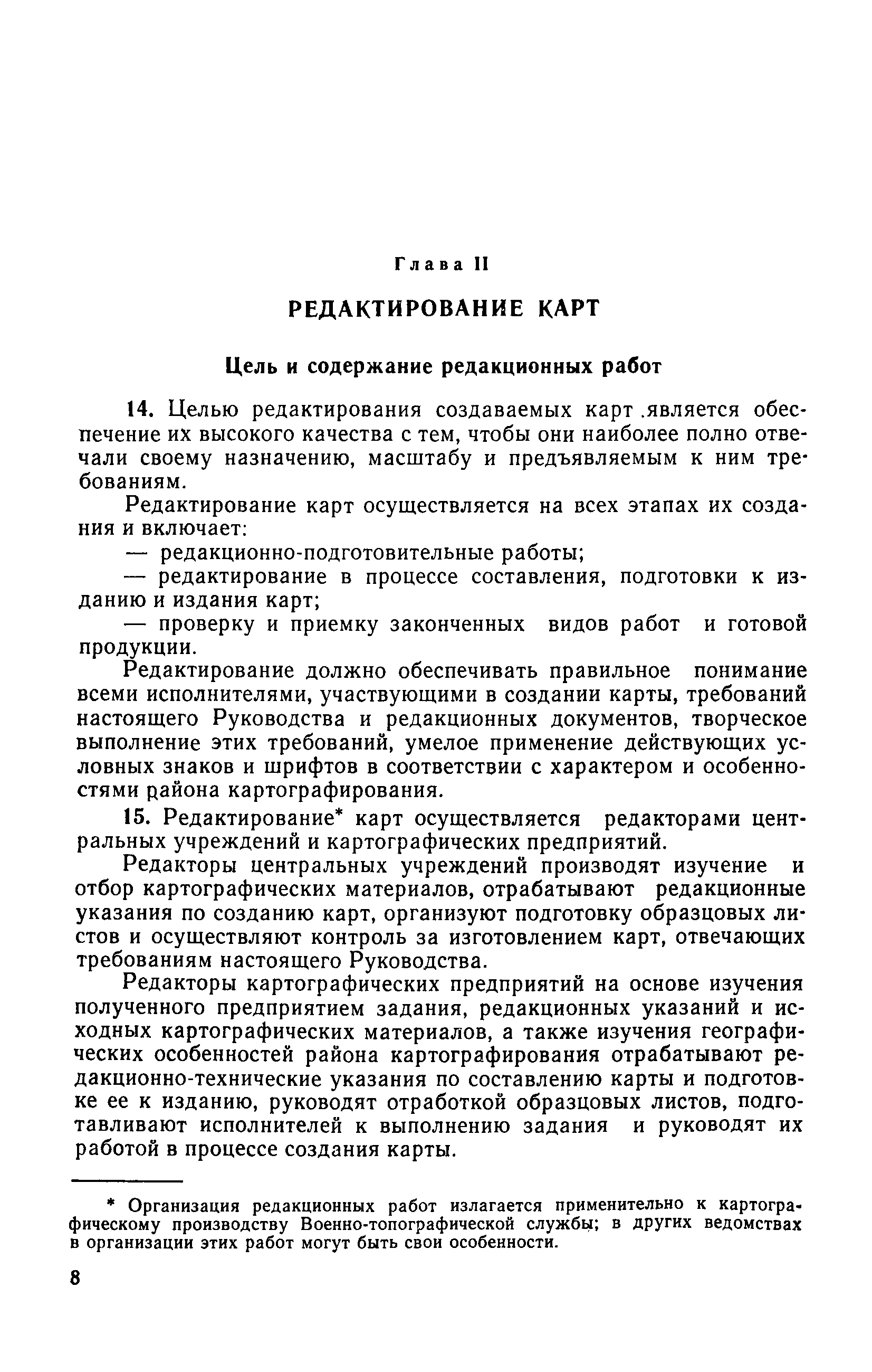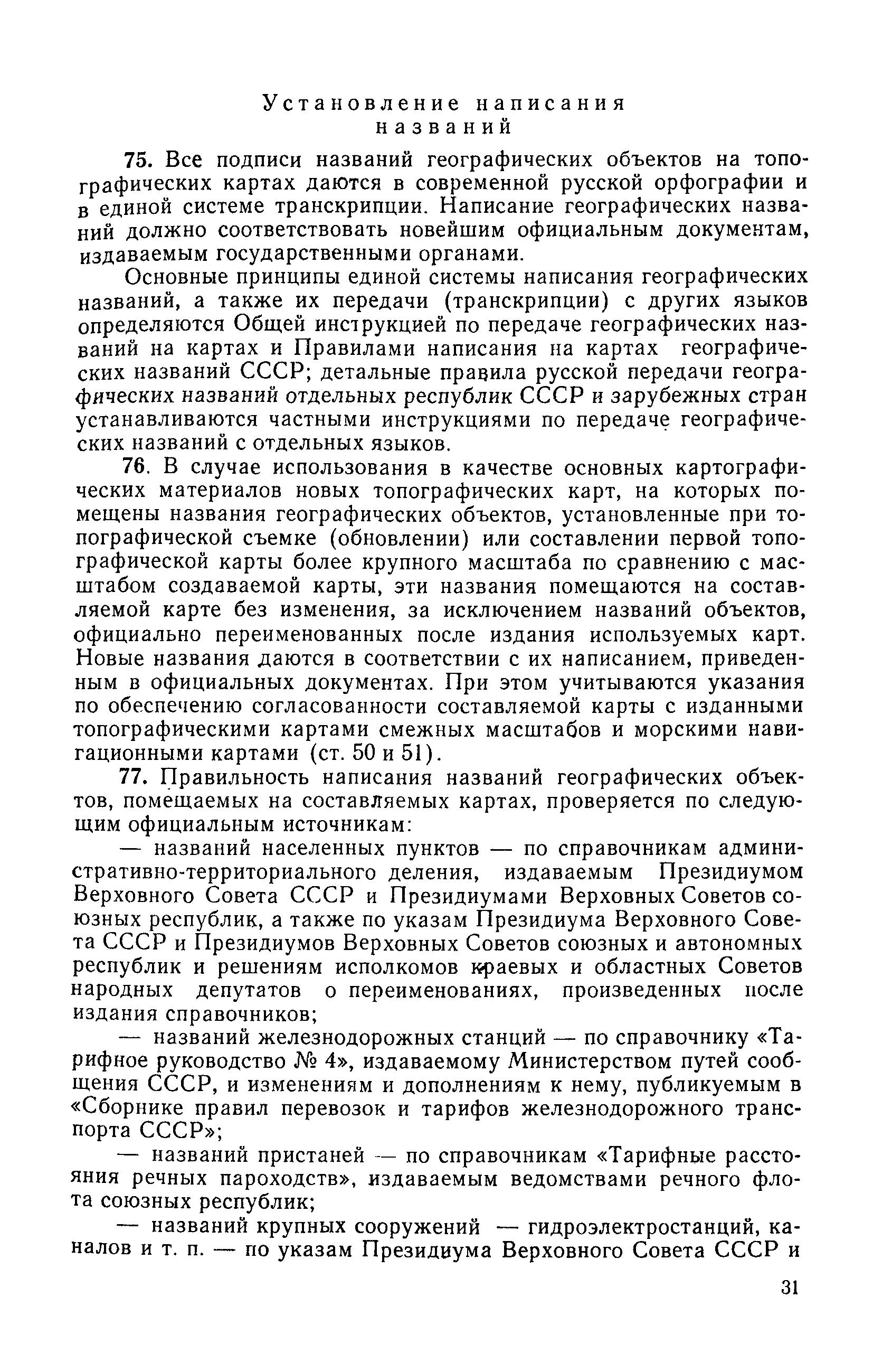 | Оглавление: | Глава 1. Общие положения Назначение топографических карт масштабов 1: 25000, 1: 50000, 1:100000 и основные требования к ним Проекция, разграфка и номенклатуры листов топографических карт Геодезическая основа карт. Точность карт Содержание и оформление карт Глава II. Редактирование карт Цель и содержание редакционных работ Редакционно-подготовительные работы Содержание редакционно-подготовительных работ Сбор картографических материалов Изучение района картографирования и картографических материалов Отработка редакционных и редакционно-технических указаний, образцового листа карты и образцов составления Подготовка исполнителей к выполнению работ Редактирование в процессе составления, подготовки к изданию и издания карт Проверка и приемка законченных видов работ и готовой продукции Использование материалов, поступивших в процессе создания карт Согласование составляемых карт с топографическими и морскими навигационными картами Глава III. Способы составления карт. Общие указания по составлению Способы составления карт Подготовка картографических материалов к использованию Подготовка картографической основы Общие указания по составлению карт Общие требования к подписям Установление написания названий Размещение подписей на картах Глава IV. Составление элементов содержания карт Математические элементы карт Опорные пункты Изображение ориентиров Гидрография и гидротехнические сооружения Прибрежная полоса морей; озера, водохранилища, острова Реки и каналы Рельеф дна морей, крупных озер, водохранилищ и рек. Отметки уровней воды Водопроводы, колодцы, источники Гидротехнические сооружения Подписи названий объектов гидрографии Населенные пункты Классификация населенных пунктов Изображение населенных пунктов Подписи названий населенных пунктов Промышленные, сельскохозяйственные и социально-культурные объекты Дорожная сеть и дорожные сооружения Железные дороги Шоссейные и грунтовые дороги, тропы Дорожные сооружения Подписи характеристик проходимости местности и направлений дорог Рельеф Высоты сечения рельефа, требования к изображению рельефа горизонталями Изображение основных типов рельефа Отметки высот Подписи названий объектов рельефа Растительный покров и грунты Древесная растительность Кустарниковая растительность Травянистая, полукустарниковая, кустарничковая, моховая и лишайниковая растительность Искусственные насаждения Болота, солончаки, грунты Границы и ограждения Сводка составительских оригиналов Оформление рамок листов карт Выписка названий для набора подписей Глава V. Подготовка карт к изданию Способы подготовки карт к изданию Последовательность выполнения работ Порядок гравирования штриховых элементов содержания карт Изготовление оригиналов фоновых закрасок (заливок и сеток) и макета заливки кварталов населенных пунктов и дорог Требования к оригинальным диапозитивам Сводка издательских оригиналов Комплектность материалов для издания карт Глава VI. Общие указания по обновлению карт Общие положения Проверка точности обновляемой карты Определение степени устарелости карты и отработка редакционных (редакционно-технических) указаний Технология обновления оригиналов карты и подготовки ее к изданию Приложения: 1. Разграфка, номенклатуры и шифры листов топограф