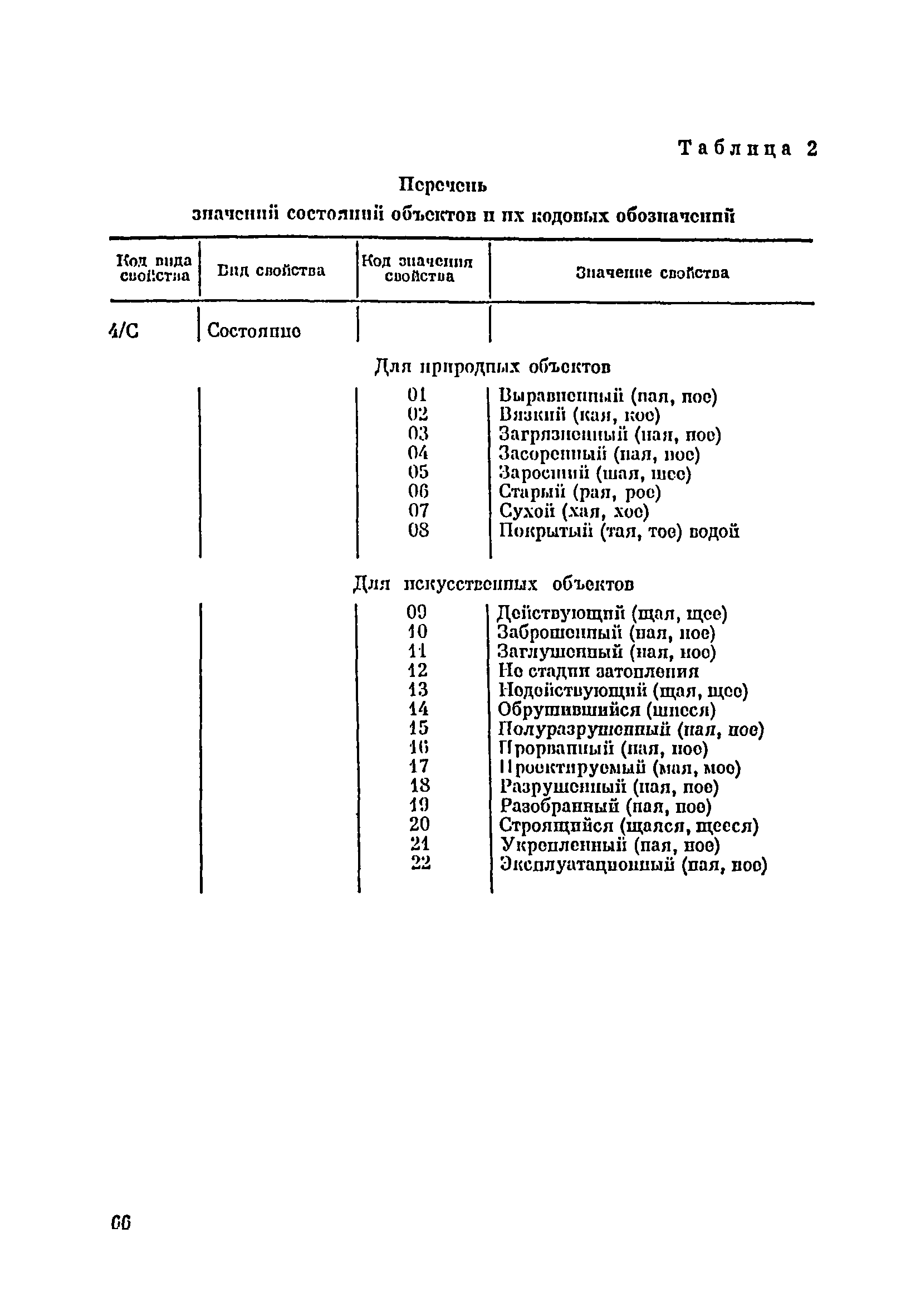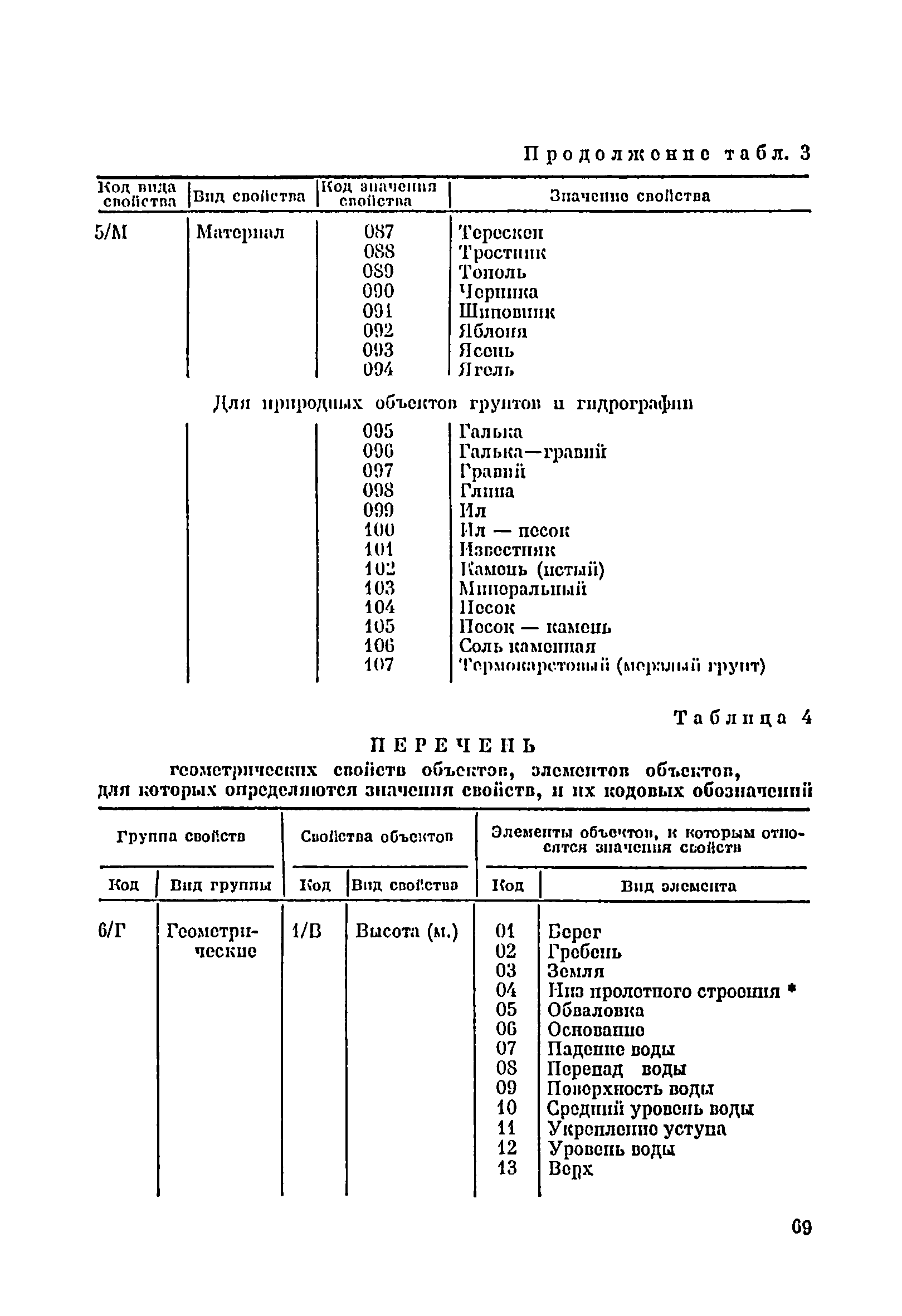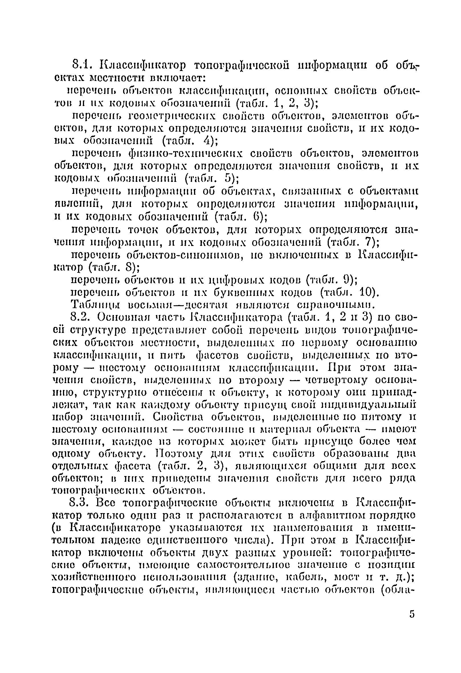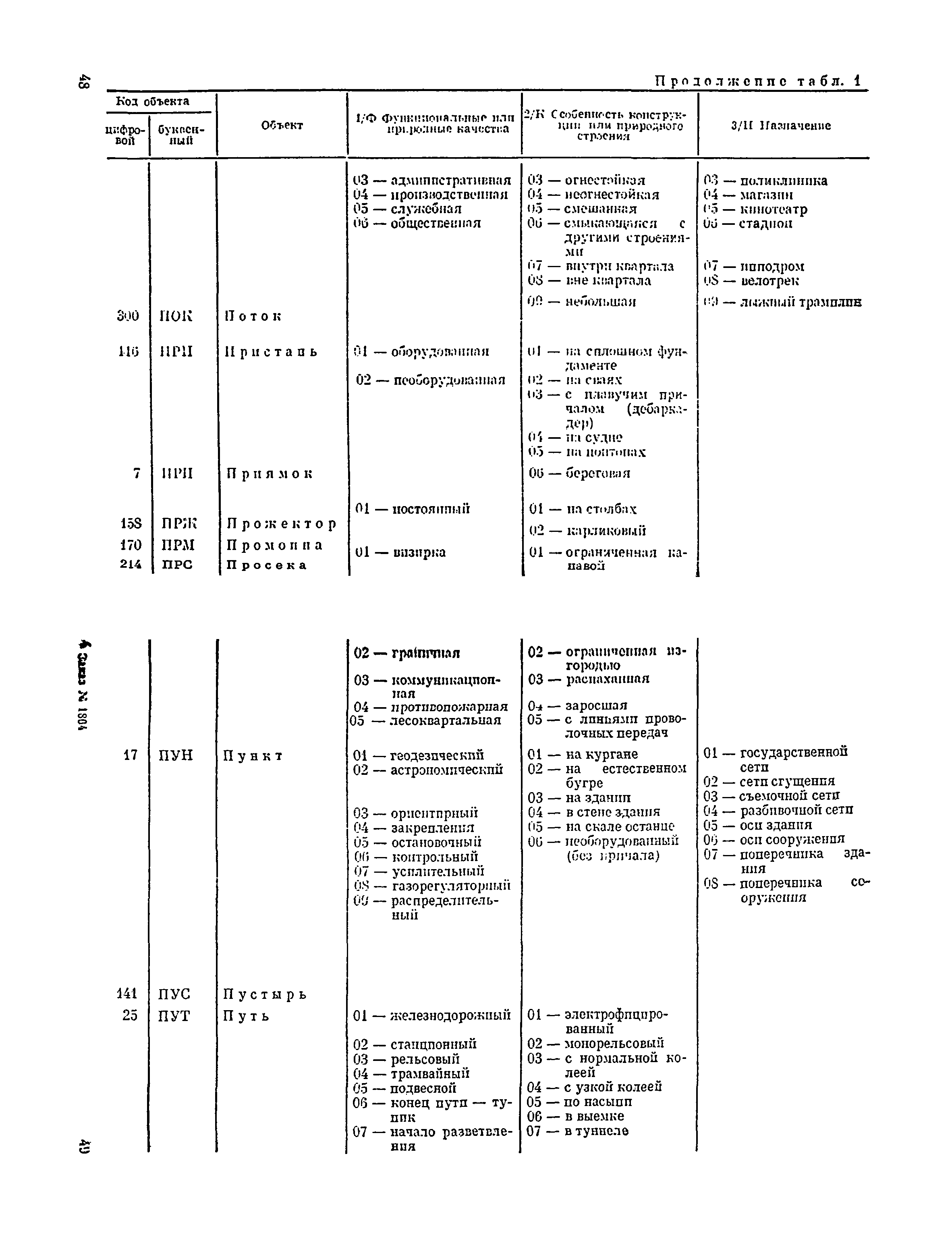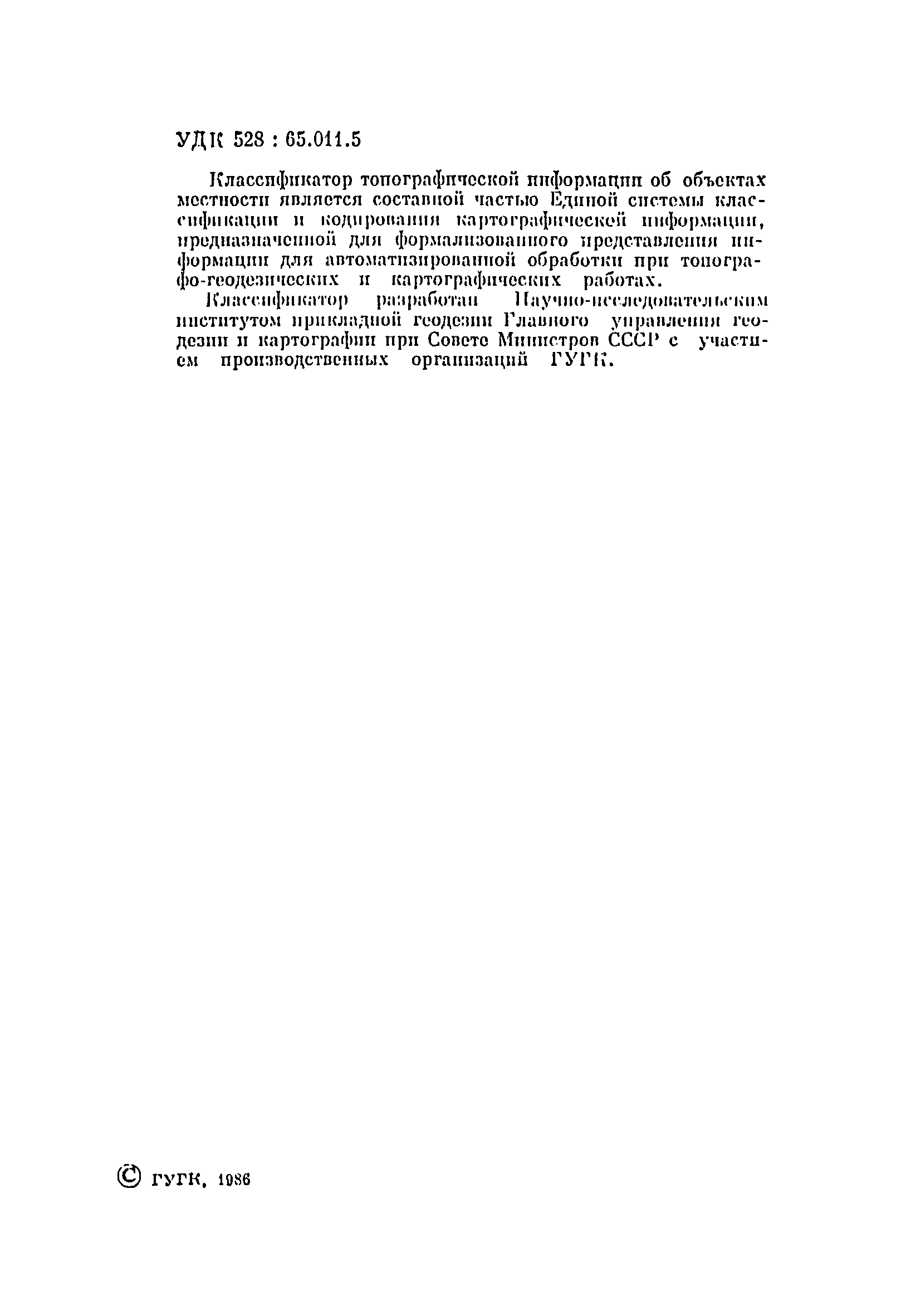 Классификатор топографической информации. (Информация, отображаемая на картах и планах масштабов 1:500, 1:1000, 1:2000, 1:5000, 1:10000)| Статус: | утратил силу | | Название рус.: | Классификатор топографической информации. (Информация, отображаемая на картах и планах масштабов 1:500, 1:1000, 1:2000, 1:5000, 1:10000) | | Дата добавления в базу: | 01.09.2013 | | Дата актуализации: | 01.01.2021 | | Дата окончания срока действия: | 01.01.2018 | | Область применения: | Классификатор топографической информации предназначен для использования в автоматизированных системах топографо-геодезического назначения и служит для представления топографической информации об объектах местности в формализованном виде для последующей обработки ее с помощью ЭВМ при создании ЦММ банков данных, при автоматизированном картографировании и других процессах автоматизированной обработки информации. | | Оглавление: | 1. Введение 2. Перечень объектов классификации, основных свойств объектов и их кодовых обозначений Таблица 1 3. Перечень значений состояний объектов и их кодовых обозначений Таблица 2 4. Перечень значений материалов объектов и их кодовых обозначений Таблица 3 5. Перечень геометрических свойств объектов, элементов объектов, для которых определяются значения свойств, и их кодовых обозначений Таблица 4 6. Перечень физико-технических свойств объектов, элементов объектов, для которых определяются значения свойств, и их кодовых обозначений Таблица 5 7. Перечень информации об объекте, связанных с объектами явлений, для которых определяются значения информации и их кодовых обозначений Таблица 6 8. Перечень точек объектов, для которых определяются значения информации, и их кодовых обозначений Таблица 7 9. Перечень объектов-синоптиков, не включенных в Классификатор Таблица 8 10. Перечень объектов и их цифровых кодов Таблица 9 11. Перечень объектов и их буквенных кодов Таблица 10 | | Разработан: | ЦНИИГАиК