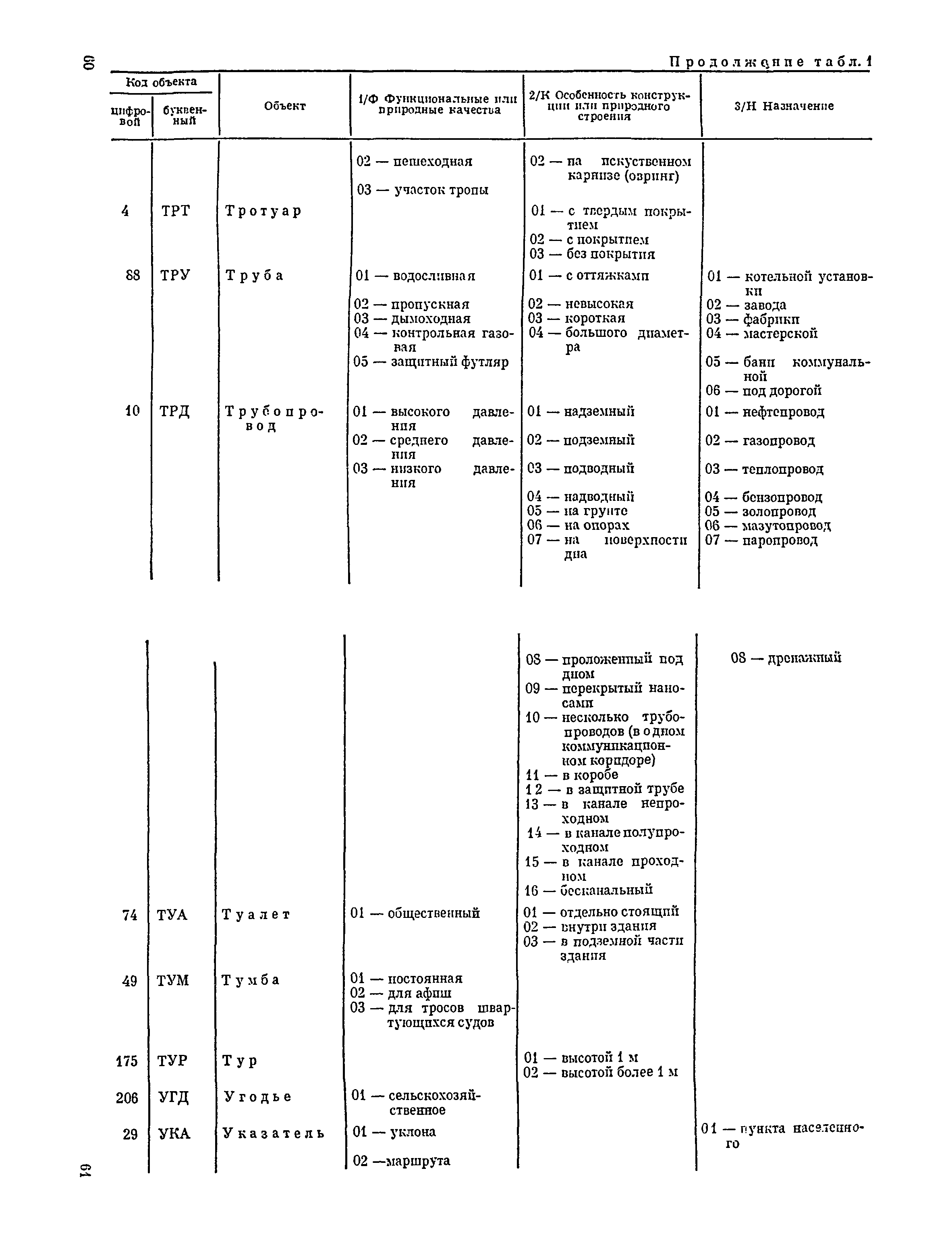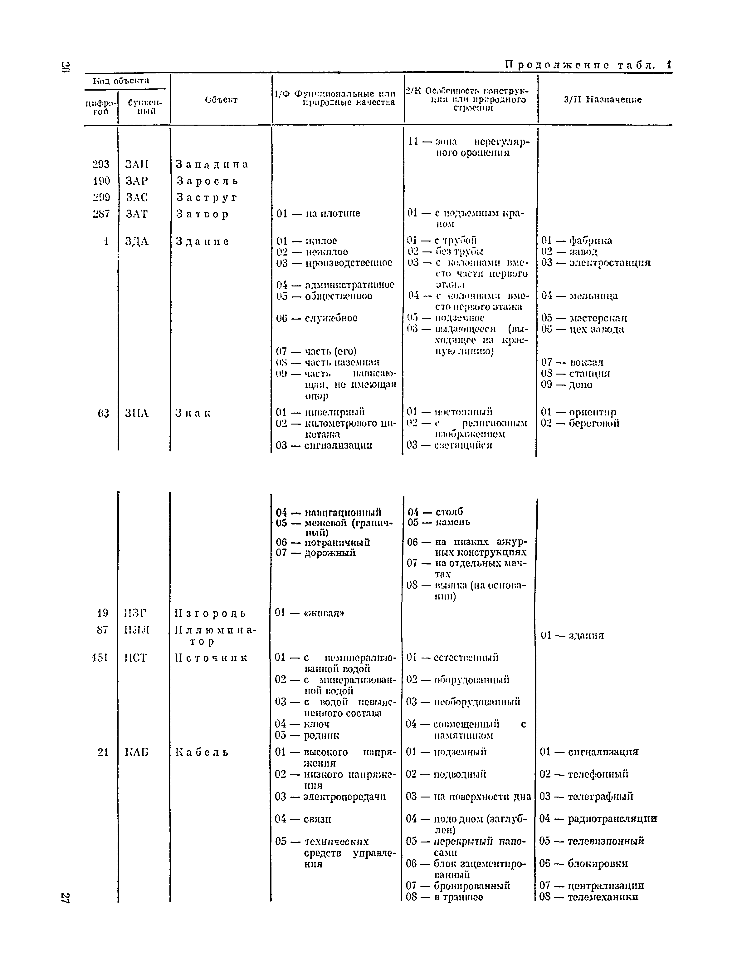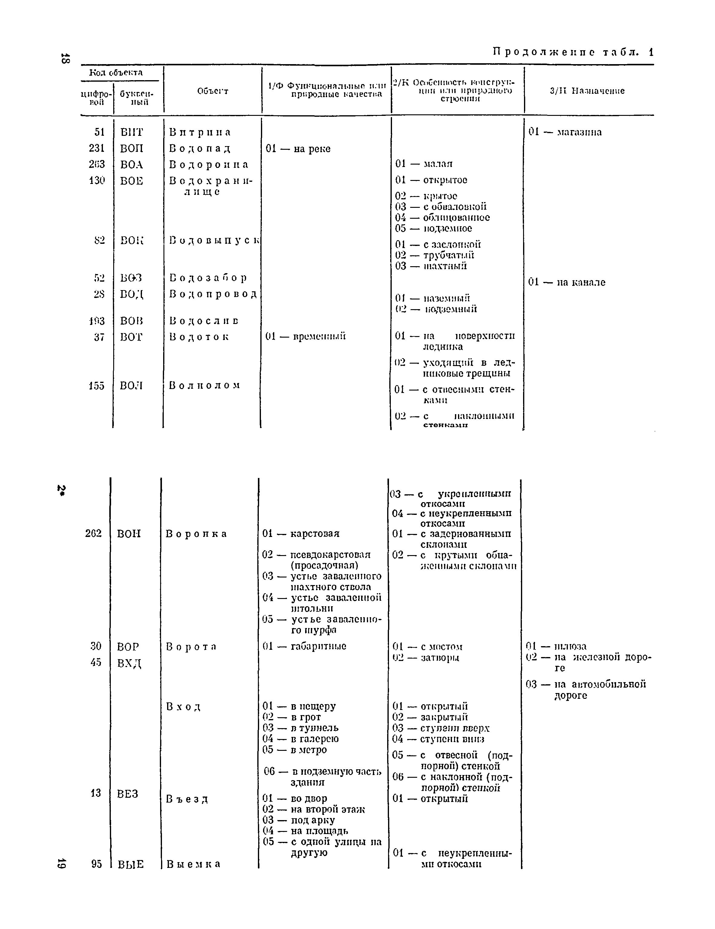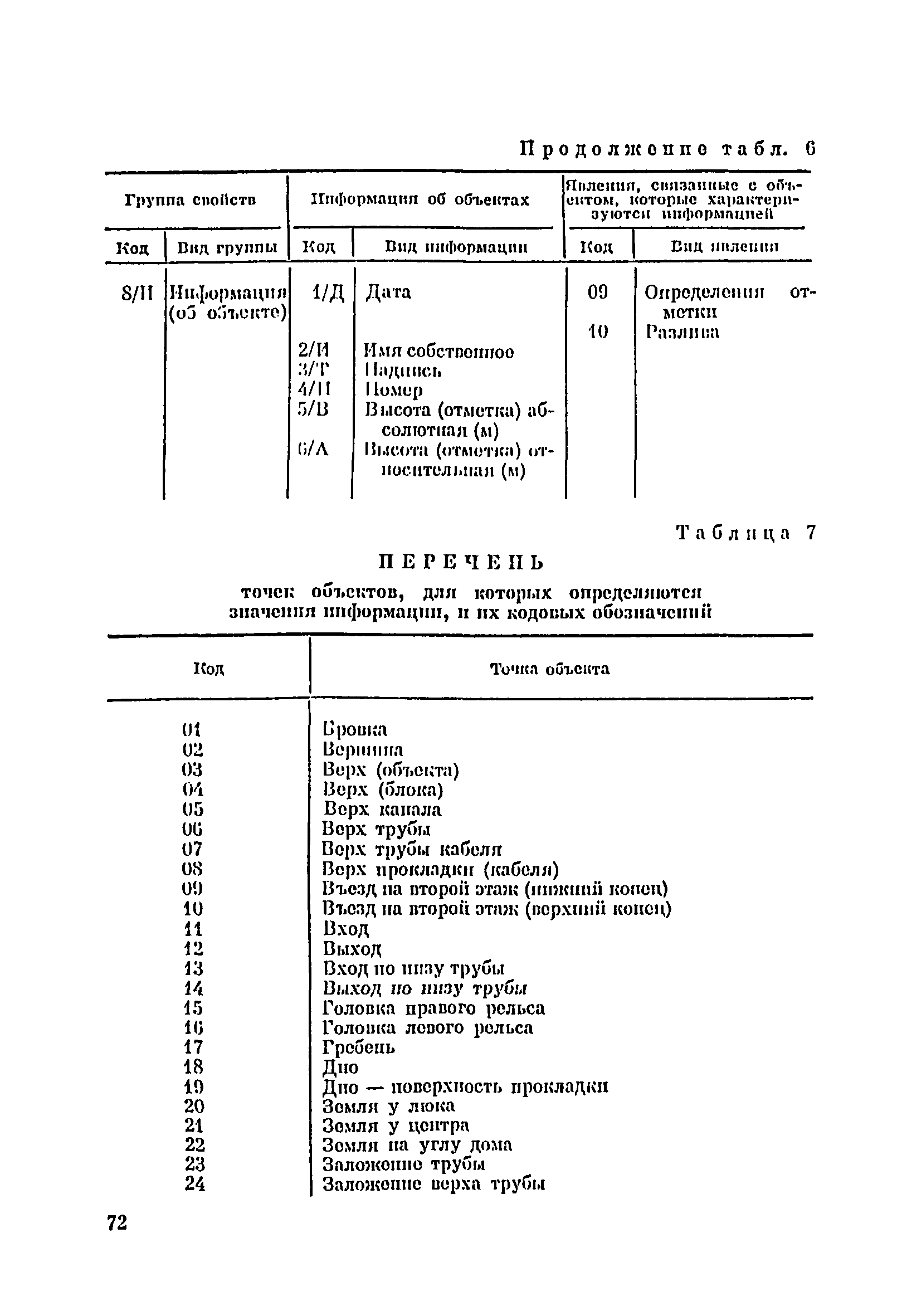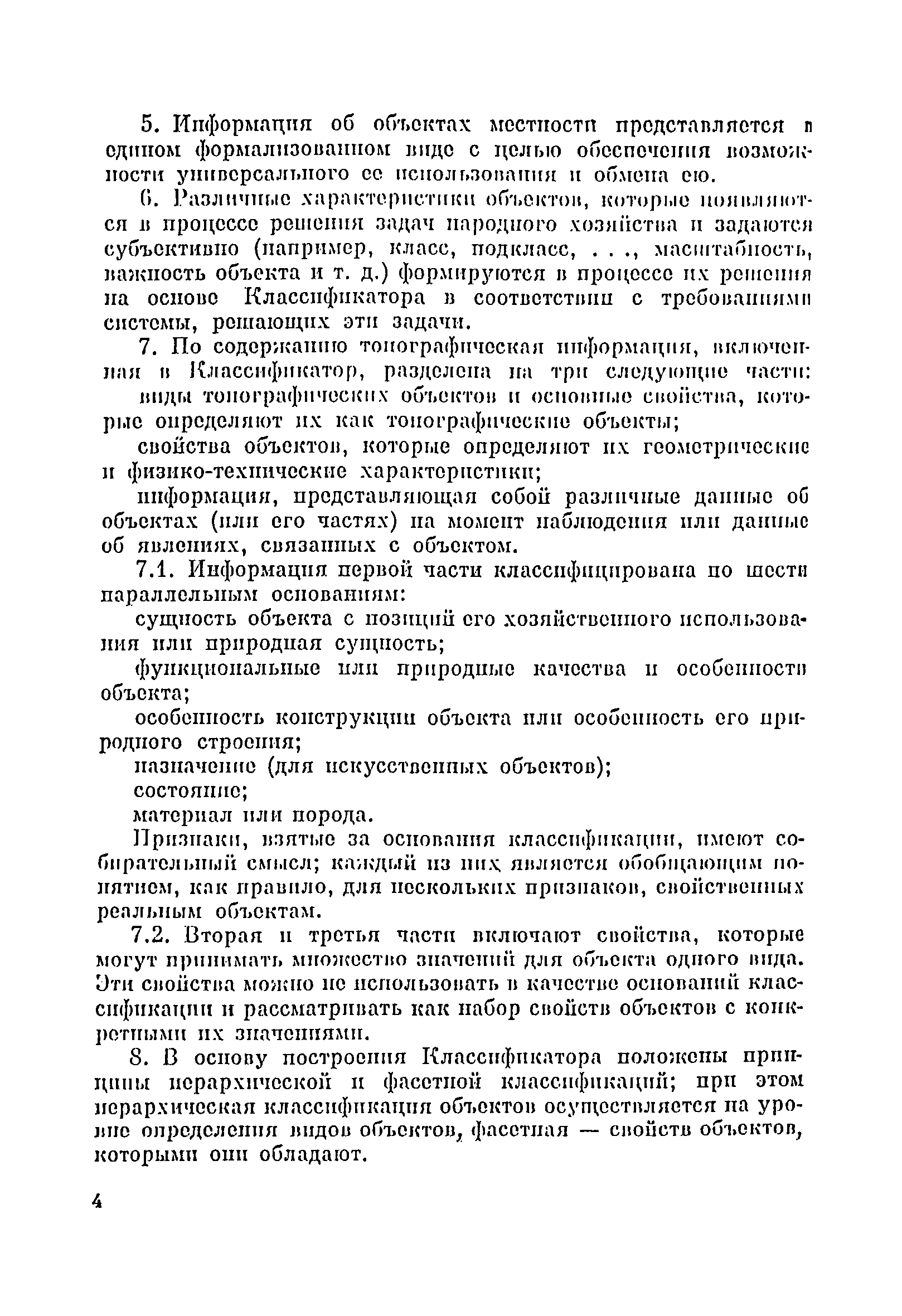 Классификатор топографической информации. (Информация, отображаемая на картах и планах масштабов 1:500, 1:1000, 1:2000, 1:5000, 1:10000)| Статус: | утратил силу | | Название рус.: | Классификатор топографической информации. (Информация, отображаемая на картах и планах масштабов 1:500, 1:1000, 1:2000, 1:5000, 1:10000) | | Дата добавления в базу: | 01.09.2013 | | Дата актуализации: | 01.01.2021 | | Дата окончания срока действия: | 01.01.2018 | | Область применения: | Классификатор топографической информации предназначен для использования в автоматизированных системах топографо-геодезического назначения и служит для представления топографической информации об объектах местности в формализованном виде для последующей обработки ее с помощью ЭВМ при создании ЦММ банков данных, при автоматизированном картографировании и других процессах автоматизированной обработки информации. | | Оглавление: | 1. Введение 2. Перечень объектов классификации, основных свойств объектов и их кодовых обозначений Таблица 1 3. Перечень значений состояний объектов и их кодовых обозначений Таблица 2 4. Перечень значений материалов объектов и их кодовых обозначений Таблица 3 5. Перечень геометрических свойств объектов, элементов объектов, для которых определяются значения свойств, и их кодовых обозначений Таблица 4 6. Перечень физико-технических свойств объектов, элементов объектов, для которых определяются значения свойств, и их кодовых обозначений Таблица 5 7. Перечень информации об объекте, связанных с объектами явлений, для которых определяются значения информации и их кодовых обозначений Таблица 6 8. Перечень точек объектов, для которых определяются значения информации, и их кодовых обозначений Таблица 7 9. Перечень объектов-синоптиков, не включенных в Классификатор Таблица 8 10. Перечень объектов и их цифровых кодов Таблица 9 11. Перечень объектов и их буквенных кодов Таблица 10 | | Разработан: | ЦНИИГАиК