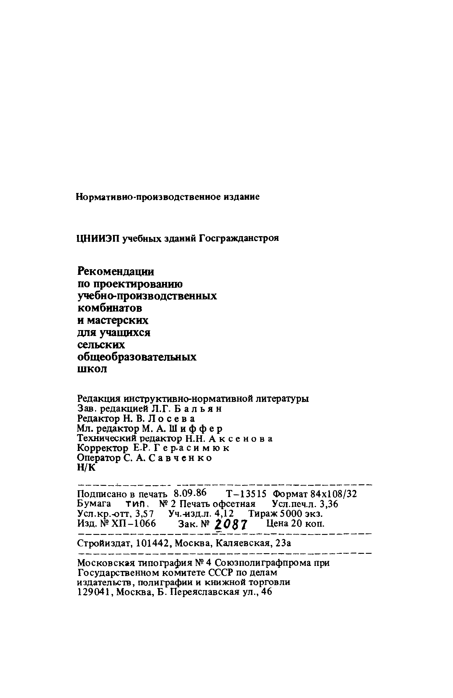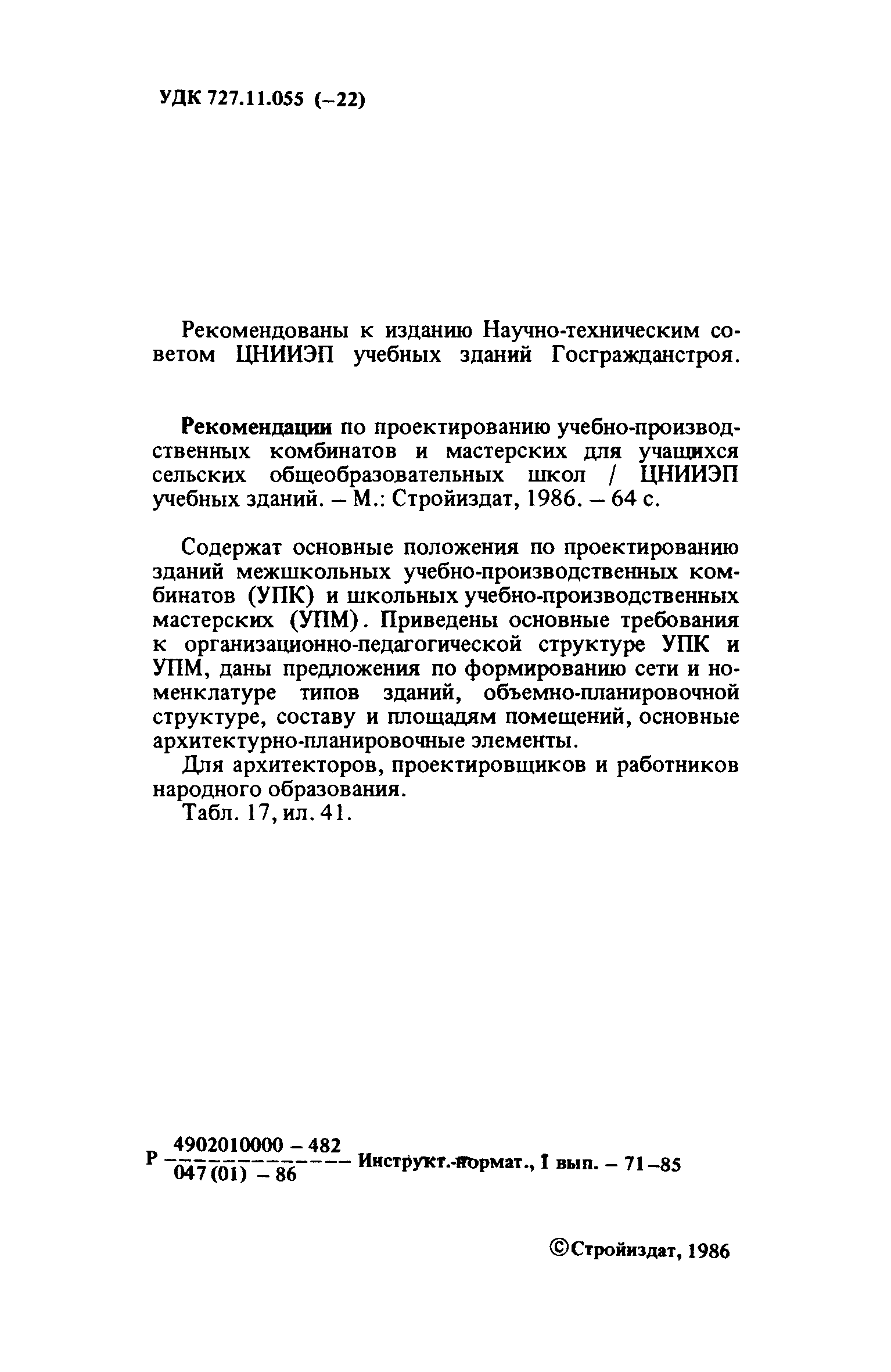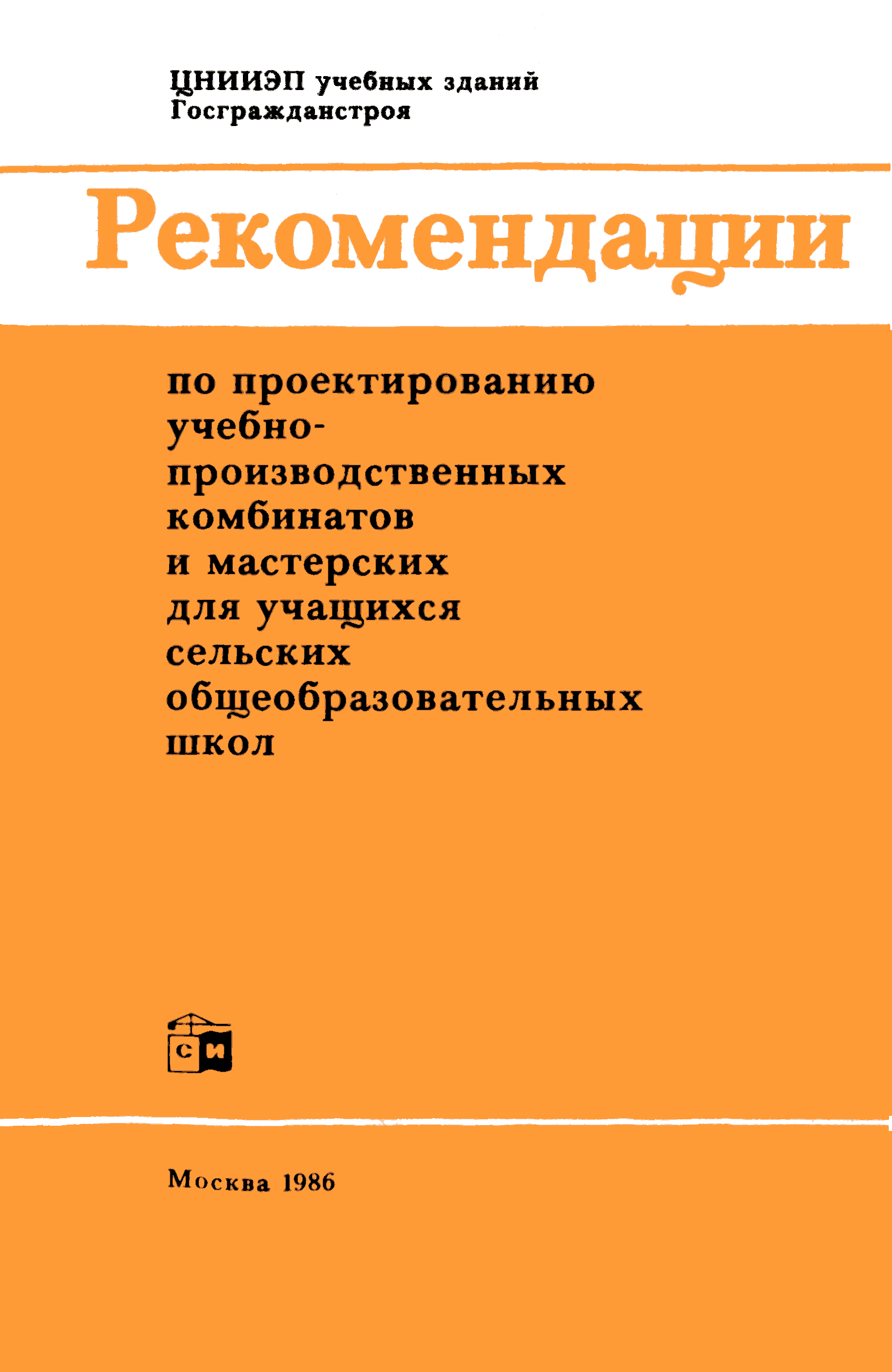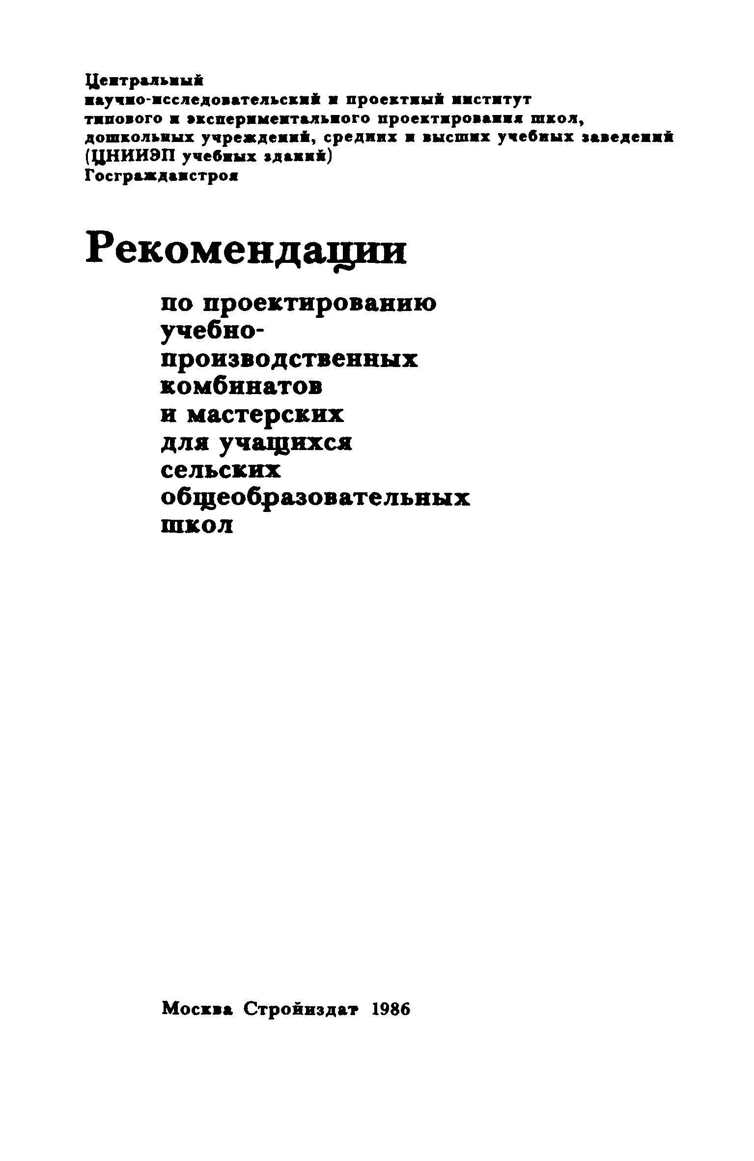 | Название рус.: | Рекомендации по проектированию учебно-производственных комбинатов и мастерских для учащихся сельских общеобразовательных школ |