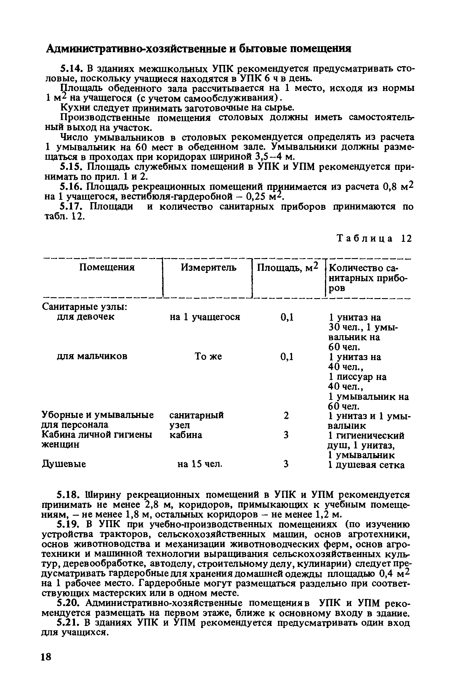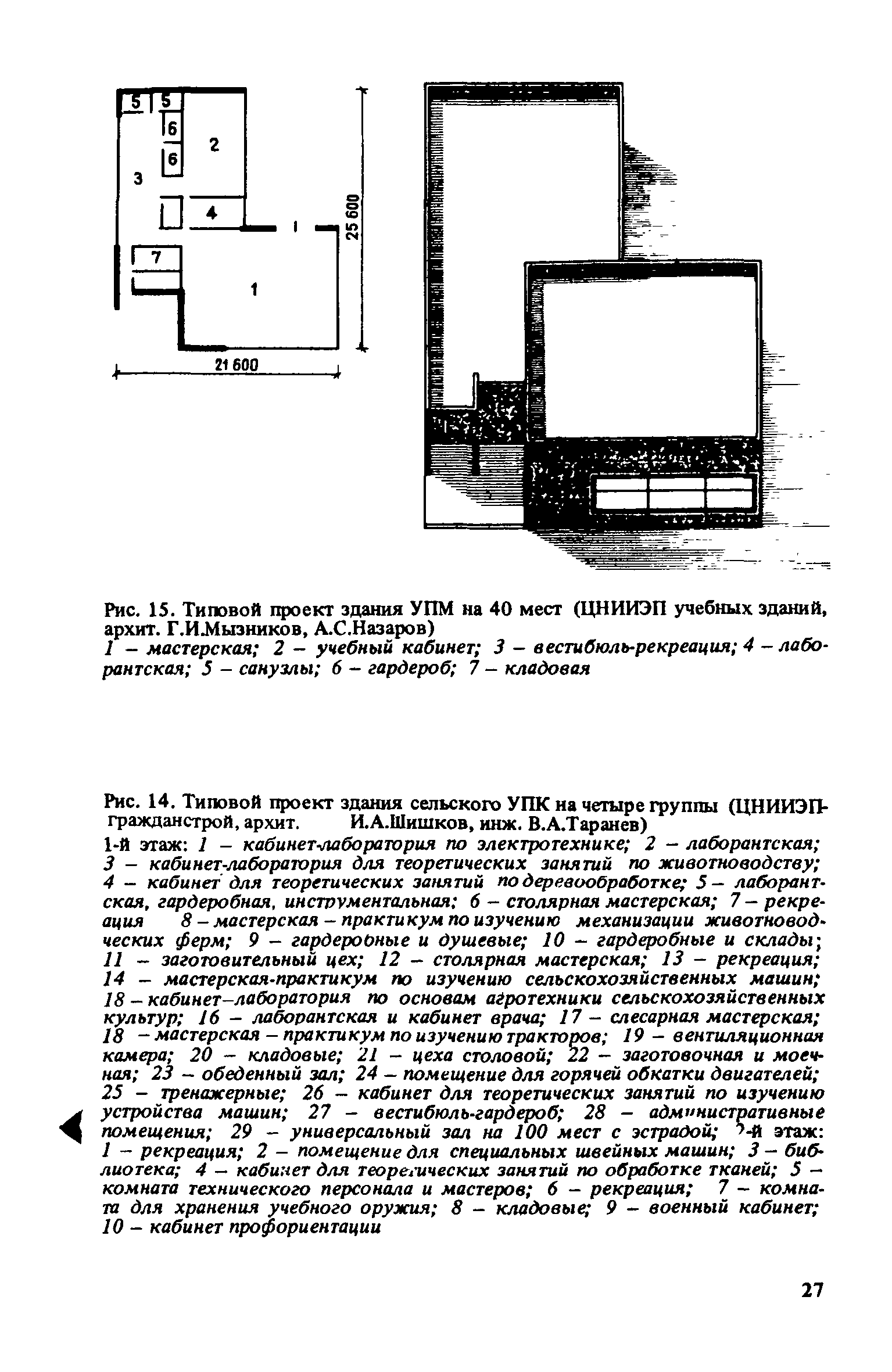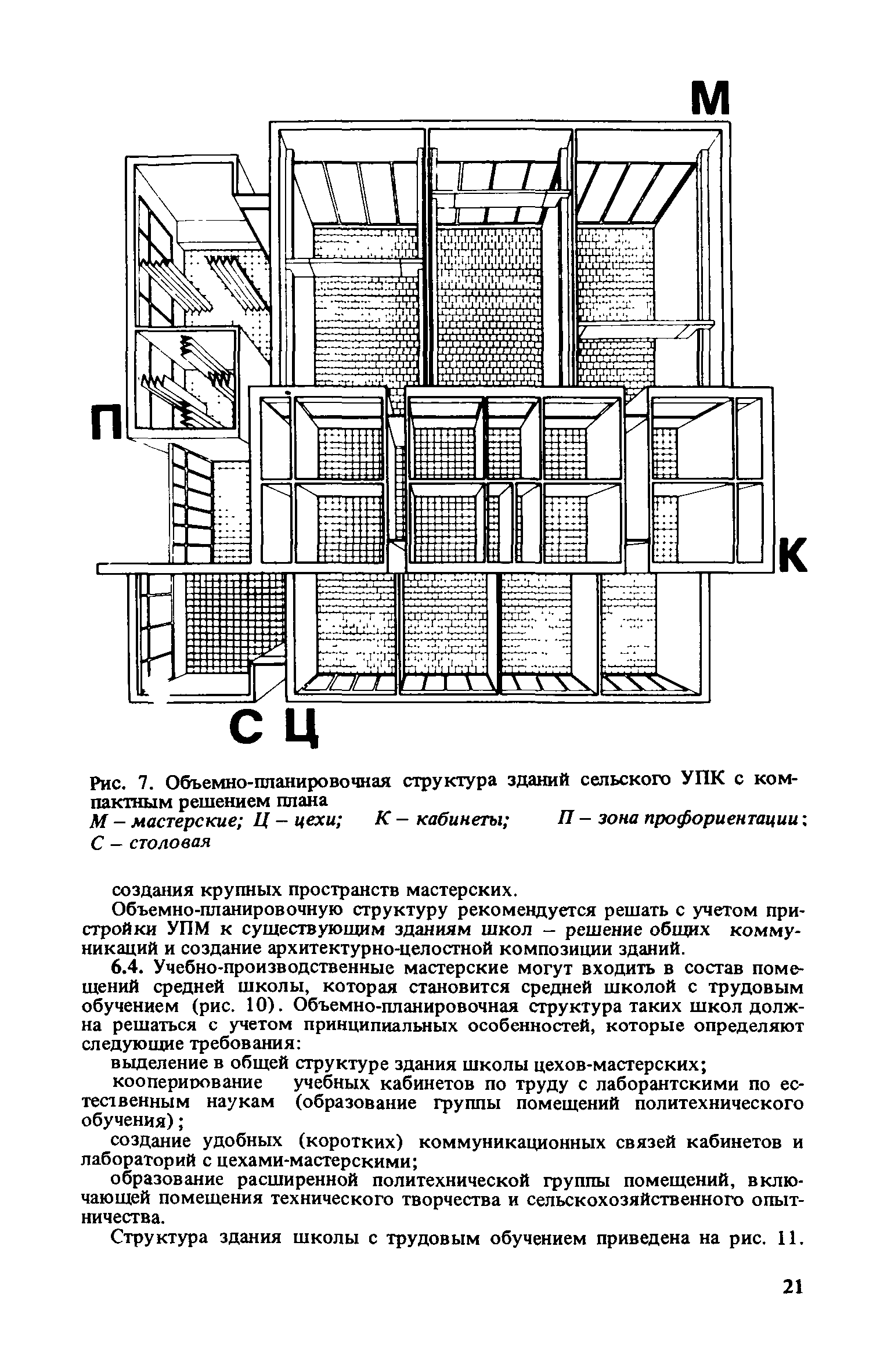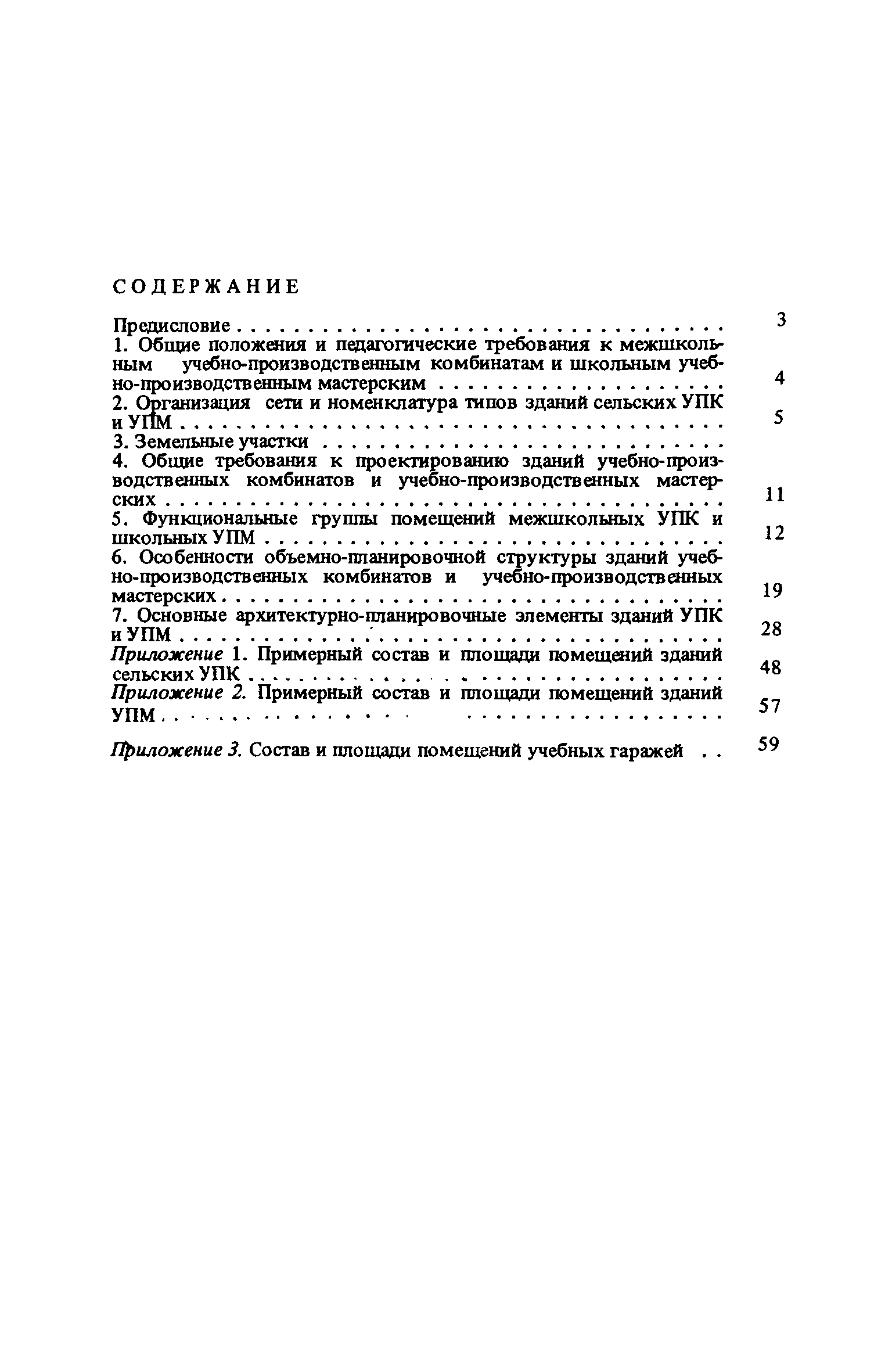 | Оглавление: | Предисловие 1. Общие положения и педагогические требования к межшкольным учебно-производственным комбинатам и школьным учебно-производственным мастерским 2. Организация сети и номенклатура типов зданий сельских УПК и УПМ 3. Земельные участки 4. Общие требования к проектированию зданий учебно-производственных комбинатов и учебно-производственных мастерских 5. Функциональные группы помещений межшкольных УПК и школьных УПМ 6. Особенности объемно-планировочной структуры зданий учебно-производственных комбинатов и учебно-производственных мастерских 7. Основные архитектурно-планировочные элементы зданий УПК и УПМ Приложение 1. Примерный состав и площади помещений зданий сельских УПК Приложение 2. Примерный состав и площади помещений зданий УПМ Приложение 3. Состав и площади помещений учебных гаражей |