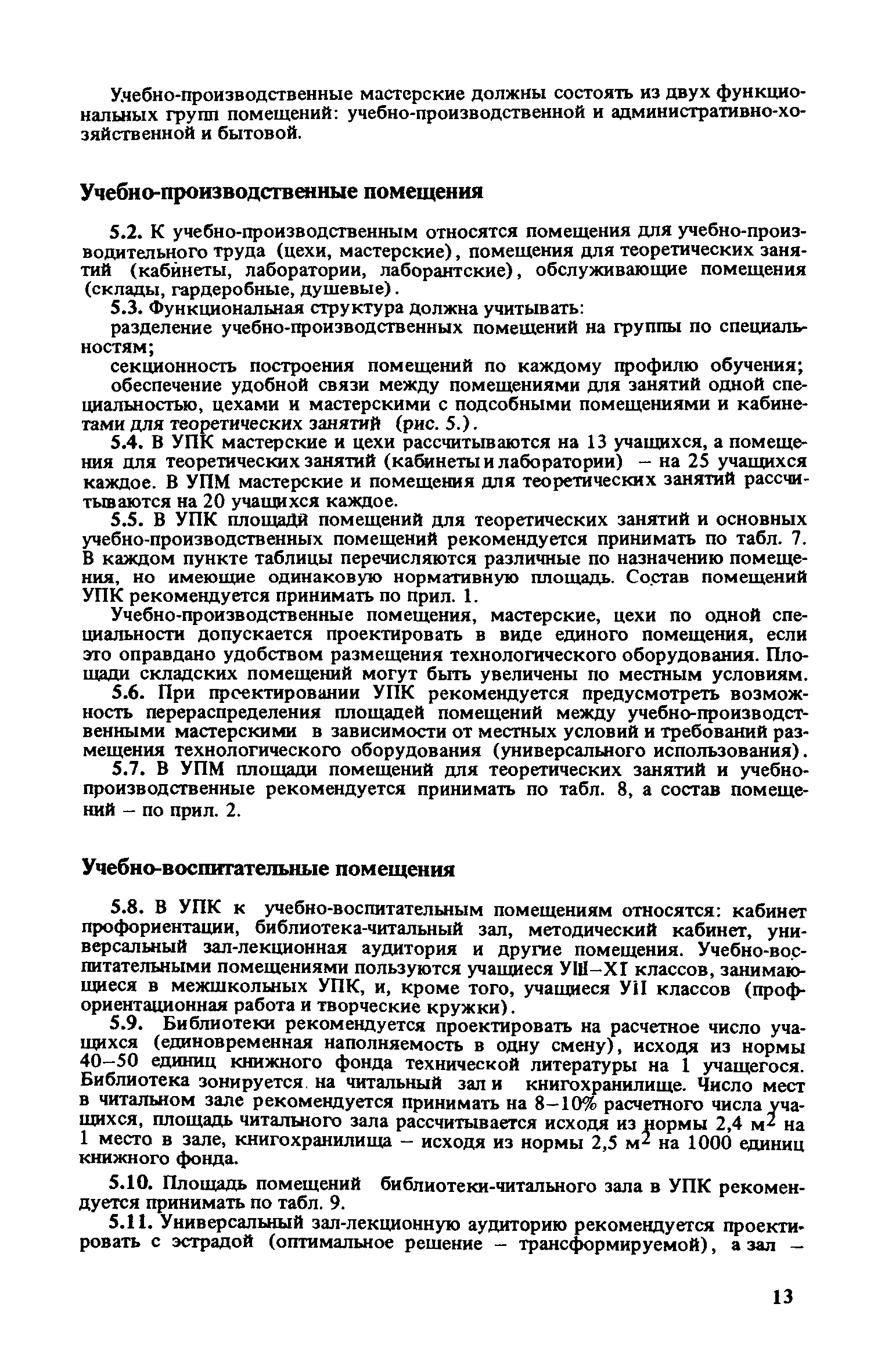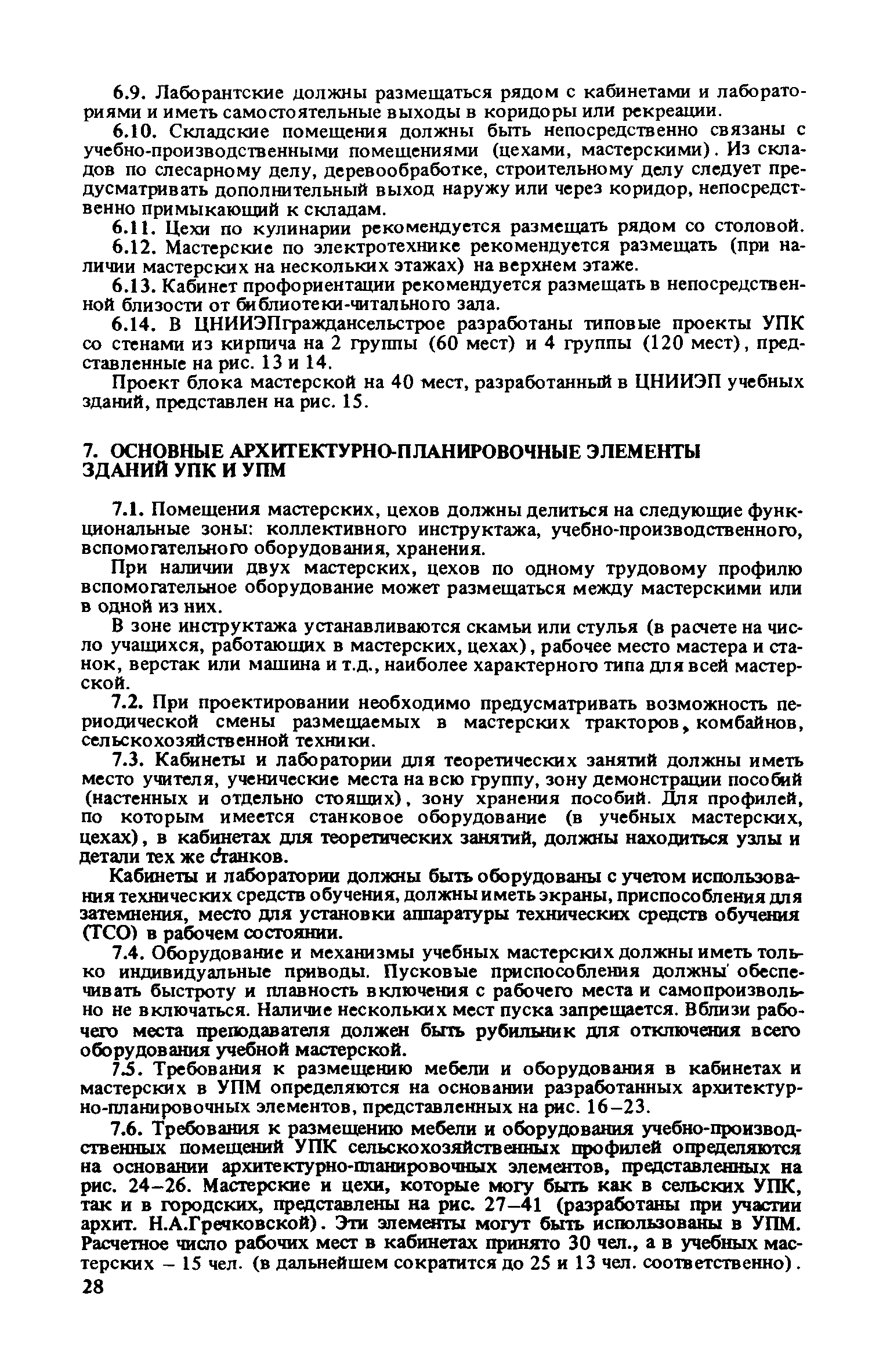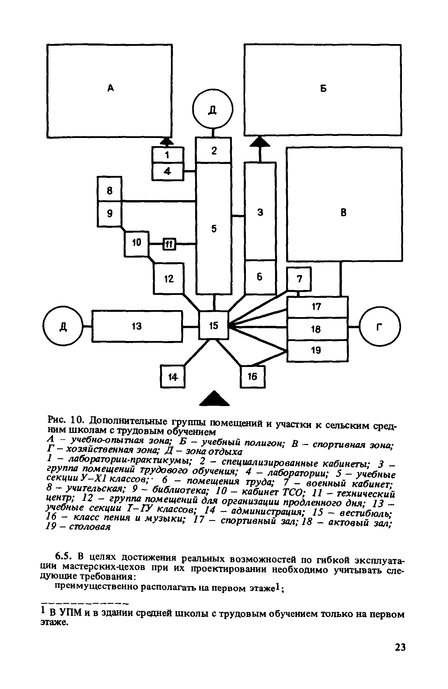 | Оглавление: | Предисловие 1. Общие положения и педагогические требования к межшкольным учебно-производственным комбинатам и школьным учебно-производственным мастерским 2. Организация сети и номенклатура типов зданий сельских УПК и УПМ 3. Земельные участки 4. Общие требования к проектированию зданий учебно-производственных комбинатов и учебно-производственных мастерских 5. Функциональные группы помещений межшкольных УПК и школьных УПМ 6. Особенности объемно-планировочной структуры зданий учебно-производственных комбинатов и учебно-производственных мастерских 7. Основные архитектурно-планировочные элементы зданий УПК и УПМ Приложение 1. Примерный состав и площади помещений зданий сельских УПК Приложение 2. Примерный состав и площади помещений зданий УПМ Приложение 3. Состав и площади помещений учебных гаражей |