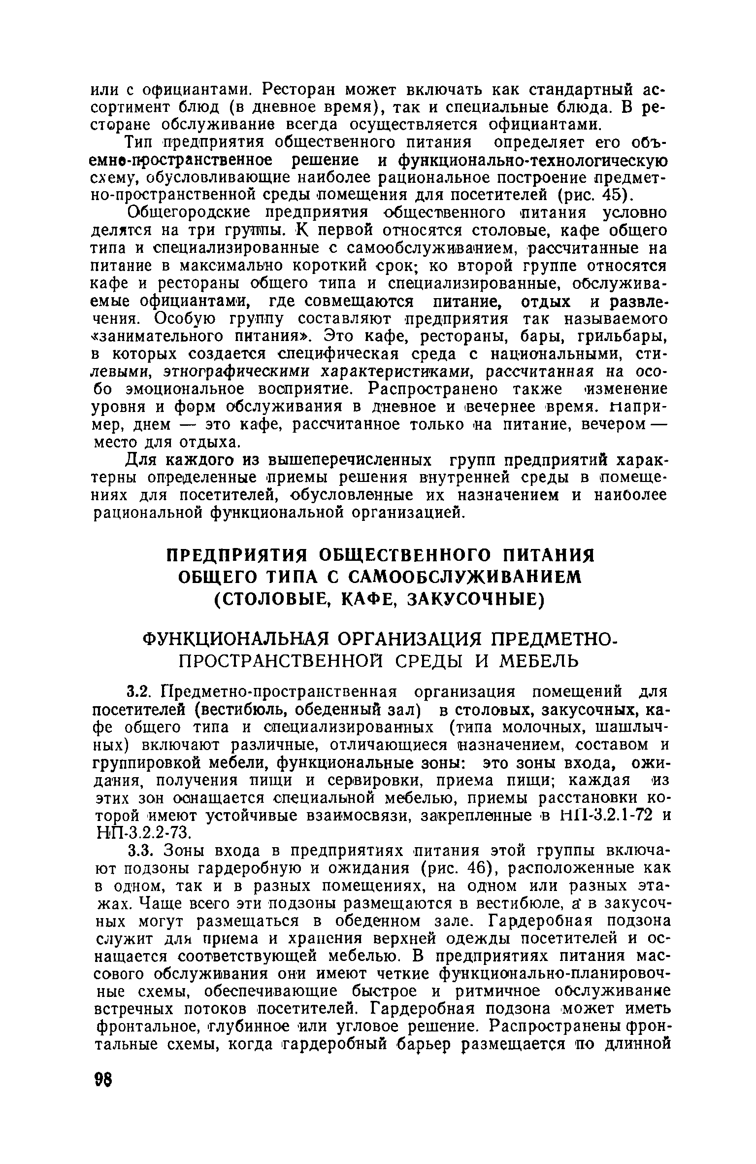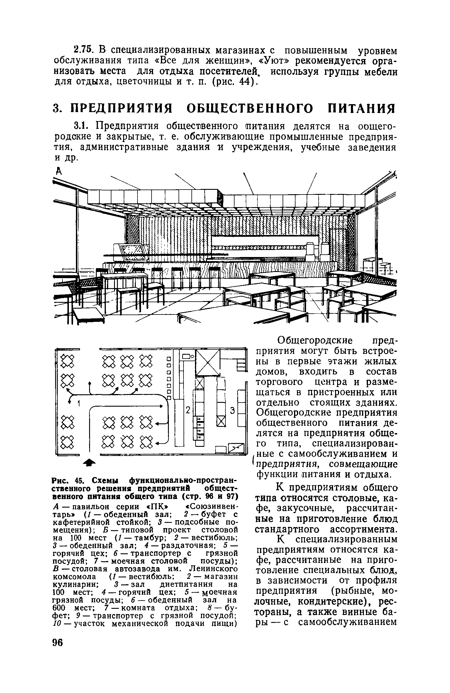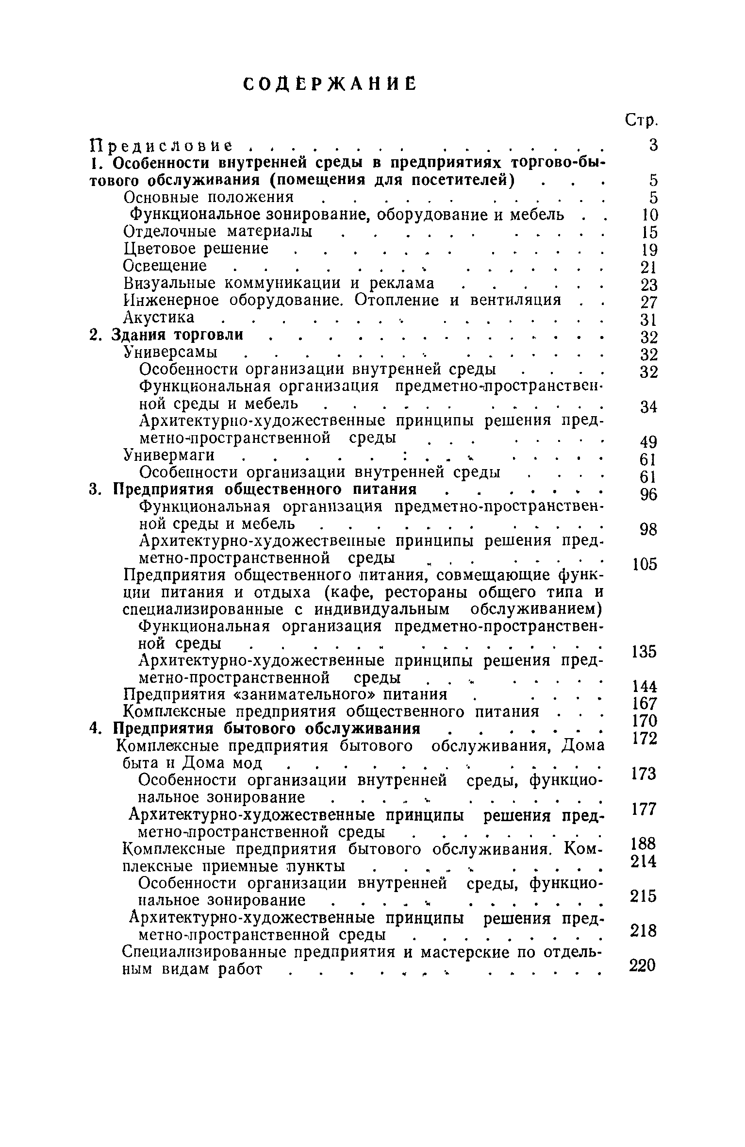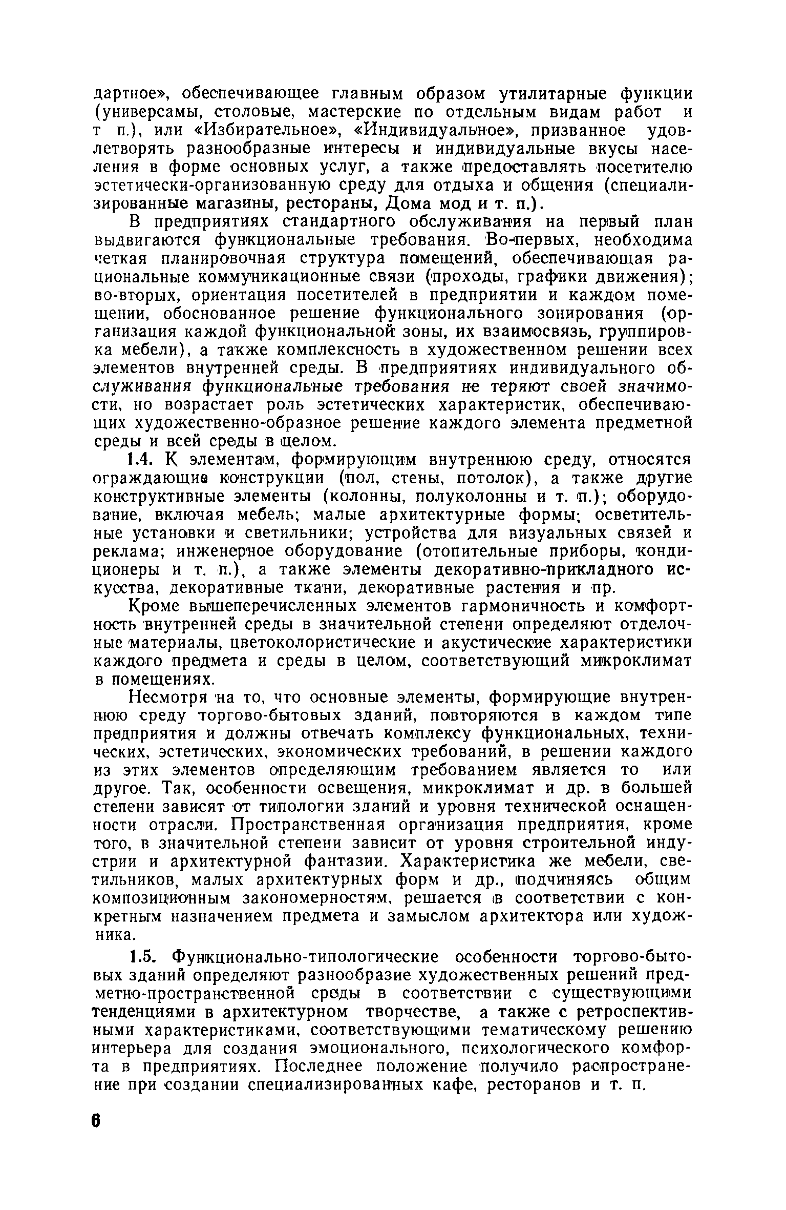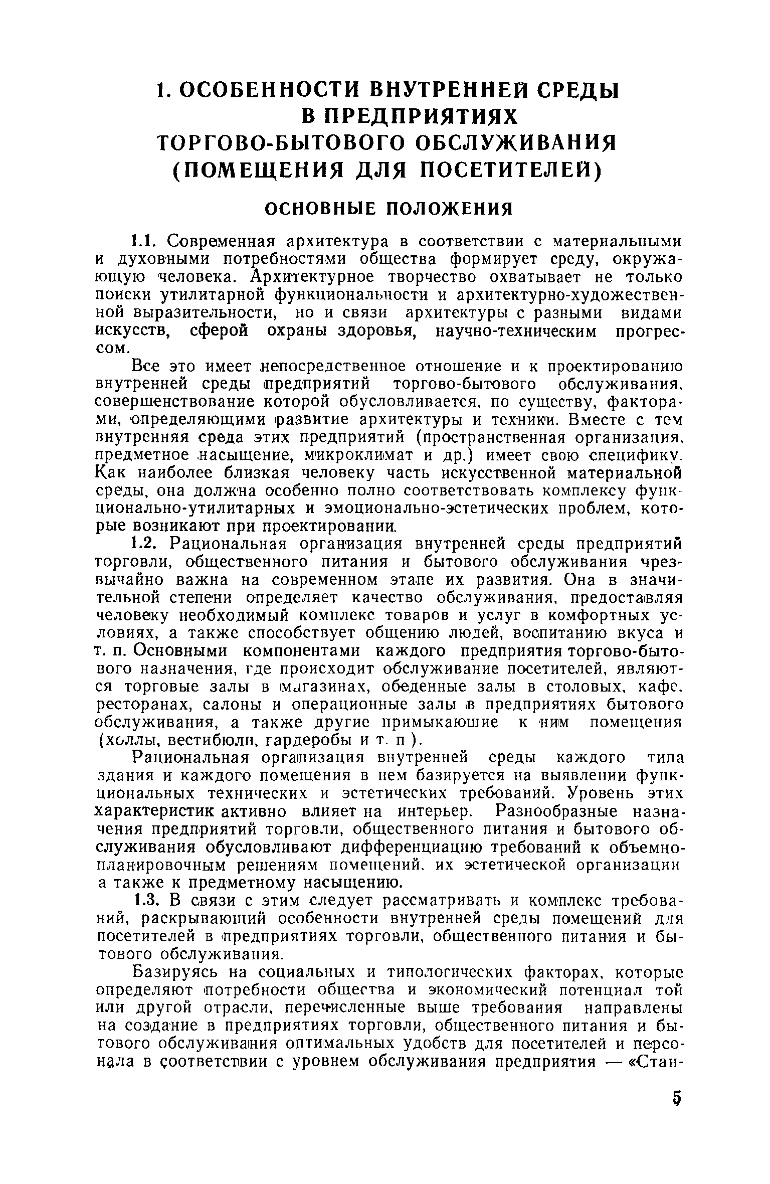 Руководство по проектированию внутренней среды предприятий торгово-бытового обслуживания| Статус: | справочные материалы, мп, тпр | | Название рус.: | Руководство по проектированию внутренней среды предприятий торгово-бытового обслуживания | | Дата добавления в базу: | 01.09.2013 | | Дата актуализации: | 01.01.2021 | | Область применения: | В документе приведены основные принципы формирования внутренней среды в зданиях предприятий торговли, общественного питания и бытового обслуживания, включая архитектурно-планировочные особенности, предметное насыщение. Собраны н систематизированы приемы решения и использования основных элементов, формирующих предметную среду (мебель, оборудование, декоративные элементы, визуальная информация и реклама). Составлена номенклатура элементов внутренней среды помещений для посетителей в предприятиях торгово-бытового обслуживания. Для специалистов в области проектирования, строительства и эксплуатации торгово-бытовых зданий. | | Оглавление: | Предисловие 1. Особенности внутренней среды в предприятиях торгово-бытового обслуживания (помещения для посетителей) Основные положения Функциональное зонирование, оборудование и мебель Отделочные материалы Цветовое решение Освещение Визуальные коммуникации и реклама Инженерное оборудование. Отопление и вентиляция Акустика 2. Здания торговли Универсамы Особенности организации внутренней среды Функциональная организация предметно-пространственной среды и мебель Архитектурно-художественные принципы решения предметно-пространственной среды Универмаги Особенности организации внутренней среды 3. Предприятия общественного питания Функциональная организация предметно-пространственной среды и мебель Архитектурно-художественные принципы решения предметно-пространственной среды Предприятия общественного питания, совмещающие функции питания и отдыха (кафе, рестораны общего типа и специализированные с индивидуальным обслуживанием) Функциональная организация предметно-пространственной среды Архитектурно-художественные принципы решения предметно-пространственной среды Предприятия "занимательного" питания Комплексные предприятия общественного питания 4. Предприятия бытового обслуживания Комплексные предприятия бытового обслуживания, Дома быта и Дома мод Особенности организации внутренней среды, функциональное зонирование Архитектурно-художественные принципы решения предметно-пространственной среды Комплексные предприятия бытового обслуживания. Комплексные приемные пункты Особенности организации внутренней среды, функциональное зонирование Архитектурно-художественные принципы решения предметно-пространственной среды Специализированные предприятия и мастерские по отдельным видам работ | | Разработан: | ЦНИИЭП торгово-бытовых зданий и туристских комплексов