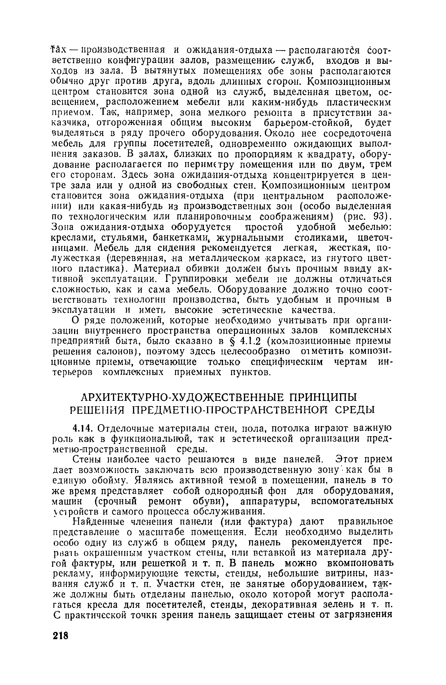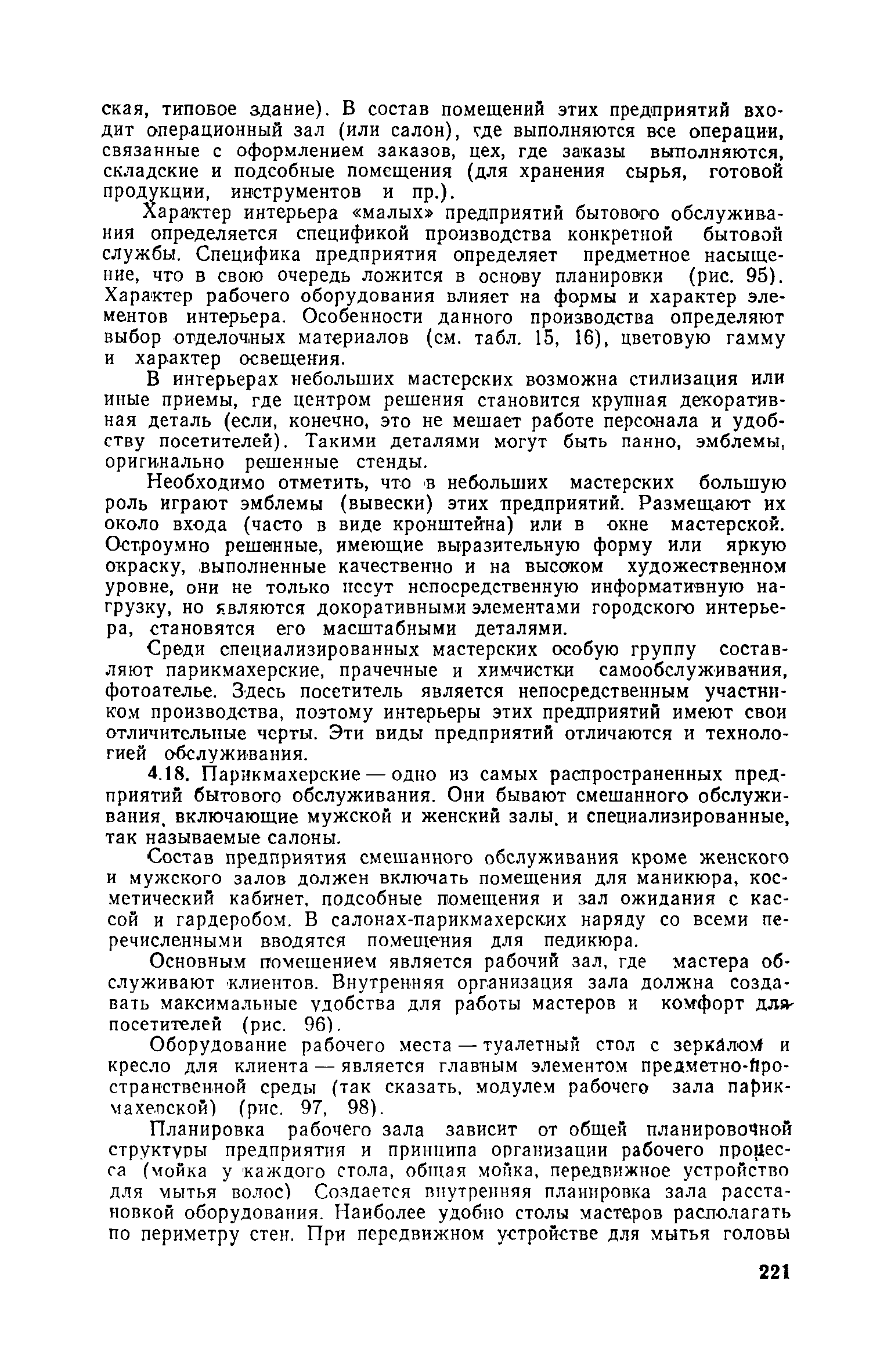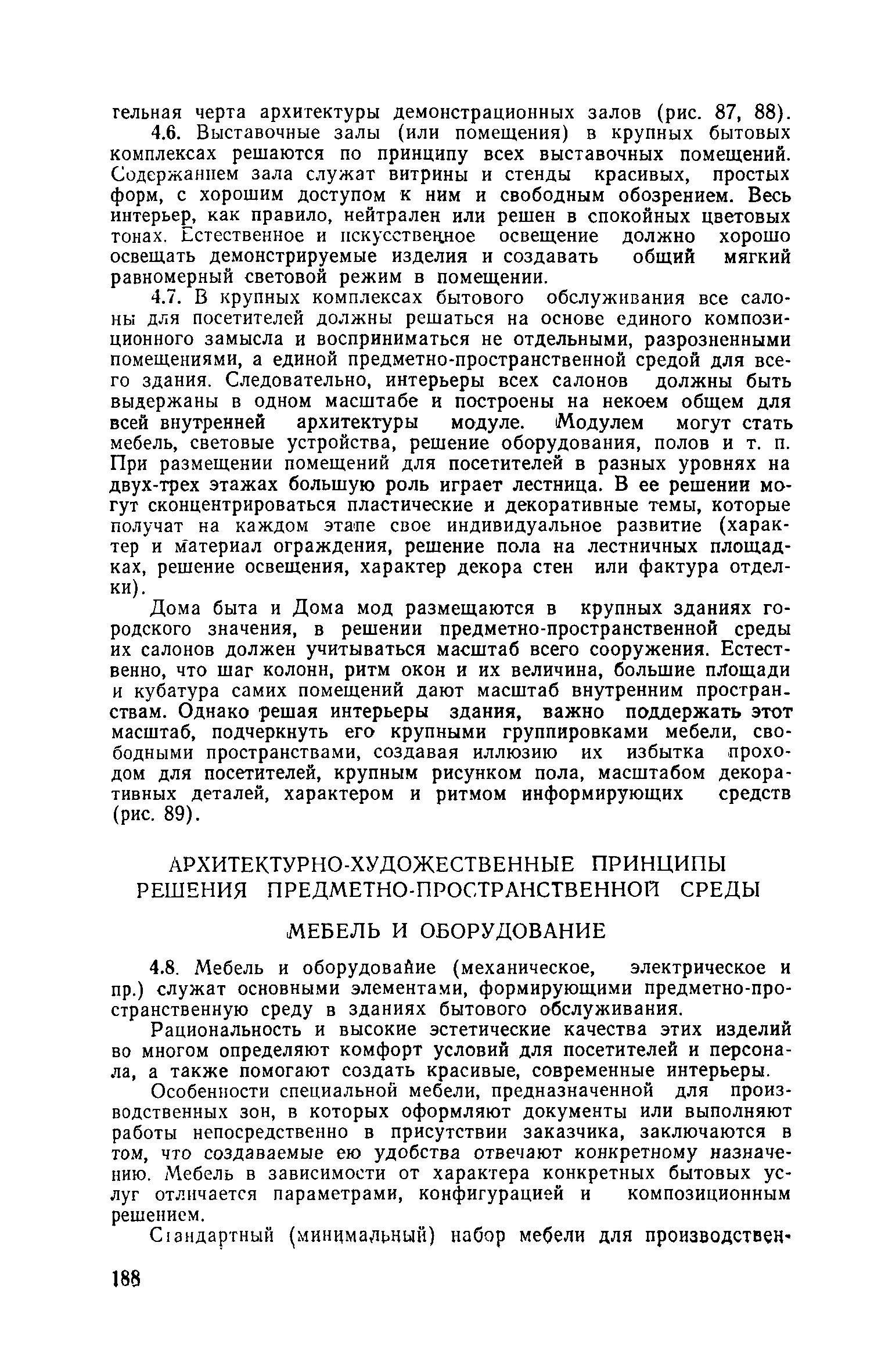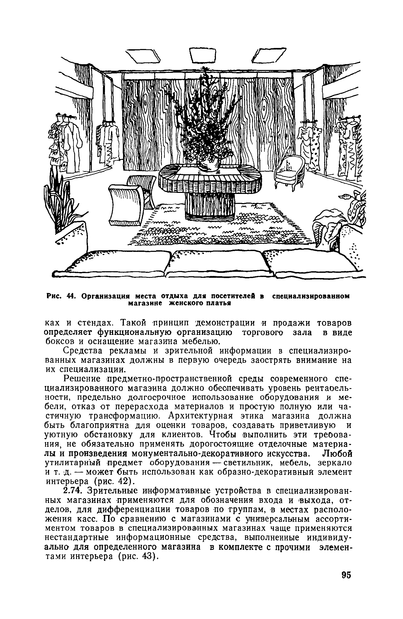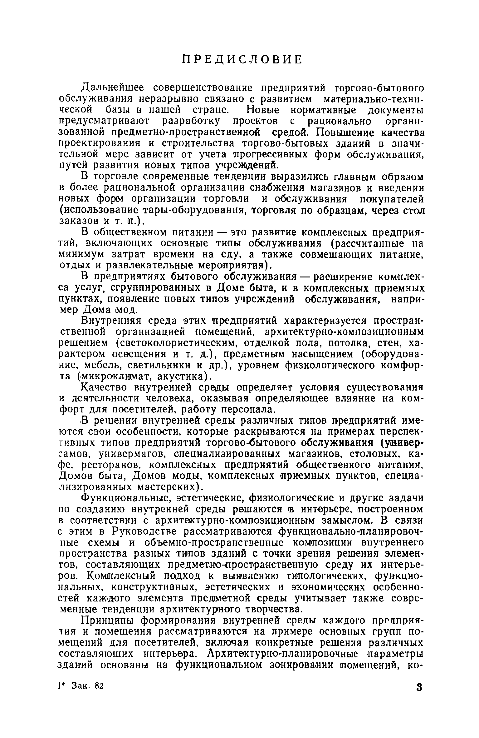 Руководство по проектированию внутренней среды предприятий торгово-бытового обслуживания| Статус: | справочные материалы, мп, тпр | | Название рус.: | Руководство по проектированию внутренней среды предприятий торгово-бытового обслуживания | | Дата добавления в базу: | 01.09.2013 | | Дата актуализации: | 01.01.2021 | | Область применения: | В документе приведены основные принципы формирования внутренней среды в зданиях предприятий торговли, общественного питания и бытового обслуживания, включая архитектурно-планировочные особенности, предметное насыщение. Собраны н систематизированы приемы решения и использования основных элементов, формирующих предметную среду (мебель, оборудование, декоративные элементы, визуальная информация и реклама). Составлена номенклатура элементов внутренней среды помещений для посетителей в предприятиях торгово-бытового обслуживания. Для специалистов в области проектирования, строительства и эксплуатации торгово-бытовых зданий. | | Оглавление: | Предисловие 1. Особенности внутренней среды в предприятиях торгово-бытового обслуживания (помещения для посетителей) Основные положения Функциональное зонирование, оборудование и мебель Отделочные материалы Цветовое решение Освещение Визуальные коммуникации и реклама Инженерное оборудование. Отопление и вентиляция Акустика 2. Здания торговли Универсамы Особенности организации внутренней среды Функциональная организация предметно-пространственной среды и мебель Архитектурно-художественные принципы решения предметно-пространственной среды Универмаги Особенности организации внутренней среды 3. Предприятия общественного питания Функциональная организация предметно-пространственной среды и мебель Архитектурно-художественные принципы решения предметно-пространственной среды Предприятия общественного питания, совмещающие функции питания и отдыха (кафе, рестораны общего типа и специализированные с индивидуальным обслуживанием) Функциональная организация предметно-пространственной среды Архитектурно-художественные принципы решения предметно-пространственной среды Предприятия "занимательного" питания Комплексные предприятия общественного питания 4. Предприятия бытового обслуживания Комплексные предприятия бытового обслуживания, Дома быта и Дома мод Особенности организации внутренней среды, функциональное зонирование Архитектурно-художественные принципы решения предметно-пространственной среды Комплексные предприятия бытового обслуживания. Комплексные приемные пункты Особенности организации внутренней среды, функциональное зонирование Архитектурно-художественные принципы решения предметно-пространственной среды Специализированные предприятия и мастерские по отдельным видам работ | | Разработан: | ЦНИИЭП торгово-бытовых зданий и туристских комплексов
