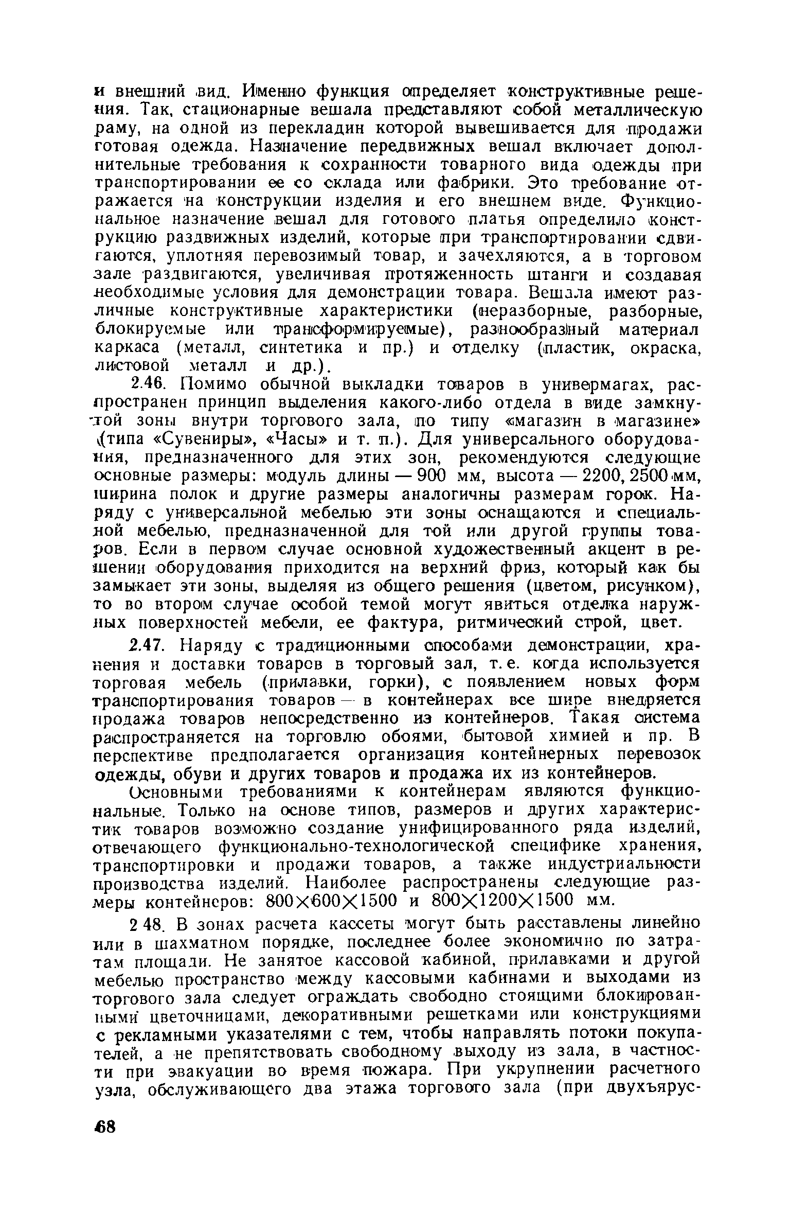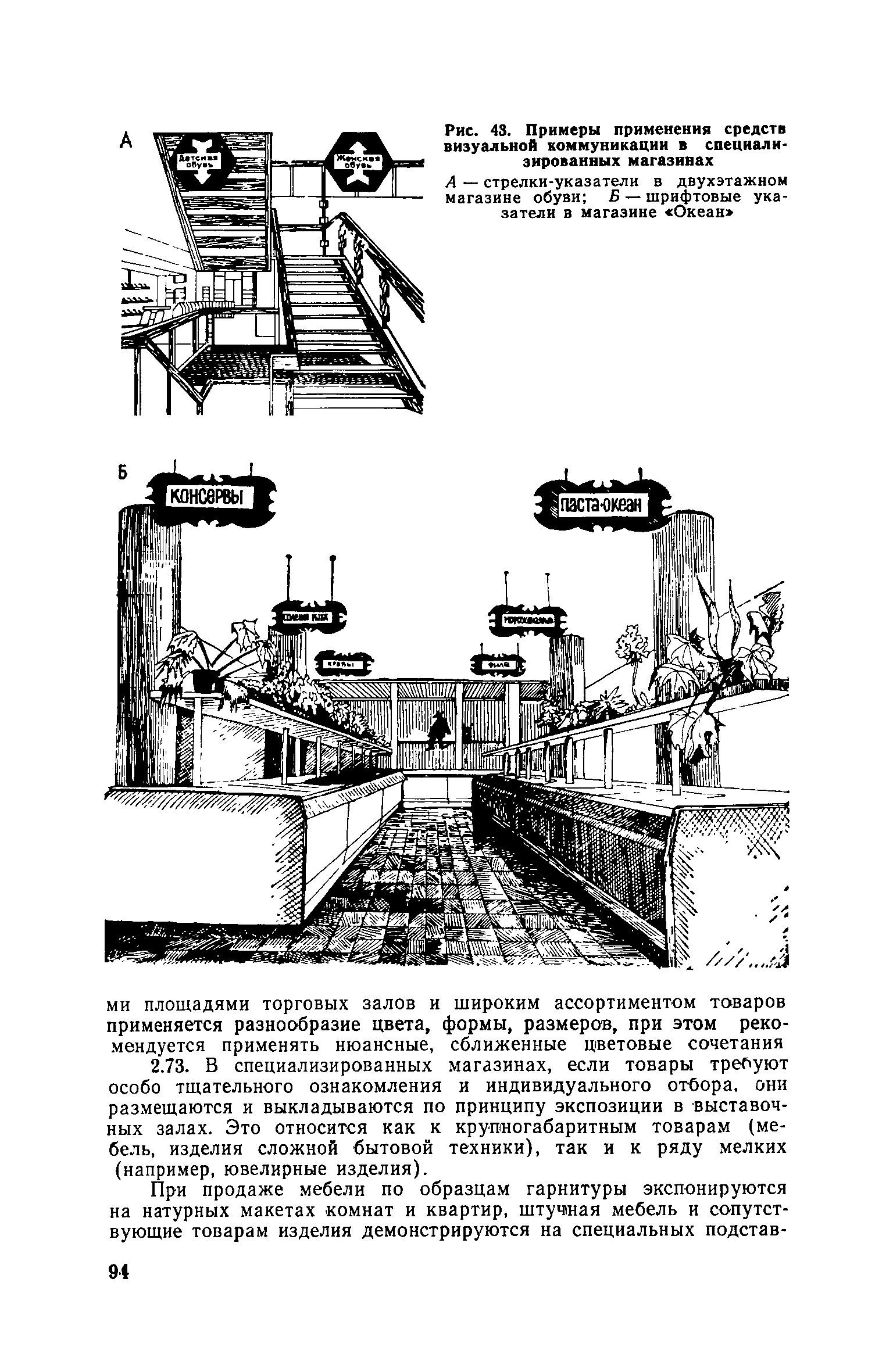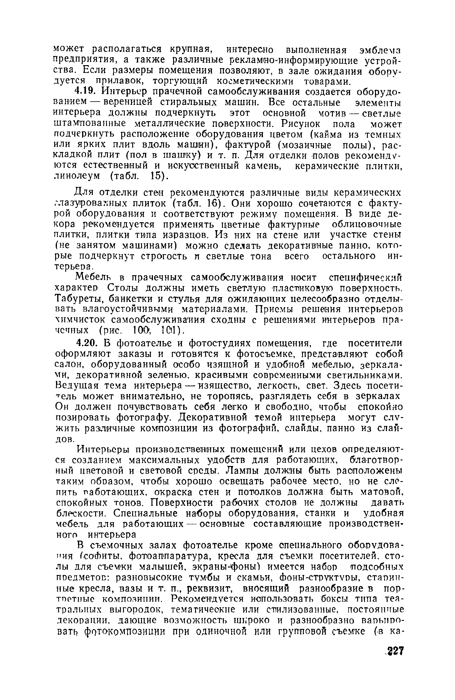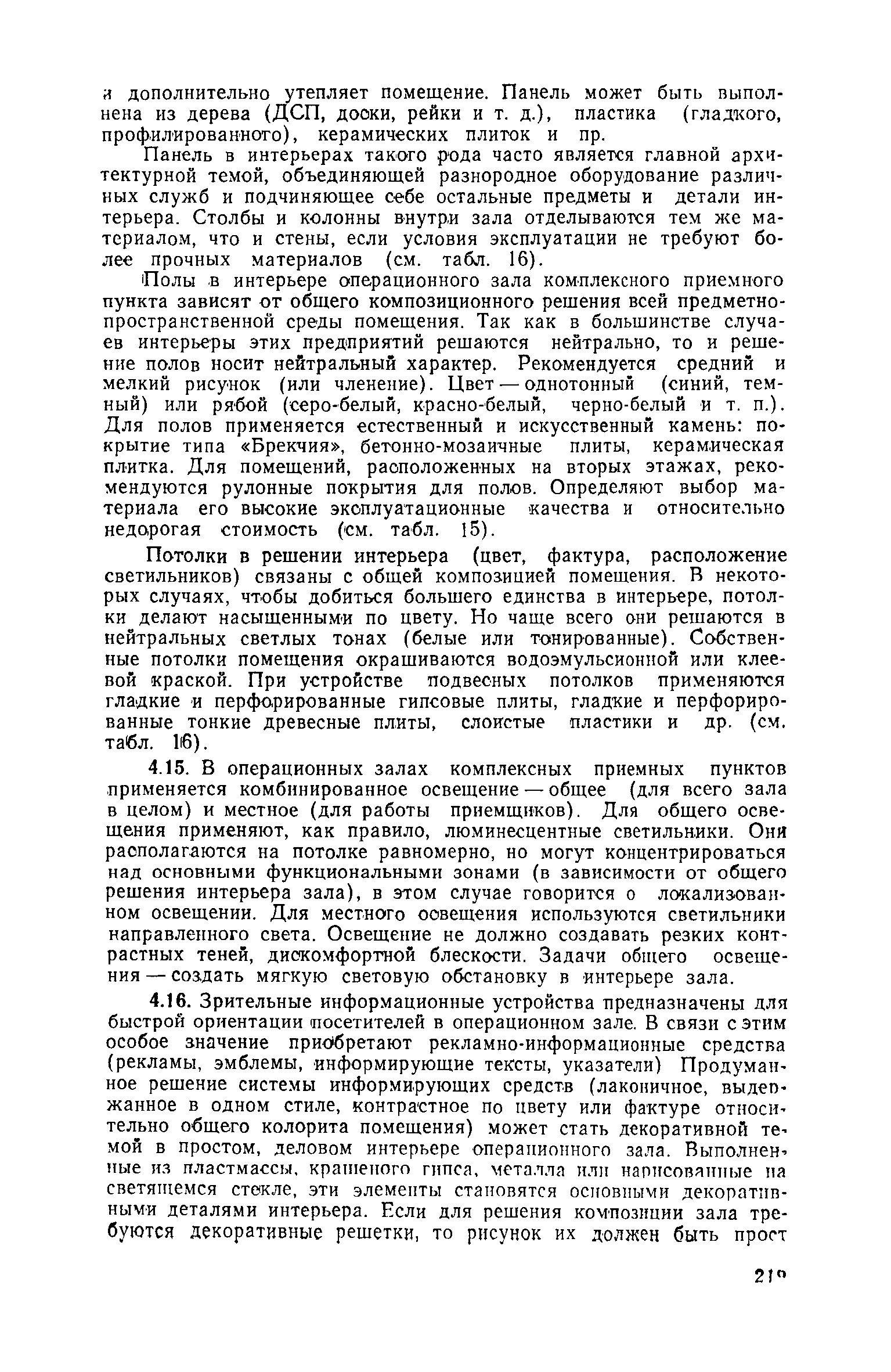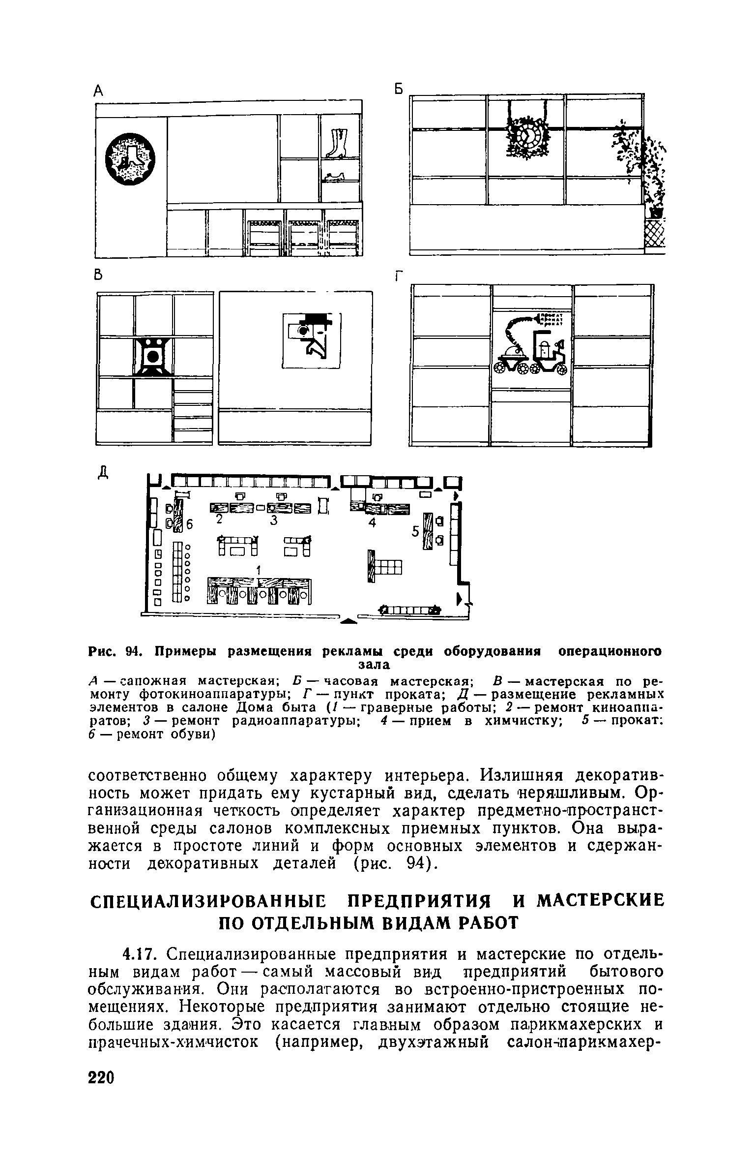 Руководство по проектированию внутренней среды предприятий торгово-бытового обслуживания| Статус: | справочные материалы, мп, тпр | | Название рус.: | Руководство по проектированию внутренней среды предприятий торгово-бытового обслуживания | | Дата добавления в базу: | 01.09.2013 | | Дата актуализации: | 01.01.2021 | | Область применения: | В документе приведены основные принципы формирования внутренней среды в зданиях предприятий торговли, общественного питания и бытового обслуживания, включая архитектурно-планировочные особенности, предметное насыщение. Собраны н систематизированы приемы решения и использования основных элементов, формирующих предметную среду (мебель, оборудование, декоративные элементы, визуальная информация и реклама). Составлена номенклатура элементов внутренней среды помещений для посетителей в предприятиях торгово-бытового обслуживания. Для специалистов в области проектирования, строительства и эксплуатации торгово-бытовых зданий. | | Оглавление: | Предисловие 1. Особенности внутренней среды в предприятиях торгово-бытового обслуживания (помещения для посетителей) Основные положения Функциональное зонирование, оборудование и мебель Отделочные материалы Цветовое решение Освещение Визуальные коммуникации и реклама Инженерное оборудование. Отопление и вентиляция Акустика 2. Здания торговли Универсамы Особенности организации внутренней среды Функциональная организация предметно-пространственной среды и мебель Архитектурно-художественные принципы решения предметно-пространственной среды Универмаги Особенности организации внутренней среды 3. Предприятия общественного питания Функциональная организация предметно-пространственной среды и мебель Архитектурно-художественные принципы решения предметно-пространственной среды Предприятия общественного питания, совмещающие функции питания и отдыха (кафе, рестораны общего типа и специализированные с индивидуальным обслуживанием) Функциональная организация предметно-пространственной среды Архитектурно-художественные принципы решения предметно-пространственной среды Предприятия "занимательного" питания Комплексные предприятия общественного питания 4. Предприятия бытового обслуживания Комплексные предприятия бытового обслуживания, Дома быта и Дома мод Особенности организации внутренней среды, функциональное зонирование Архитектурно-художественные принципы решения предметно-пространственной среды Комплексные предприятия бытового обслуживания. Комплексные приемные пункты Особенности организации внутренней среды, функциональное зонирование Архитектурно-художественные принципы решения предметно-пространственной среды Специализированные предприятия и мастерские по отдельным видам работ | | Разработан: | ЦНИИЭП торгово-бытовых зданий и туристских комплексов