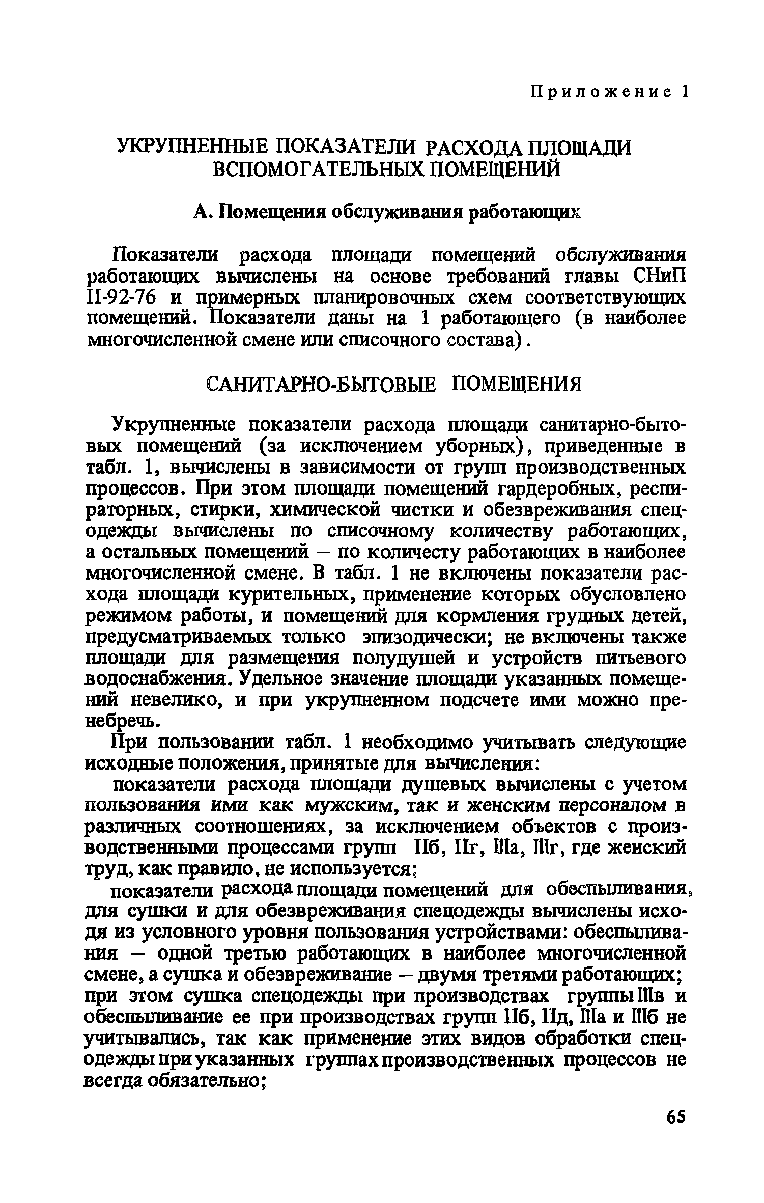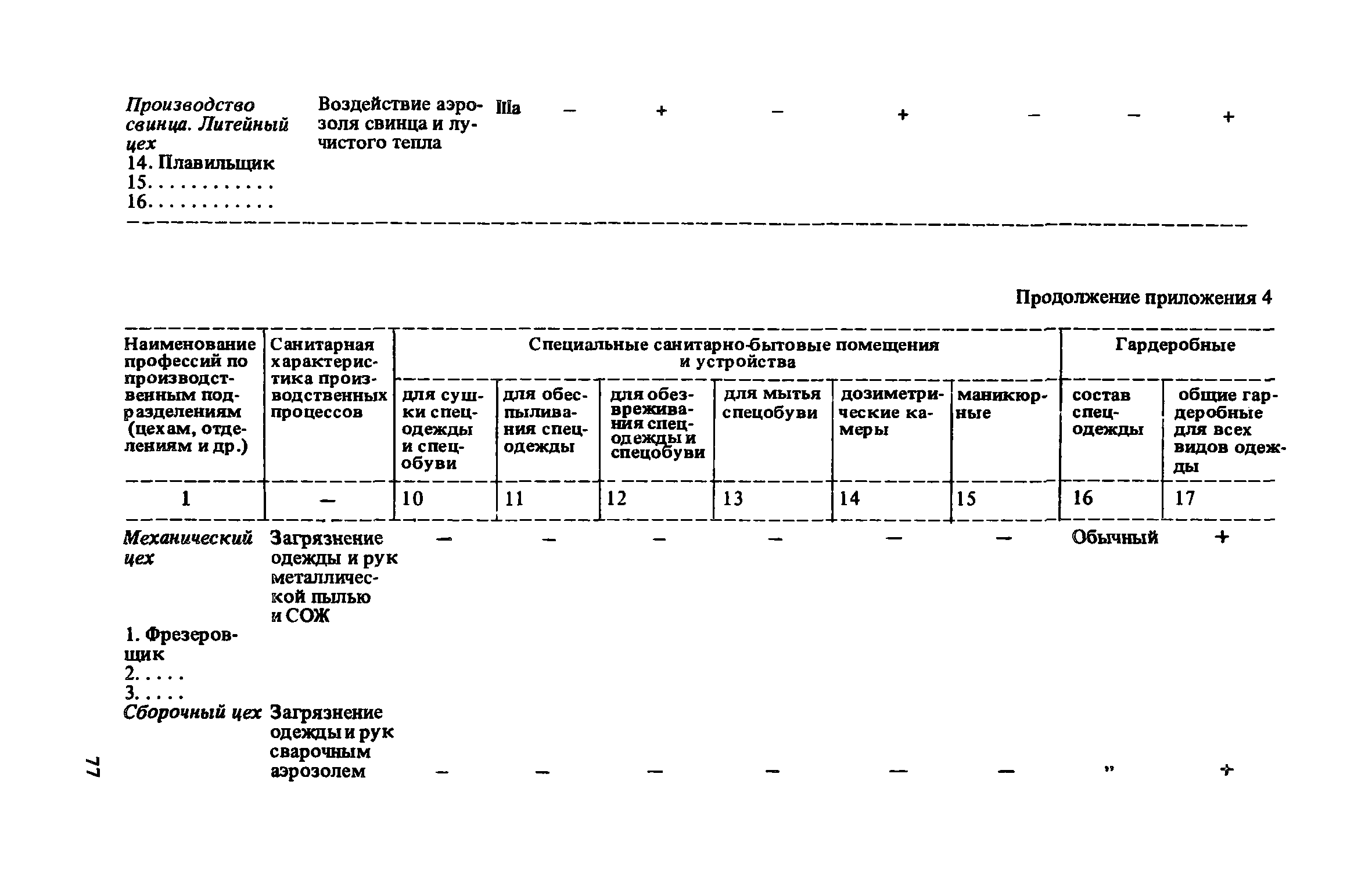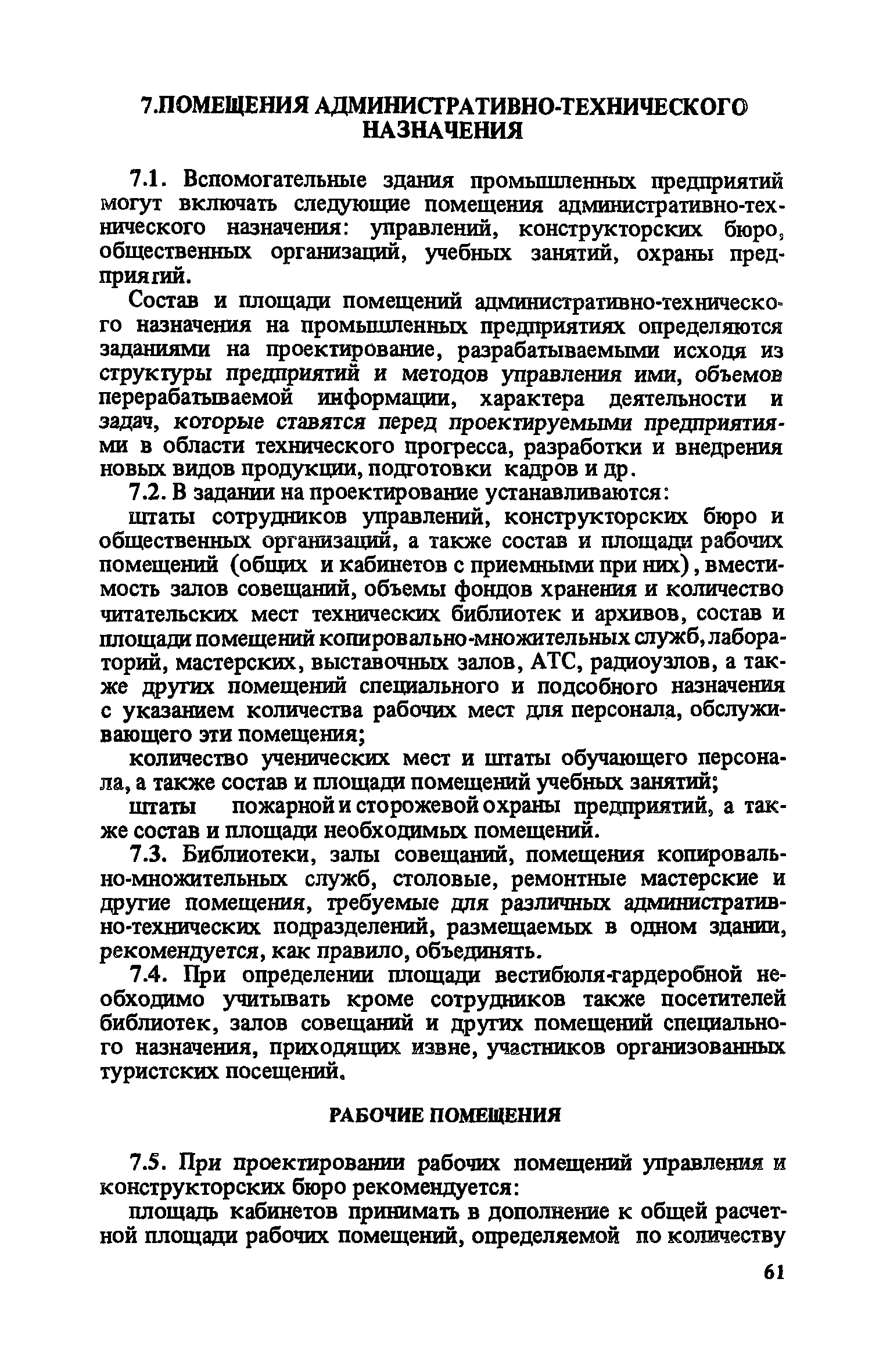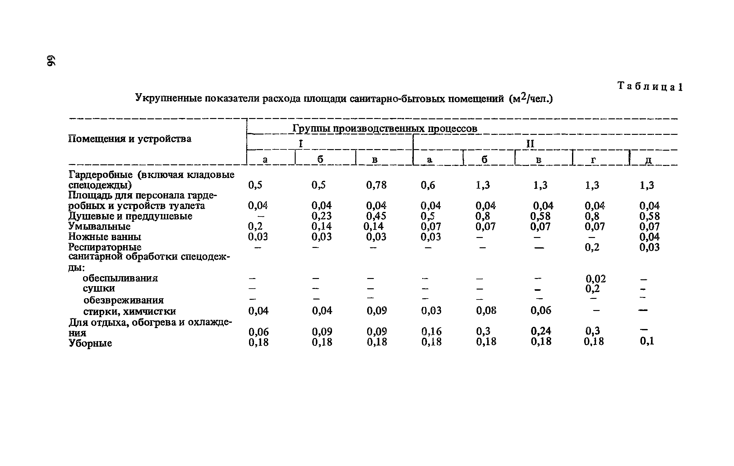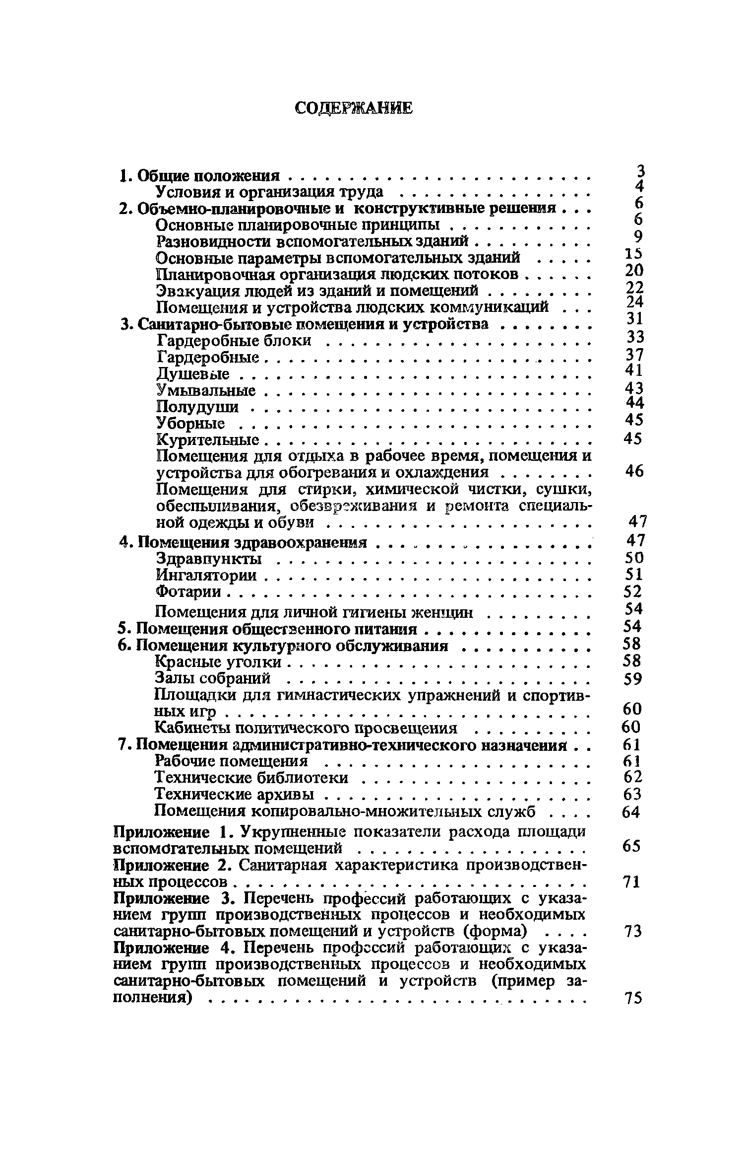 | Оглавление: | 1. Общие положения Условия и организация труда 2. Объемно-планировочные и конструктивные решения Основные планировочные принципы Разновидности вспомогательных зданий Основные параметры вспомогательных зданий Планировочная организация людских потоков Эвакуация людей из зданий и помещений Помещения и устройства людских коммуникаций 3. Санитарно-бытовые помещения и устройства Гардеробные блоки Гардеробные Душевые Умывальные Полудуши Уборные Курительные Помещения для отдыха в рабочее время, помещения и устройства для обогревания и охлаждения Помещения для стирки, химической щетки, сушки, обеспыливания, обезвреживания и ремонта специальной одежды и обуви 4. Помещения здравоохранения Здравпункты Ингалятории Фотарии Помещения для личной гигиены женщин 5. Помещения общественного питания 6. Помещения культурного обслуживания Красные уголки Залы собраний Площадки для гимнастических упражнений и спортивных игр Кабинеты политического просвещения 7. Помещения административно-технического назначения. Рабочие помещения Технические библиотеки Технические архивы Помещения копировально-множительных служб Приложение 1. Укрупненные показатели расхода площади вспомогательных помещений Приложение 2. Санитарная характеристика производственных процессов Приложение 3. Перечень профессий работающих с указанием групп производственных процессов и необходимых санитарно-бытовых помещений и устройств (форма) Приложение 4. Перечень профессий работающих с указанием групп производственных процессов и необходимых санитарно-бытовых помещений и устройств (пример заполнения) |