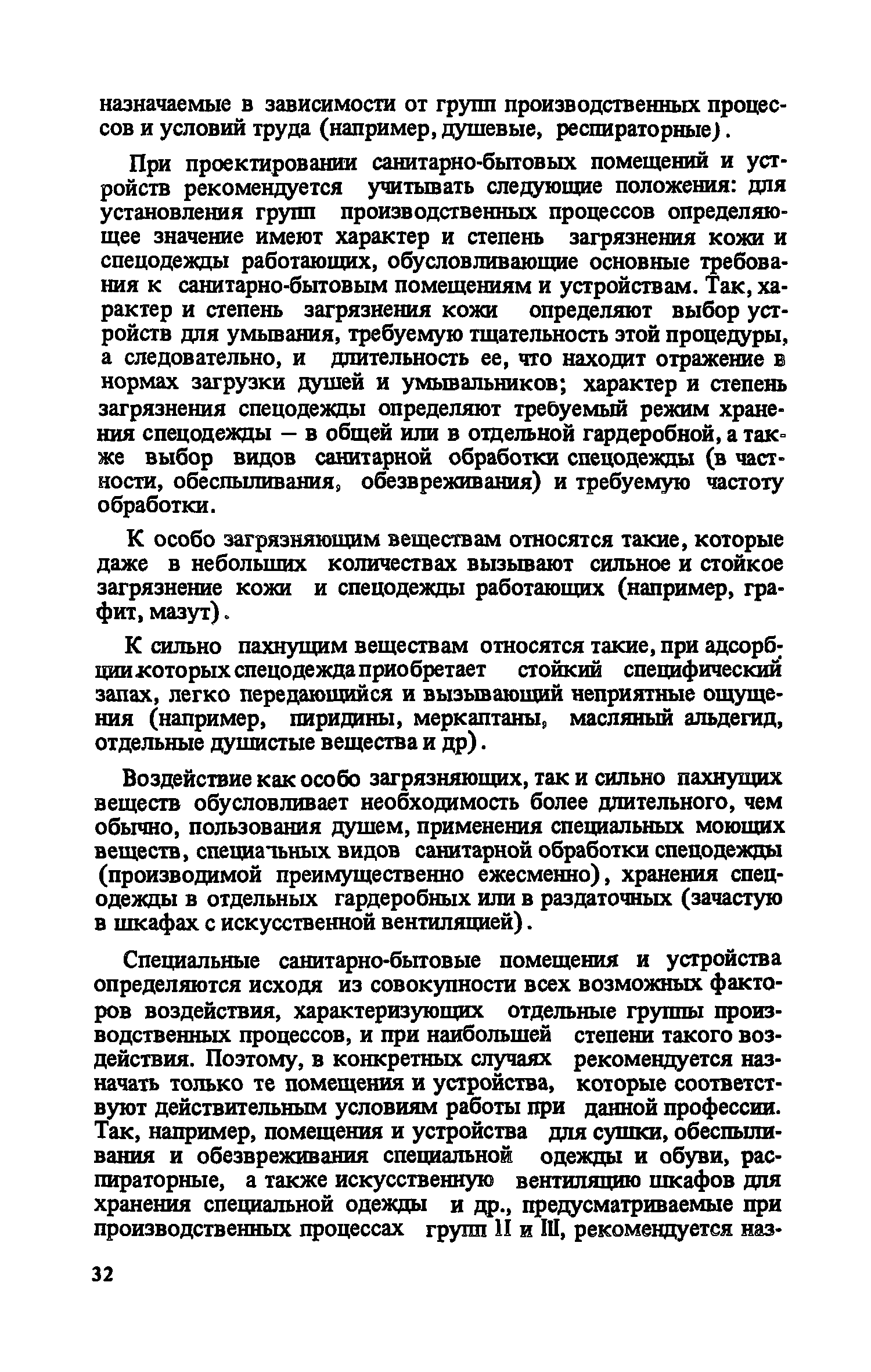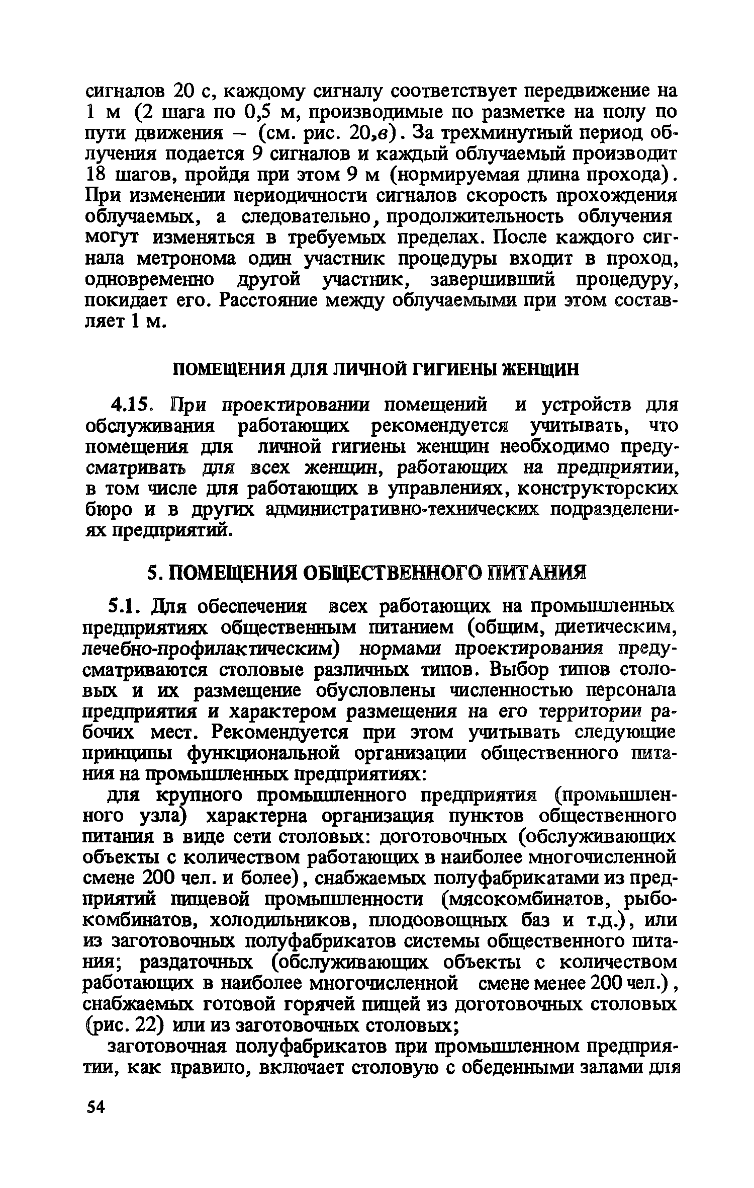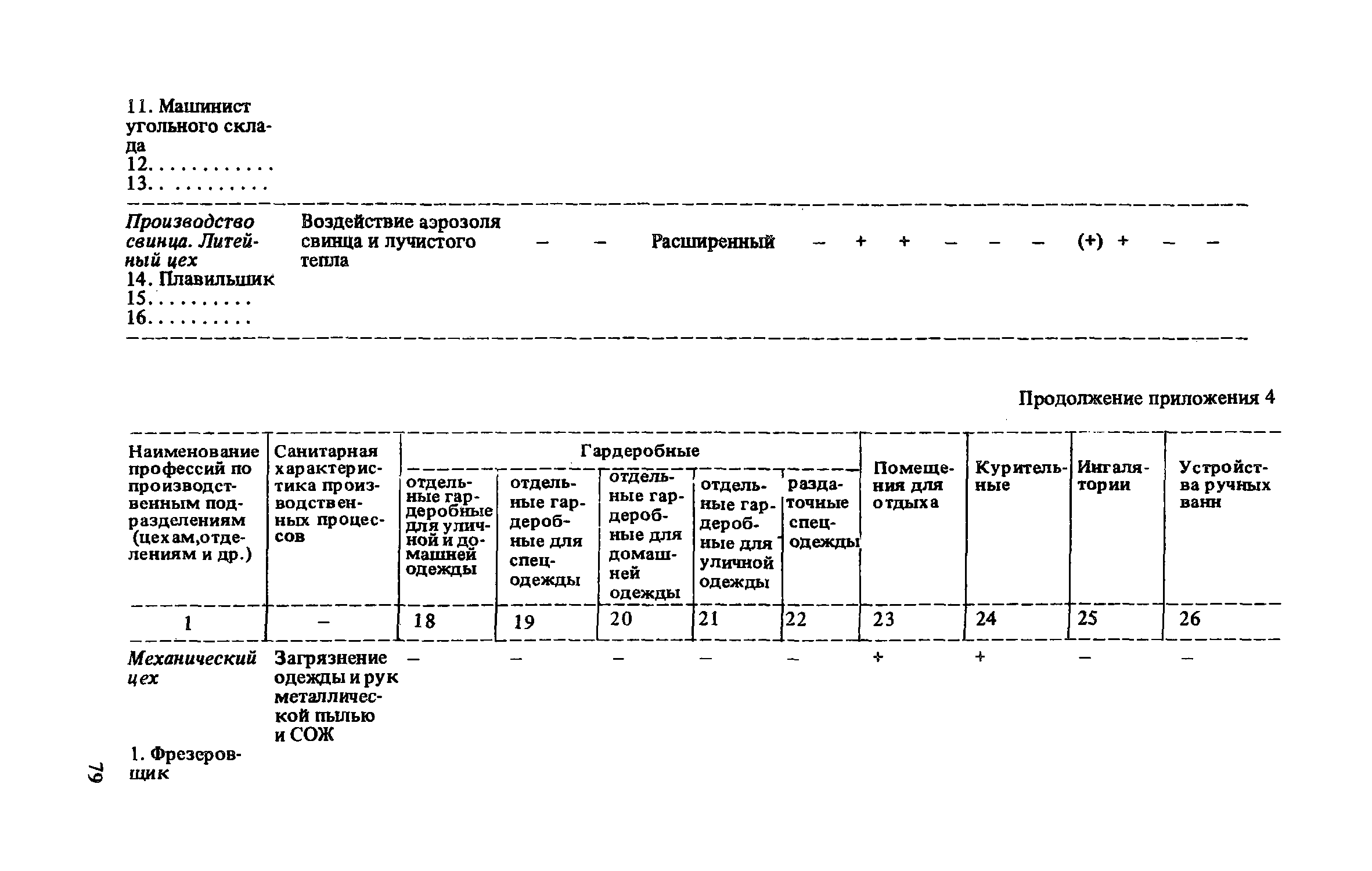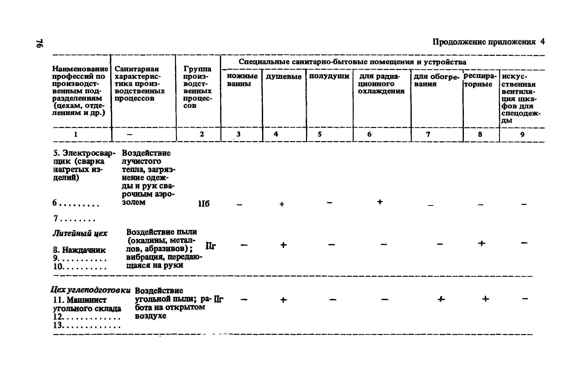 | Оглавление: | 1. Общие положения Условия и организация труда 2. Объемно-планировочные и конструктивные решения Основные планировочные принципы Разновидности вспомогательных зданий Основные параметры вспомогательных зданий Планировочная организация людских потоков Эвакуация людей из зданий и помещений Помещения и устройства людских коммуникаций 3. Санитарно-бытовые помещения и устройства Гардеробные блоки Гардеробные Душевые Умывальные Полудуши Уборные Курительные Помещения для отдыха в рабочее время, помещения и устройства для обогревания и охлаждения Помещения для стирки, химической щетки, сушки, обеспыливания, обезвреживания и ремонта специальной одежды и обуви 4. Помещения здравоохранения Здравпункты Ингалятории Фотарии Помещения для личной гигиены женщин 5. Помещения общественного питания 6. Помещения культурного обслуживания Красные уголки Залы собраний Площадки для гимнастических упражнений и спортивных игр Кабинеты политического просвещения 7. Помещения административно-технического назначения. Рабочие помещения Технические библиотеки Технические архивы Помещения копировально-множительных служб Приложение 1. Укрупненные показатели расхода площади вспомогательных помещений Приложение 2. Санитарная характеристика производственных процессов Приложение 3. Перечень профессий работающих с указанием групп производственных процессов и необходимых санитарно-бытовых помещений и устройств (форма) Приложение 4. Перечень профессий работающих с указанием групп производственных процессов и необходимых санитарно-бытовых помещений и устройств (пример заполнения) |