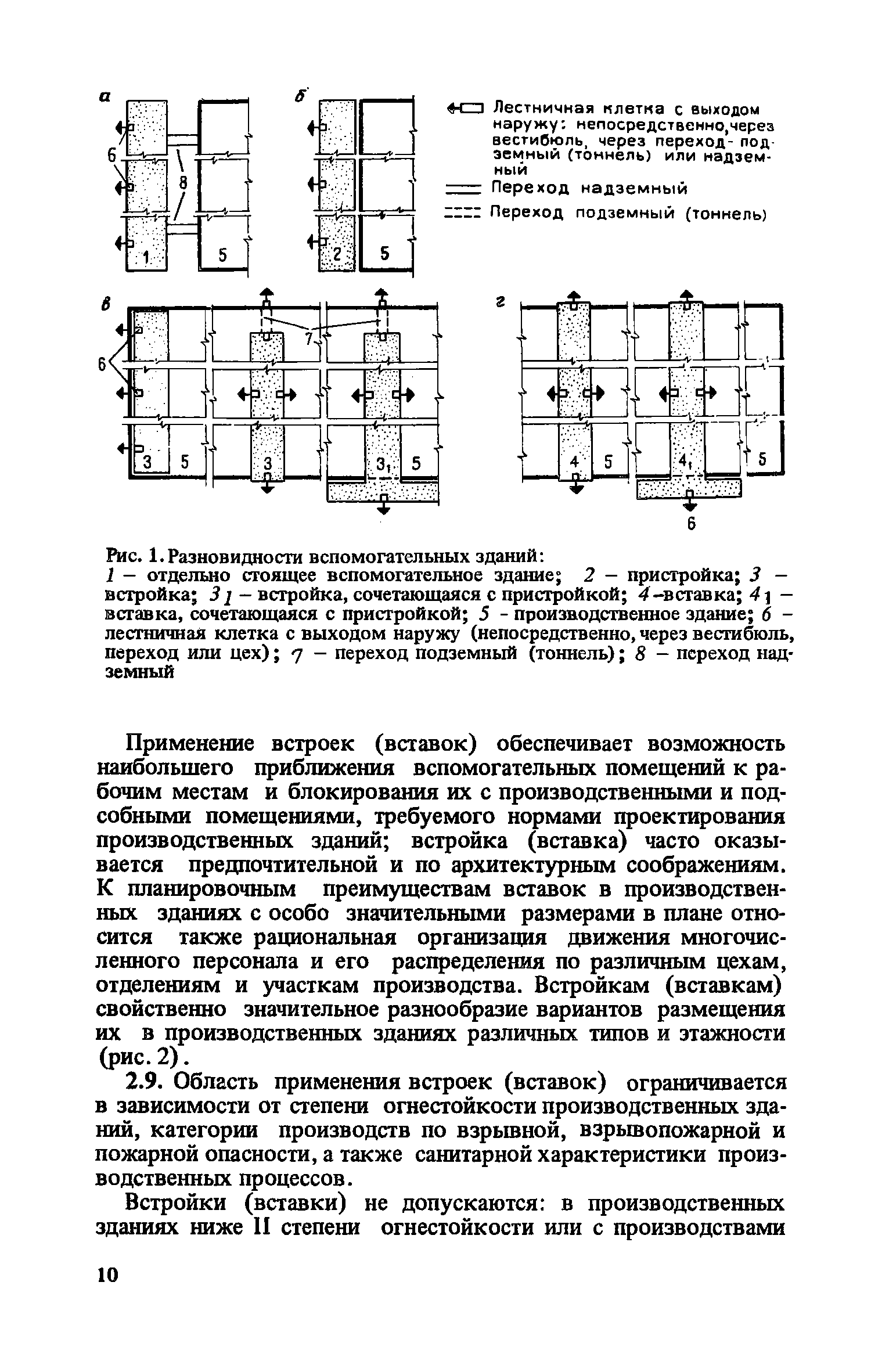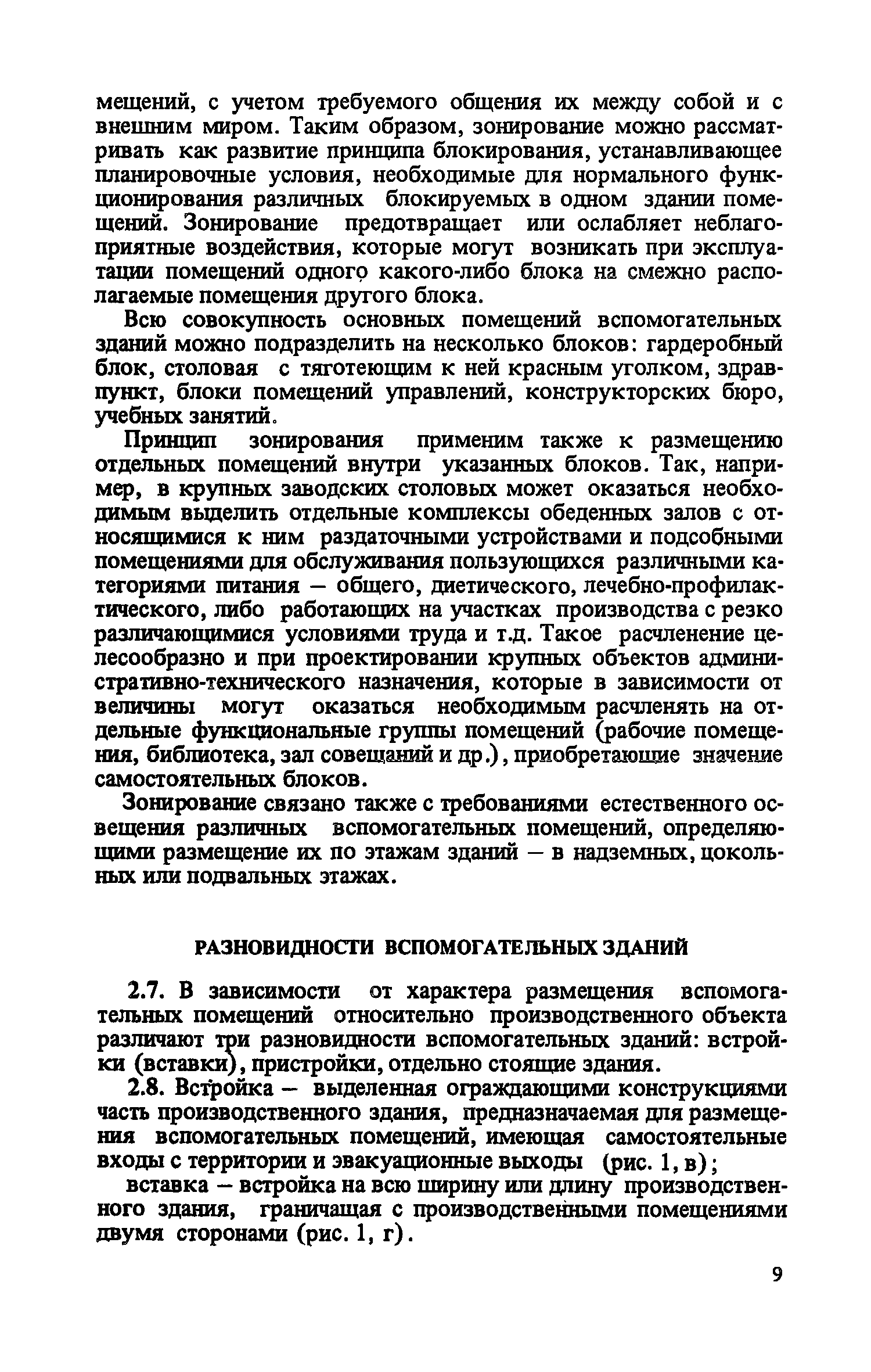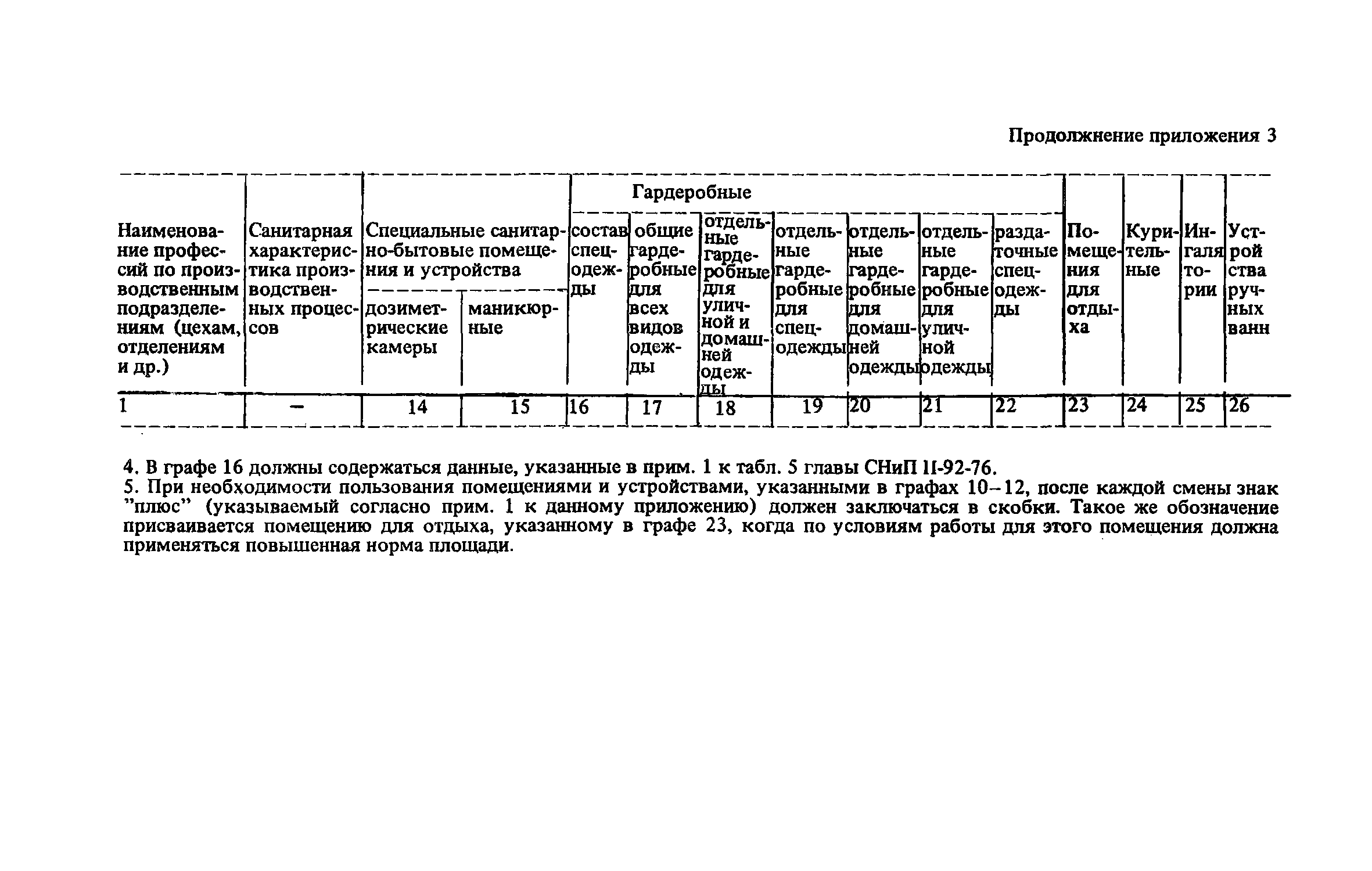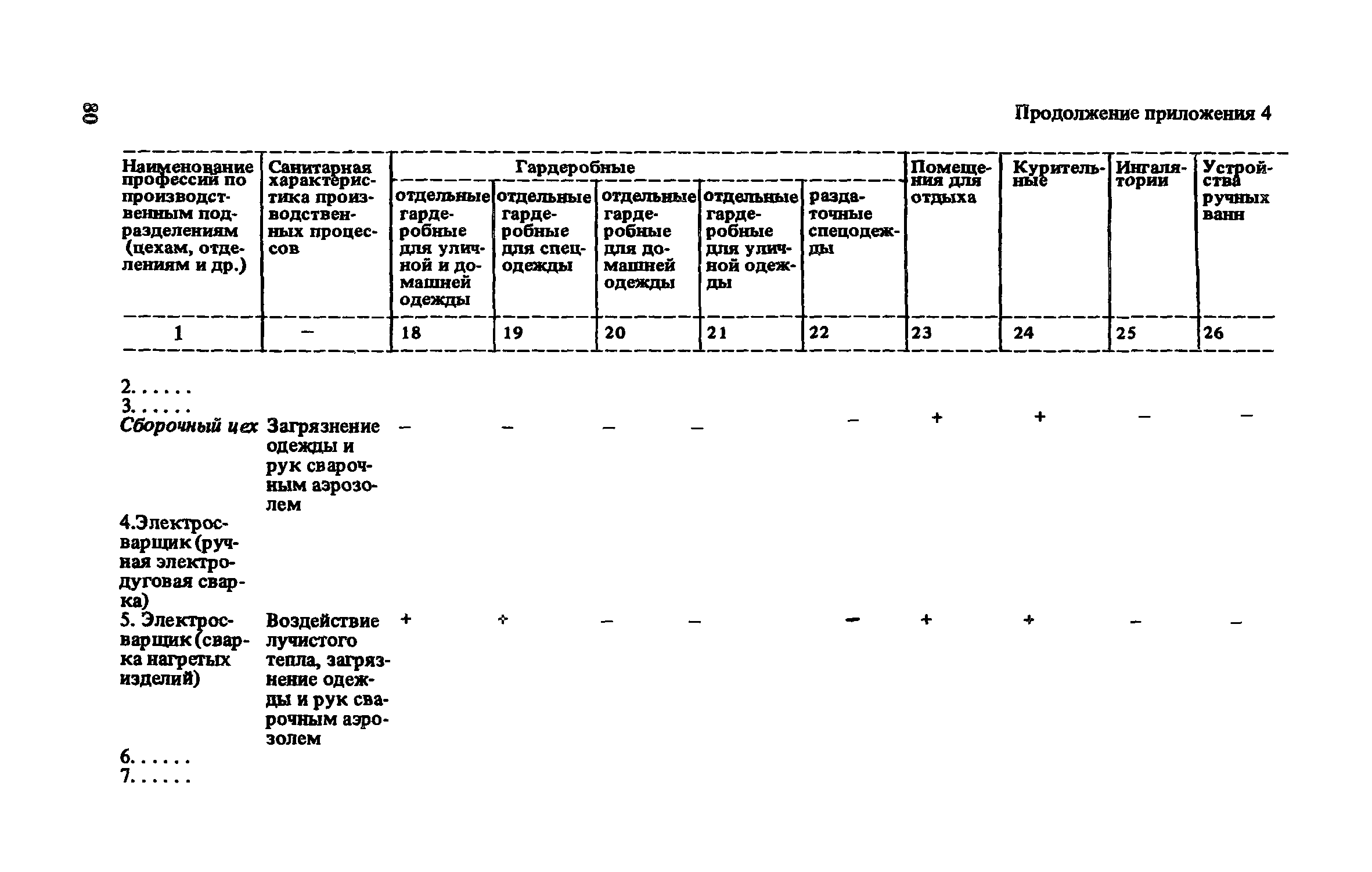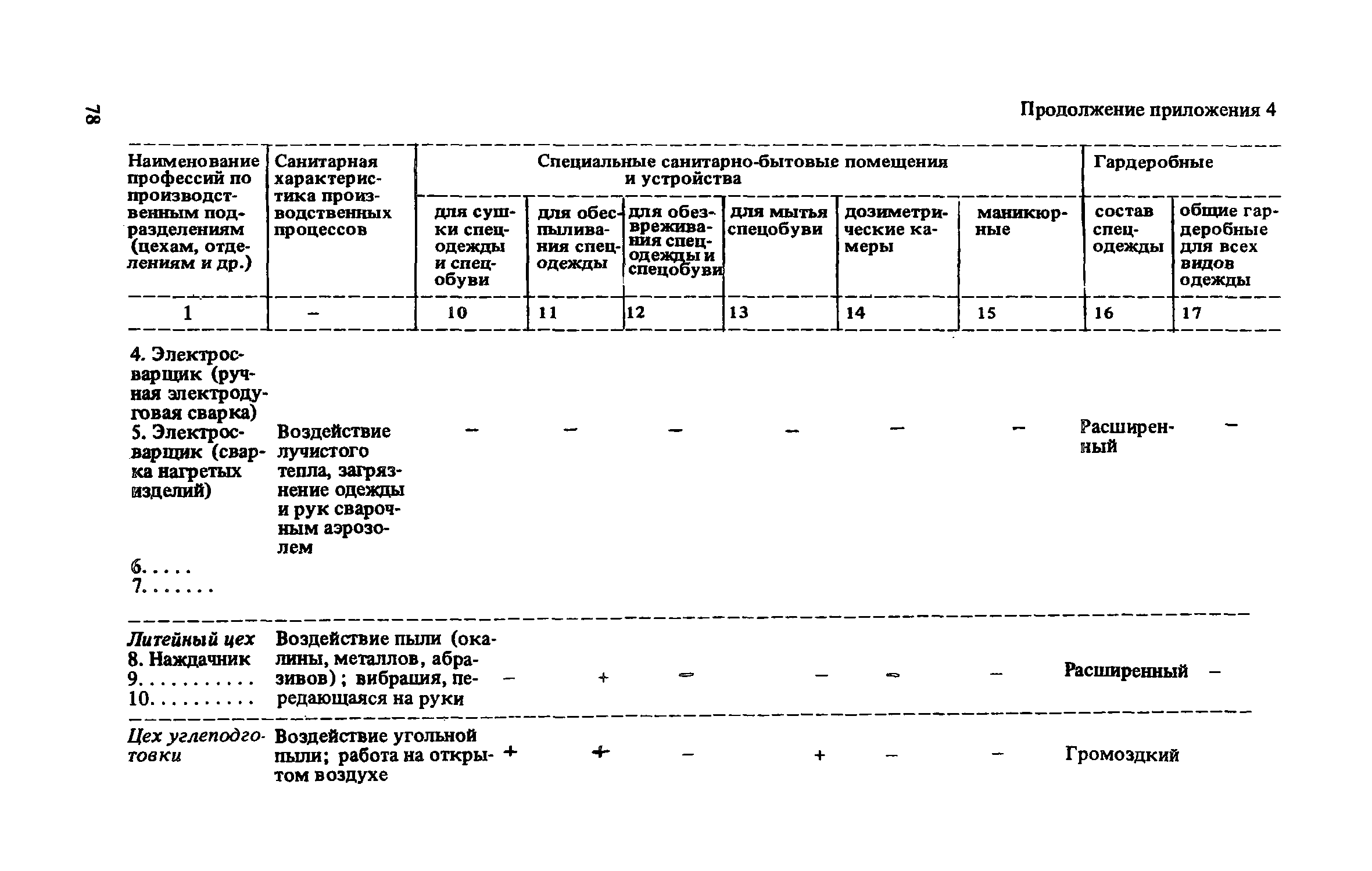 | Оглавление: | 1. Общие положения Условия и организация труда 2. Объемно-планировочные и конструктивные решения Основные планировочные принципы Разновидности вспомогательных зданий Основные параметры вспомогательных зданий Планировочная организация людских потоков Эвакуация людей из зданий и помещений Помещения и устройства людских коммуникаций 3. Санитарно-бытовые помещения и устройства Гардеробные блоки Гардеробные Душевые Умывальные Полудуши Уборные Курительные Помещения для отдыха в рабочее время, помещения и устройства для обогревания и охлаждения Помещения для стирки, химической щетки, сушки, обеспыливания, обезвреживания и ремонта специальной одежды и обуви 4. Помещения здравоохранения Здравпункты Ингалятории Фотарии Помещения для личной гигиены женщин 5. Помещения общественного питания 6. Помещения культурного обслуживания Красные уголки Залы собраний Площадки для гимнастических упражнений и спортивных игр Кабинеты политического просвещения 7. Помещения административно-технического назначения. Рабочие помещения Технические библиотеки Технические архивы Помещения копировально-множительных служб Приложение 1. Укрупненные показатели расхода площади вспомогательных помещений Приложение 2. Санитарная характеристика производственных процессов Приложение 3. Перечень профессий работающих с указанием групп производственных процессов и необходимых санитарно-бытовых помещений и устройств (форма) Приложение 4. Перечень профессий работающих с указанием групп производственных процессов и необходимых санитарно-бытовых помещений и устройств (пример заполнения) |