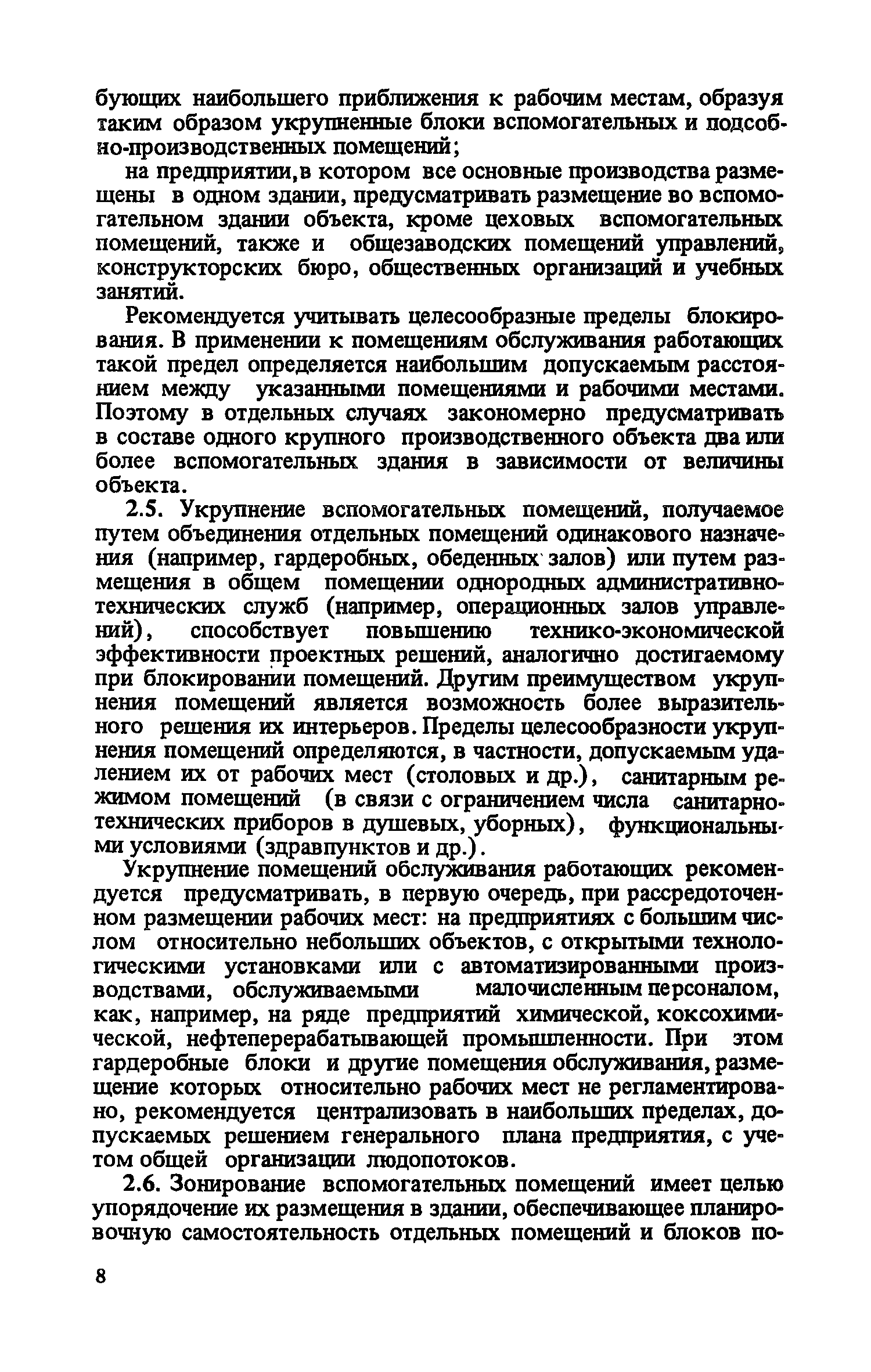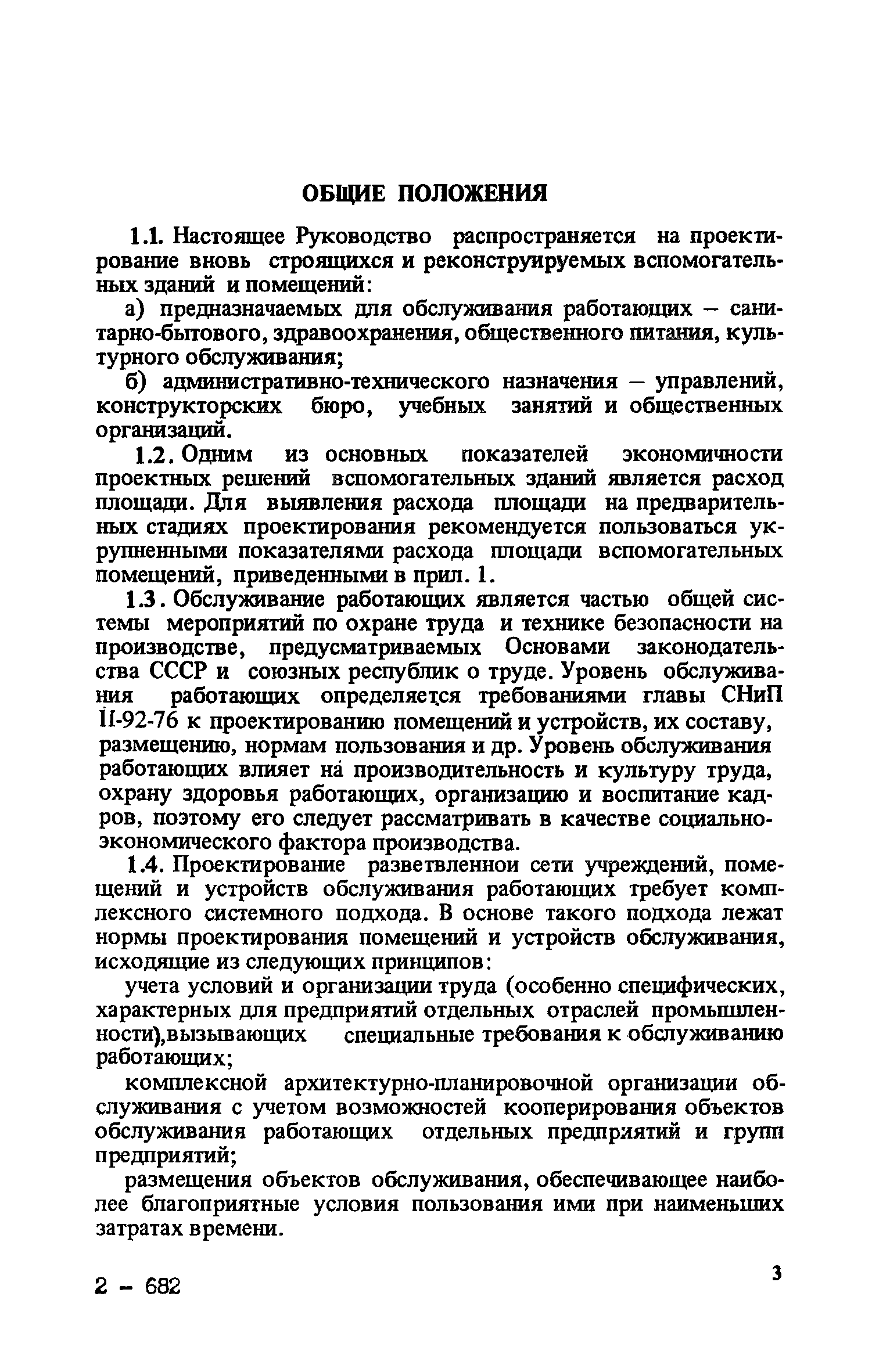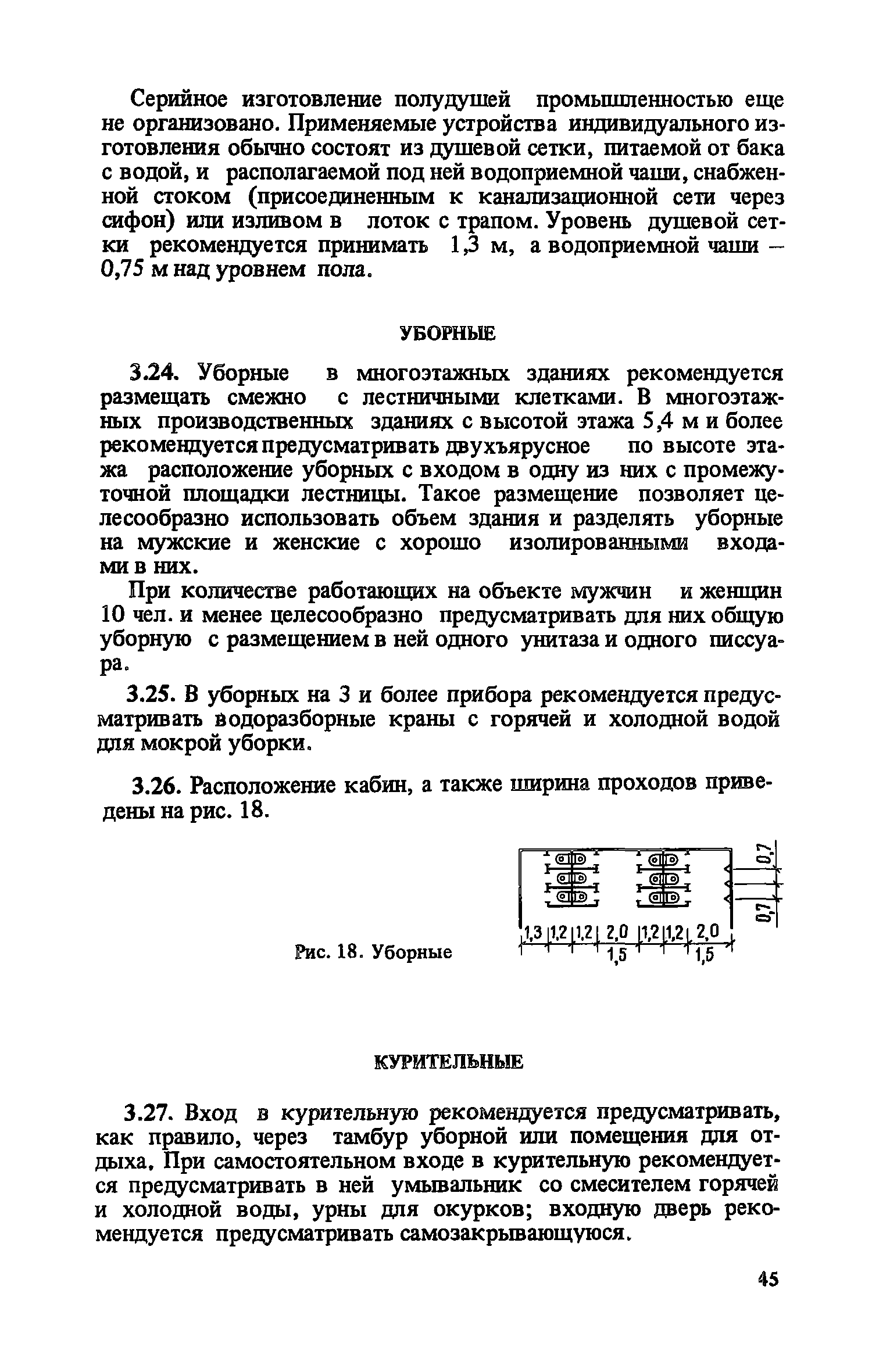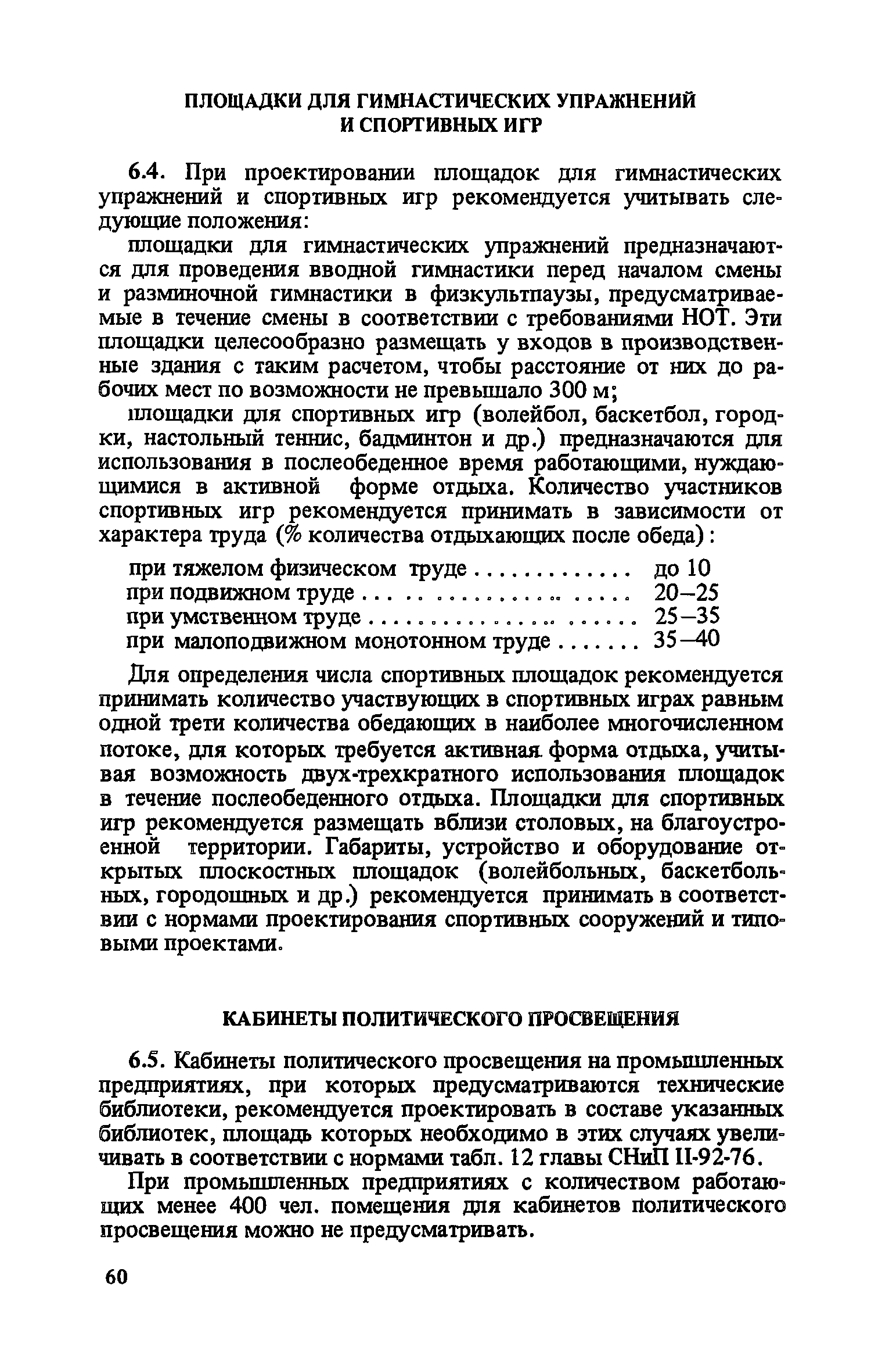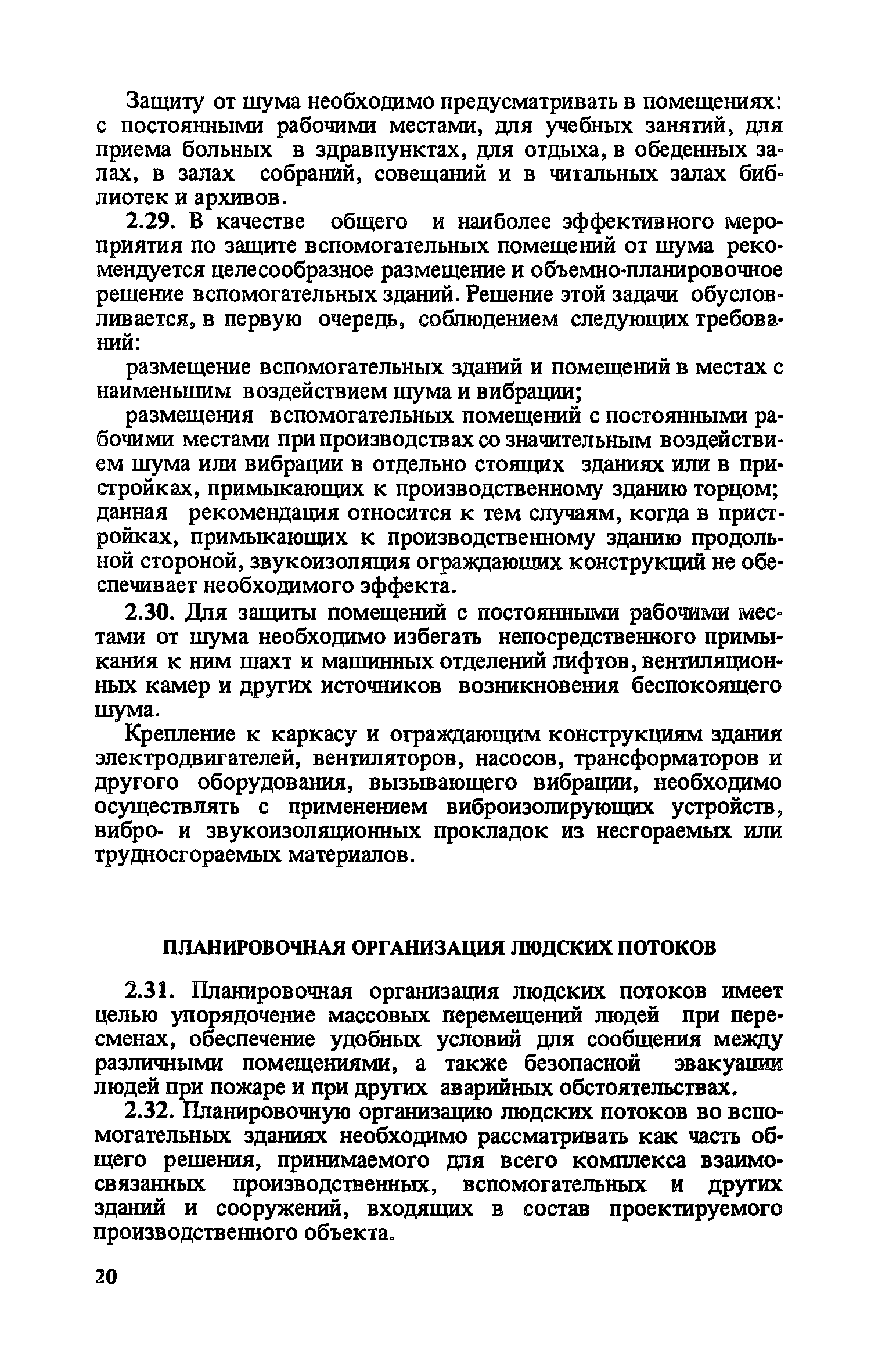 | Оглавление: | 1. Общие положения Условия и организация труда 2. Объемно-планировочные и конструктивные решения Основные планировочные принципы Разновидности вспомогательных зданий Основные параметры вспомогательных зданий Планировочная организация людских потоков Эвакуация людей из зданий и помещений Помещения и устройства людских коммуникаций 3. Санитарно-бытовые помещения и устройства Гардеробные блоки Гардеробные Душевые Умывальные Полудуши Уборные Курительные Помещения для отдыха в рабочее время, помещения и устройства для обогревания и охлаждения Помещения для стирки, химической щетки, сушки, обеспыливания, обезвреживания и ремонта специальной одежды и обуви 4. Помещения здравоохранения Здравпункты Ингалятории Фотарии Помещения для личной гигиены женщин 5. Помещения общественного питания 6. Помещения культурного обслуживания Красные уголки Залы собраний Площадки для гимнастических упражнений и спортивных игр Кабинеты политического просвещения 7. Помещения административно-технического назначения. Рабочие помещения Технические библиотеки Технические архивы Помещения копировально-множительных служб Приложение 1. Укрупненные показатели расхода площади вспомогательных помещений Приложение 2. Санитарная характеристика производственных процессов Приложение 3. Перечень профессий работающих с указанием групп производственных процессов и необходимых санитарно-бытовых помещений и устройств (форма) Приложение 4. Перечень профессий работающих с указанием групп производственных процессов и необходимых санитарно-бытовых помещений и устройств (пример заполнения) |