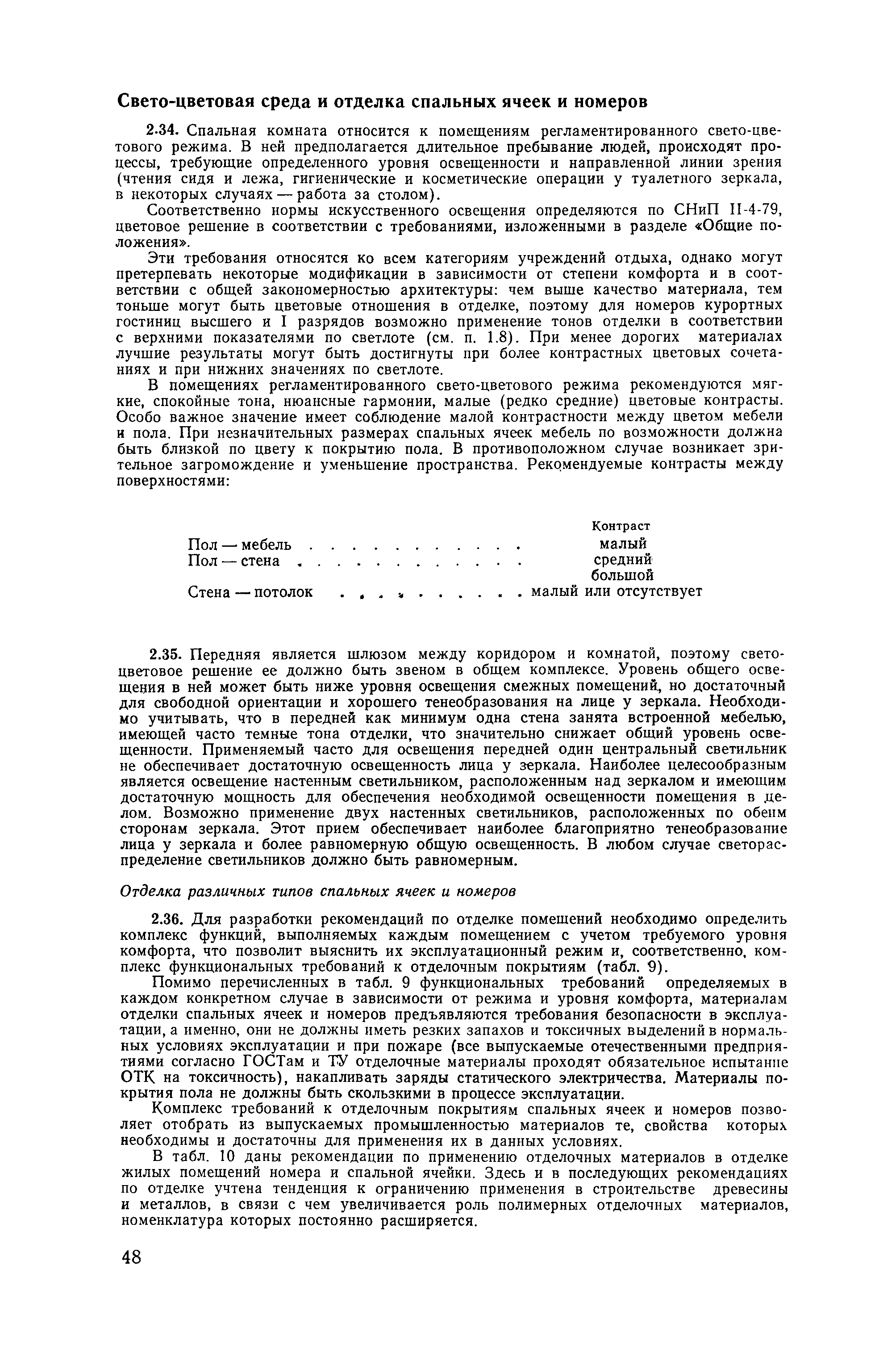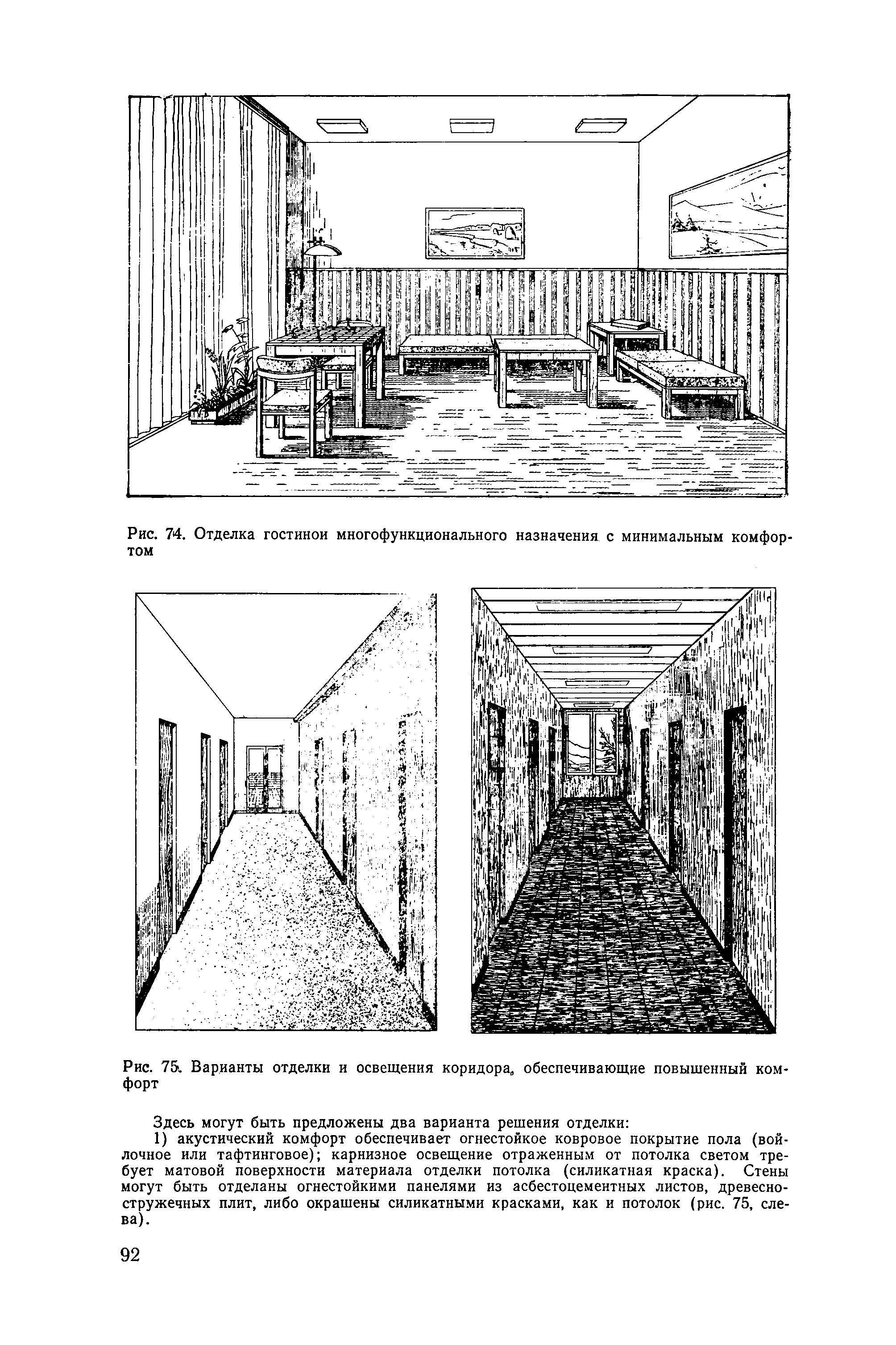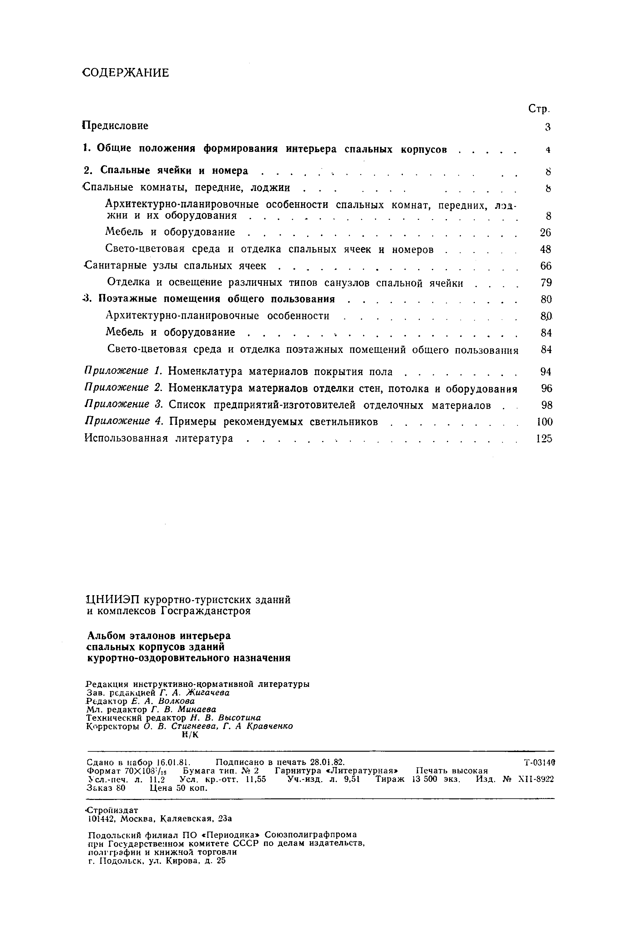 | Оглавление: | Предисловие 1. Общие положения формирования интерьера спальных корпусов 2. Спальные ячейки и номера Спальные комнаты, передние, лоджии Архитектурно-планировочные особенности спальных комнат, передних, лоджии и их оборудования Мебель и оборудование Свето-цветовая среда и отделка спальных ячеек и номеров Санитарные узлы спальных ячеек Отделка и освещение различных типов санузлов спальной ячейки 3. Поэтажные помещения общего пользования Архитектурно-планировочные особенности Мебель и оборудование Свето-цветовая среда и отделка поэтажных помещений общего пользования Приложение 1. Номенклатура материалов покрытия пола Приложение 2. Номенклатура материалов отделки стен. потолка и оборудования Приложение 3. Список предприятий-изготовителей отделочных материалов Приложение 4. Примеры рекомендуемых светильников Использованная литература |