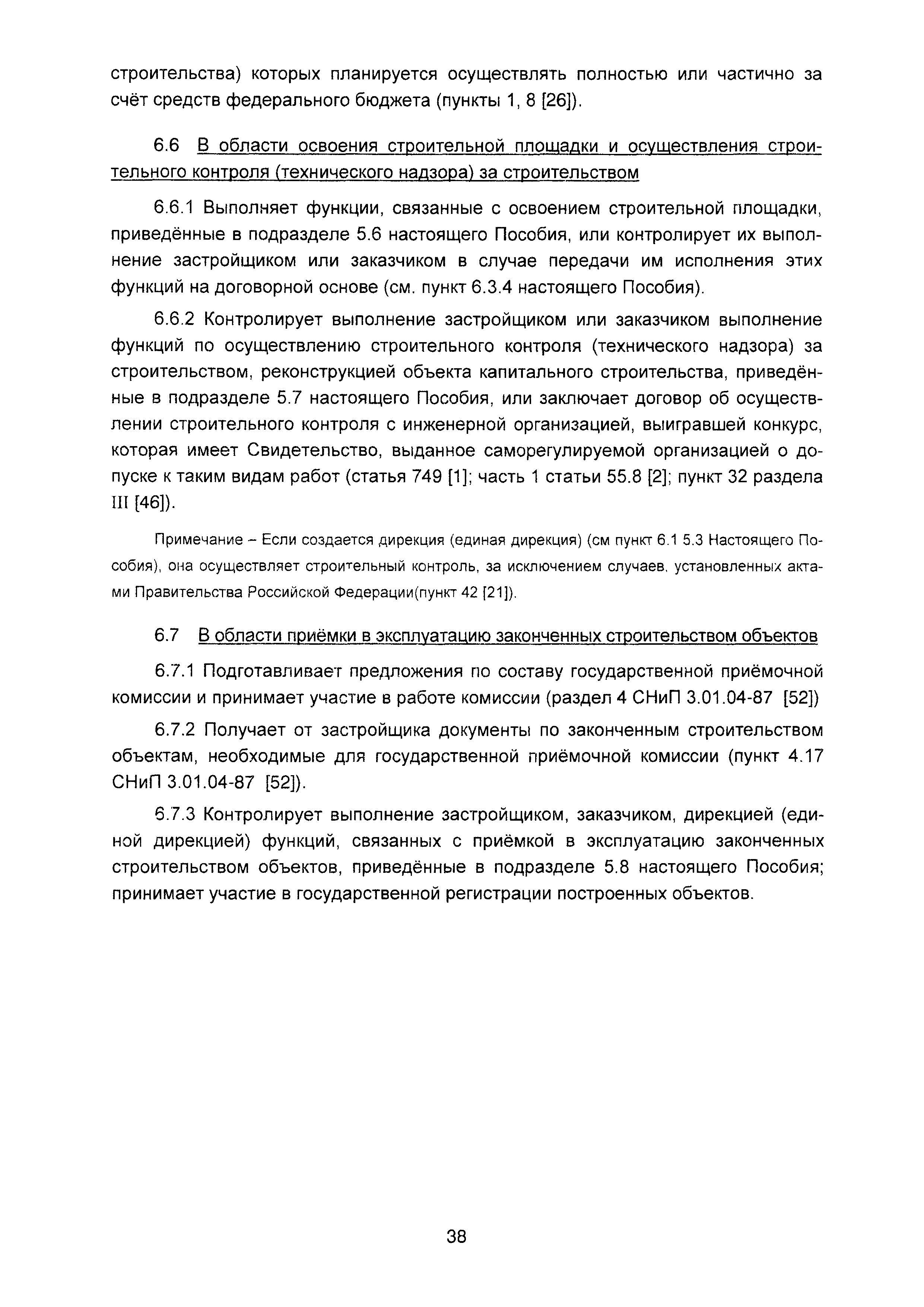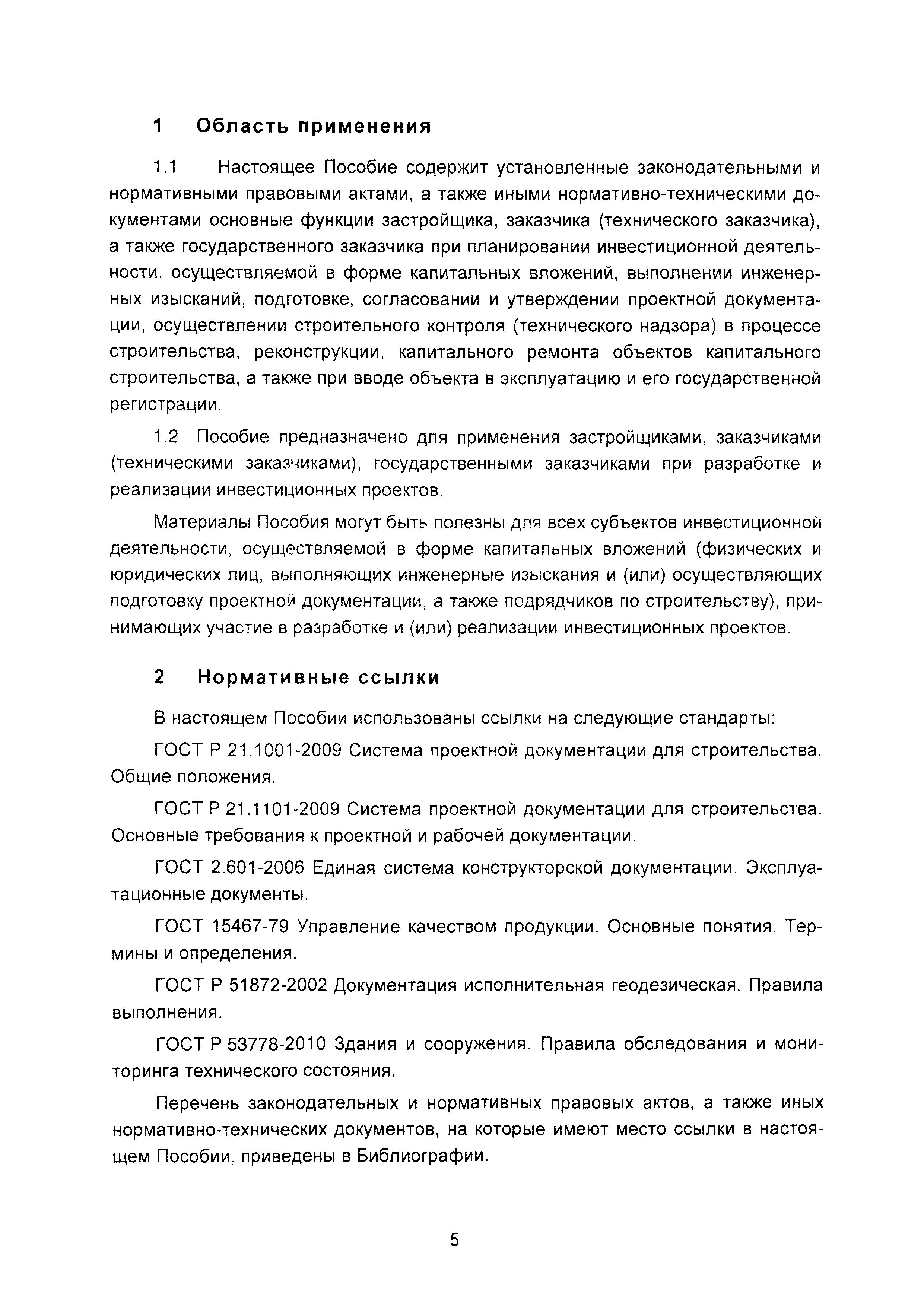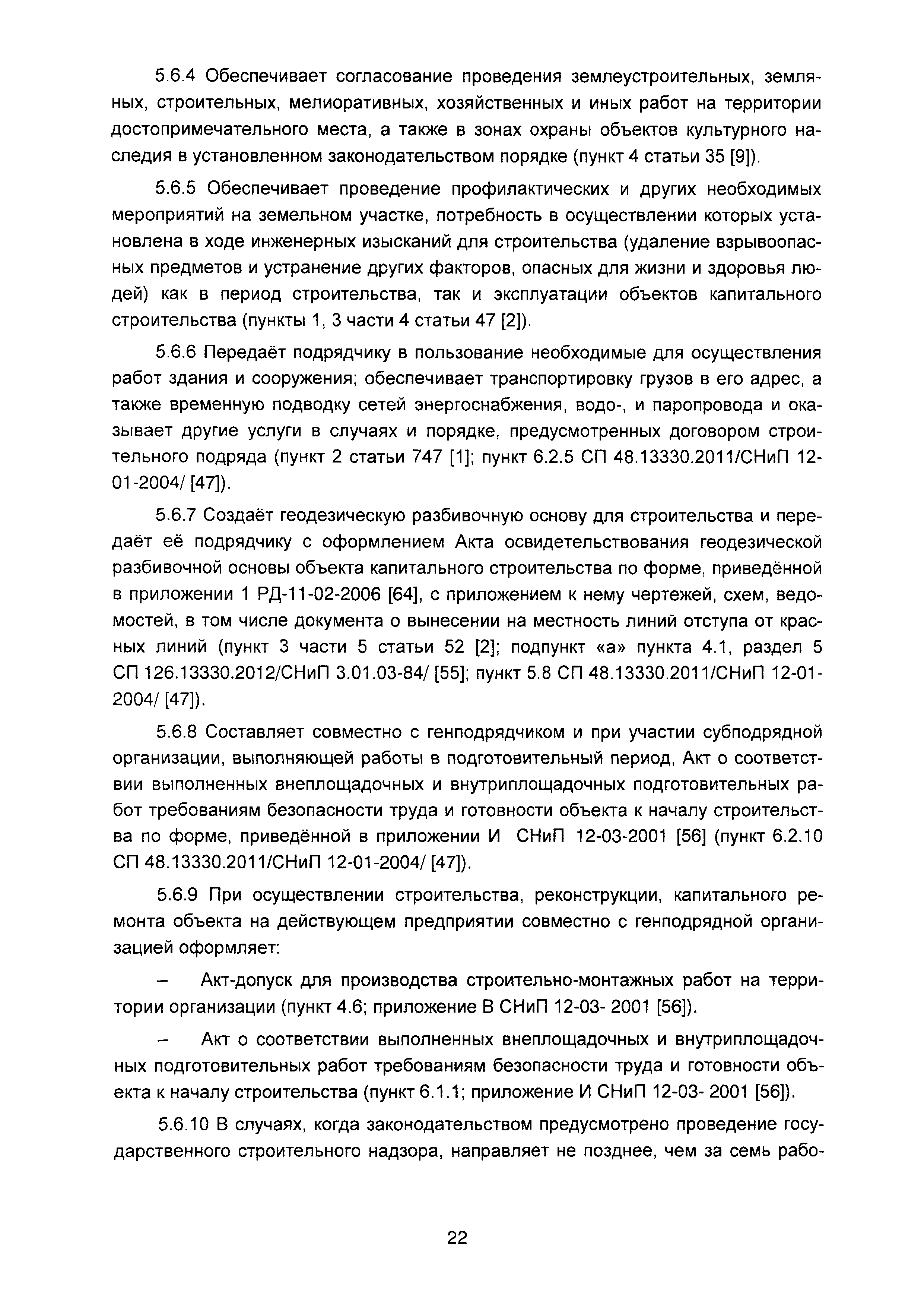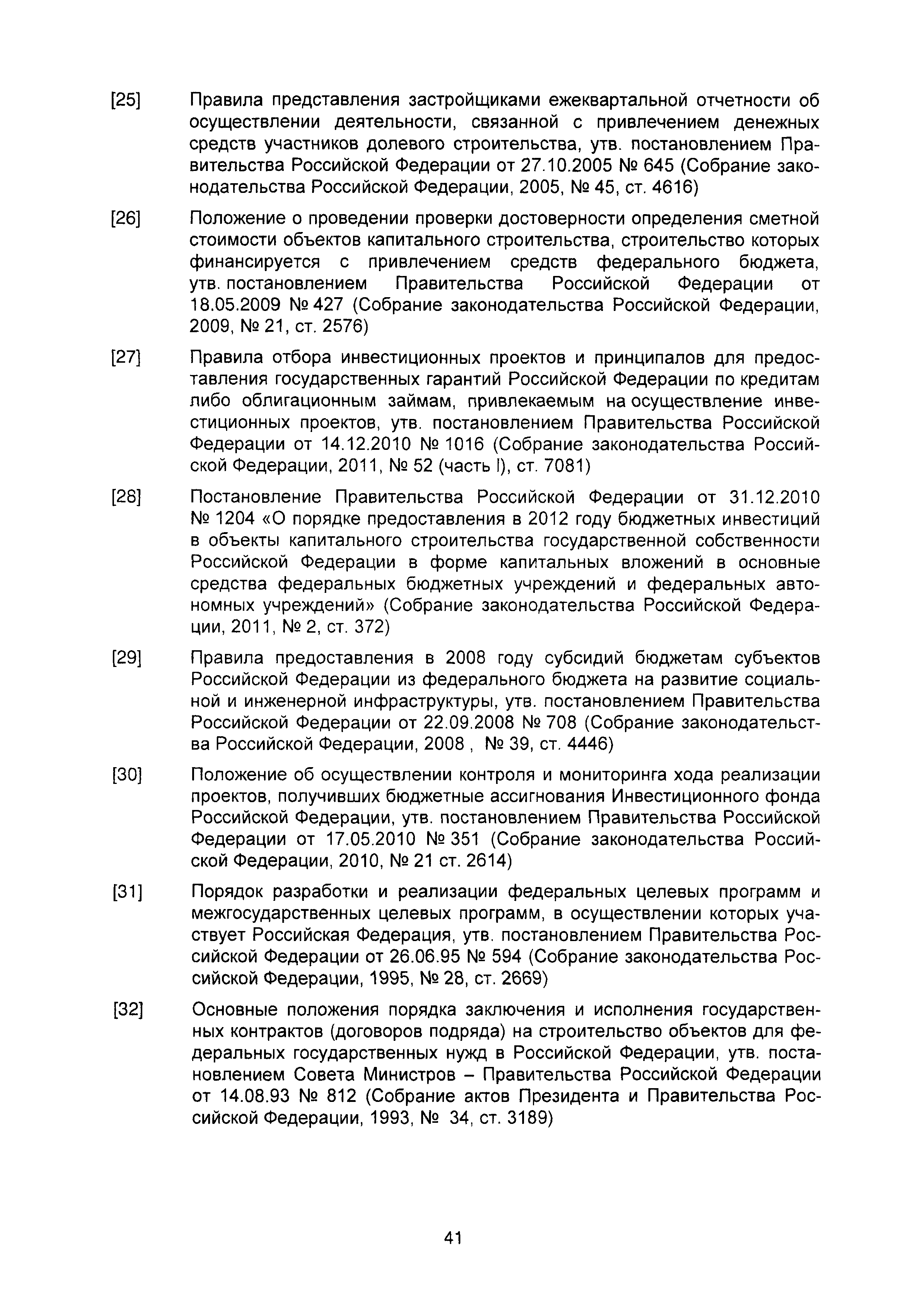 | | Нормативные ссылки: |  Постановление 812 «Об утверждении Основных положений порядка заключения и исполнения государственных контрактов (договоров подряда) на строительство объектов для федеральных государственных нужд в Российской Федерации»  Федеральный закон 169-ФЗ «Об архитектурной деятельности в Российской Федерации»  СНиП 3.01.04-87 «Приемка в эксплуатацию законченных строительством объектов. Основные положения»  ГОСТ 15467-79 «Управление качеством продукции. Основные понятия. Термины и определения»  Федеральный закон 116-ФЗ «О промышленной безопасности опасных производственных объектов»  СП 11-110-99 «Авторский надзор за строительством зданий и сооружений»  Федеральный закон 39-ФЗ «Об инвестиционной деятельности в Российской Федерации, осуществляемой в форме капитальных вложений»  Федеральный закон 126-ФЗ «О связи»  Федеральный закон 122-ФЗ «О государственной регистрации прав на недвижимое имущество и сделок с ним»  СНиП 12-03-2001 «Безопасность труда в строительстве. Часть 1. Общие требования» Кодекс «Земельный кодекс Российской Федерации» Кодекс «Кодекс Российской Федерации об административных правонарушениях»  Федеральный закон 7-ФЗ «Об охране окружающей среды»  ГОСТ Р 51872-2002 «Документация исполнительная геодезическая. Правила выполнения» Постановление 594 «О реализации Федерального закона "О поставках продукции для федеральных государственных нужд"» Постановление 361 «Об утверждении Правил особого регулирования градостроительной деятельности на территориях объектов федерального значения в г. Санкт-Петербурге» Постановление 808 «Об организации и проведении торгов по продаже находящихся в государственной или муниципальной собственности земельных участков или права на заключение договоров аренды таких земельных участков» Приказ 105 «Об утверждении Требований по предупреждению чрезвычайных ситуаций на потенциально опасных объектах и объектах жизнеобеспечения» Постановление 262 «Об утверждении Правил возмещения собственникам земельных участков, землепользователям, землевладельцам и арендаторам земельных участков убытков, причиненных временным занятием земельных участков, ограничением прав собственников земельных участков, землепользователей, землевладельцев и арендаторов земельных участков либо ухудшением качества земель в результате деятельности других лиц»  РД 06-565-03 «Методические указания о порядке продления срока службы технических устройств, зданий и сооружений с истекшим нормативным сроком эксплуатации, в горнорудной промышленности»  СП 13-102-2003 «Правила обследования несущих строительных конструкций зданий и сооружений» Постановление 921 «О государственном техническом учете и технической инвентаризации в Российской Федерации объектов капитального строительства»  Федеральный закон 60-ФЗ «О поставках продукции для федеральных государственных нужд»  Кодекс «Градостроительный кодекс Российской Федерации»  Постановление 698 «О форме разрешения на строительство и форме разрешения на ввод объекта в эксплуатацию»  Федеральный закон 214-ФЗ «Об участии в долевом строительстве многоквартирных домов и иных объектов недвижимости и о внесении изменений в некоторые законодательные акты Российской Федерации» «Правила определения и предоставления технических условий подключения объекта капитального 