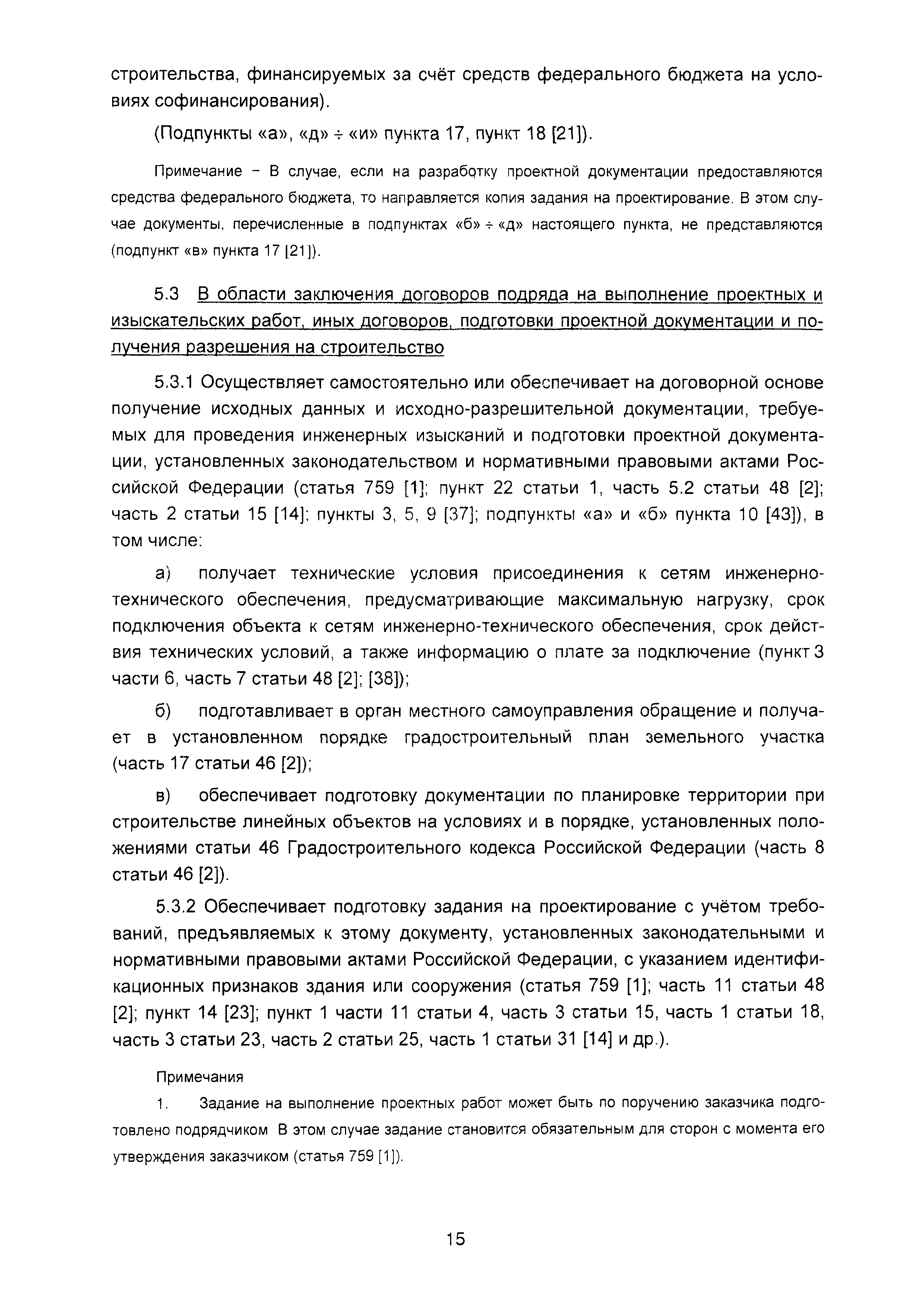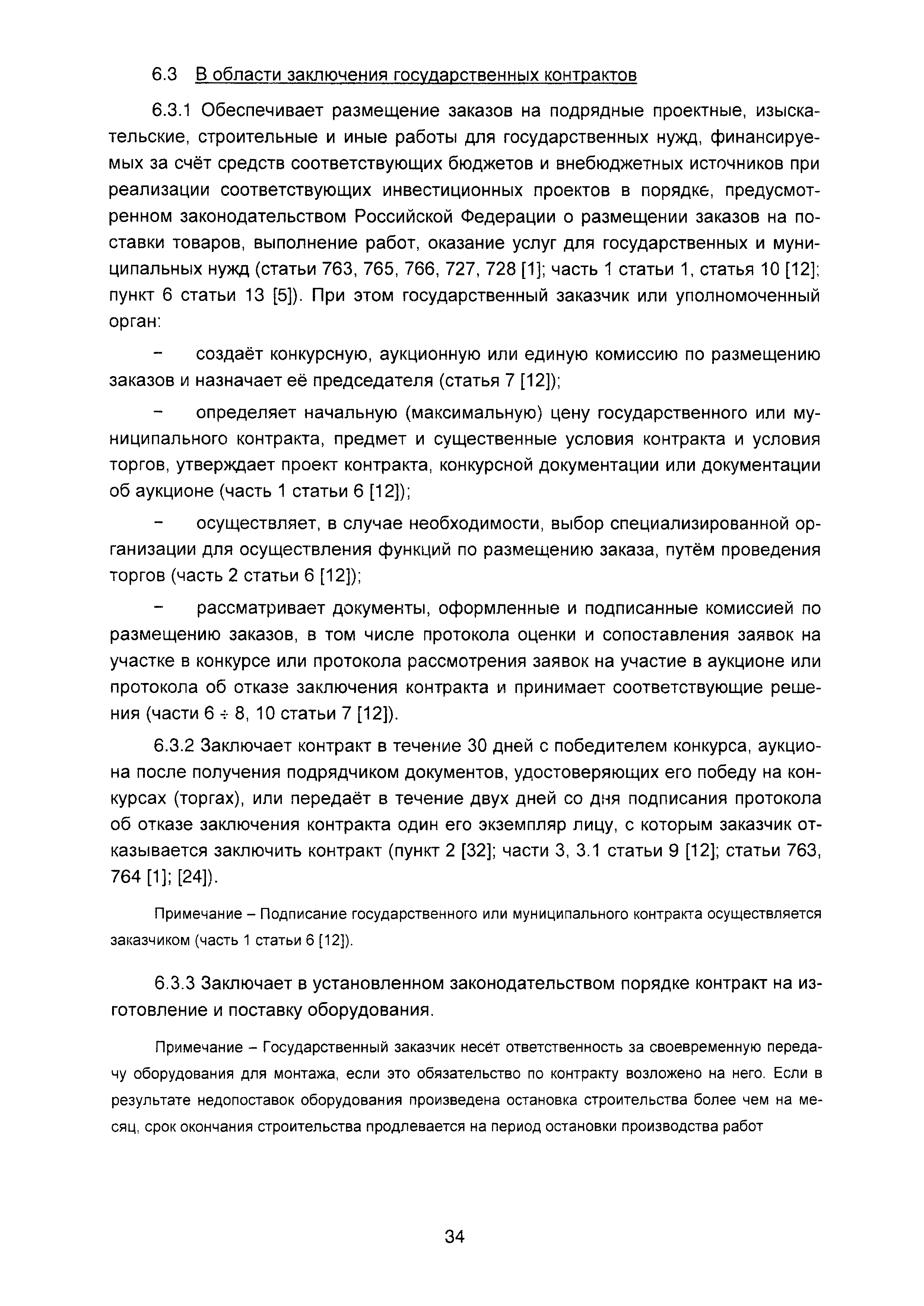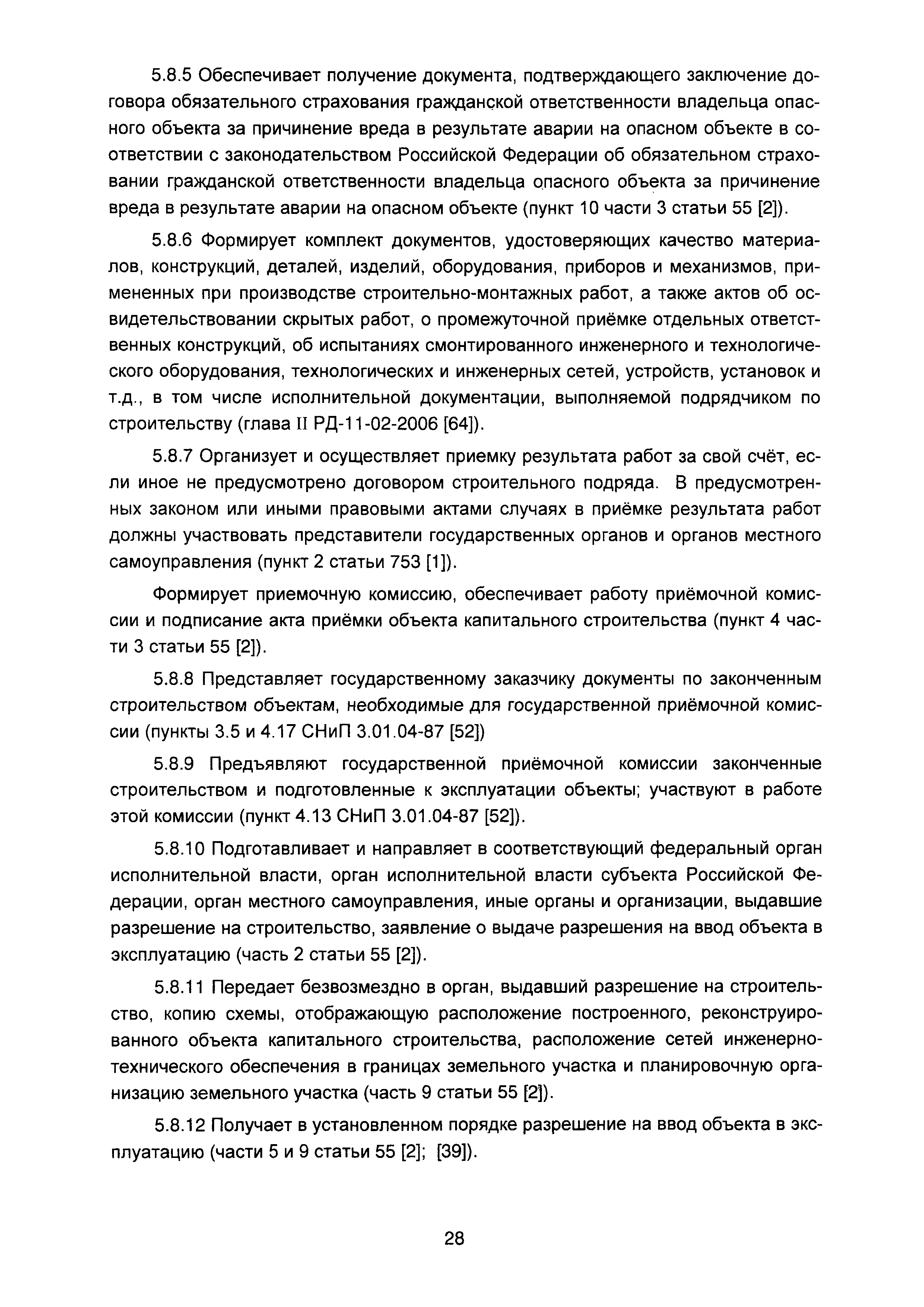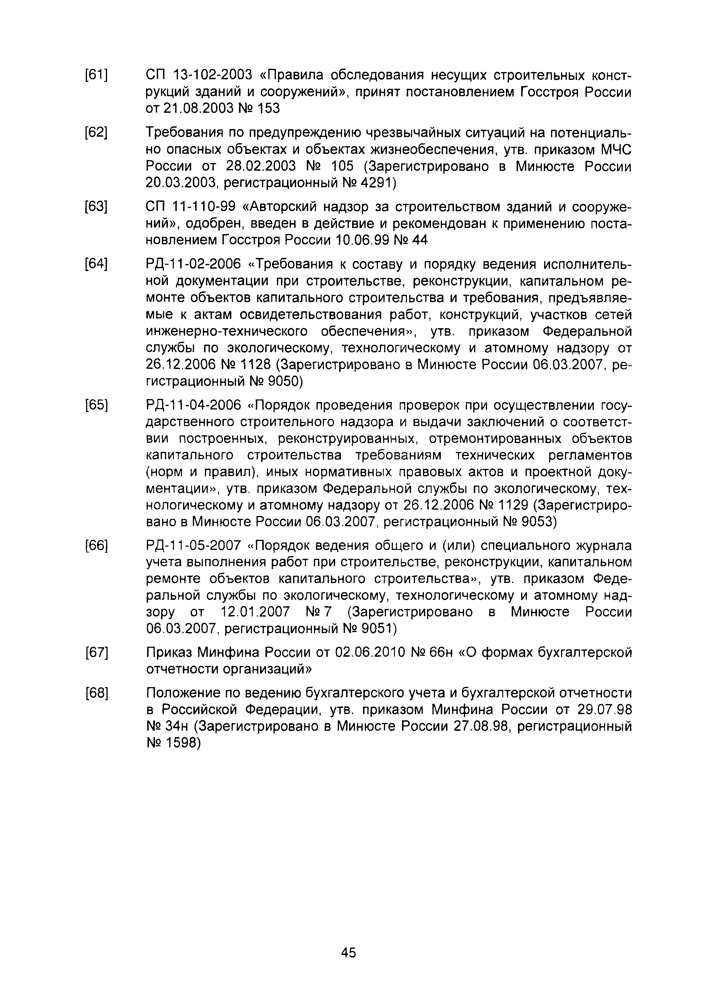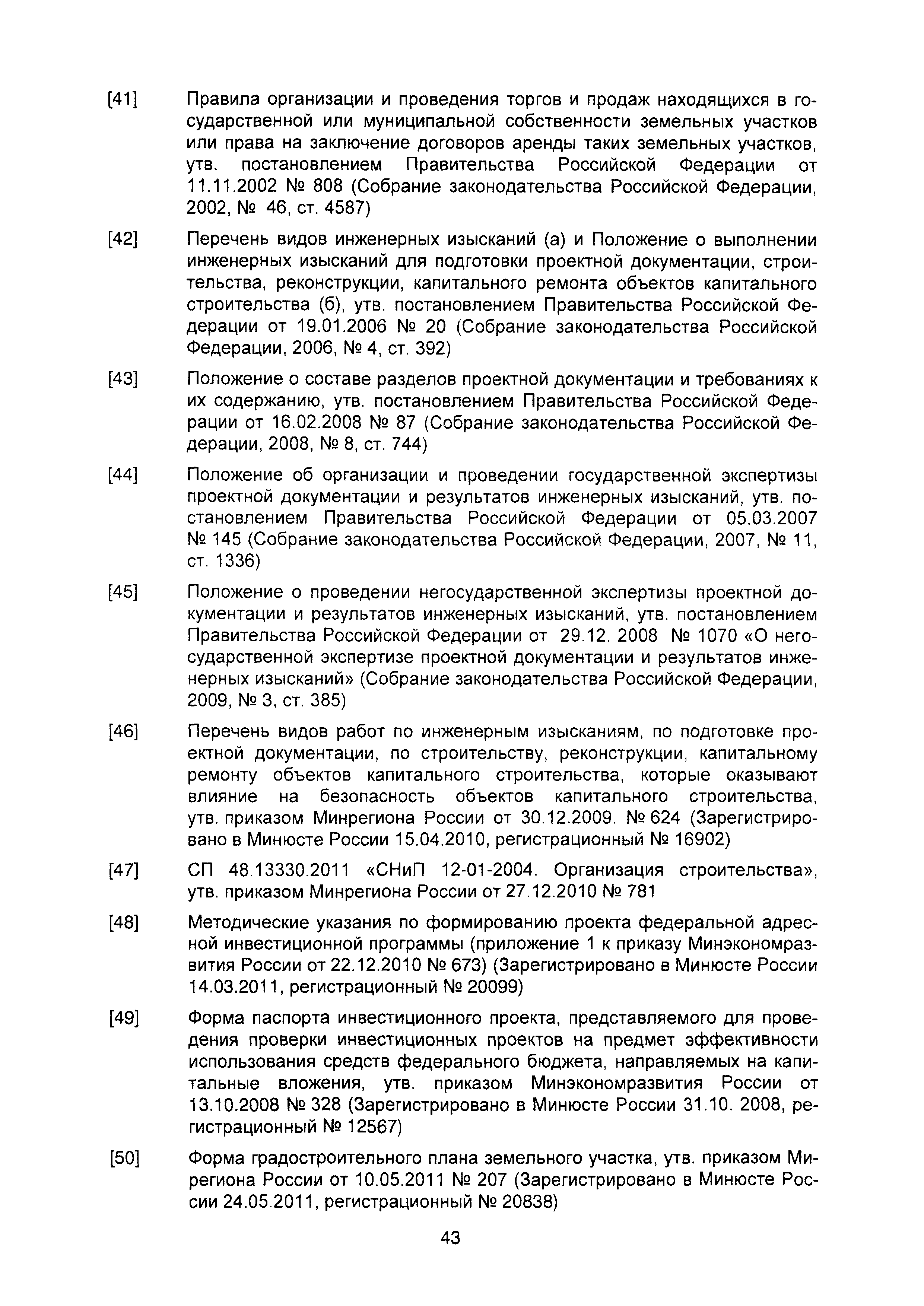 | | Нормативные ссылки: |  Постановление 812 «Об утверждении Основных положений порядка заключения и исполнения государственных контрактов (договоров подряда) на строительство объектов для федеральных государственных нужд в Российской Федерации»  Федеральный закон 169-ФЗ «Об архитектурной деятельности в Российской Федерации»  СНиП 3.01.04-87 «Приемка в эксплуатацию законченных строительством объектов. Основные положения»  ГОСТ 15467-79 «Управление качеством продукции. Основные понятия. Термины и определения»  Федеральный закон 116-ФЗ «О промышленной безопасности опасных производственных объектов»  СП 11-110-99 «Авторский надзор за строительством зданий и сооружений»  Федеральный закон 39-ФЗ «Об инвестиционной деятельности в Российской Федерации, осуществляемой в форме капитальных вложений»  Федеральный закон 126-ФЗ «О связи»  Федеральный закон 122-ФЗ «О государственной регистрации прав на недвижимое имущество и сделок с ним»  СНиП 12-03-2001 «Безопасность труда в строительстве. Часть 1. Общие требования» Кодекс «Земельный кодекс Российской Федерации» Кодекс «Кодекс Российской Федерации об административных правонарушениях»  Федеральный закон 7-ФЗ «Об охране окружающей среды»  ГОСТ Р 51872-2002 «Документация исполнительная геодезическая. Правила выполнения» Постановление 594 «О реализации Федерального закона "О поставках продукции для федеральных государственных нужд"» Постановление 361 «Об утверждении Правил особого регулирования градостроительной деятельности на территориях объектов федерального значения в г. Санкт-Петербурге» Постановление 808 «Об организации и проведении торгов по продаже находящихся в государственной или муниципальной собственности земельных участков или права на заключение договоров аренды таких земельных участков» Приказ 105 «Об утверждении Требований по предупреждению чрезвычайных ситуаций на потенциально опасных объектах и объектах жизнеобеспечения» Постановление 262 «Об утверждении Правил возмещения собственникам земельных участков, землепользователям, землевладельцам и арендаторам земельных участков убытков, причиненных временным занятием земельных участков, ограничением прав собственников земельных участков, землепользователей, землевладельцев и арендаторов земельных участков либо ухудшением качества земель в результате деятельности других лиц»  РД 06-565-03 «Методические указания о порядке продления срока службы технических устройств, зданий и сооружений с истекшим нормативным сроком эксплуатации, в горнорудной промышленности»  СП 13-102-2003 «Правила обследования несущих строительных конструкций зданий и сооружений» Постановление 921 «О государственном техническом учете и технической инвентаризации в Российской Федерации объектов капитального строительства»  Федеральный закон 60-ФЗ «О поставках продукции для федеральных государственных нужд»  Кодекс «Градостроительный кодекс Российской Федерации»  Постановление 698 «О форме разрешения на строительство и форме разрешения на ввод объекта в эксплуатацию»  Федеральный закон 214-ФЗ «Об участии в долевом строительстве многоквартирных домов и иных объектов недвижимости и о внесении изменений в некоторые законодательные акты Российской Федерации» «Правила определения и предоставления технических условий подключения объекта капитального 