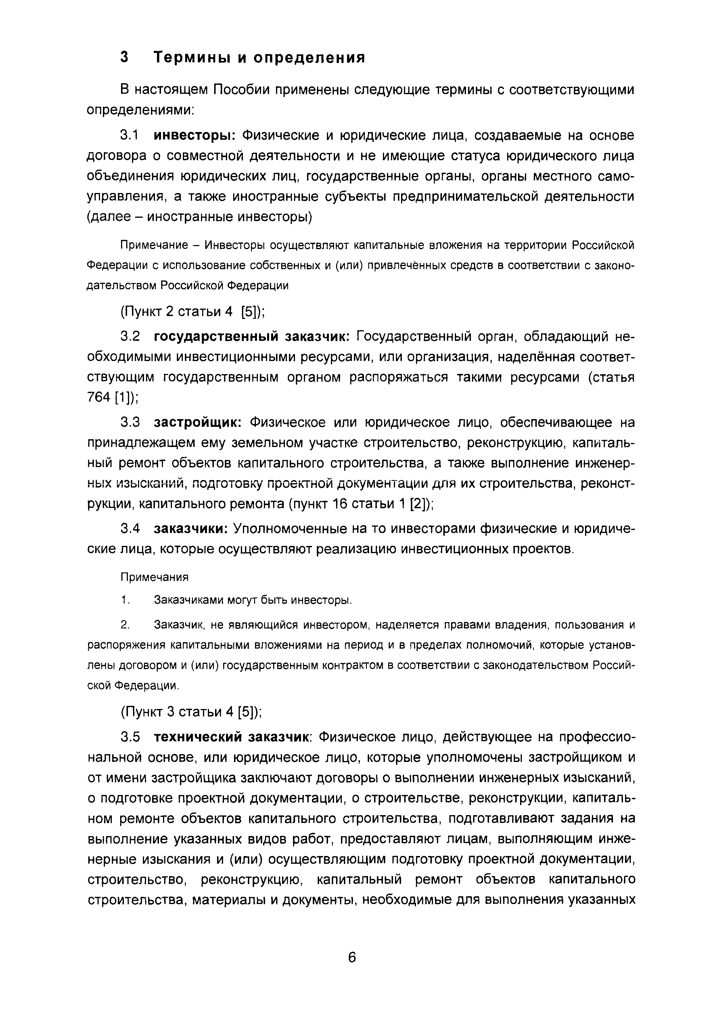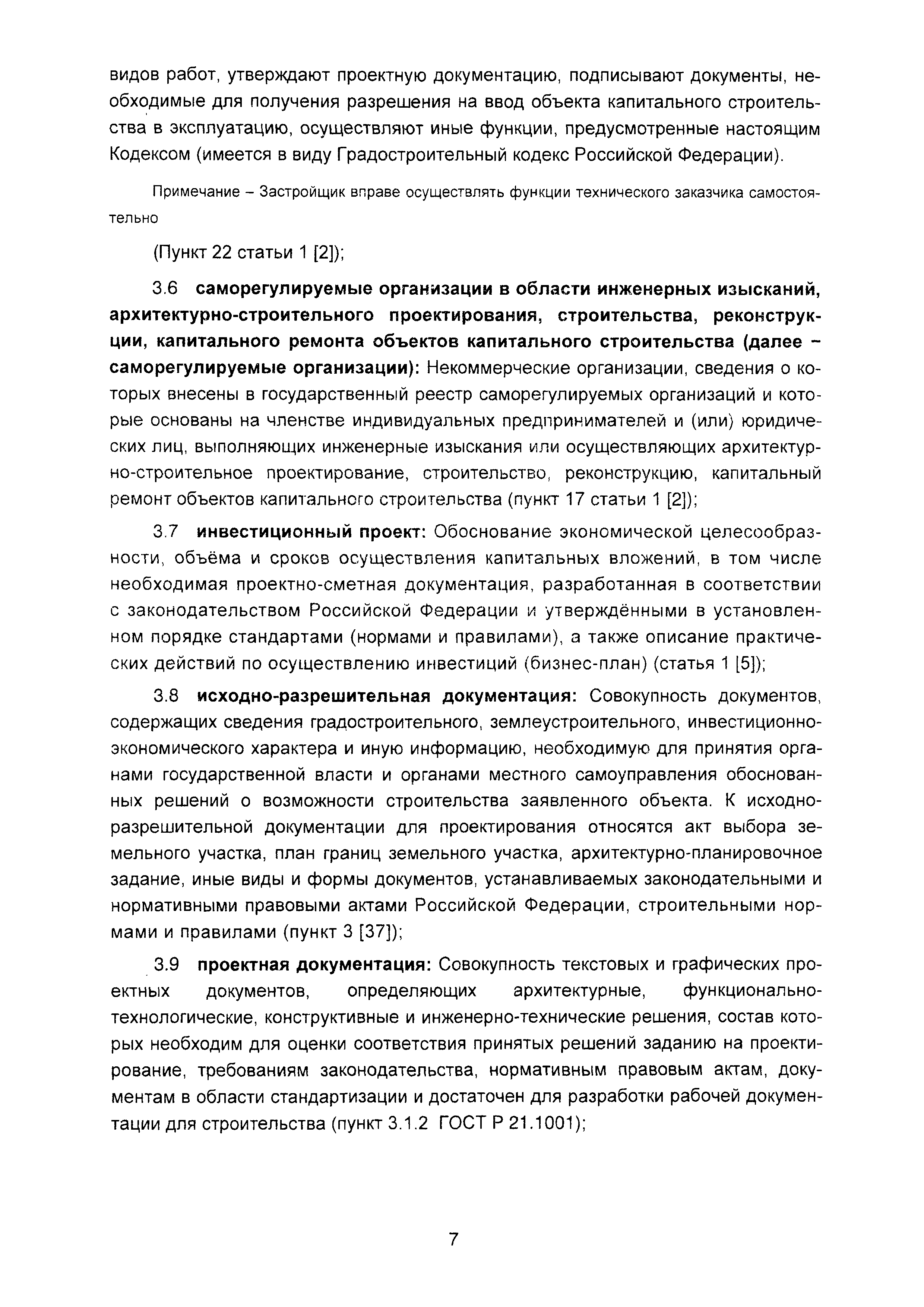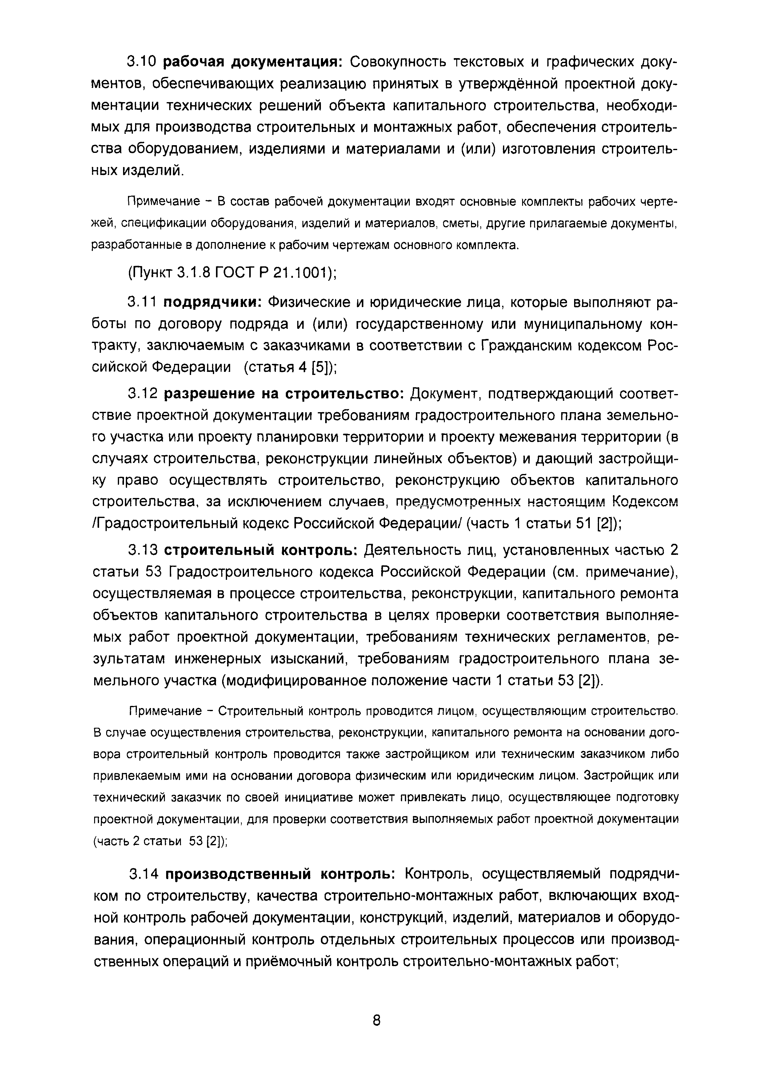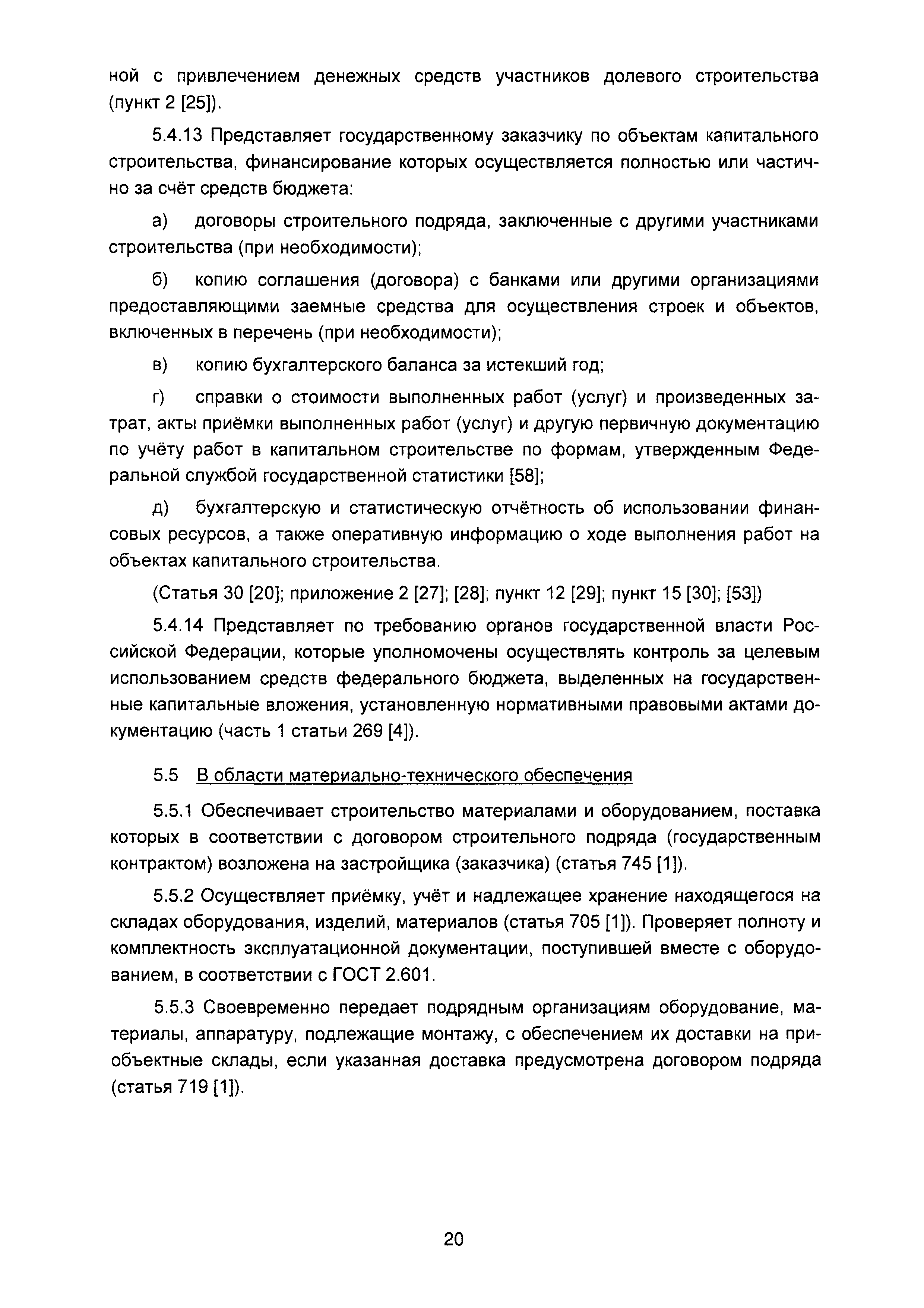 | | Нормативные ссылки: |  Постановление 812 «Об утверждении Основных положений порядка заключения и исполнения государственных контрактов (договоров подряда) на строительство объектов для федеральных государственных нужд в Российской Федерации»  Федеральный закон 169-ФЗ «Об архитектурной деятельности в Российской Федерации»  СНиП 3.01.04-87 «Приемка в эксплуатацию законченных строительством объектов. Основные положения»  ГОСТ 15467-79 «Управление качеством продукции. Основные понятия. Термины и определения»  Федеральный закон 116-ФЗ «О промышленной безопасности опасных производственных объектов»  СП 11-110-99 «Авторский надзор за строительством зданий и сооружений»  Федеральный закон 39-ФЗ «Об инвестиционной деятельности в Российской Федерации, осуществляемой в форме капитальных вложений»  Федеральный закон 126-ФЗ «О связи»  Федеральный закон 122-ФЗ «О государственной регистрации прав на недвижимое имущество и сделок с ним»  СНиП 12-03-2001 «Безопасность труда в строительстве. Часть 1. Общие требования» Кодекс «Земельный кодекс Российской Федерации» Кодекс «Кодекс Российской Федерации об административных правонарушениях»  Федеральный закон 7-ФЗ «Об охране окружающей среды»  ГОСТ Р 51872-2002 «Документация исполнительная геодезическая. Правила выполнения» Постановление 594 «О реализации Федерального закона "О поставках продукции для федеральных государственных нужд"» Постановление 361 «Об утверждении Правил особого регулирования градостроительной деятельности на территориях объектов федерального значения в г. Санкт-Петербурге» Постановление 808 «Об организации и проведении торгов по продаже находящихся в государственной или муниципальной собственности земельных участков или права на заключение договоров аренды таких земельных участков» Приказ 105 «Об утверждении Требований по предупреждению чрезвычайных ситуаций на потенциально опасных объектах и объектах жизнеобеспечения» Постановление 262 «Об утверждении Правил возмещения собственникам земельных участков, землепользователям, землевладельцам и арендаторам земельных участков убытков, причиненных временным занятием земельных участков, ограничением прав собственников земельных участков, землепользователей, землевладельцев и арендаторов земельных участков либо ухудшением качества земель в результате деятельности других лиц»  РД 06-565-03 «Методические указания о порядке продления срока службы технических устройств, зданий и сооружений с истекшим нормативным сроком эксплуатации, в горнорудной промышленности»  СП 13-102-2003 «Правила обследования несущих строительных конструкций зданий и сооружений» Постановление 921 «О государственном техническом учете и технической инвентаризации в Российской Федерации объектов капитального строительства»  Федеральный закон 60-ФЗ «О поставках продукции для федеральных государственных нужд»  Кодекс «Градостроительный кодекс Российской Федерации»  Постановление 698 «О форме разрешения на строительство и форме разрешения на ввод объекта в эксплуатацию»  Федеральный закон 214-ФЗ «Об участии в долевом строительстве многоквартирных домов и иных объектов недвижимости и о внесении изменений в некоторые законодательные акты Российской Федерации» «Правила определения и предоставления технических условий подключения объекта капитального 