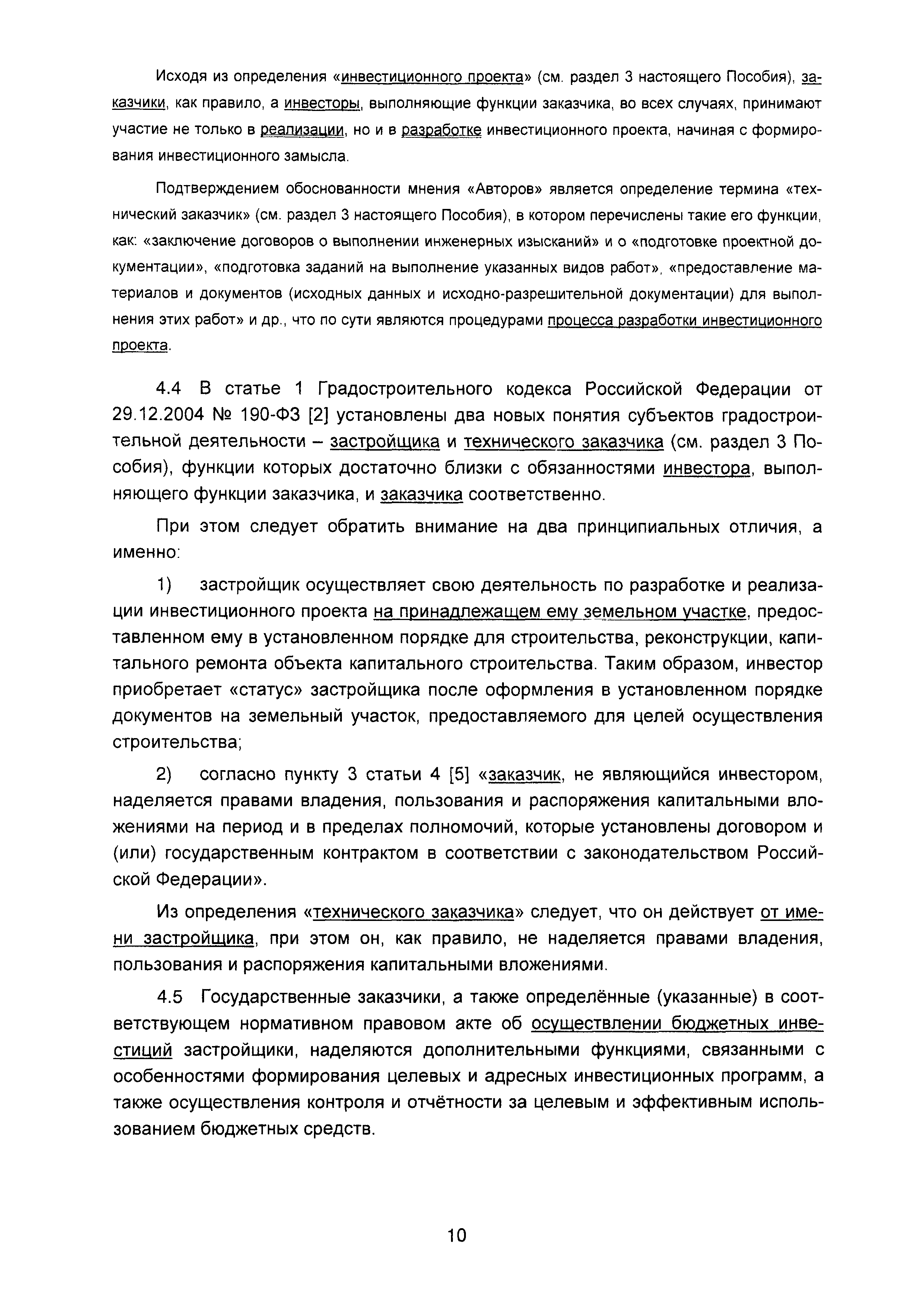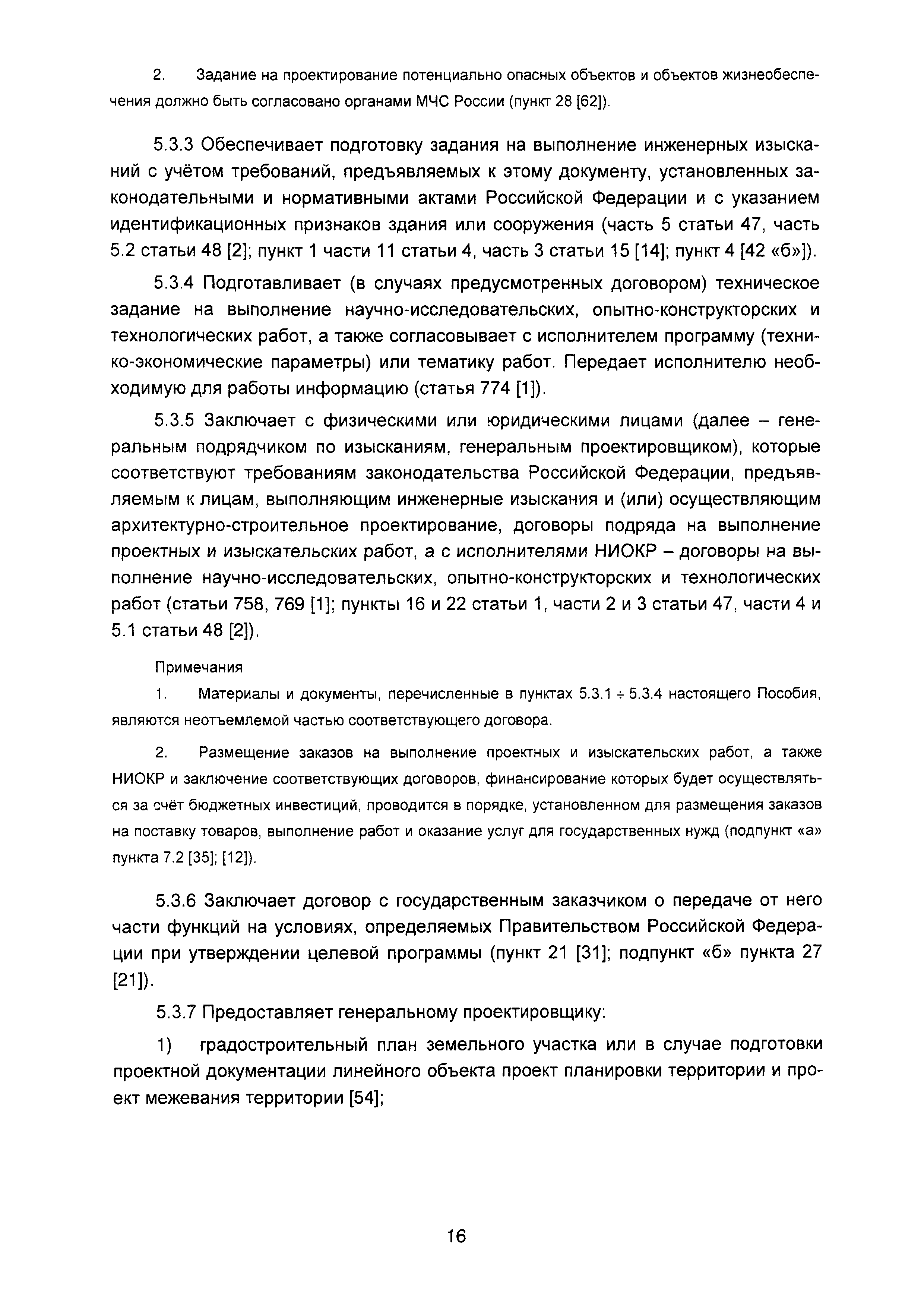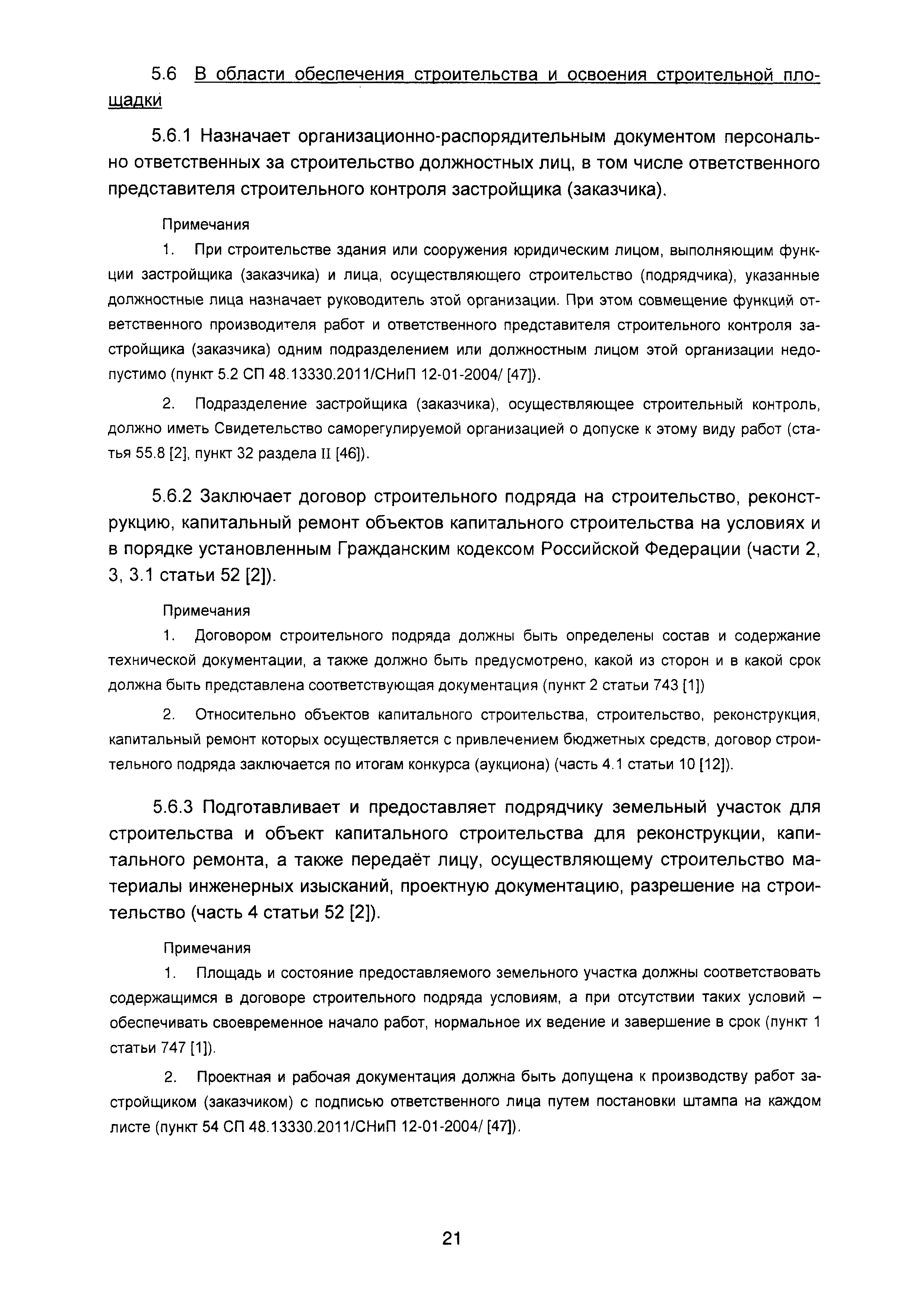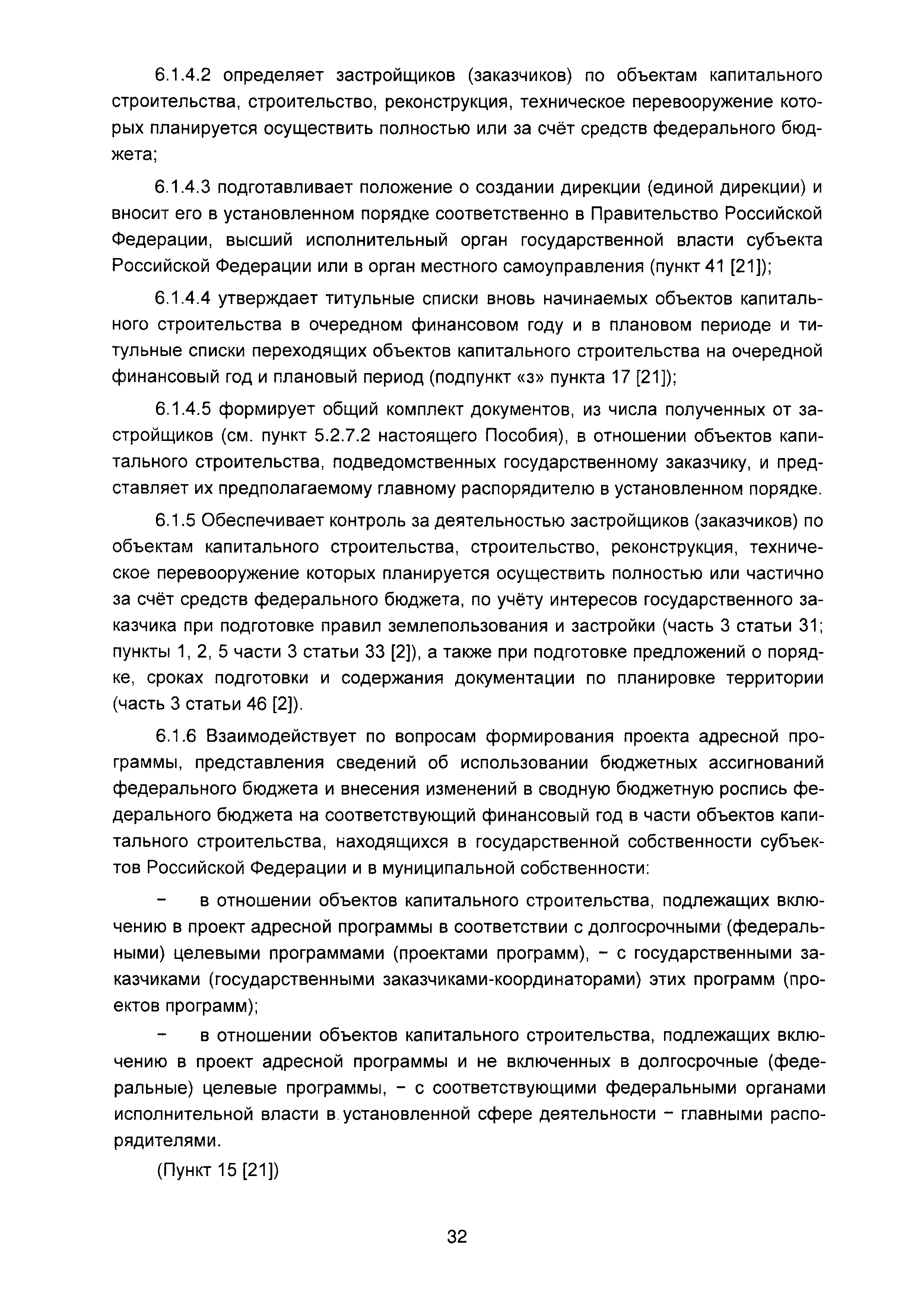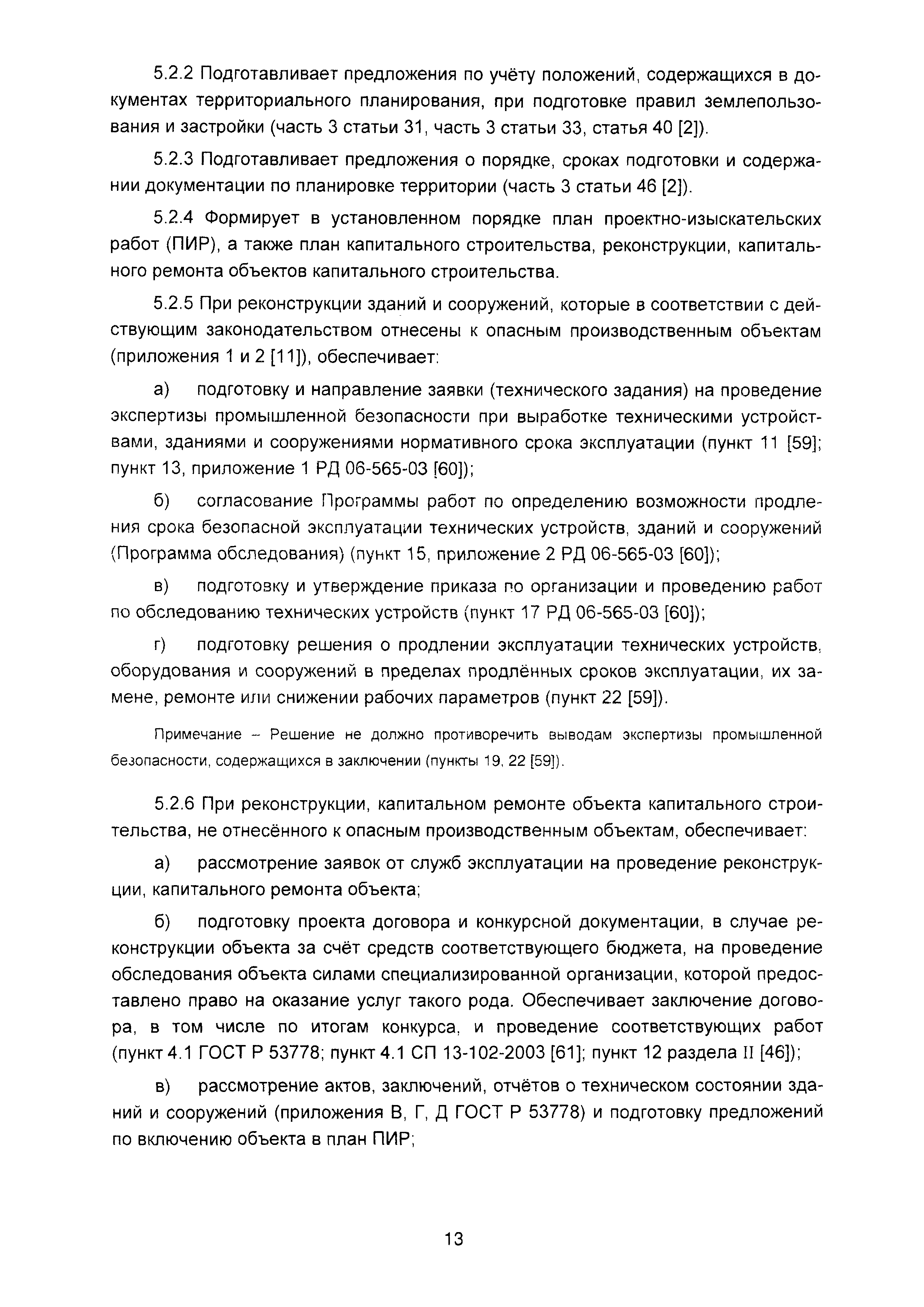 | | Нормативные ссылки: |  Постановление 812 «Об утверждении Основных положений порядка заключения и исполнения государственных контрактов (договоров подряда) на строительство объектов для федеральных государственных нужд в Российской Федерации»  Федеральный закон 169-ФЗ «Об архитектурной деятельности в Российской Федерации»  СНиП 3.01.04-87 «Приемка в эксплуатацию законченных строительством объектов. Основные положения»  ГОСТ 15467-79 «Управление качеством продукции. Основные понятия. Термины и определения»  Федеральный закон 116-ФЗ «О промышленной безопасности опасных производственных объектов»  СП 11-110-99 «Авторский надзор за строительством зданий и сооружений»  Федеральный закон 39-ФЗ «Об инвестиционной деятельности в Российской Федерации, осуществляемой в форме капитальных вложений»  Федеральный закон 126-ФЗ «О связи»  Федеральный закон 122-ФЗ «О государственной регистрации прав на недвижимое имущество и сделок с ним»  СНиП 12-03-2001 «Безопасность труда в строительстве. Часть 1. Общие требования» Кодекс «Земельный кодекс Российской Федерации» Кодекс «Кодекс Российской Федерации об административных правонарушениях»  Федеральный закон 7-ФЗ «Об охране окружающей среды»  ГОСТ Р 51872-2002 «Документация исполнительная геодезическая. Правила выполнения» Постановление 594 «О реализации Федерального закона "О поставках продукции для федеральных государственных нужд"» Постановление 361 «Об утверждении Правил особого регулирования градостроительной деятельности на территориях объектов федерального значения в г. Санкт-Петербурге» Постановление 808 «Об организации и проведении торгов по продаже находящихся в государственной или муниципальной собственности земельных участков или права на заключение договоров аренды таких земельных участков» Приказ 105 «Об утверждении Требований по предупреждению чрезвычайных ситуаций на потенциально опасных объектах и объектах жизнеобеспечения» Постановление 262 «Об утверждении Правил возмещения собственникам земельных участков, землепользователям, землевладельцам и арендаторам земельных участков убытков, причиненных временным занятием земельных участков, ограничением прав собственников земельных участков, землепользователей, землевладельцев и арендаторов земельных участков либо ухудшением качества земель в результате деятельности других лиц»  РД 06-565-03 «Методические указания о порядке продления срока службы технических устройств, зданий и сооружений с истекшим нормативным сроком эксплуатации, в горнорудной промышленности»  СП 13-102-2003 «Правила обследования несущих строительных конструкций зданий и сооружений» Постановление 921 «О государственном техническом учете и технической инвентаризации в Российской Федерации объектов капитального строительства»  Федеральный закон 60-ФЗ «О поставках продукции для федеральных государственных нужд»  Кодекс «Градостроительный кодекс Российской Федерации»  Постановление 698 «О форме разрешения на строительство и форме разрешения на ввод объекта в эксплуатацию»  Федеральный закон 214-ФЗ «Об участии в долевом строительстве многоквартирных домов и иных объектов недвижимости и о внесении изменений в некоторые законодательные акты Российской Федерации» «Правила определения и предоставления технических условий подключения объекта капитального 