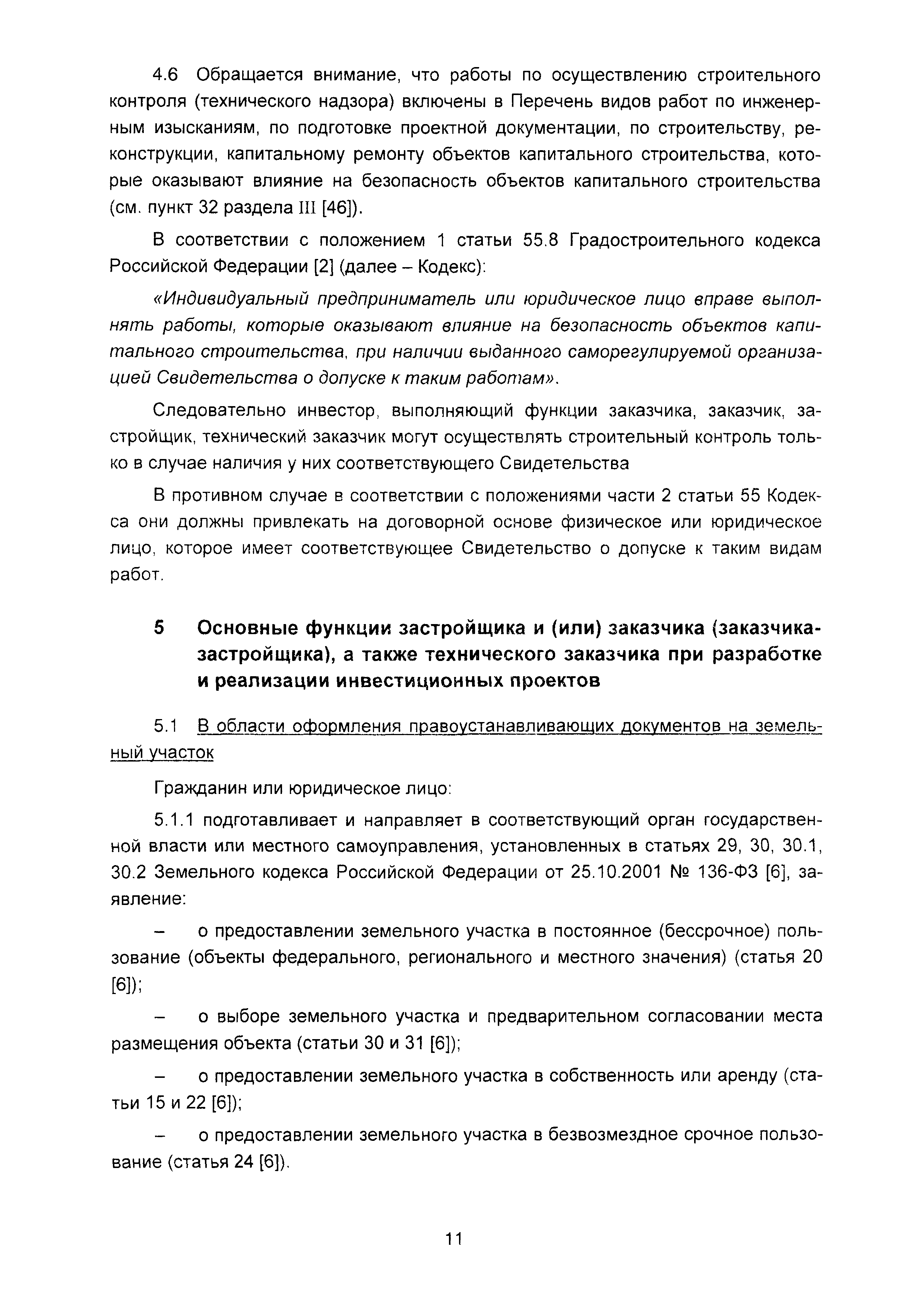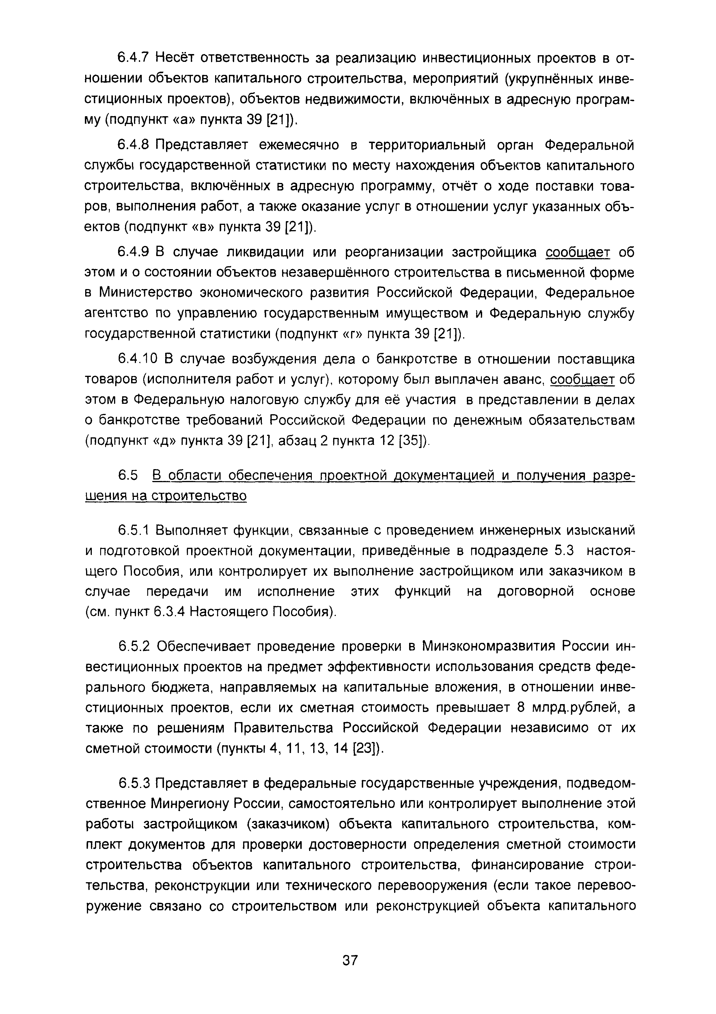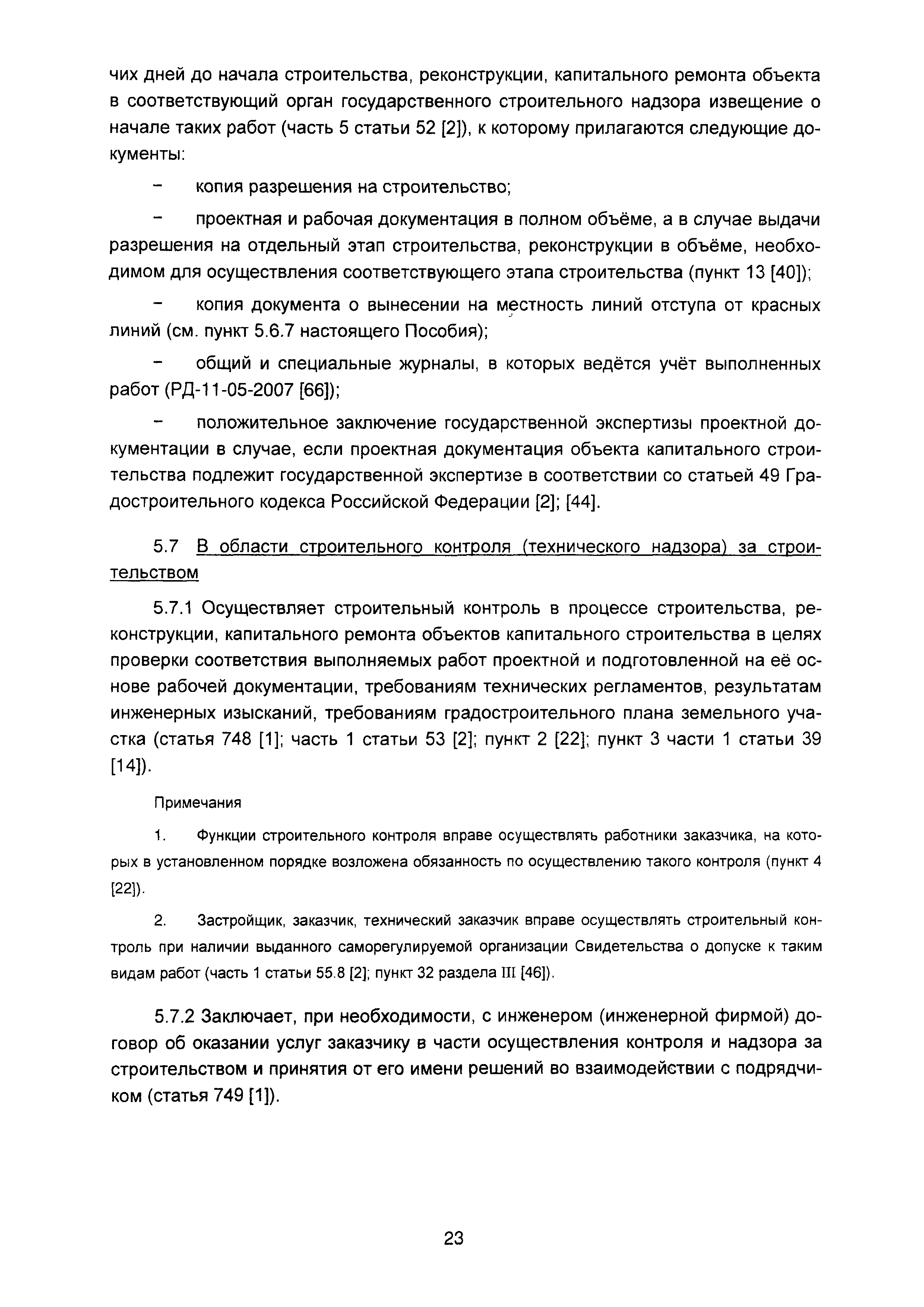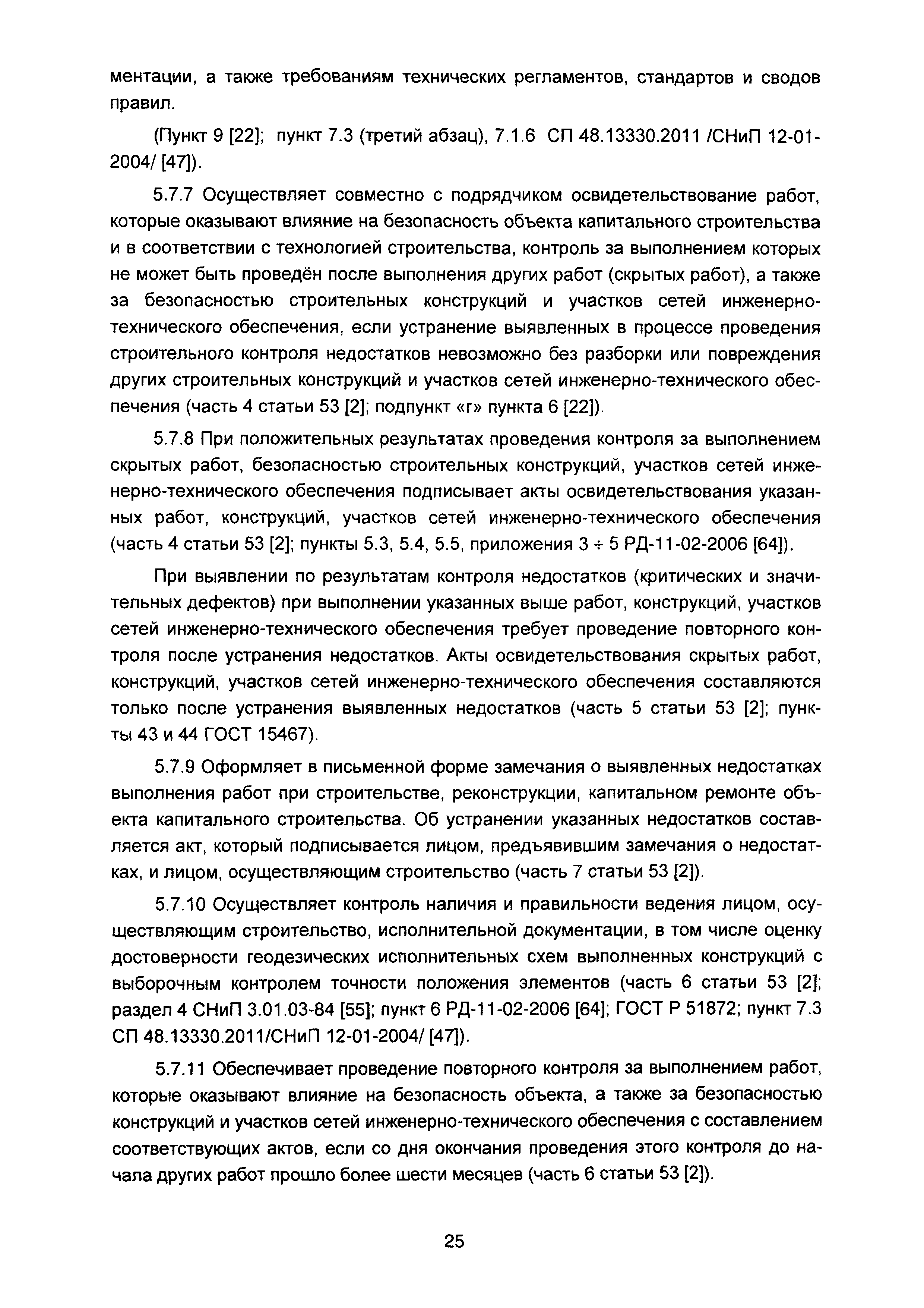 | | Нормативные ссылки: |  Постановление 812 «Об утверждении Основных положений порядка заключения и исполнения государственных контрактов (договоров подряда) на строительство объектов для федеральных государственных нужд в Российской Федерации»  Федеральный закон 169-ФЗ «Об архитектурной деятельности в Российской Федерации»  СНиП 3.01.04-87 «Приемка в эксплуатацию законченных строительством объектов. Основные положения»  ГОСТ 15467-79 «Управление качеством продукции. Основные понятия. Термины и определения»  Федеральный закон 116-ФЗ «О промышленной безопасности опасных производственных объектов»  СП 11-110-99 «Авторский надзор за строительством зданий и сооружений»  Федеральный закон 39-ФЗ «Об инвестиционной деятельности в Российской Федерации, осуществляемой в форме капитальных вложений»  Федеральный закон 126-ФЗ «О связи»  Федеральный закон 122-ФЗ «О государственной регистрации прав на недвижимое имущество и сделок с ним»  СНиП 12-03-2001 «Безопасность труда в строительстве. Часть 1. Общие требования» Кодекс «Земельный кодекс Российской Федерации» Кодекс «Кодекс Российской Федерации об административных правонарушениях»  Федеральный закон 7-ФЗ «Об охране окружающей среды»  ГОСТ Р 51872-2002 «Документация исполнительная геодезическая. Правила выполнения» Постановление 594 «О реализации Федерального закона "О поставках продукции для федеральных государственных нужд"» Постановление 361 «Об утверждении Правил особого регулирования градостроительной деятельности на территориях объектов федерального значения в г. Санкт-Петербурге» Постановление 808 «Об организации и проведении торгов по продаже находящихся в государственной или муниципальной собственности земельных участков или права на заключение договоров аренды таких земельных участков» Приказ 105 «Об утверждении Требований по предупреждению чрезвычайных ситуаций на потенциально опасных объектах и объектах жизнеобеспечения» Постановление 262 «Об утверждении Правил возмещения собственникам земельных участков, землепользователям, землевладельцам и арендаторам земельных участков убытков, причиненных временным занятием земельных участков, ограничением прав собственников земельных участков, землепользователей, землевладельцев и арендаторов земельных участков либо ухудшением качества земель в результате деятельности других лиц»  РД 06-565-03 «Методические указания о порядке продления срока службы технических устройств, зданий и сооружений с истекшим нормативным сроком эксплуатации, в горнорудной промышленности»  СП 13-102-2003 «Правила обследования несущих строительных конструкций зданий и сооружений» Постановление 921 «О государственном техническом учете и технической инвентаризации в Российской Федерации объектов капитального строительства»  Федеральный закон 60-ФЗ «О поставках продукции для федеральных государственных нужд»  Кодекс «Градостроительный кодекс Российской Федерации»  Постановление 698 «О форме разрешения на строительство и форме разрешения на ввод объекта в эксплуатацию»  Федеральный закон 214-ФЗ «Об участии в долевом строительстве многоквартирных домов и иных объектов недвижимости и о внесении изменений в некоторые законодательные акты Российской Федерации» «Правила определения и предоставления технических условий подключения объекта капитального 